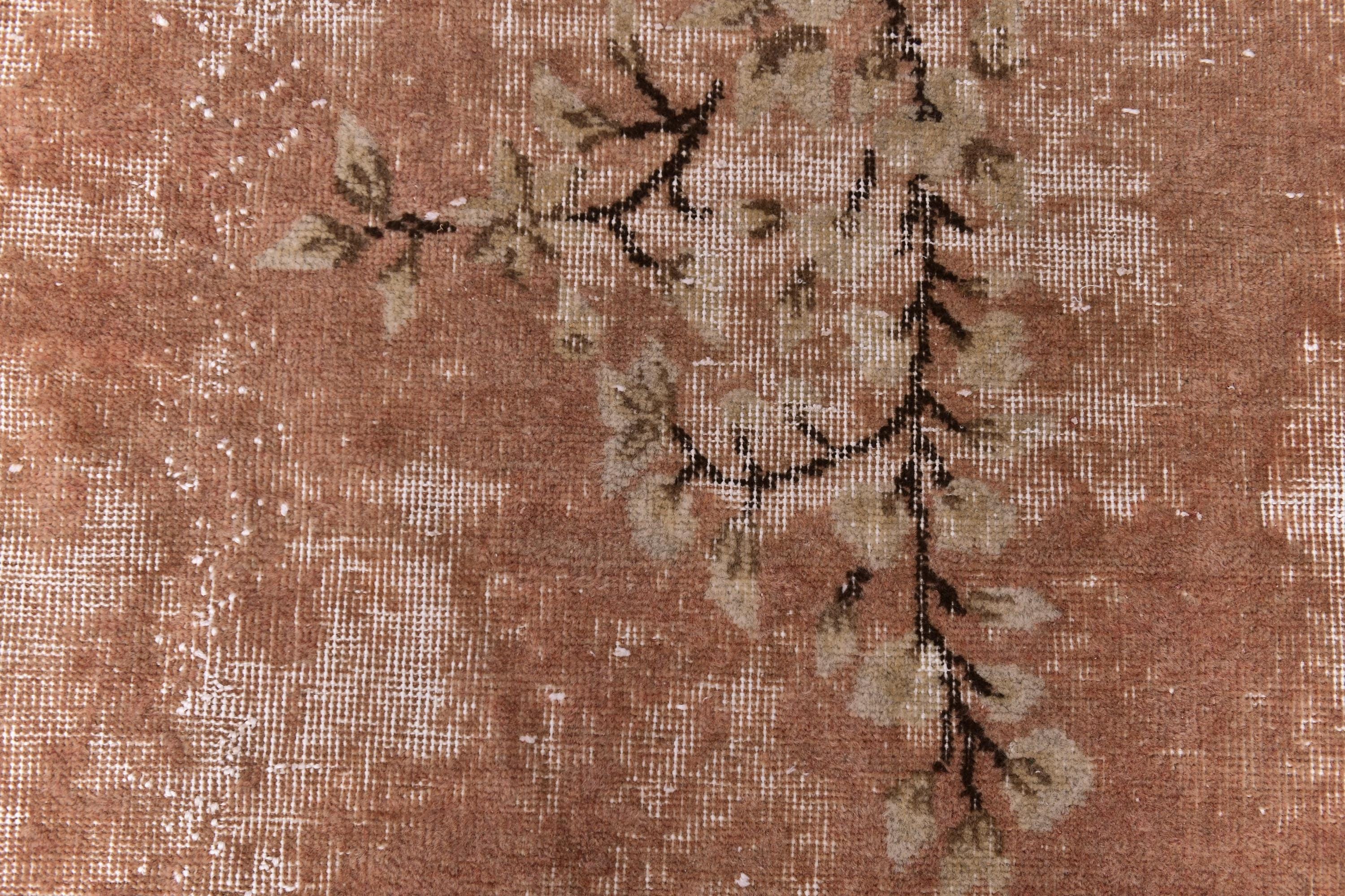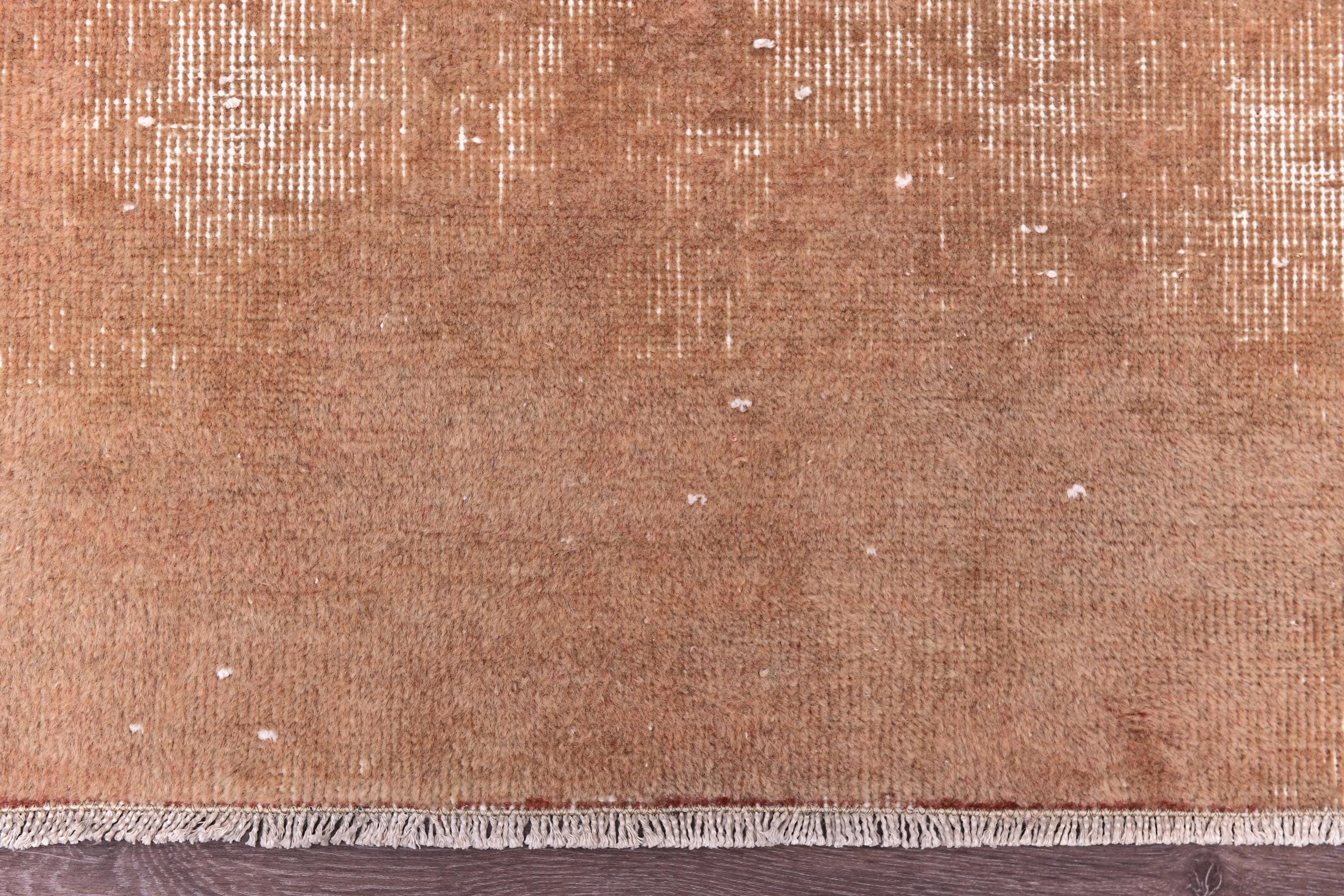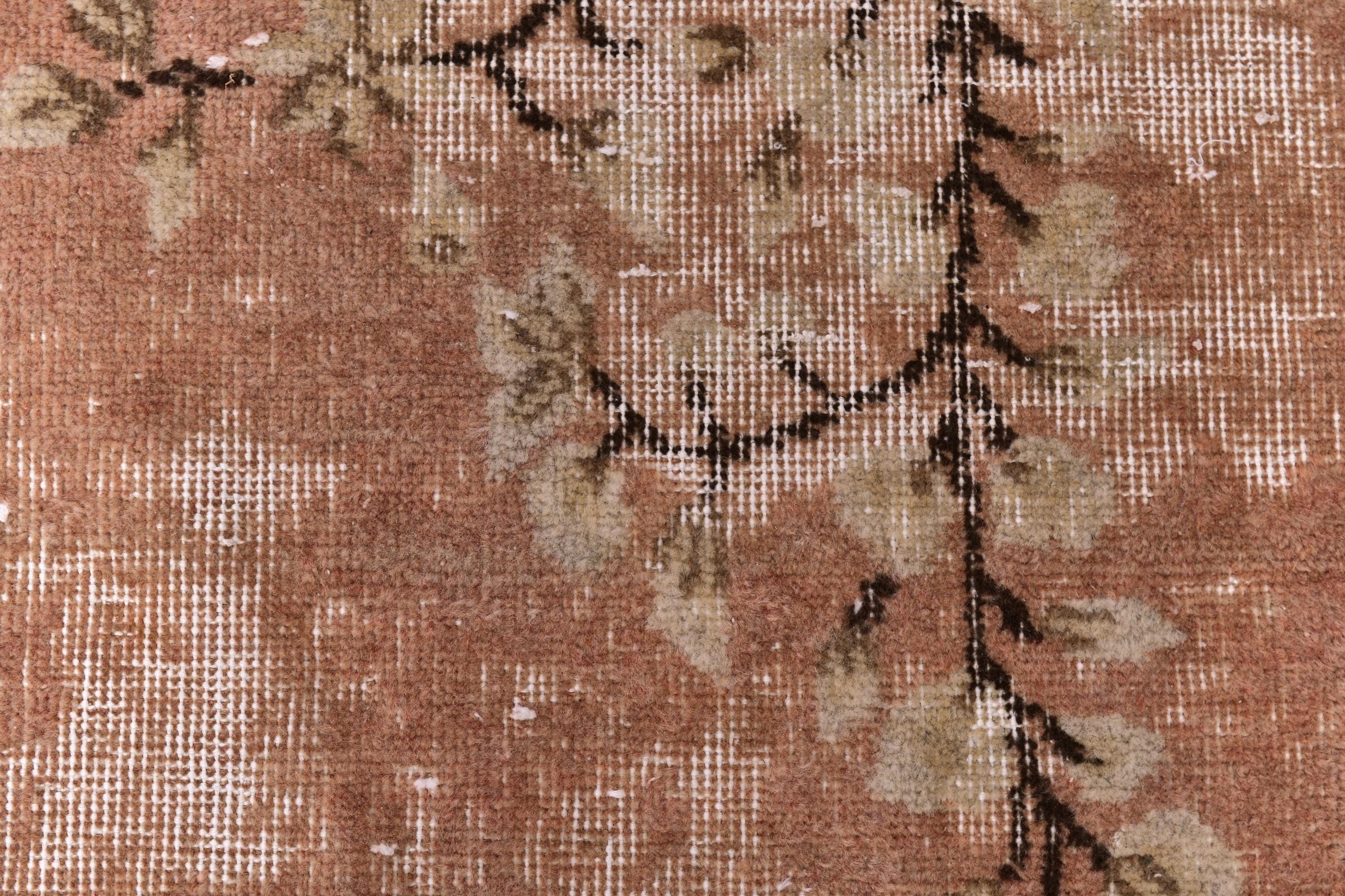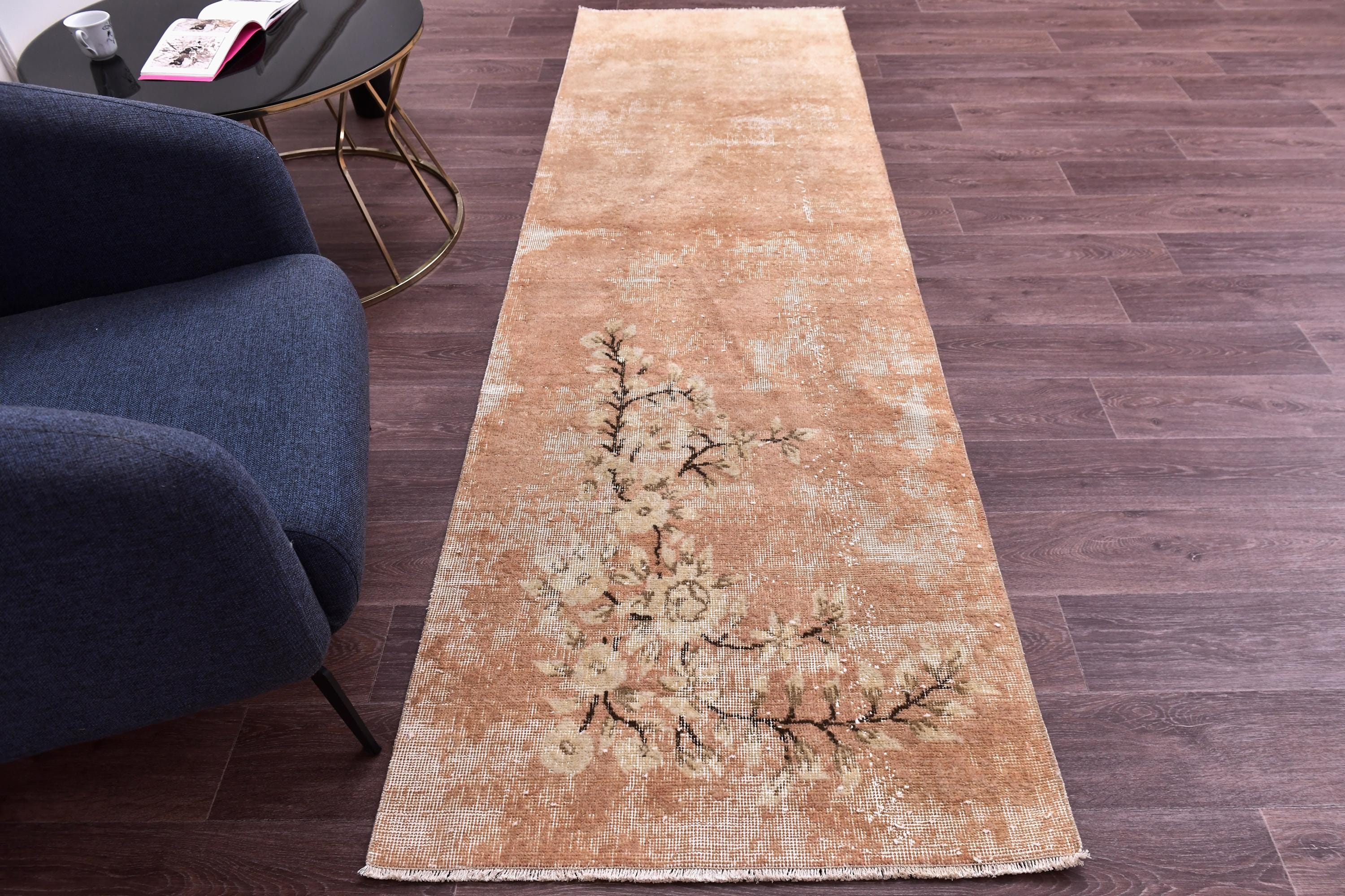 📜📌 Vintage Turkish runner rug featuring warm peachy coral and apricot tones with naturally faded distressed appearance, showcasing subtle minimalist floral branch design on open plain field, hand-knotted low pile wool construction with authentic worn texture and airy aesthetic, perfect long narrow carpet for modern bohemian hallways, entryways and corridors seeking understated organic elegance with soft neutral warmth