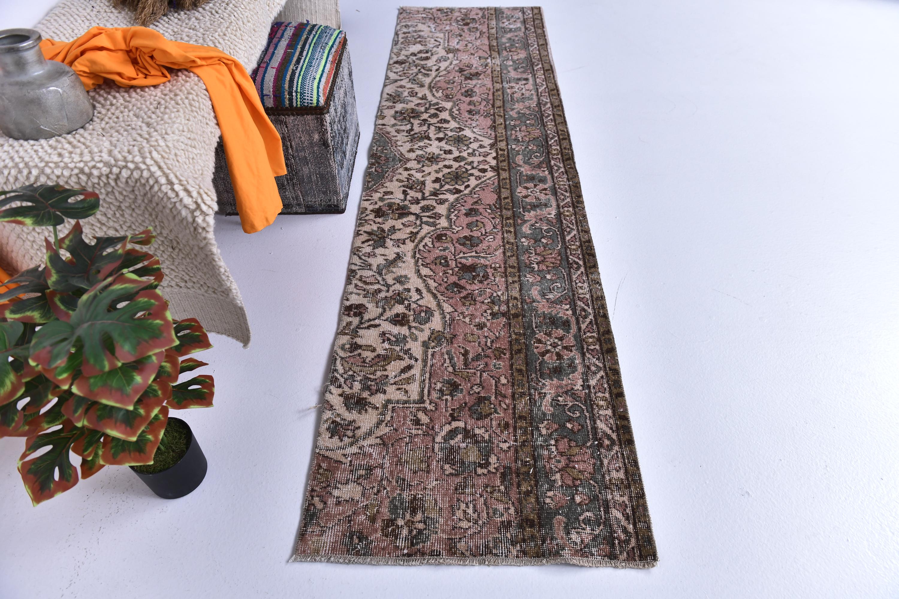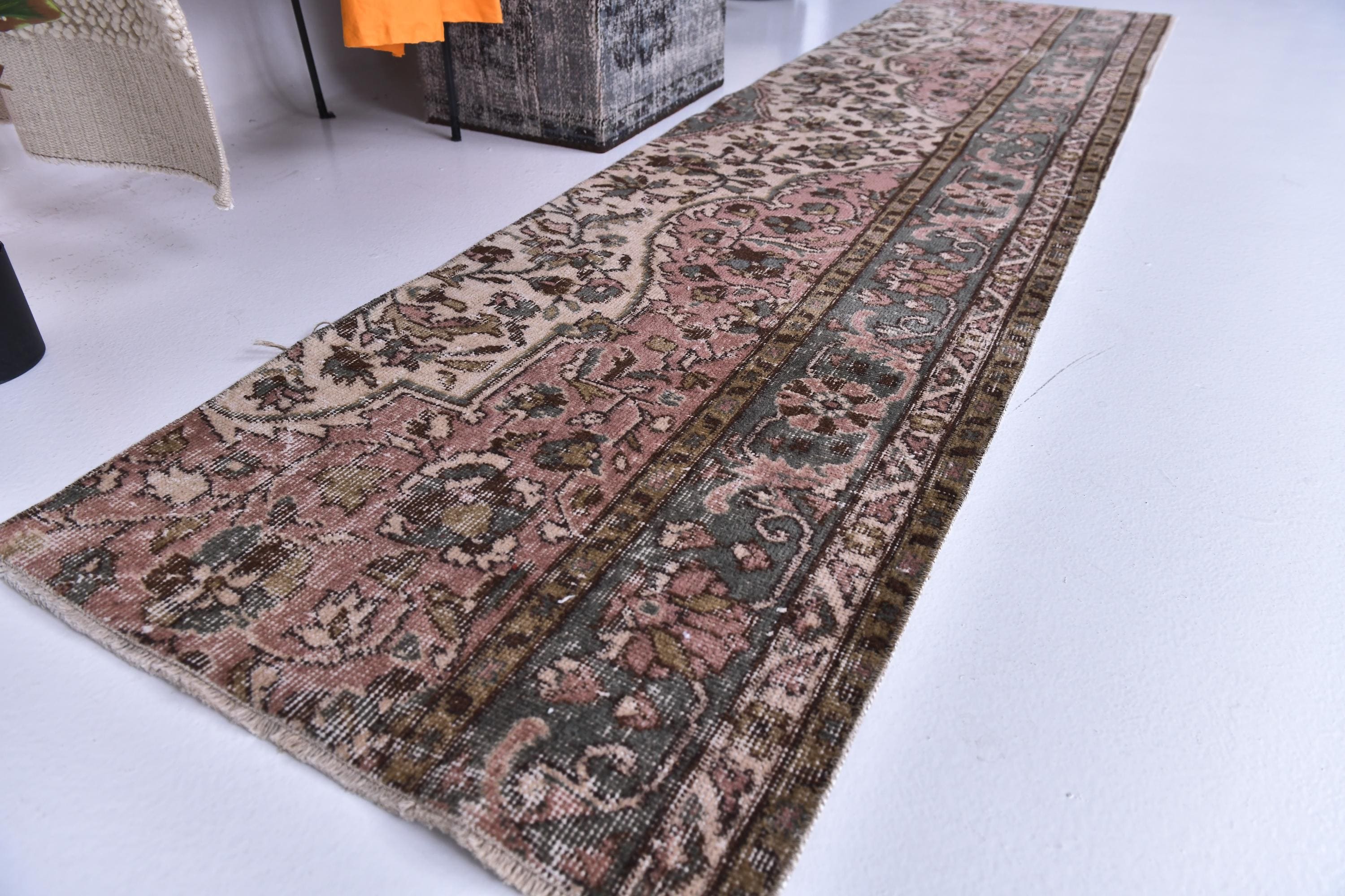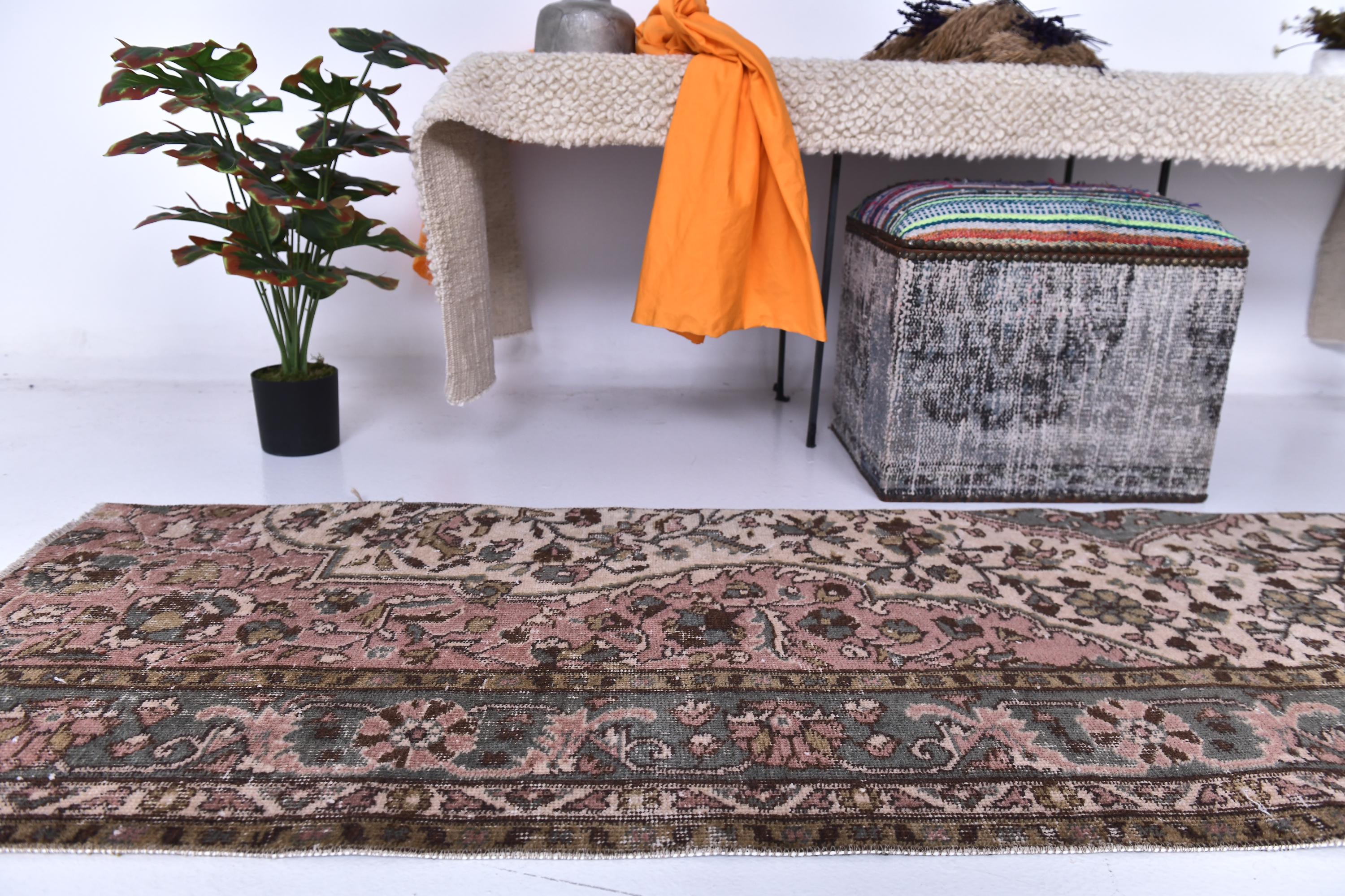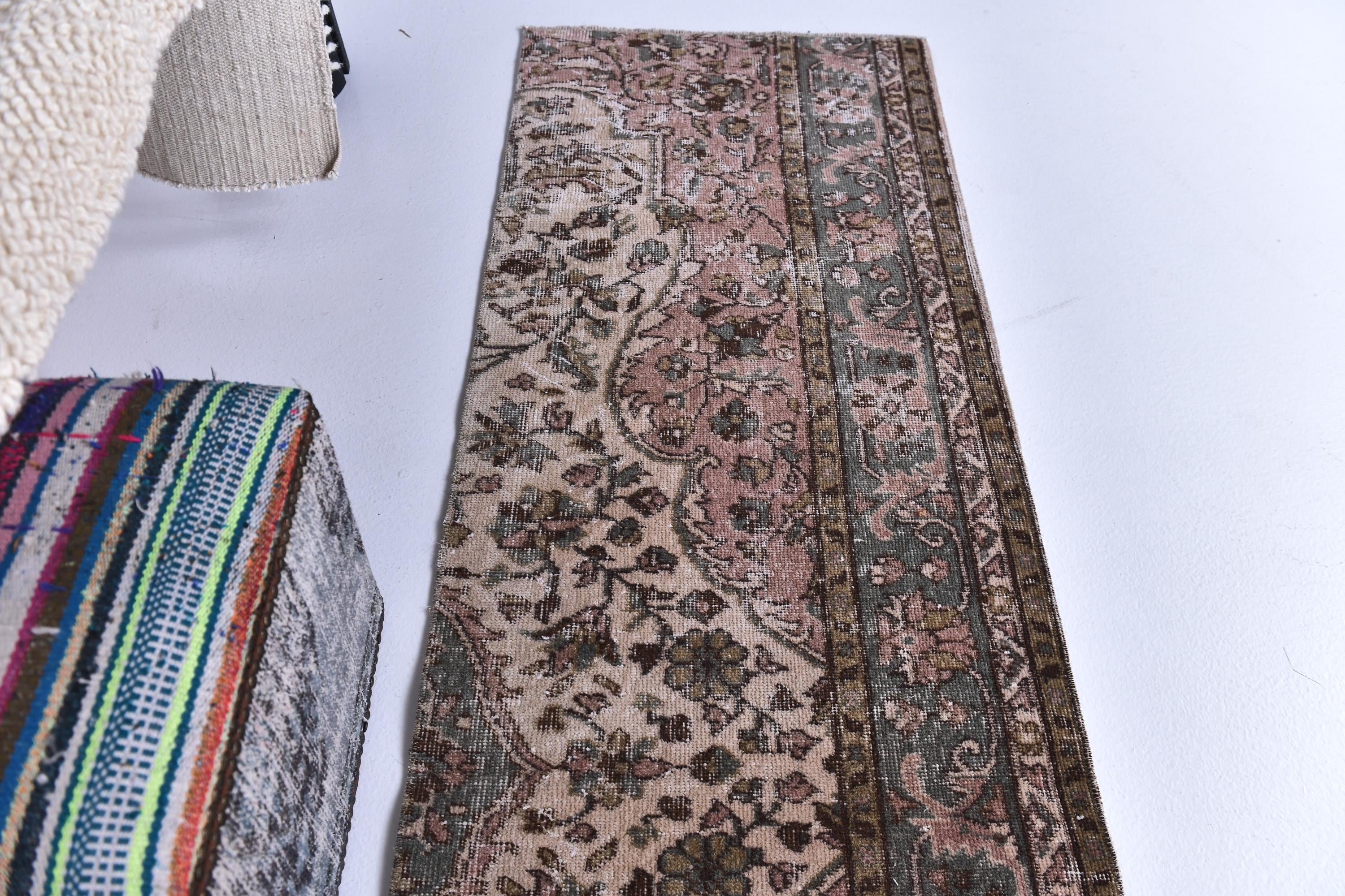 📜📌 Vintage Turkish runner rug featuring sophisticated faded color palette with dusty rose pink, charcoal gray, olive green and cream tones, showcasing intricate all-over floral vine pattern with traditional ornate borders, hand-knotted low pile wool with authentic distressed texture and naturally worn appearance, perfect long narrow carpet for hallways, entryways and corridors in bohemian and vintage inspired interiors