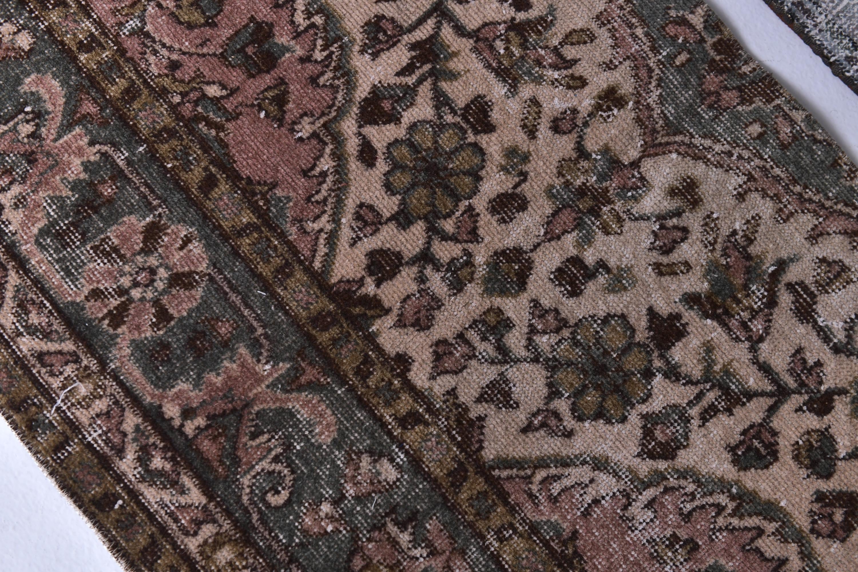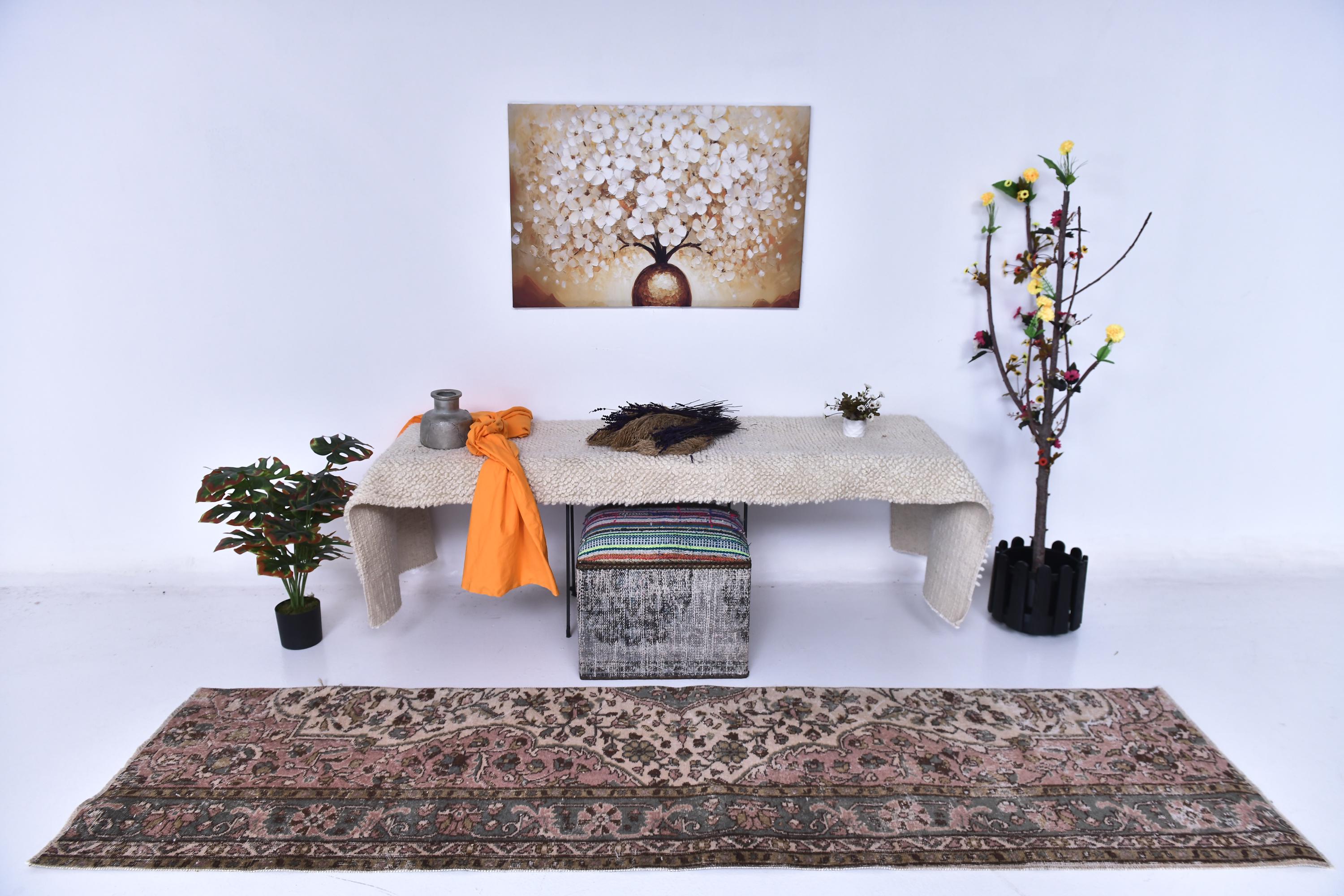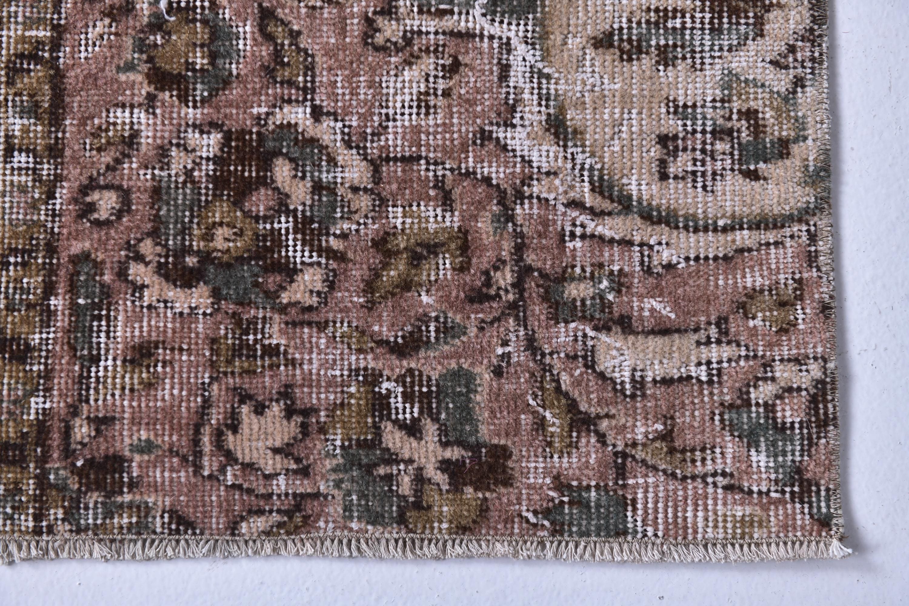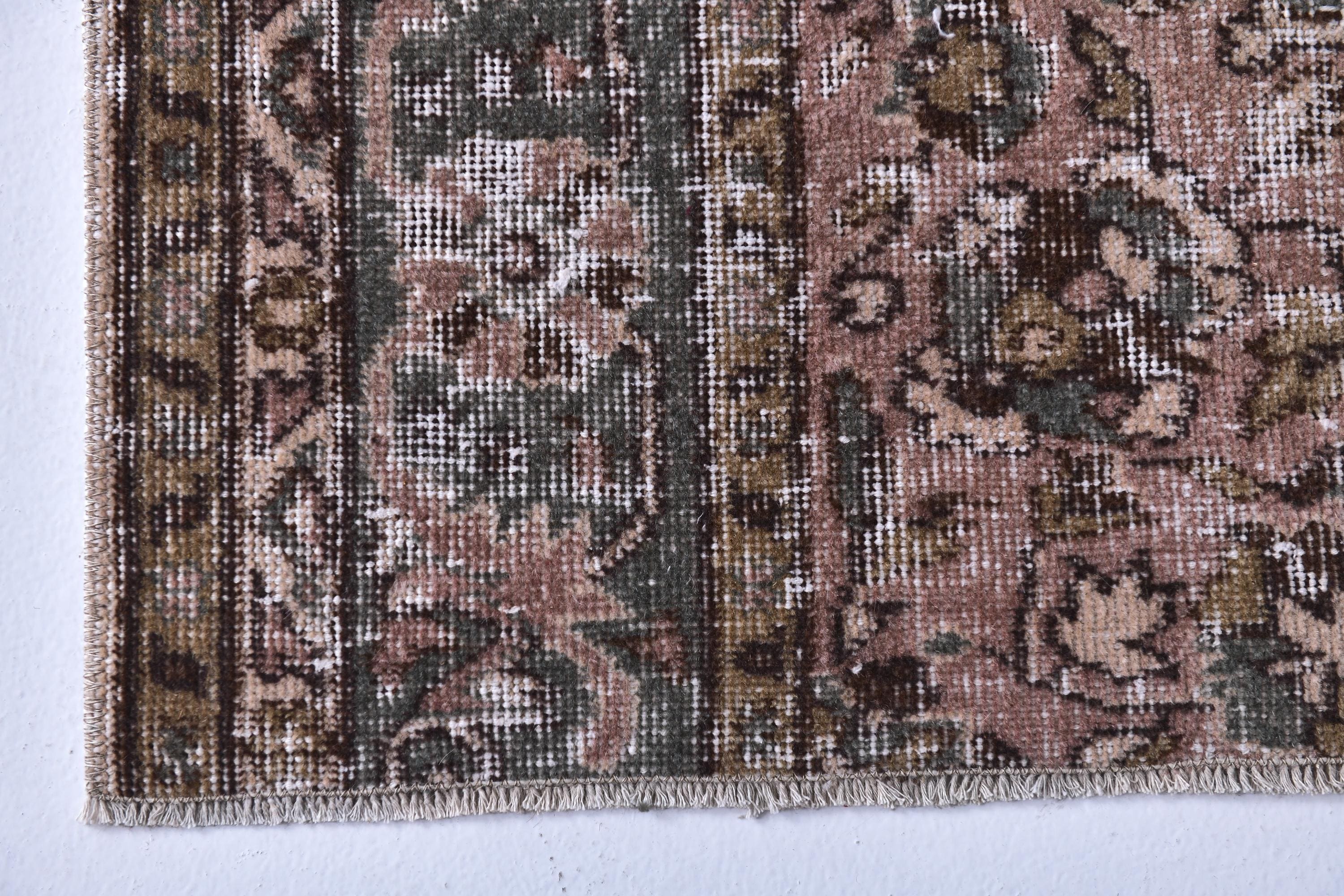 📜📌 Vintage Turkish runner rug featuring sophisticated faded color palette with dusty rose pink, charcoal gray, olive green and cream tones, showcasing intricate all-over floral vine pattern with traditional ornate borders, hand-knotted low pile wool with authentic distressed texture and naturally worn appearance, perfect long narrow carpet for hallways, entryways and corridors in bohemian and vintage inspired interiors