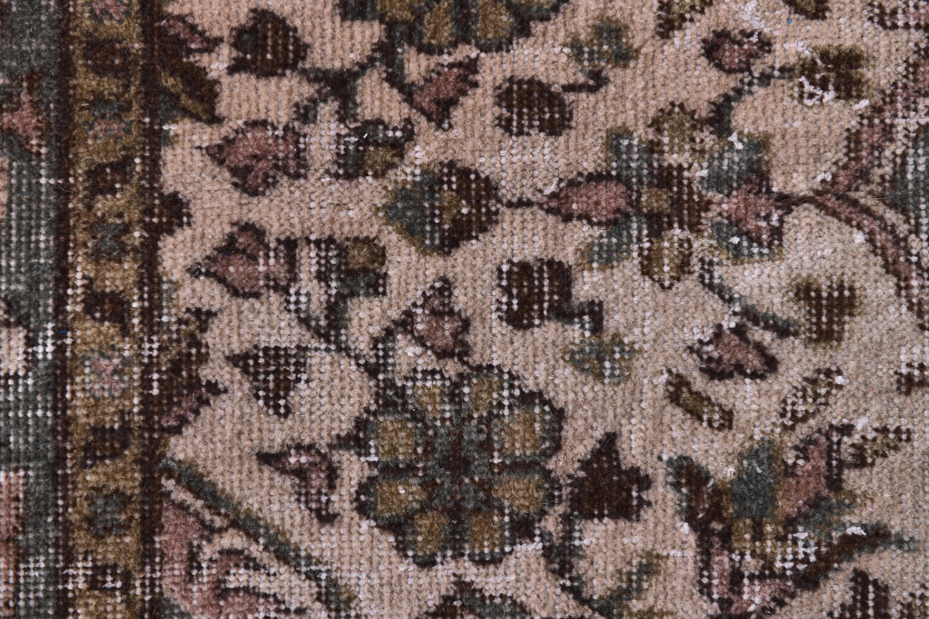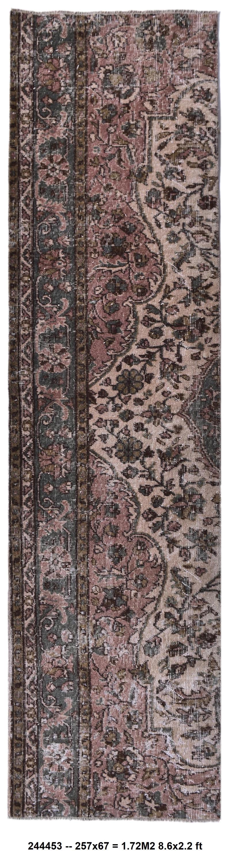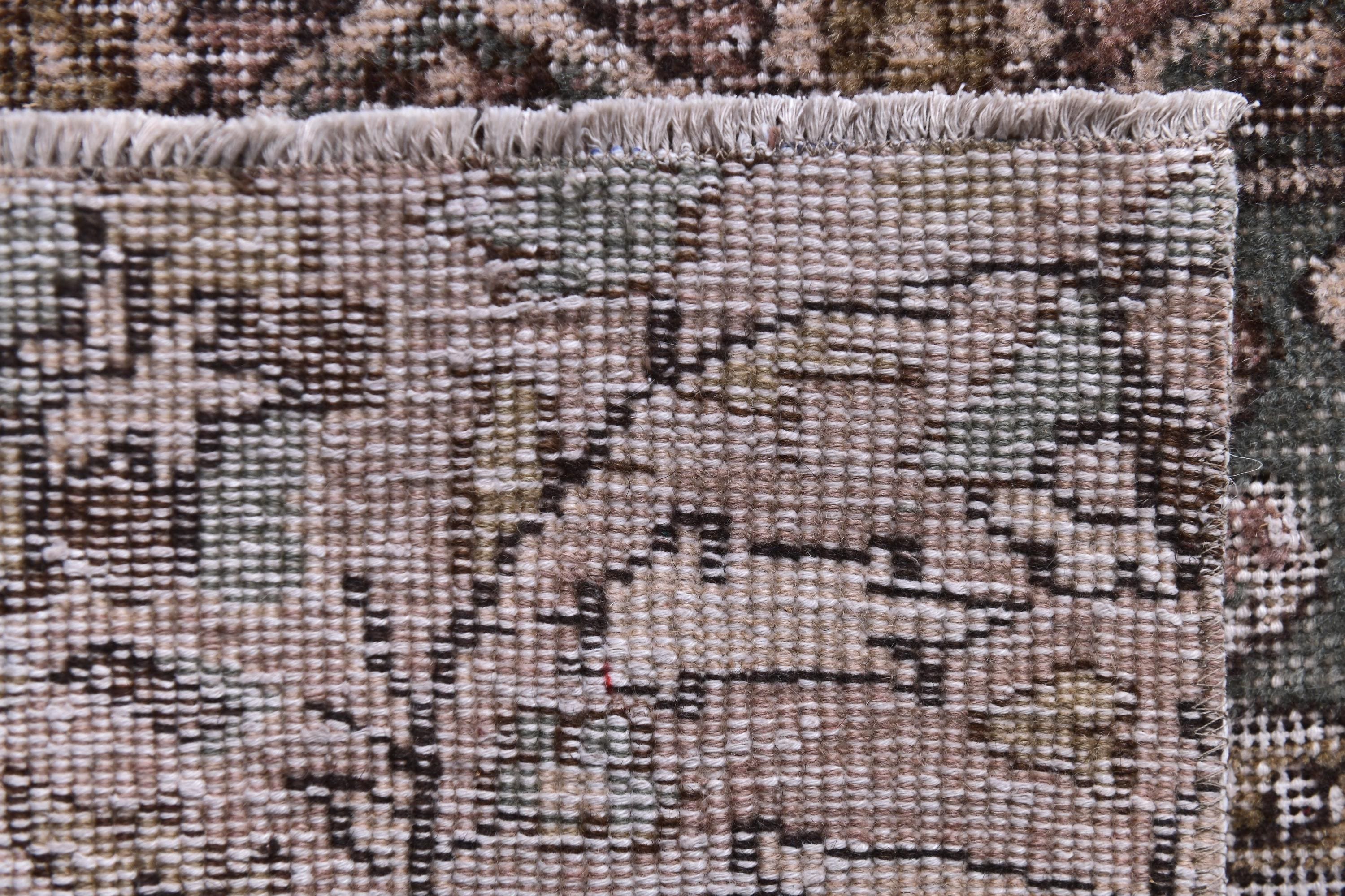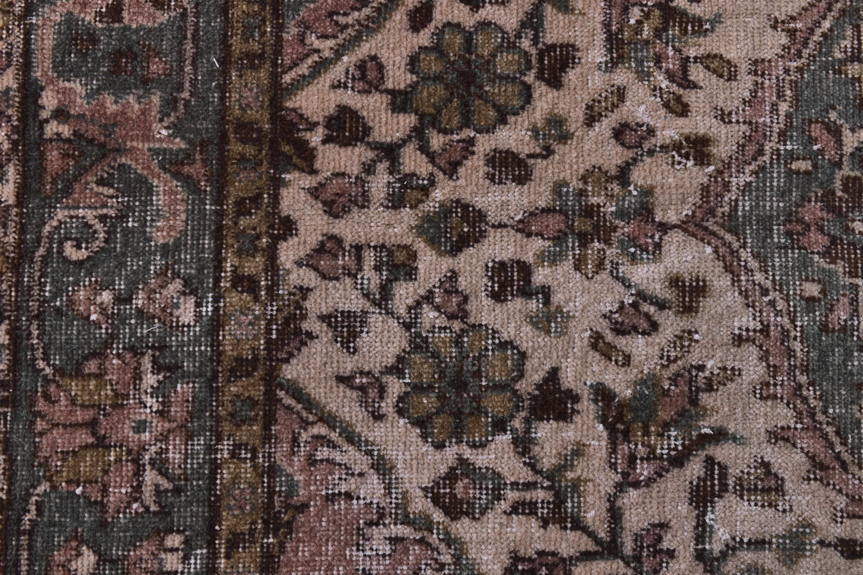📜📌 Vintage Turkish runner rug featuring sophisticated faded color palette with dusty rose pink, charcoal gray, olive green and cream tones, showcasing intricate all-over floral vine pattern with traditional ornate borders, hand-knotted low pile wool with authentic distressed texture and naturally worn appearance, perfect long narrow carpet for hallways, entryways and corridors in bohemian and vintage inspired interiors