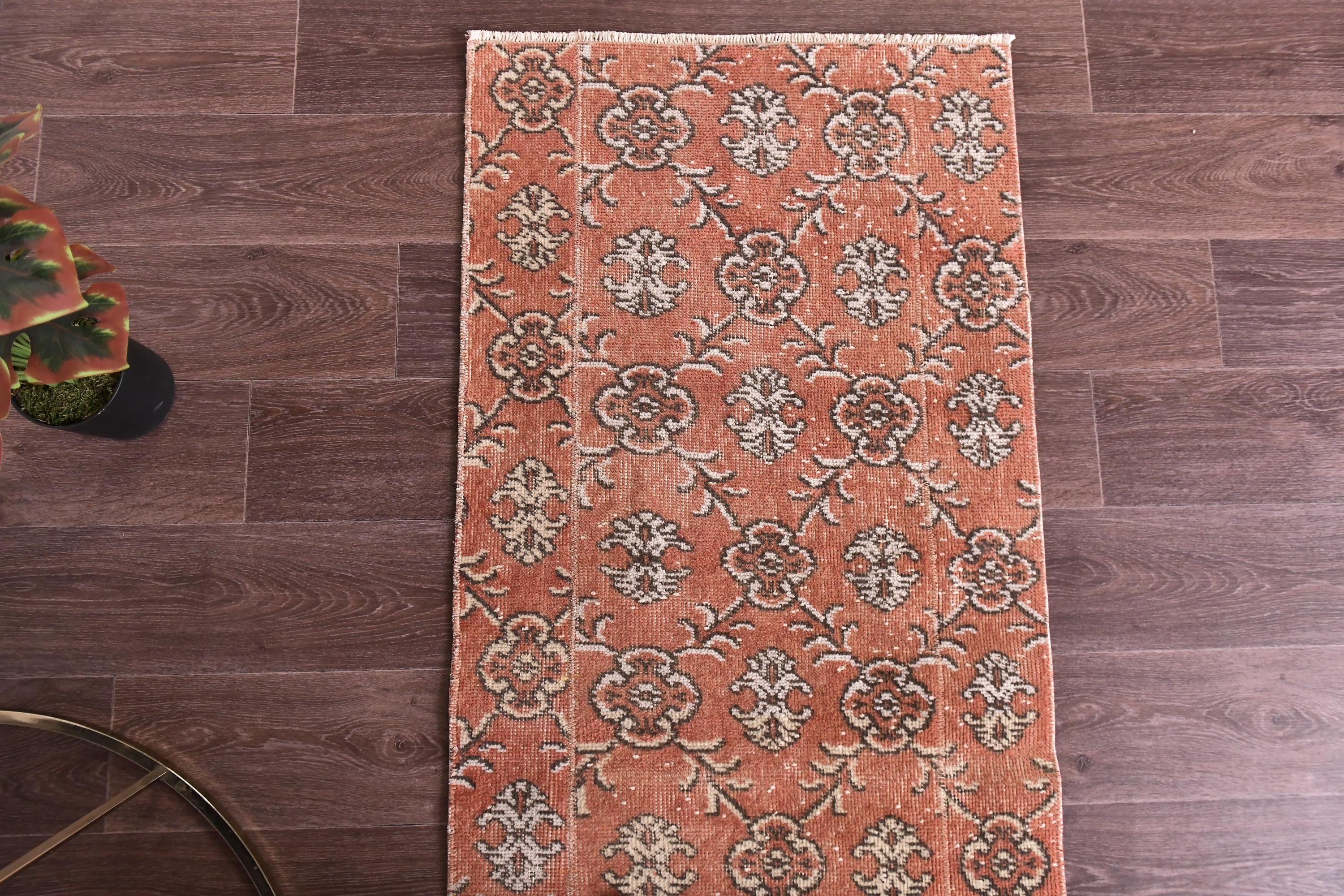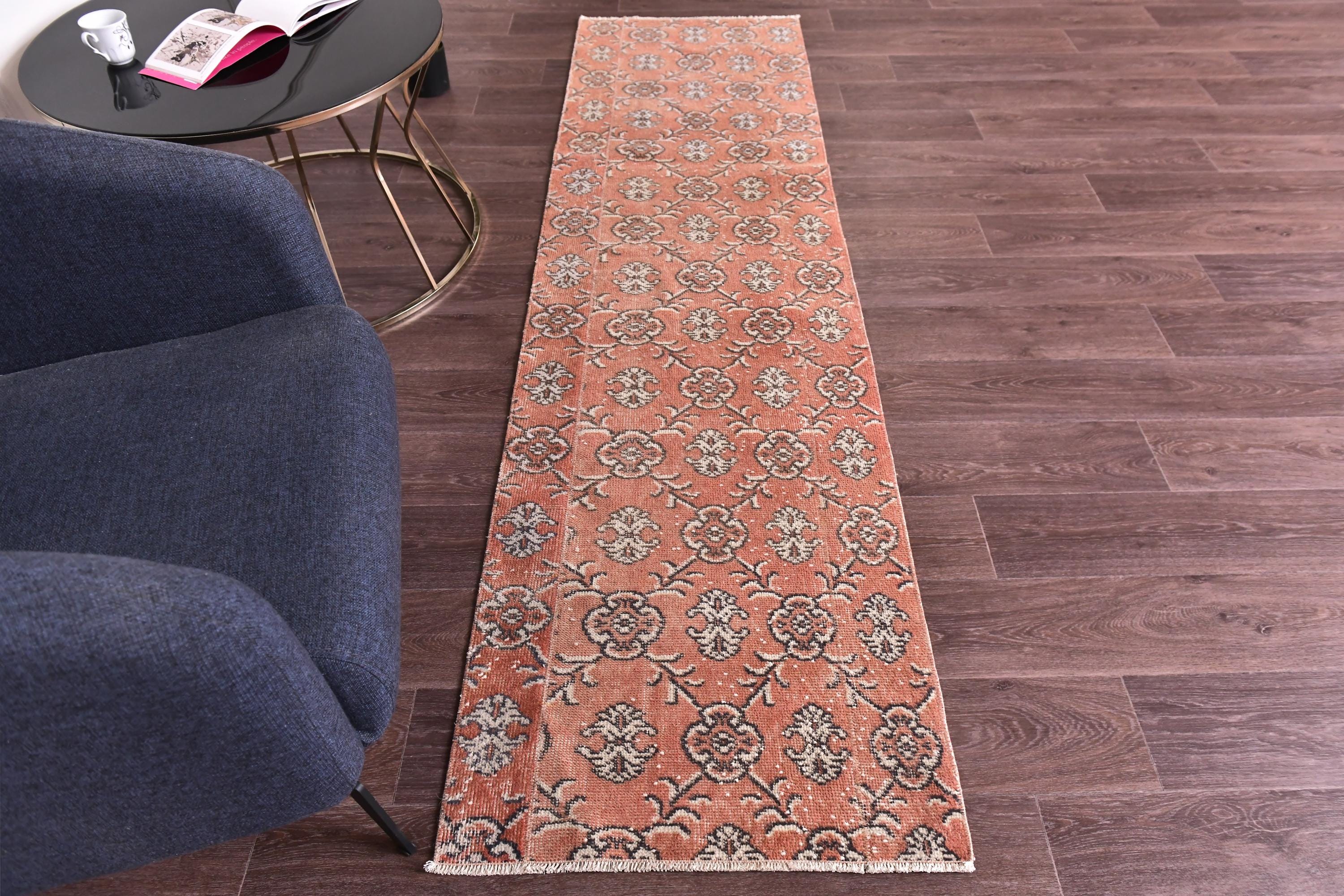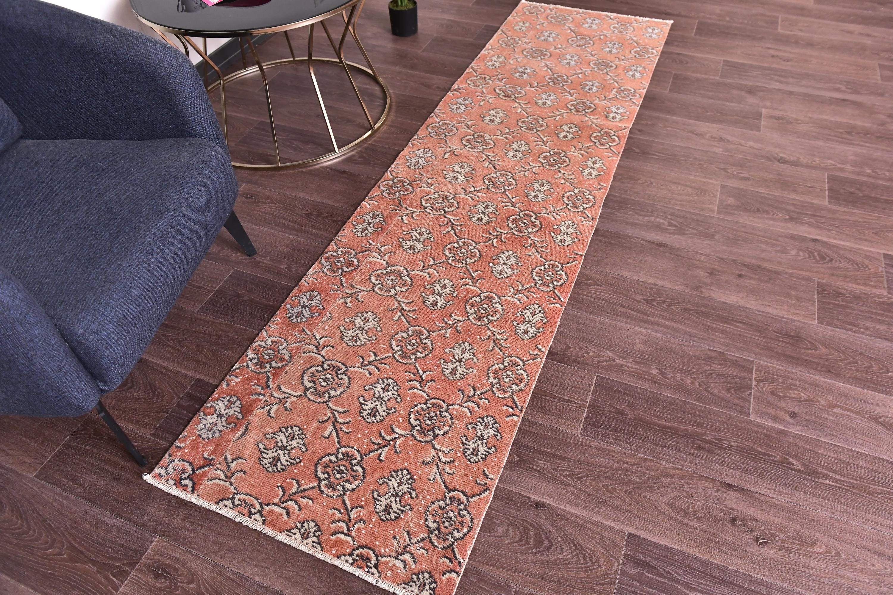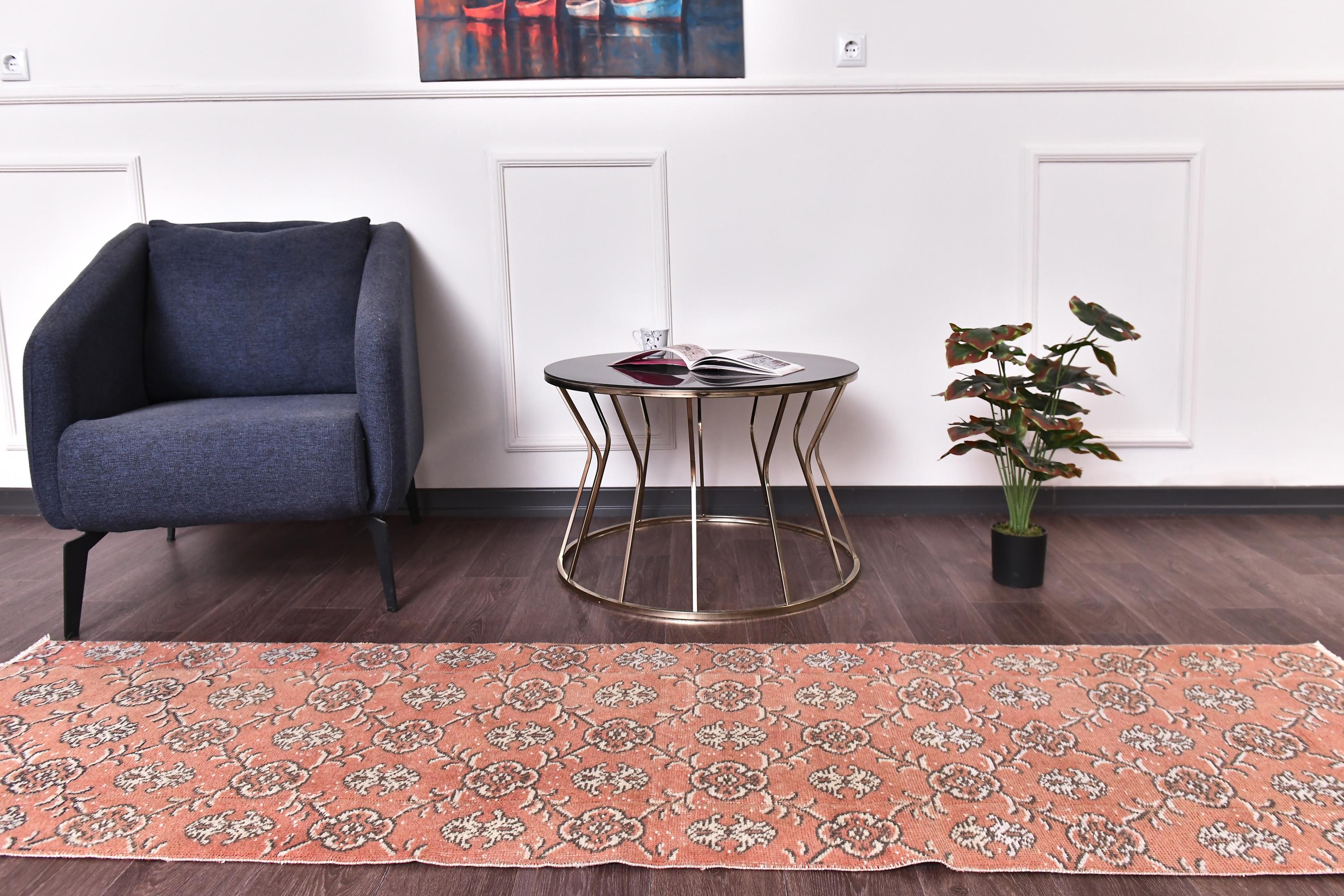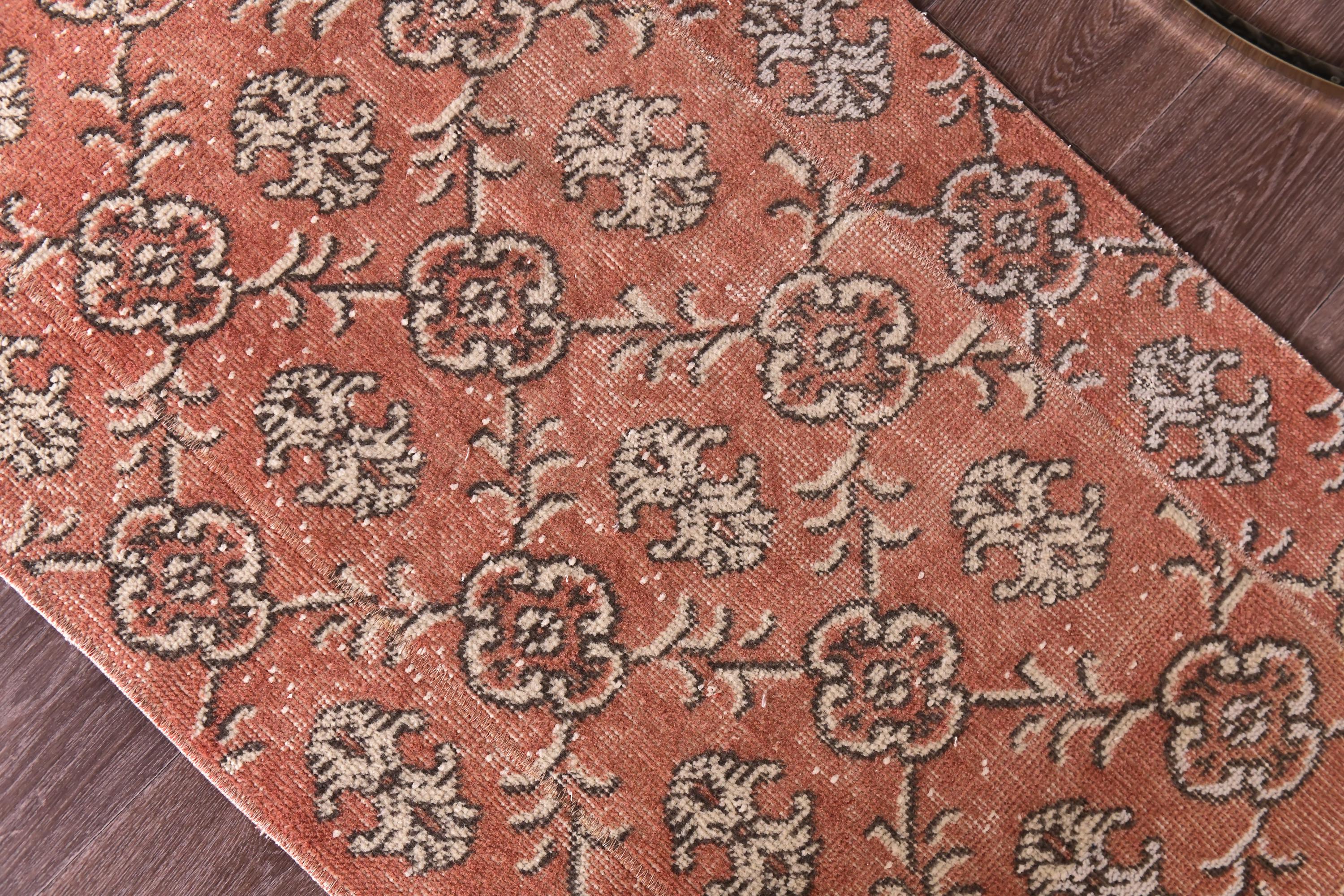 📜📌 Vintage Turkish runner rug featuring sophisticated faded color palette with rich terracotta and cream tones, showcasing intricate all-over floral vine pattern with traditional ornate borders, hand-knotted low pile wool with authentic distressed texture and naturally worn appearance, perfect long narrow carpet for hallways, entryways and corridors in bohemian and vintage inspired interiors