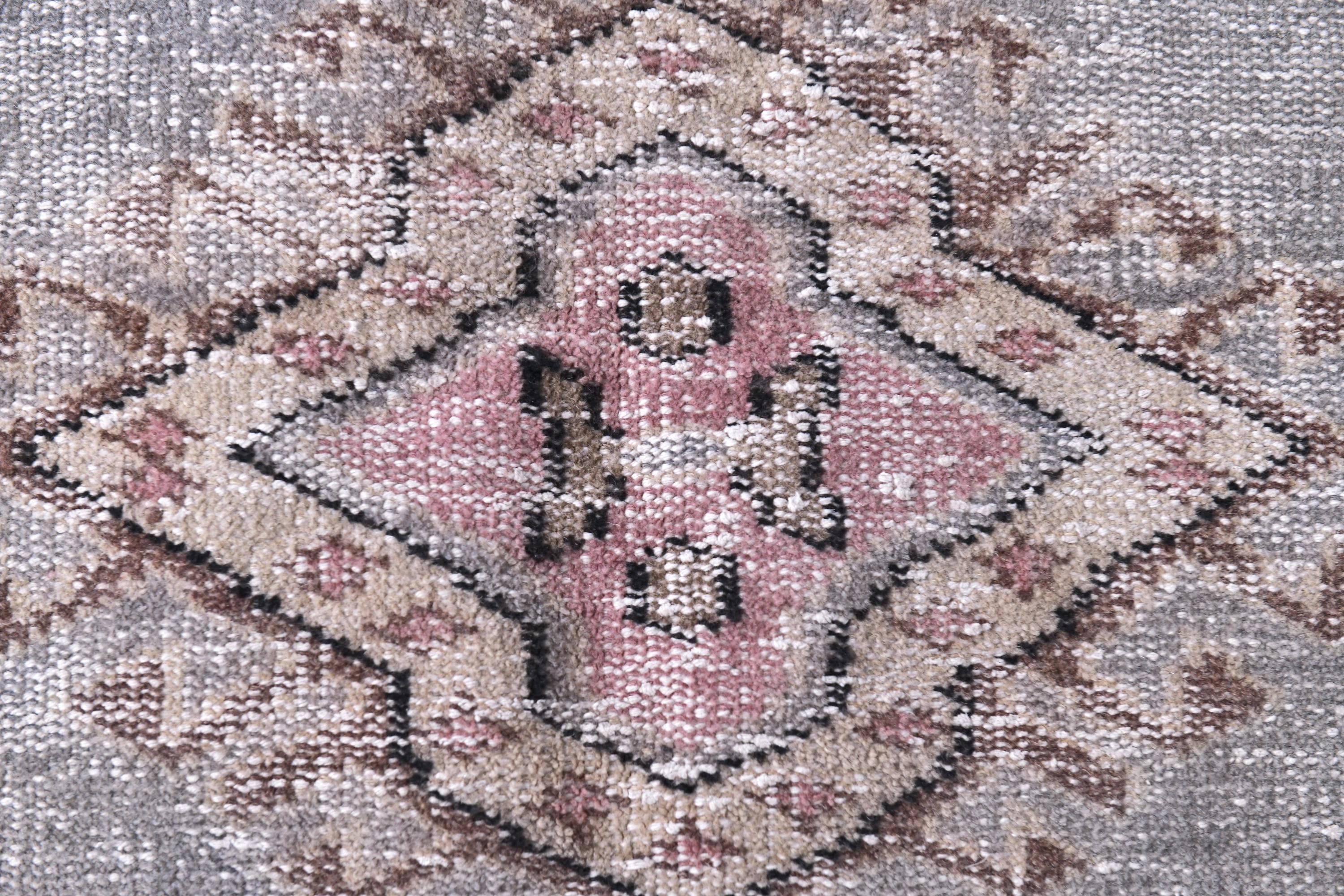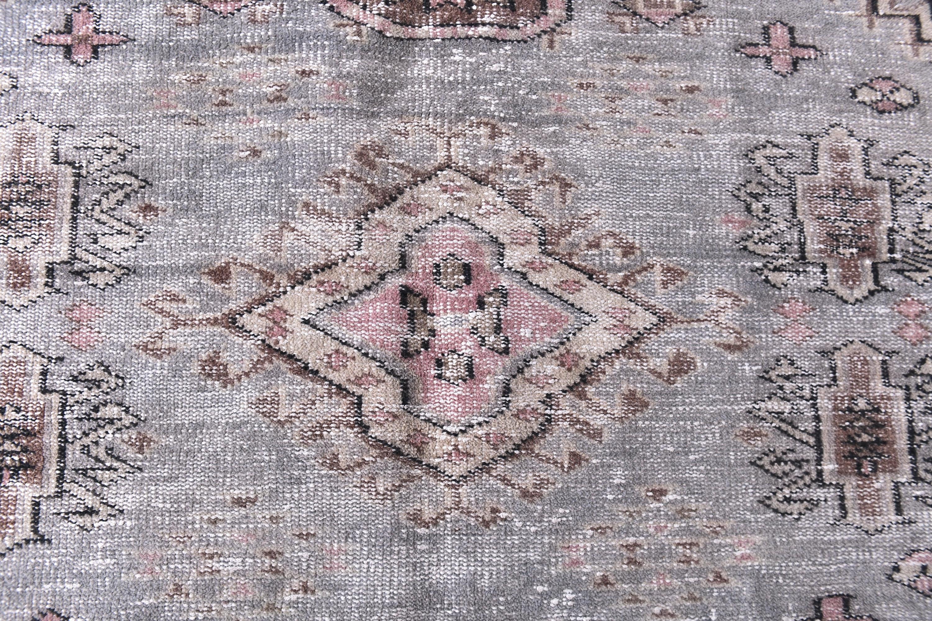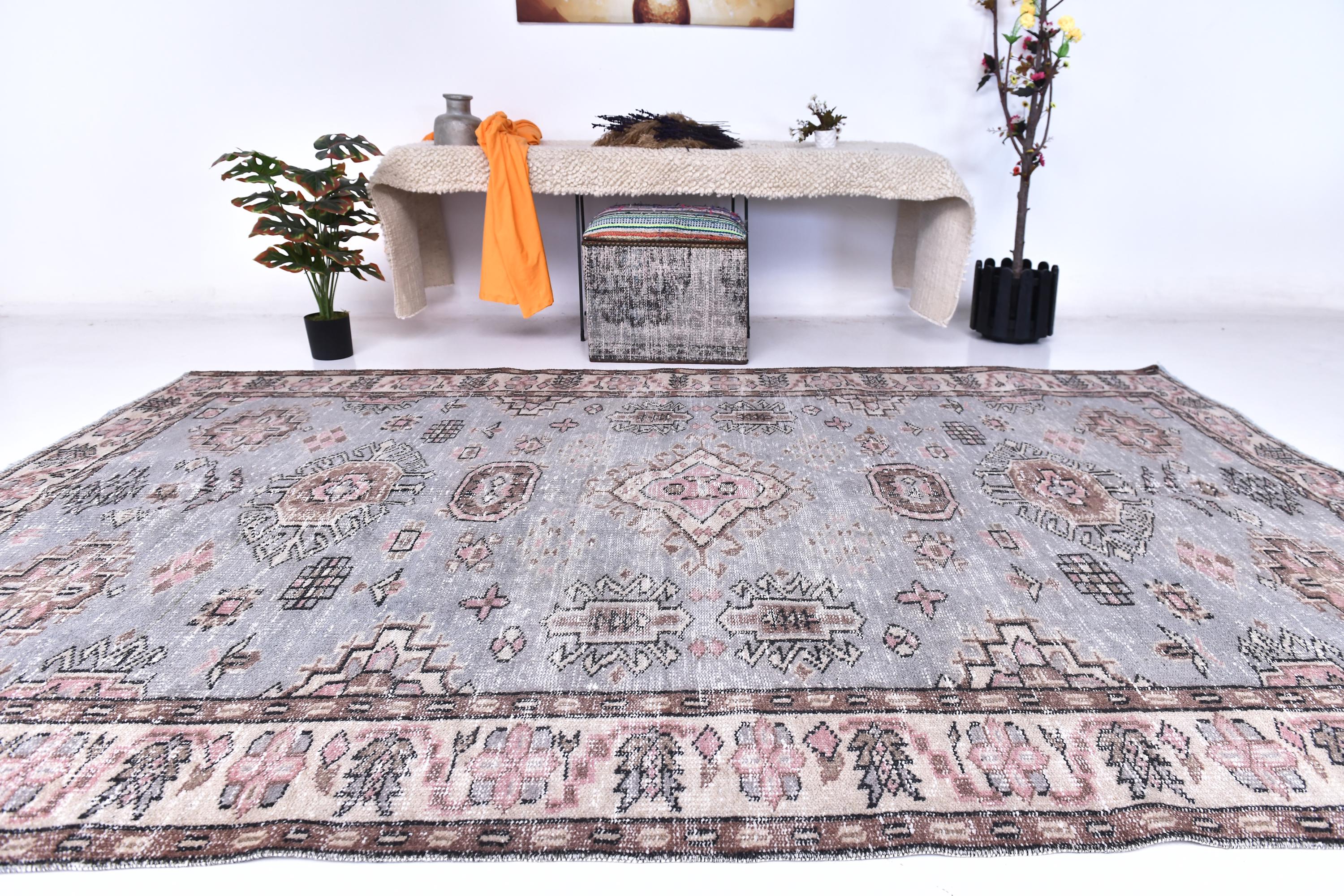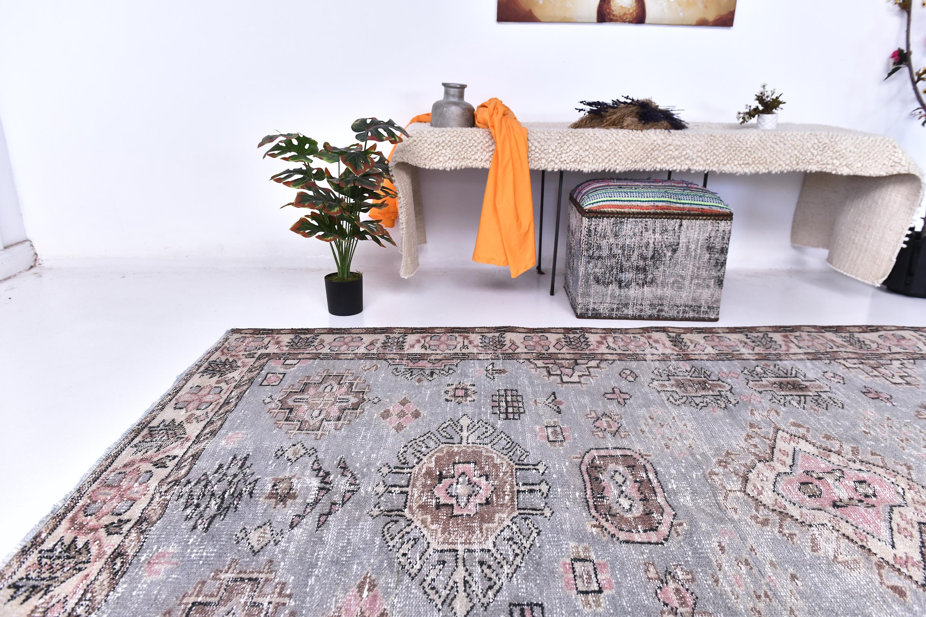 📜📌Vintage Turkish Oushak area rug featuring soft gray field with faded pink border and repeating geometric medallions, showcasing authentic distressed patina and low pile texture in a modern white interior setting, perfect for contemporary bohemian living spaces