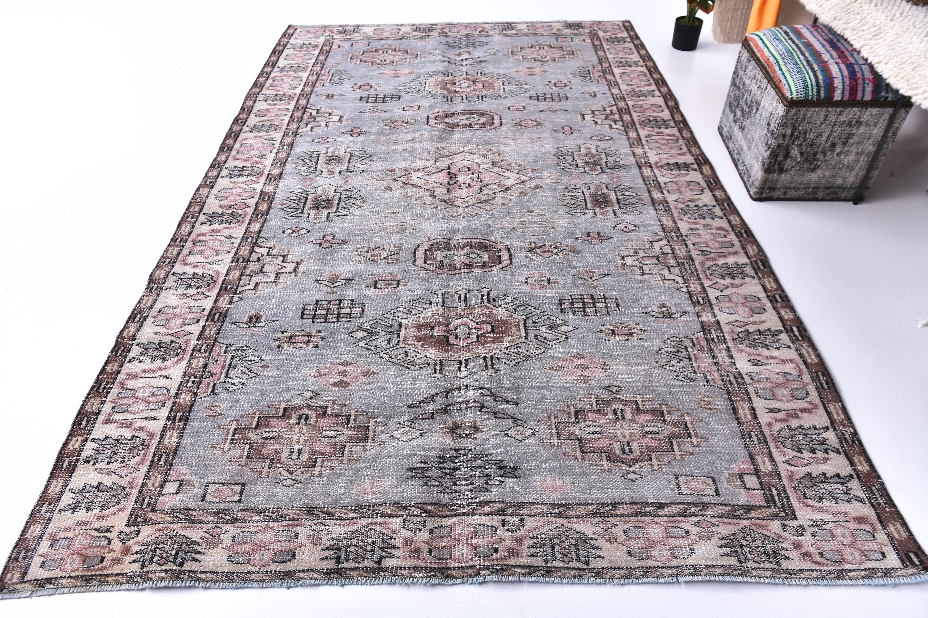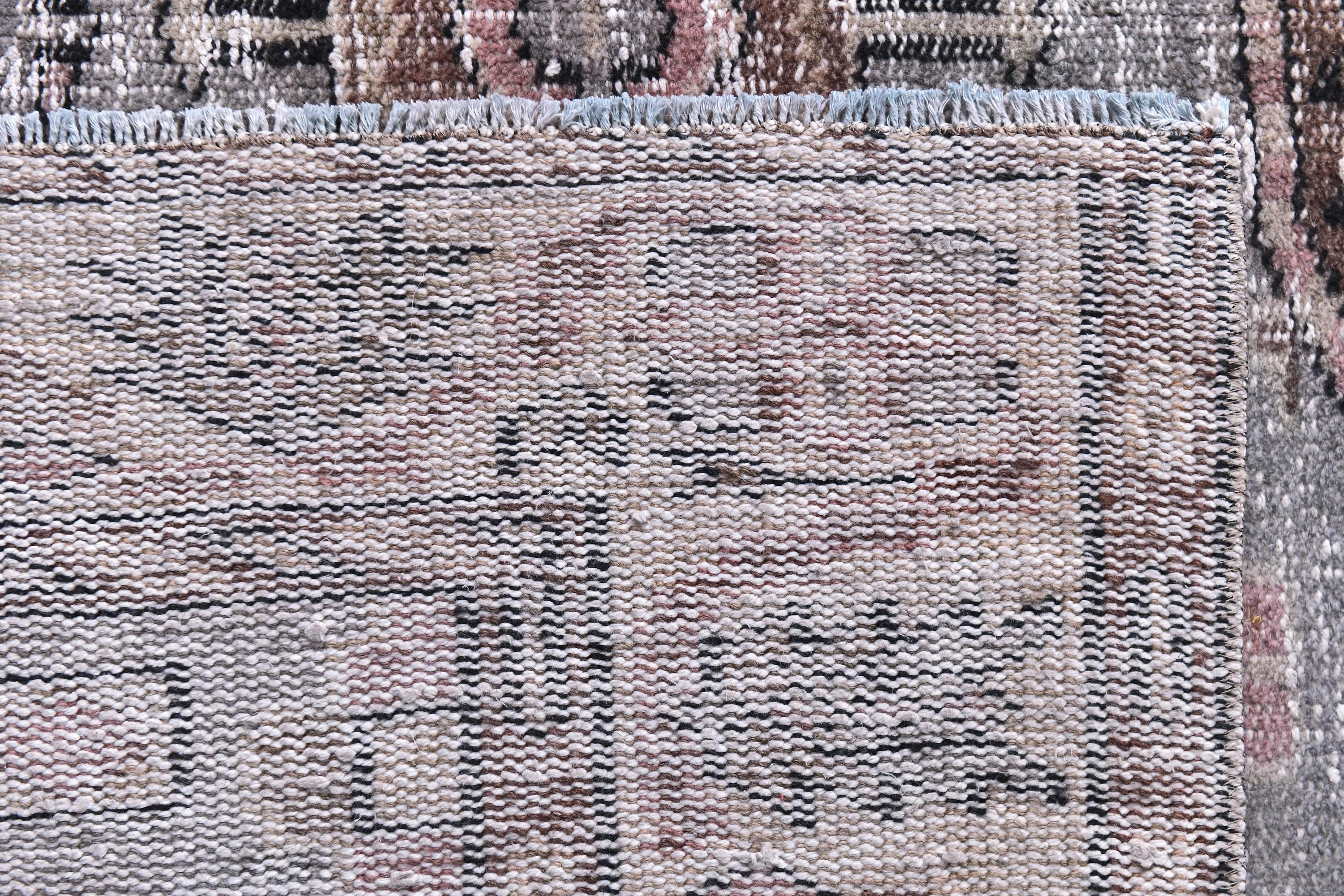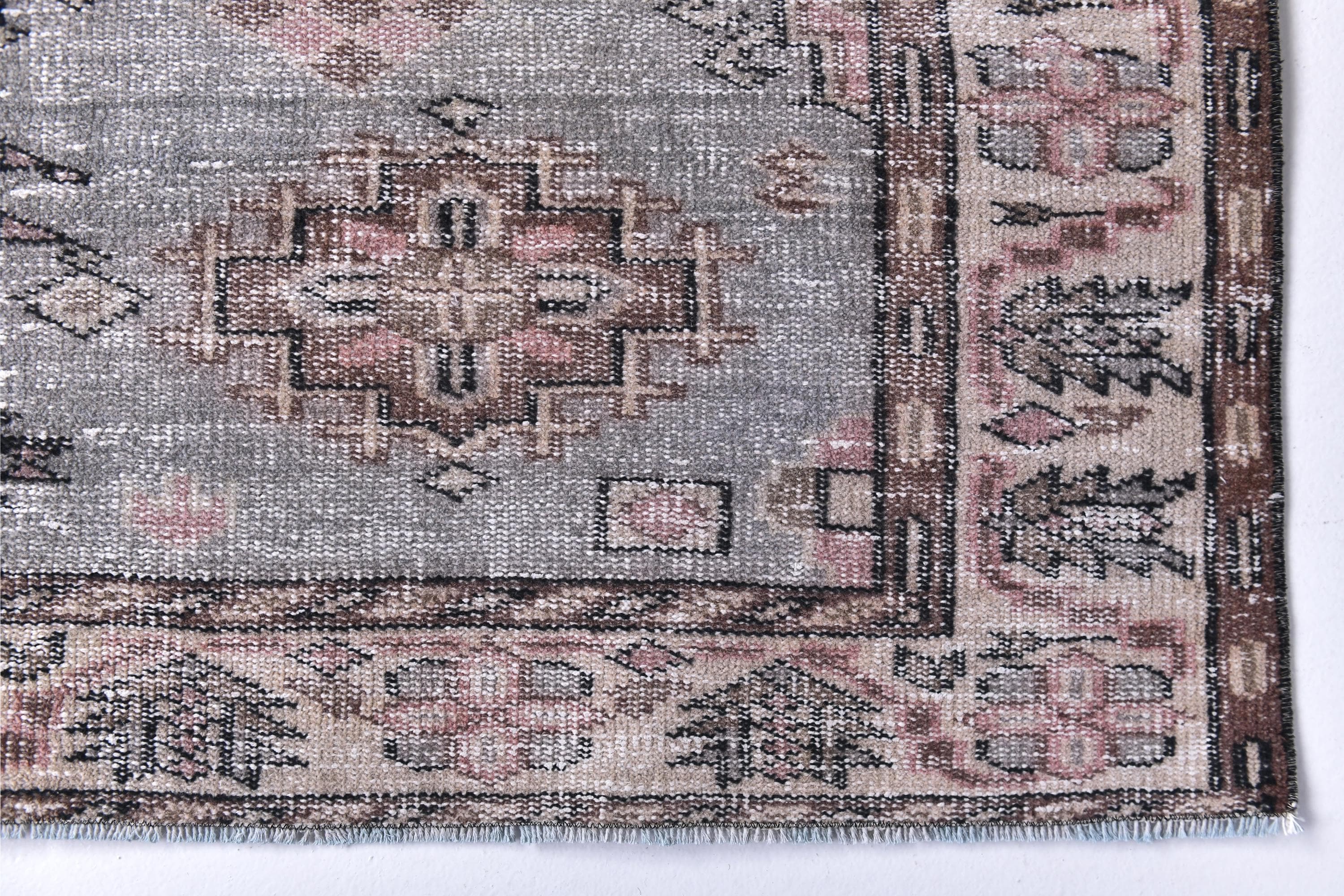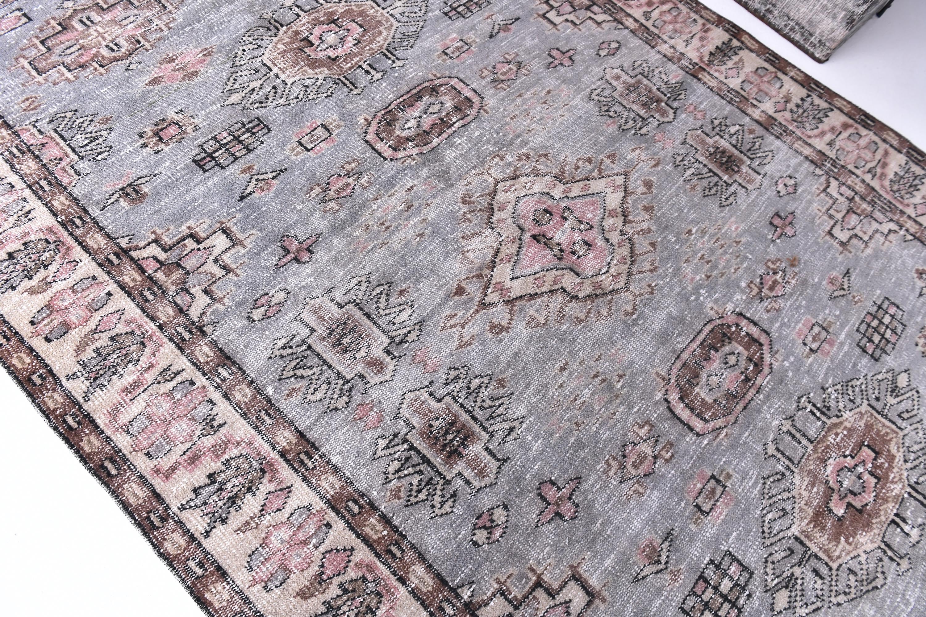 📜📌Vintage Turkish Oushak area rug featuring soft gray field with faded pink border and repeating geometric medallions, showcasing authentic distressed patina and low pile texture in a modern white interior setting, perfect for contemporary bohemian living spaces