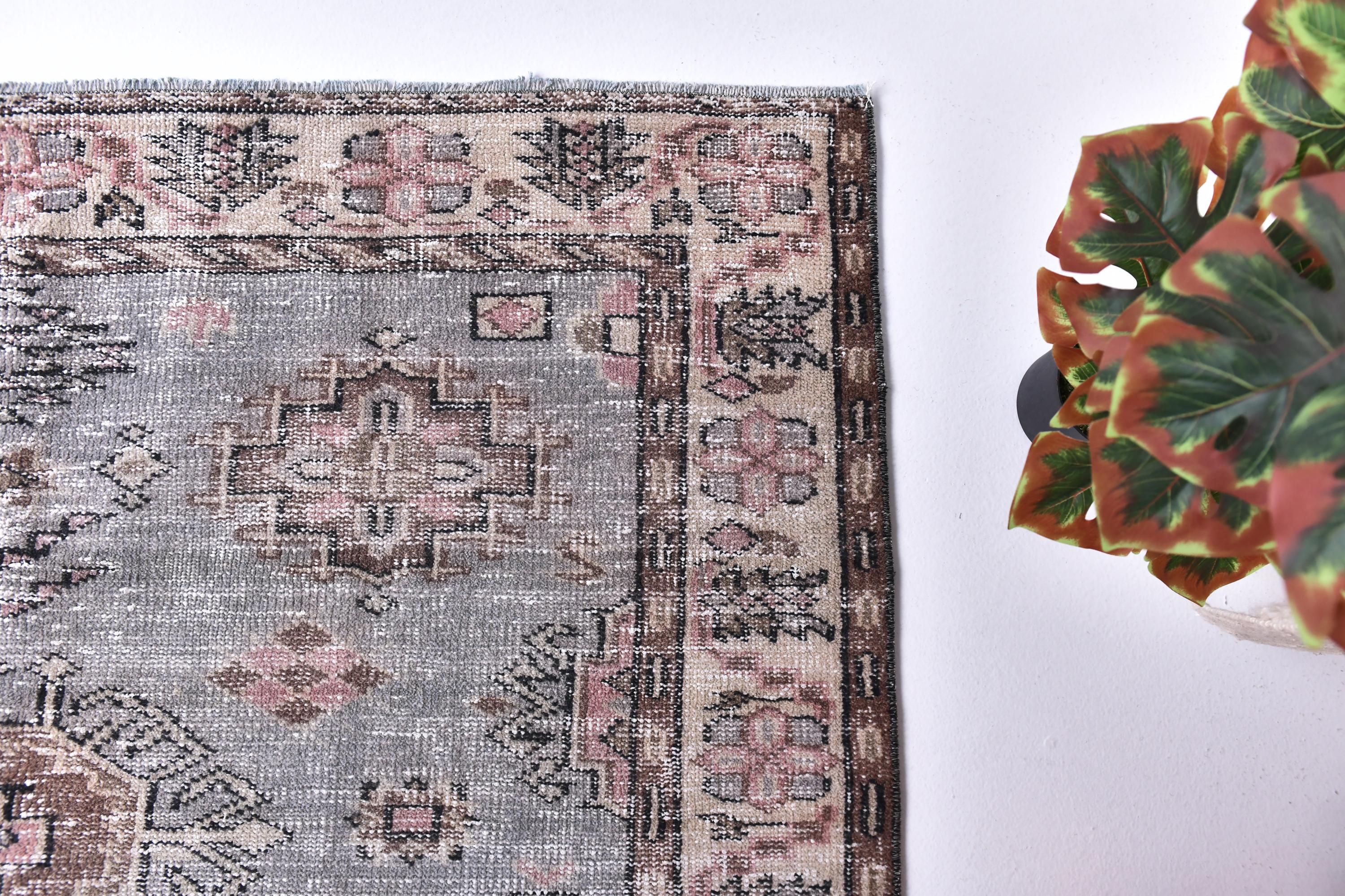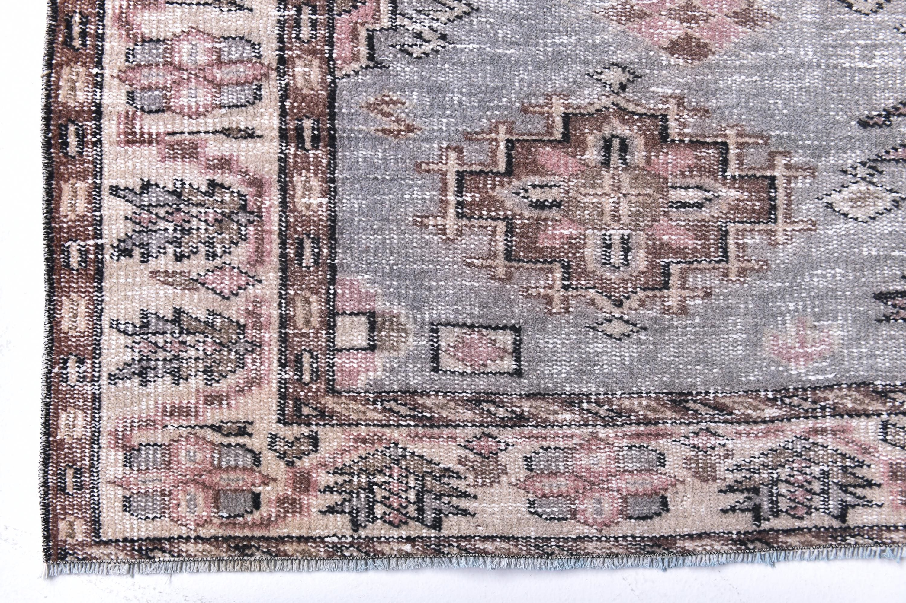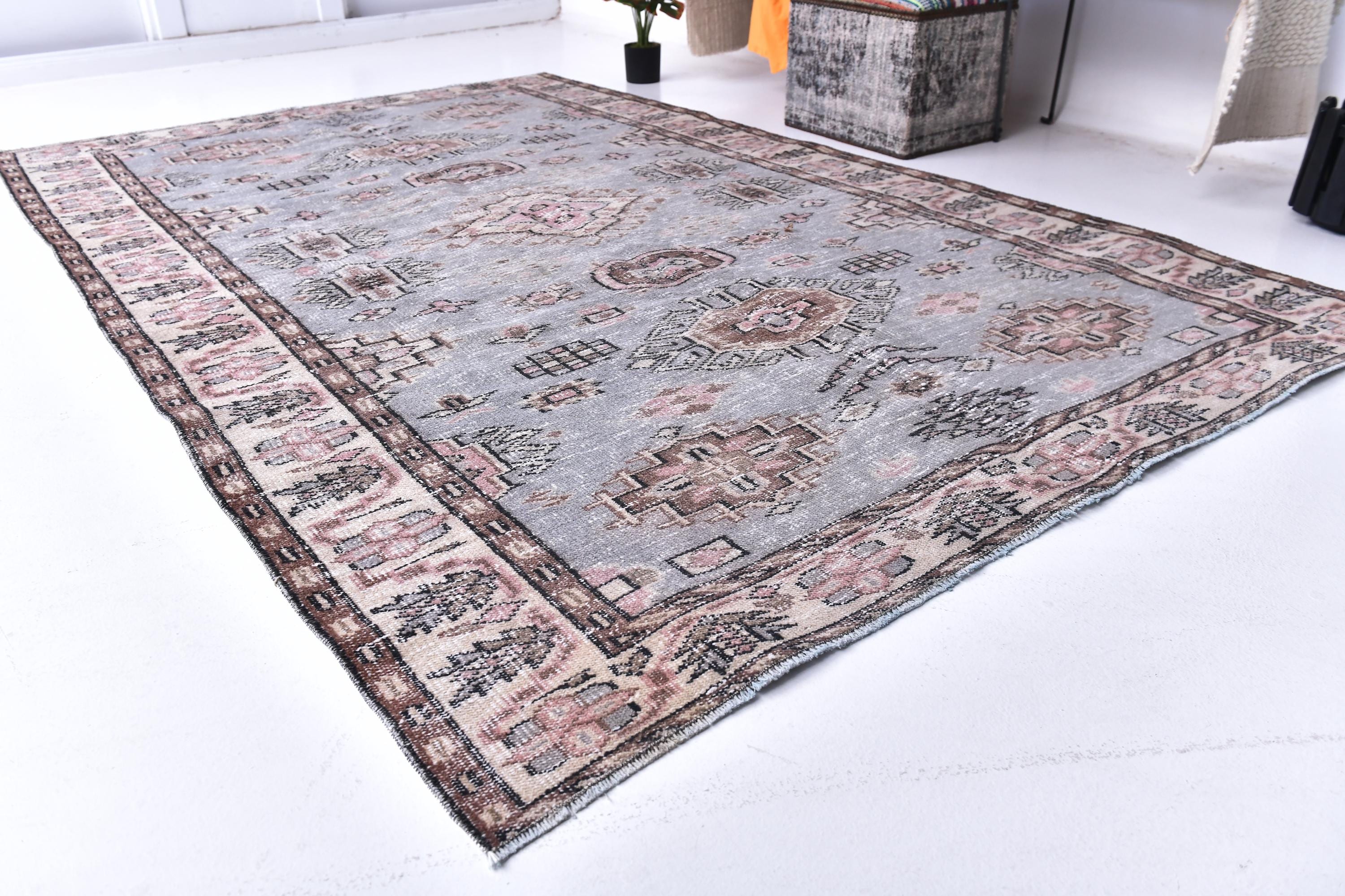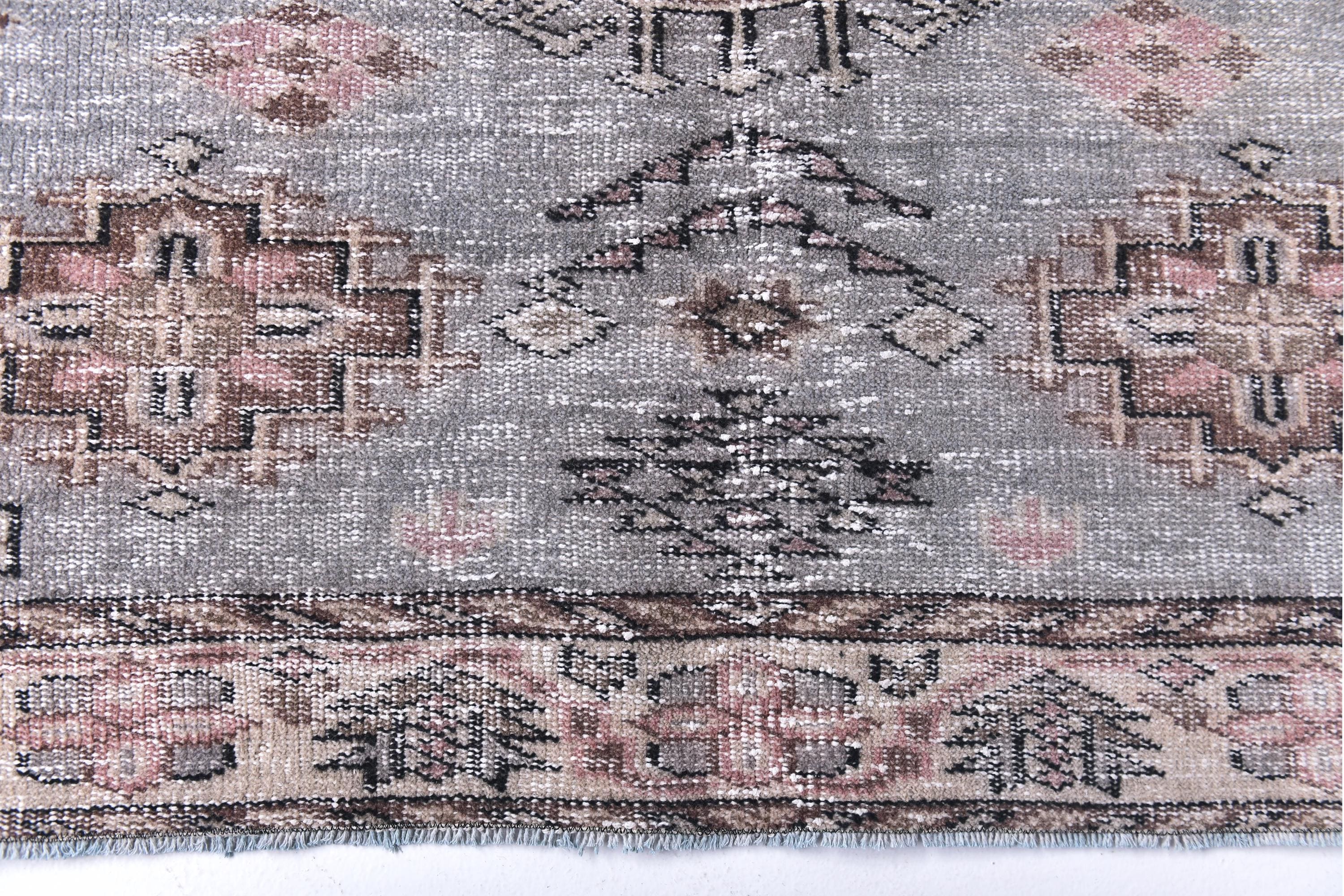 📜📌Vintage Turkish Oushak area rug featuring soft gray field with faded pink border and repeating geometric medallions, showcasing authentic distressed patina and low pile texture in a modern white interior setting, perfect for contemporary bohemian living spaces