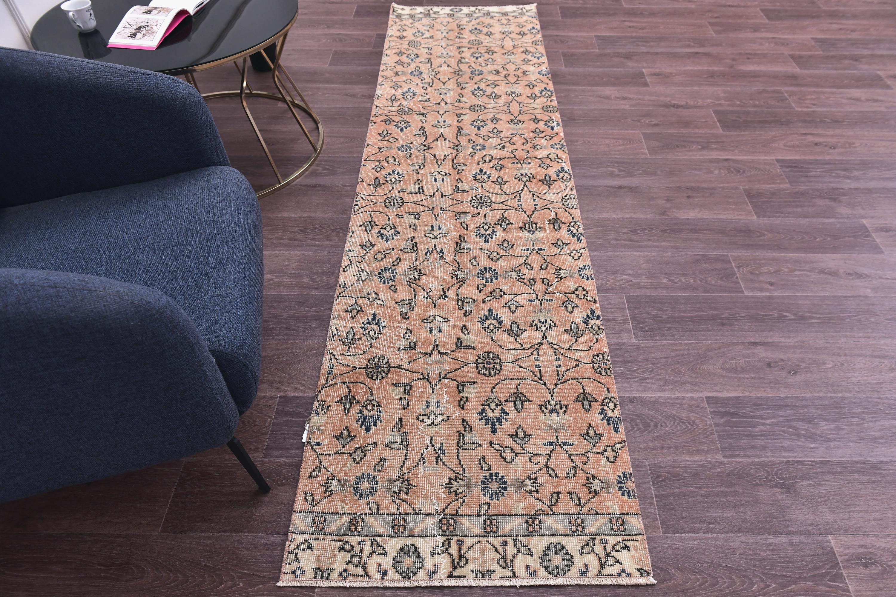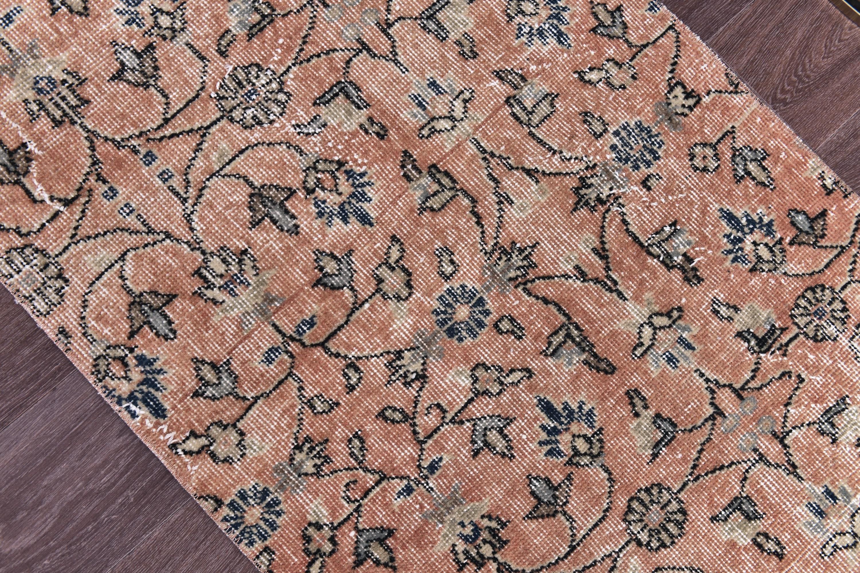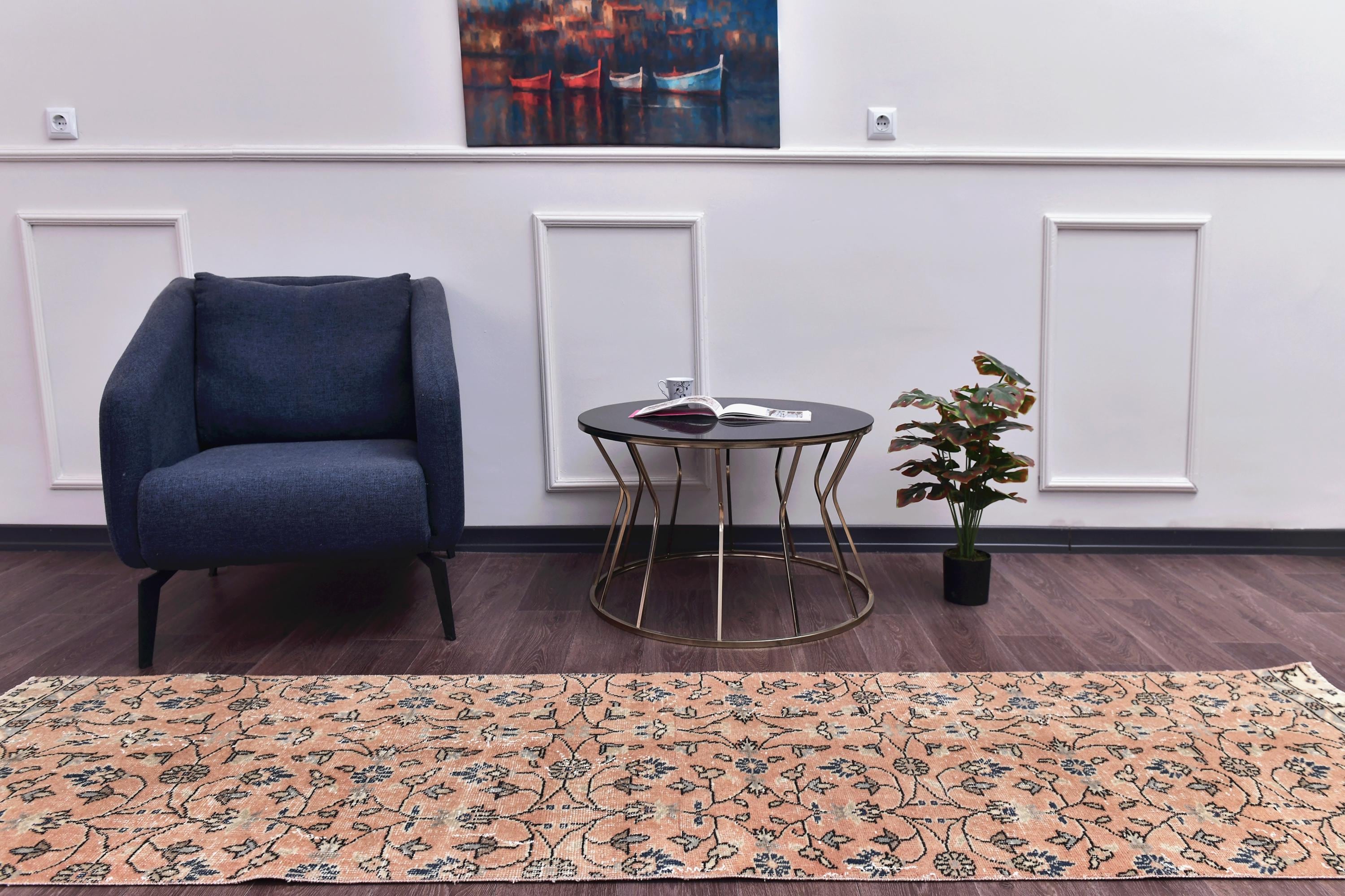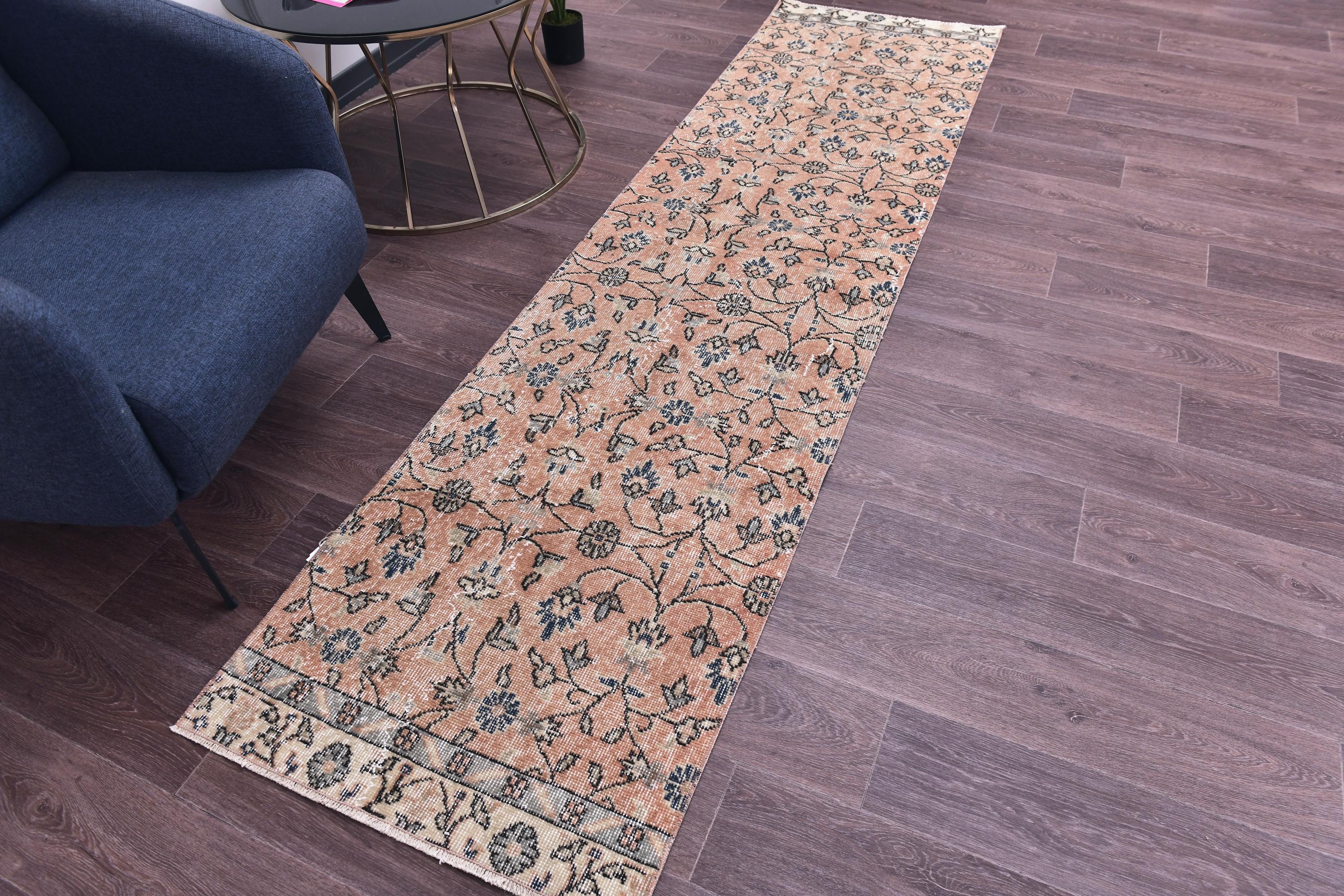 📜📌 Vintage Turkish runner rug in warm peach coral color with elegant floral vine patterns and botanical motifs. Long narrow hallway carpet featuring distressed low-pile wool construction, teal blue and navy accents, traditional border design, and faded bohemian aesthetic on dark hardwood floor.