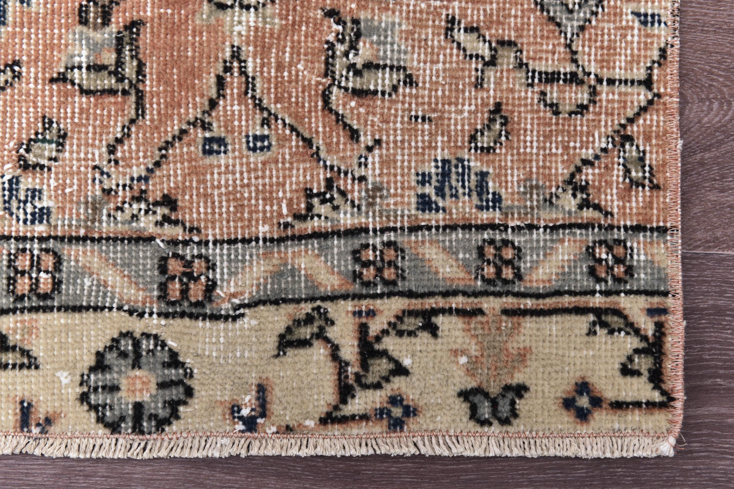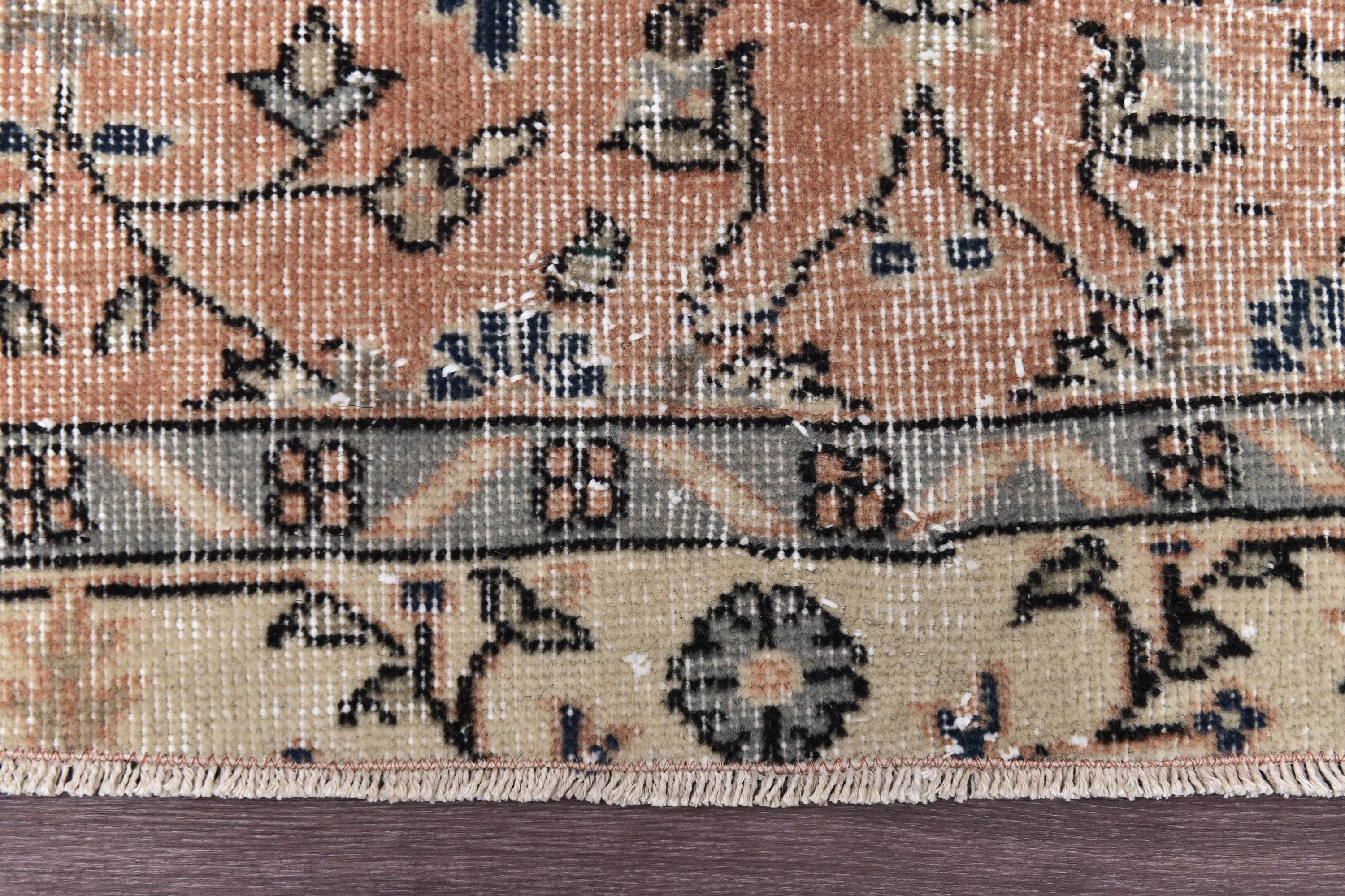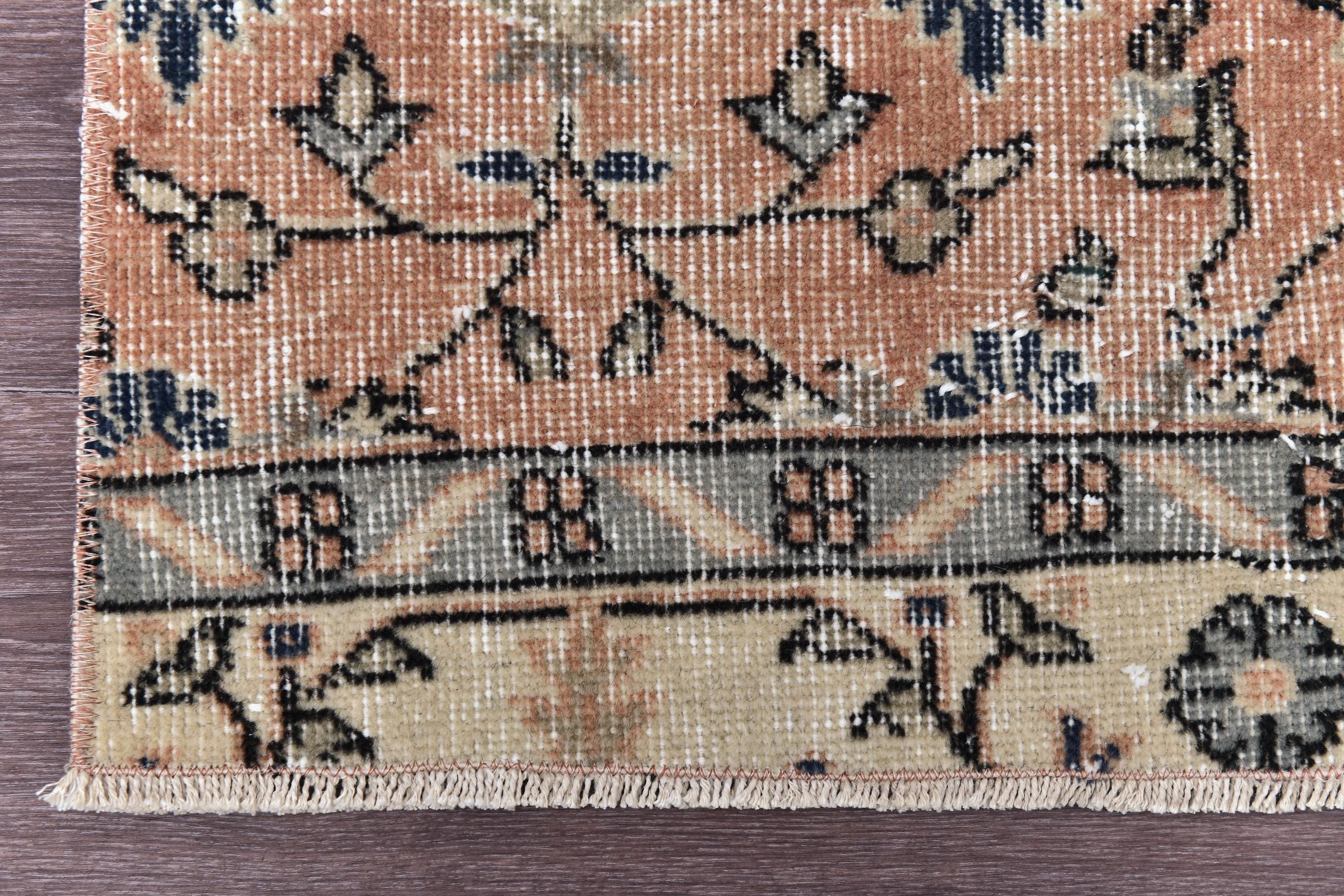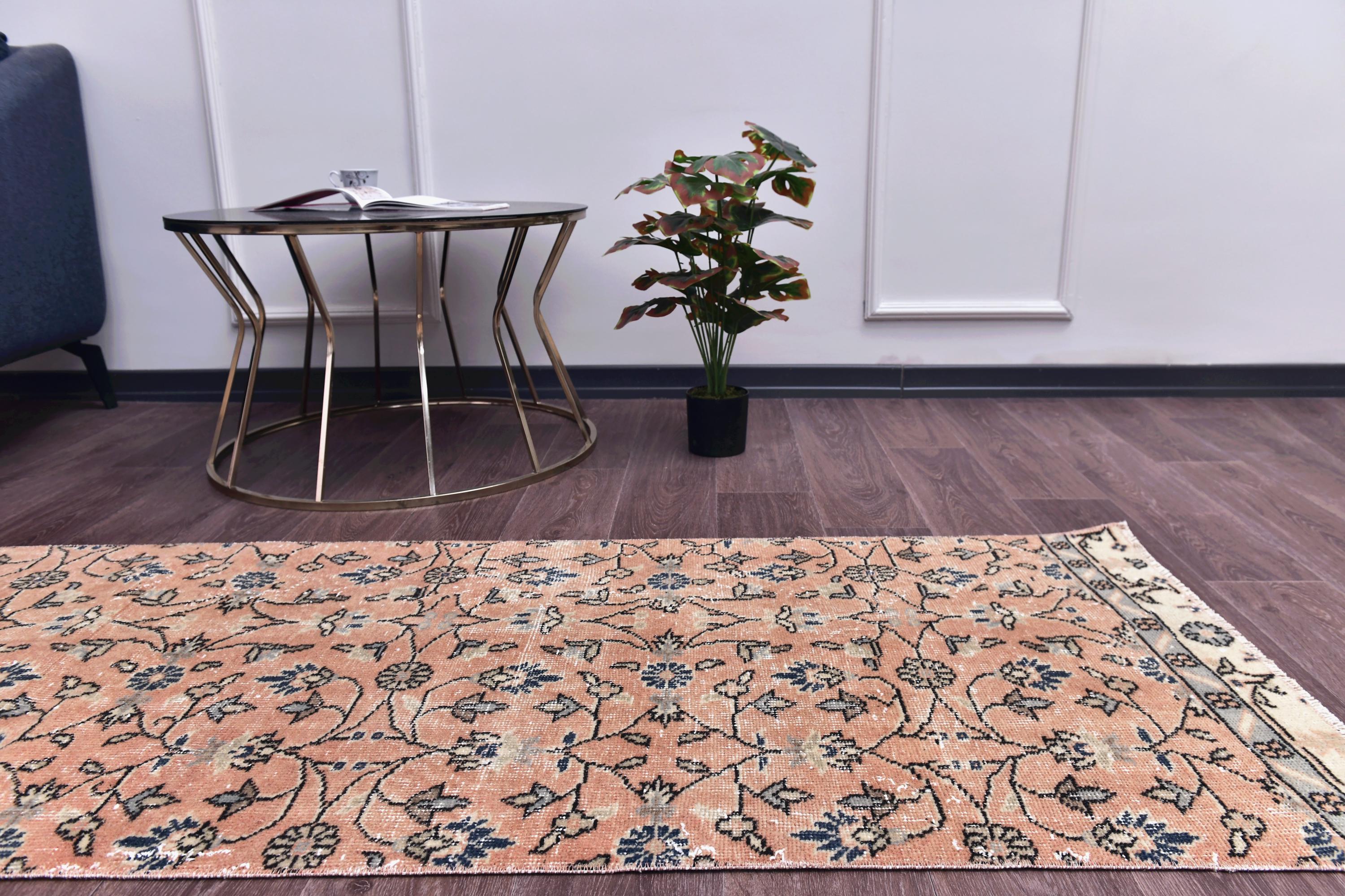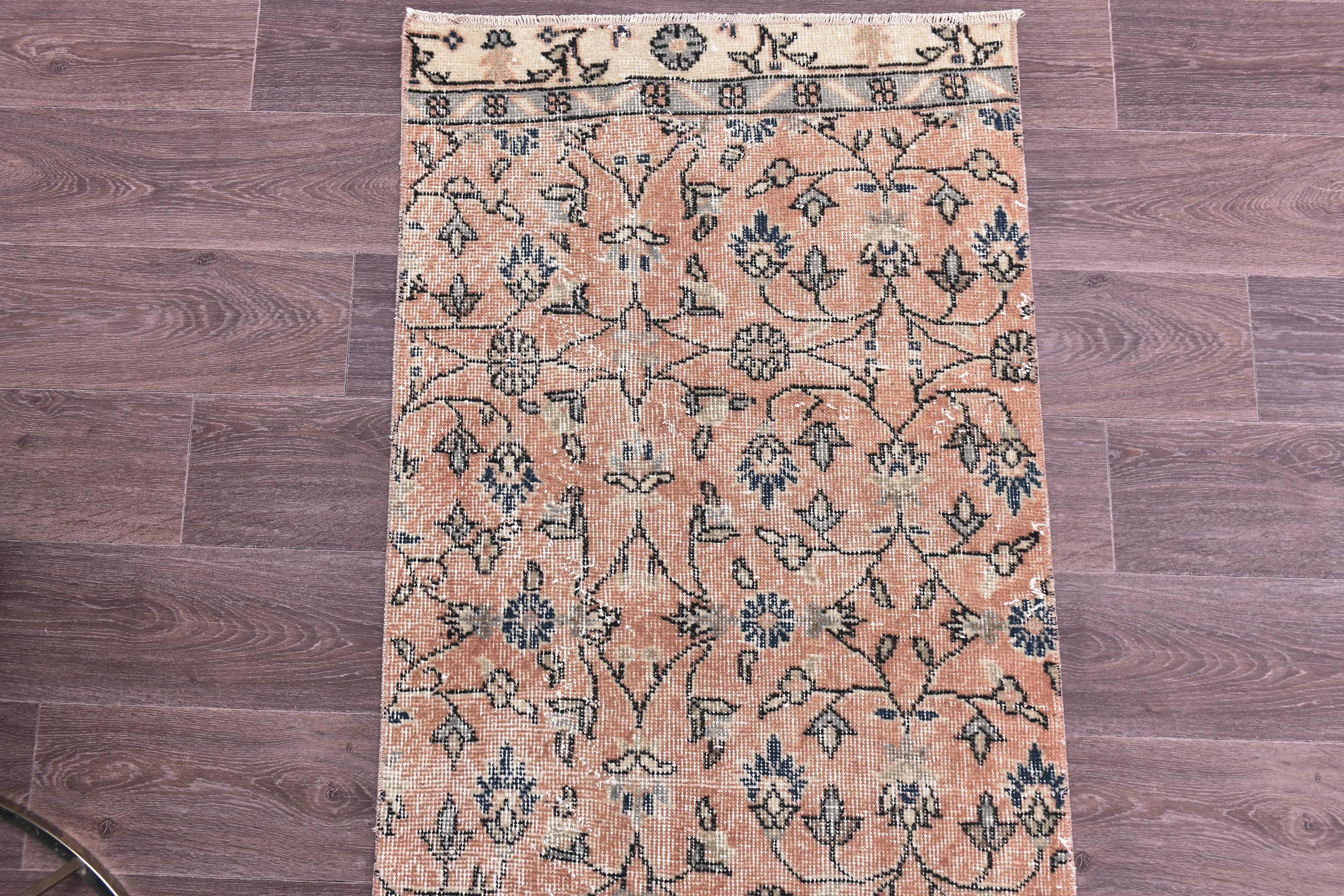 📜📌 Vintage Turkish runner rug in warm peach coral color with elegant floral vine patterns and botanical motifs. Long narrow hallway carpet featuring distressed low-pile wool construction, teal blue and navy accents, traditional border design, and faded bohemian aesthetic on dark hardwood floor.