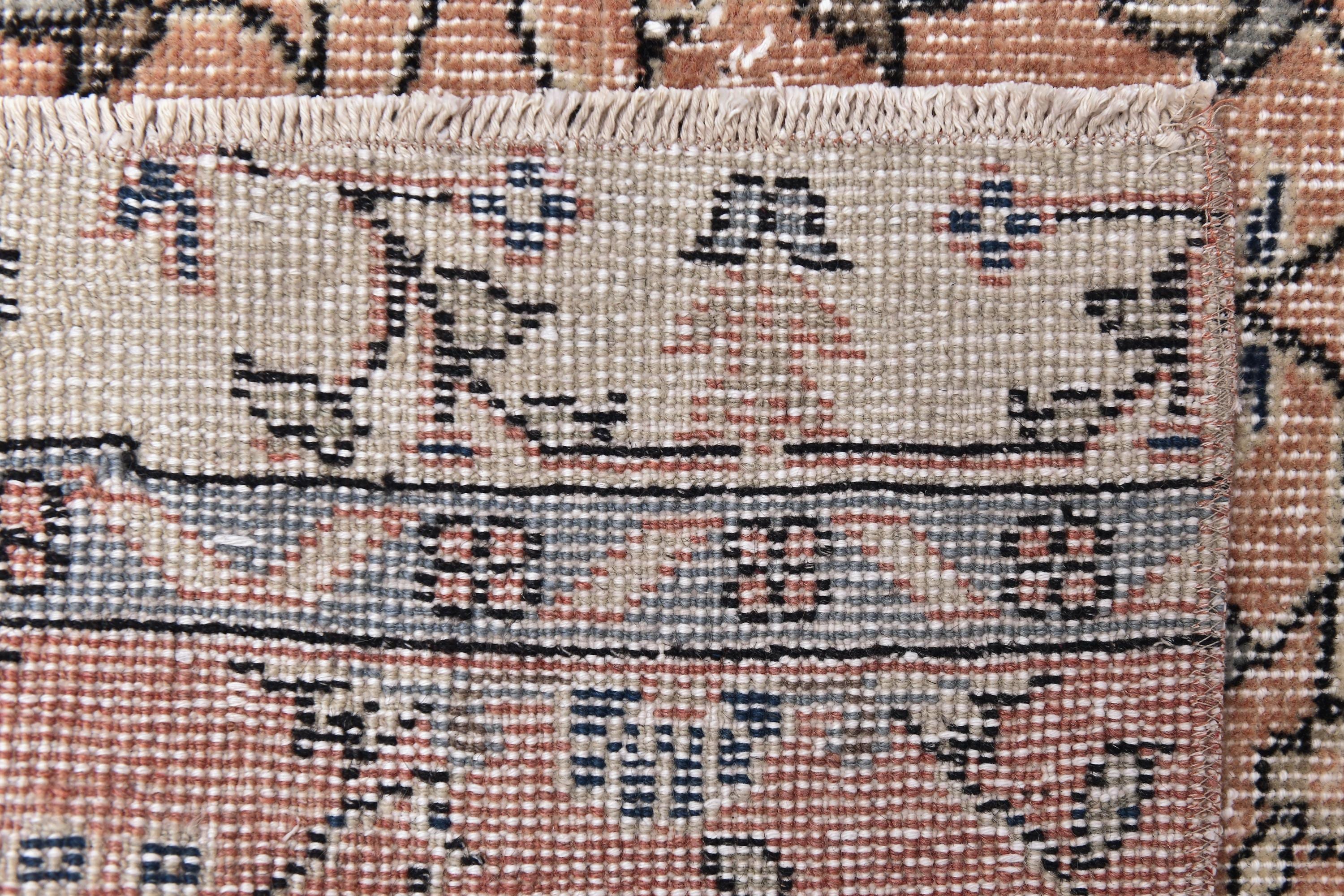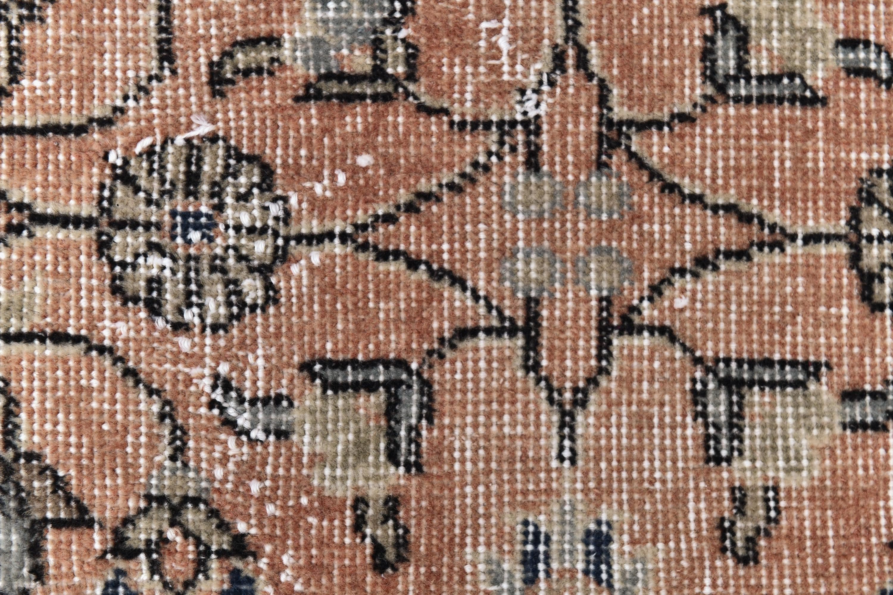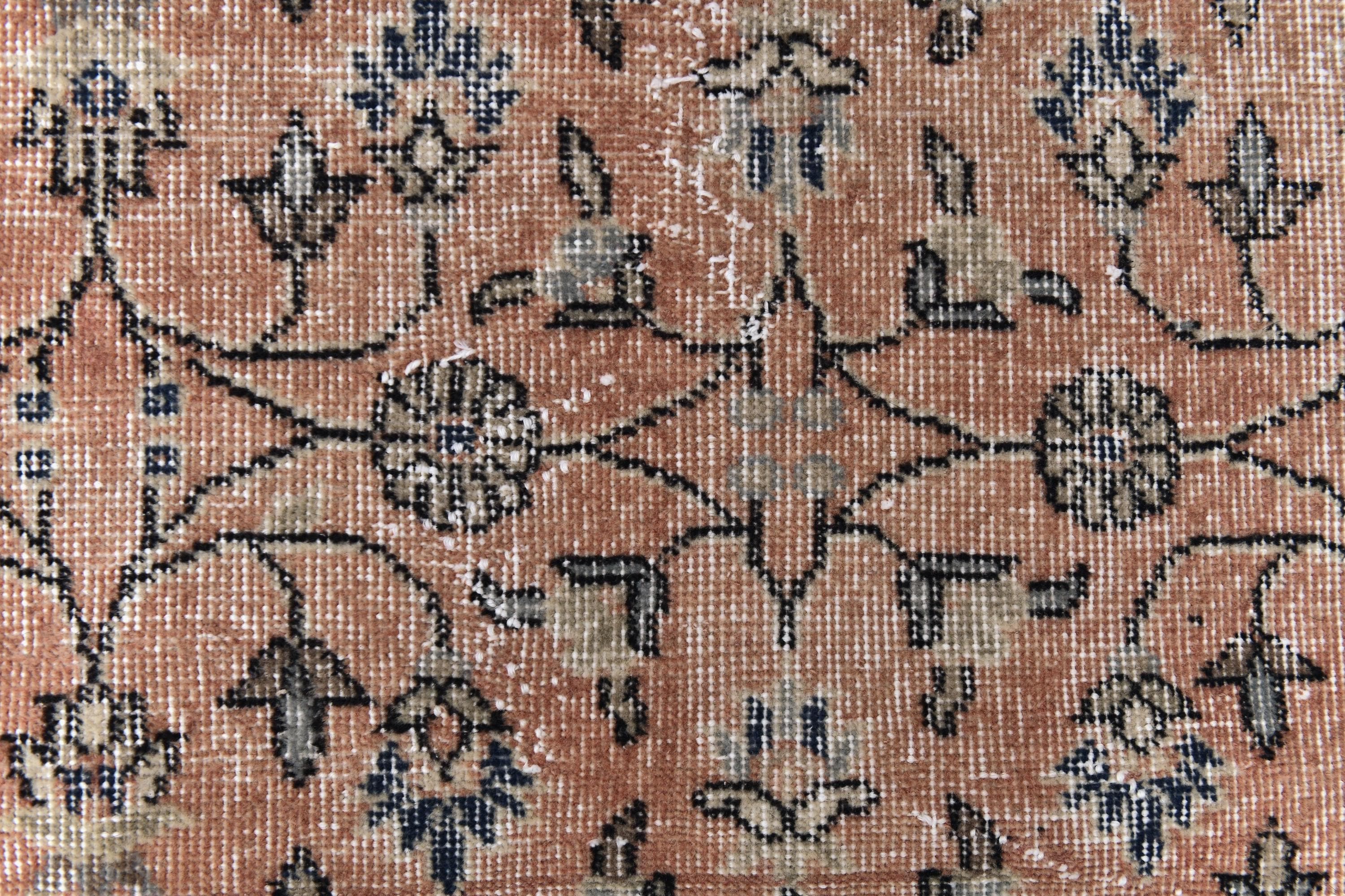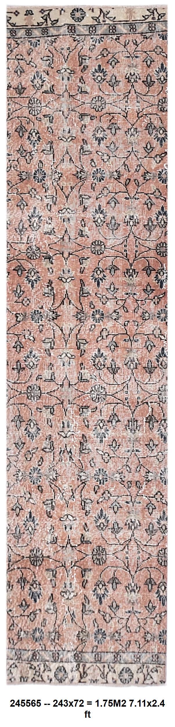 📜📌 Vintage Turkish runner rug in warm peach coral color with elegant floral vine patterns and botanical motifs. Long narrow hallway carpet featuring distressed low-pile wool construction, teal blue and navy accents, traditional border design, and faded bohemian aesthetic on dark hardwood floor.