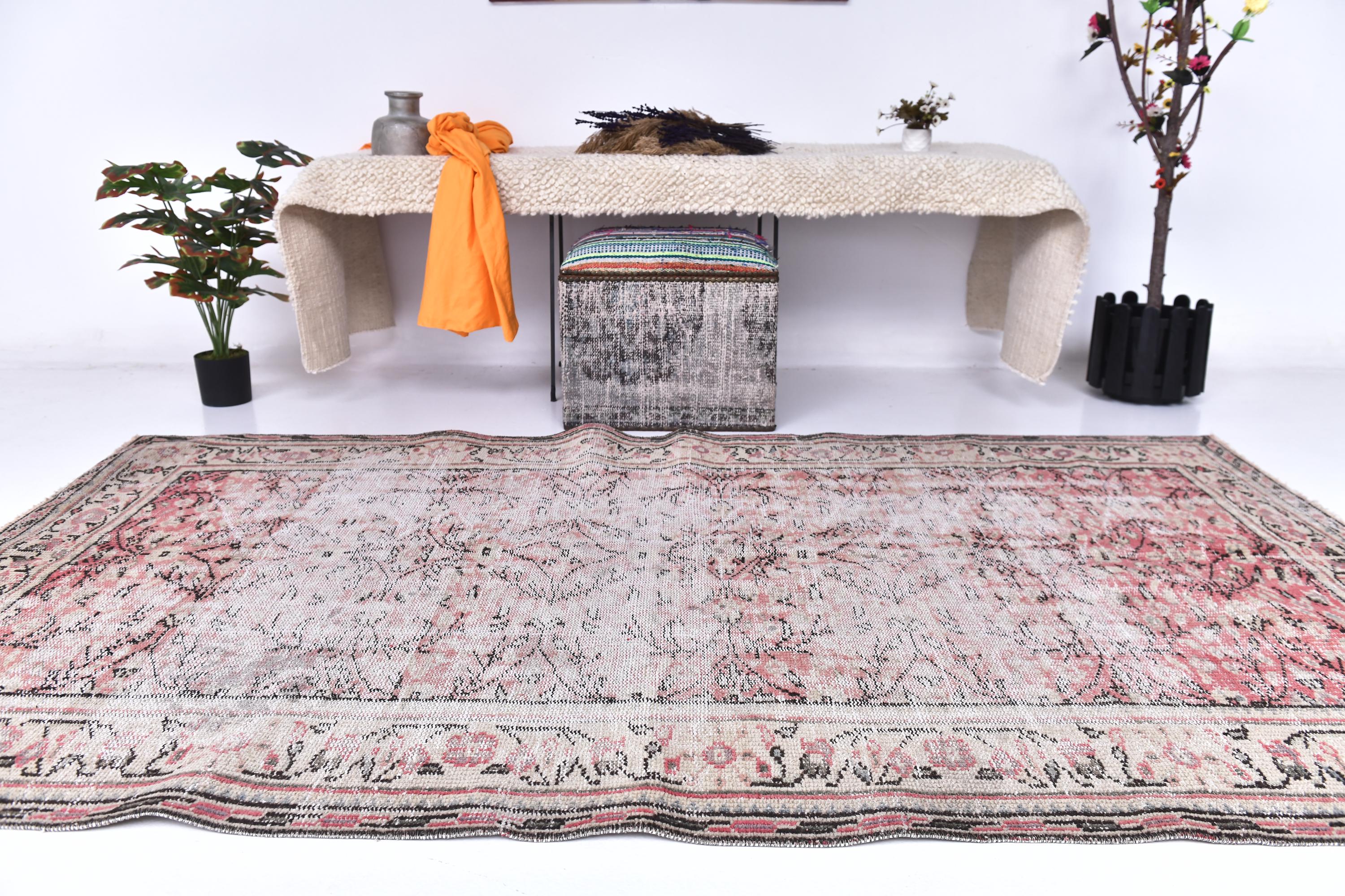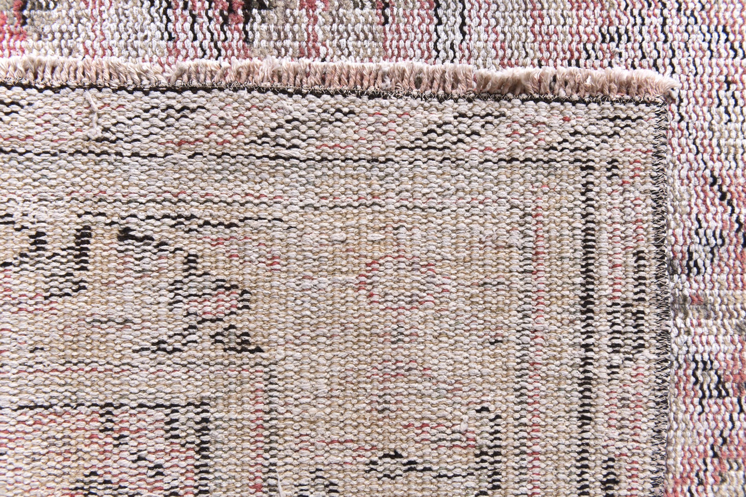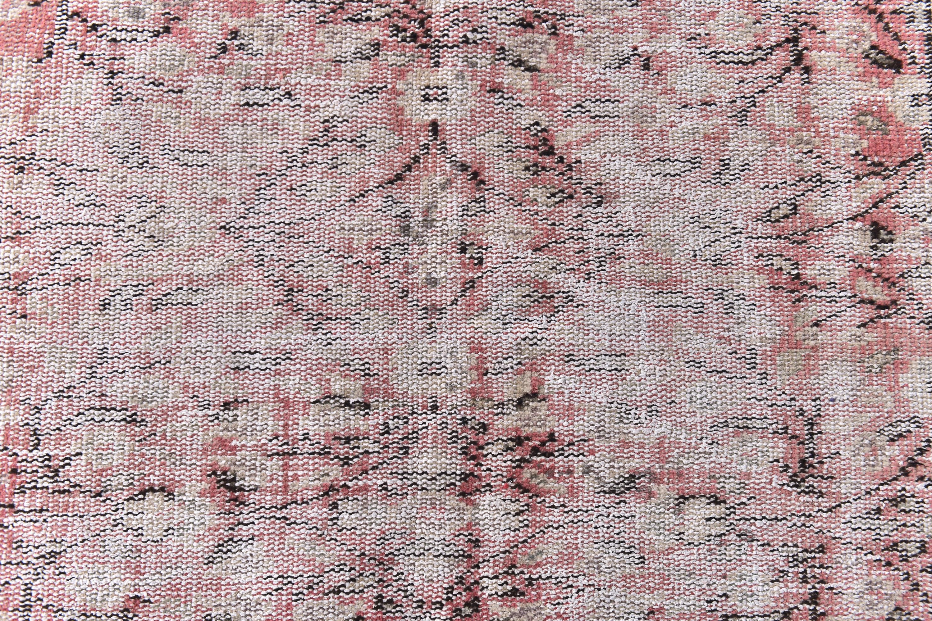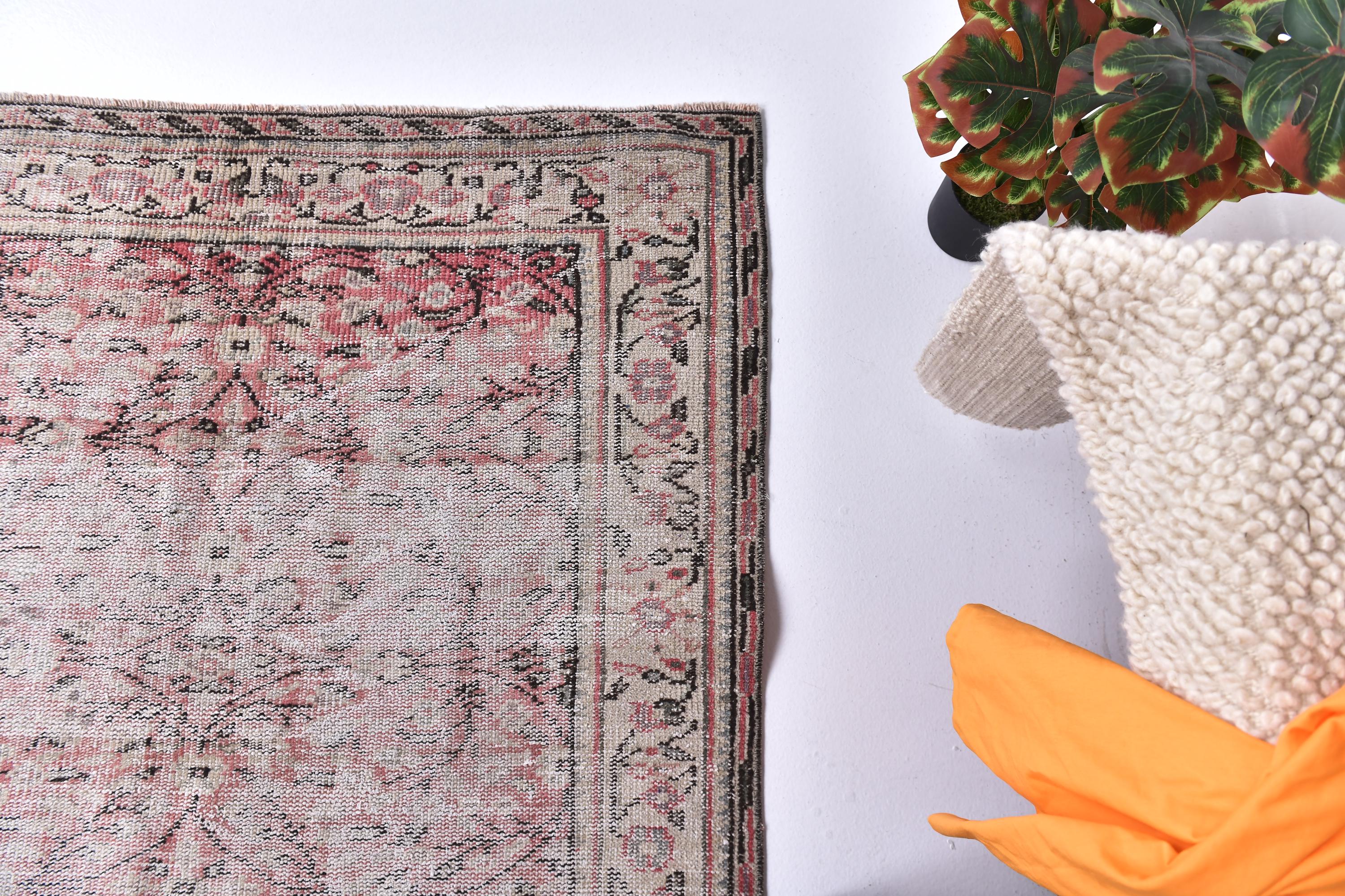 📜📌 Antique Turkish Oushak area rug with worn vintage aesthetic showing soft gray field and dusty pink floral border patterns. Hand-woven wool carpet with distressed finish, visible weave texture, and symmetrical design in muted tones including rose, taupe, cream, and charcoal with elegant corner motifs.