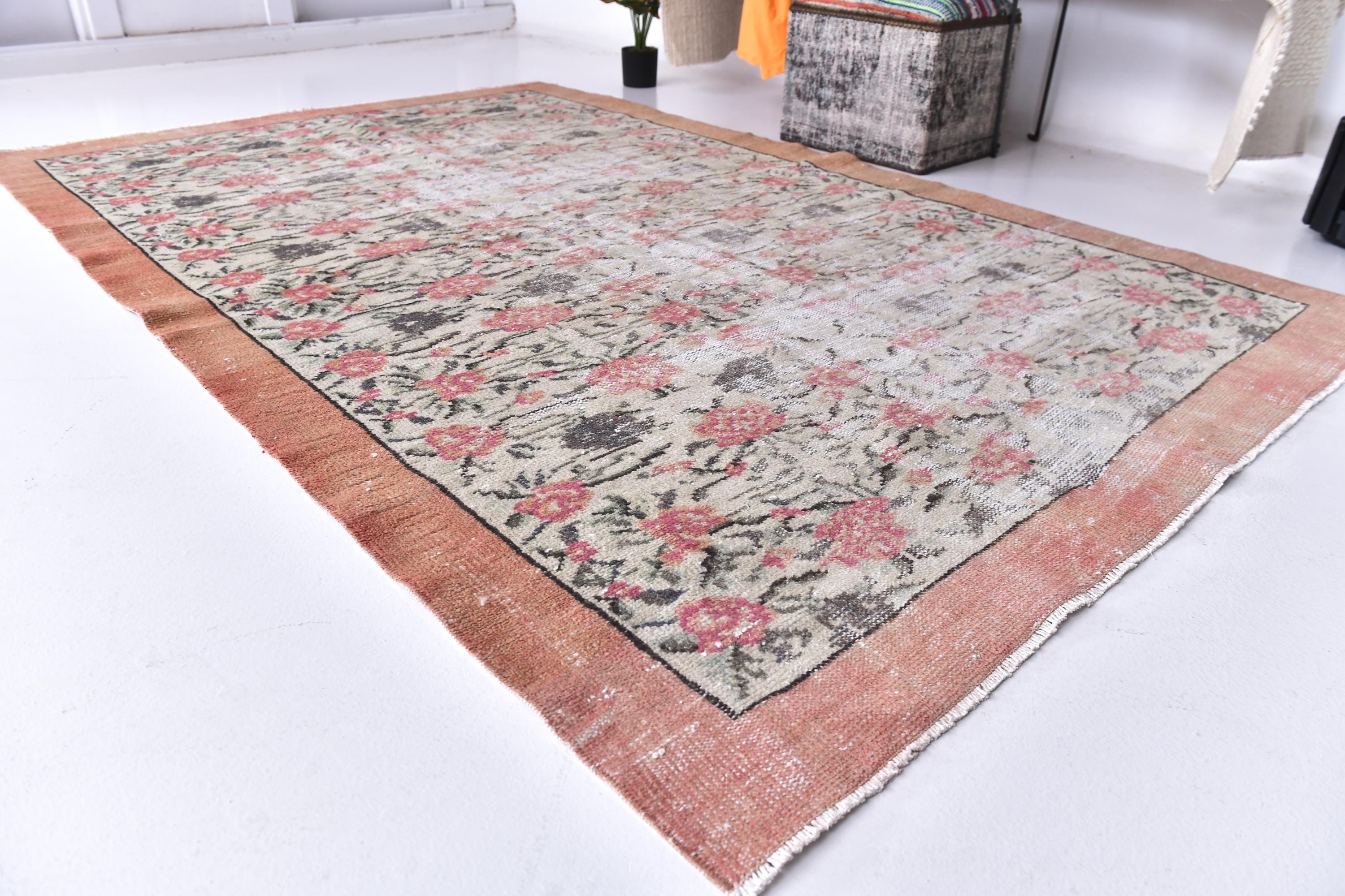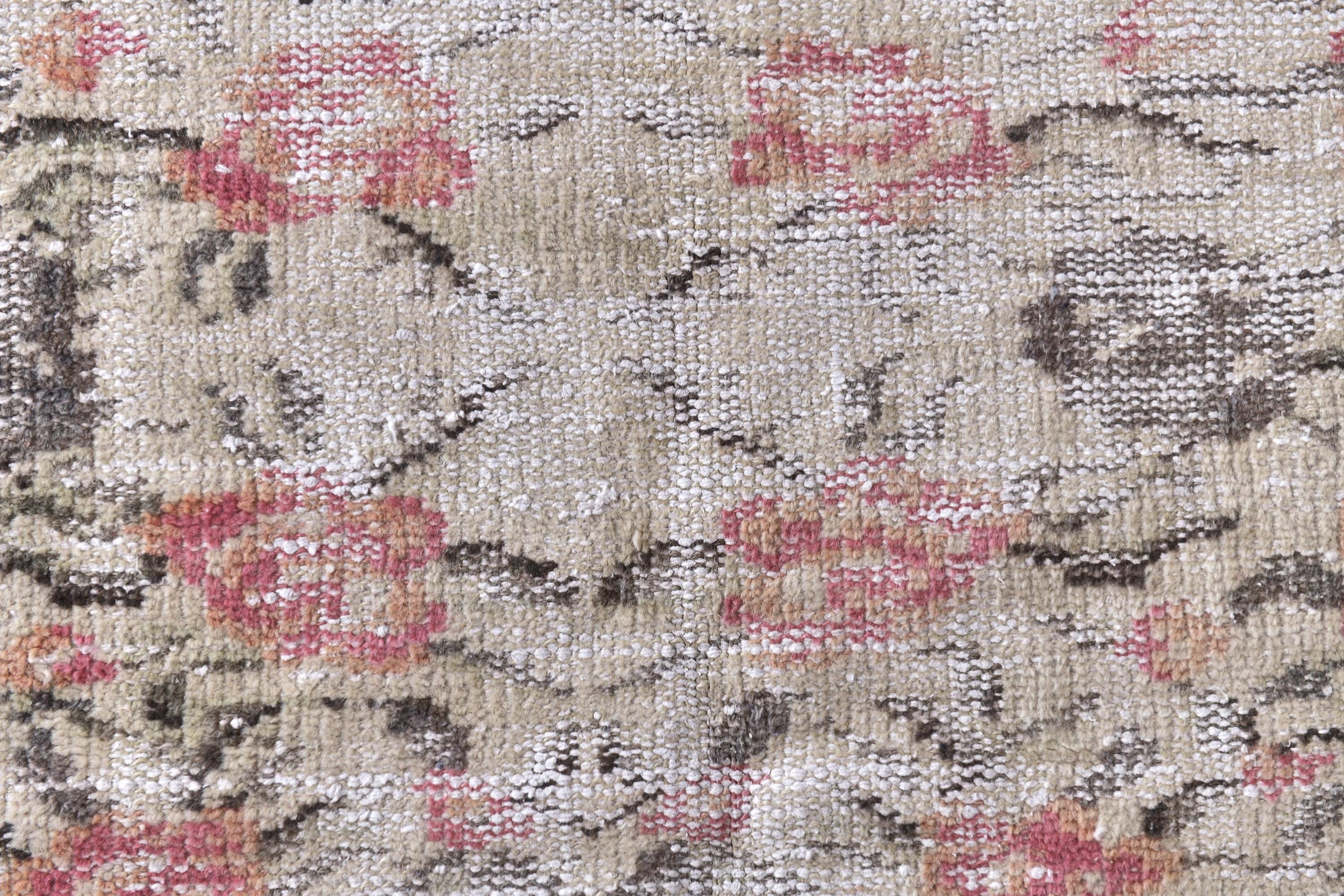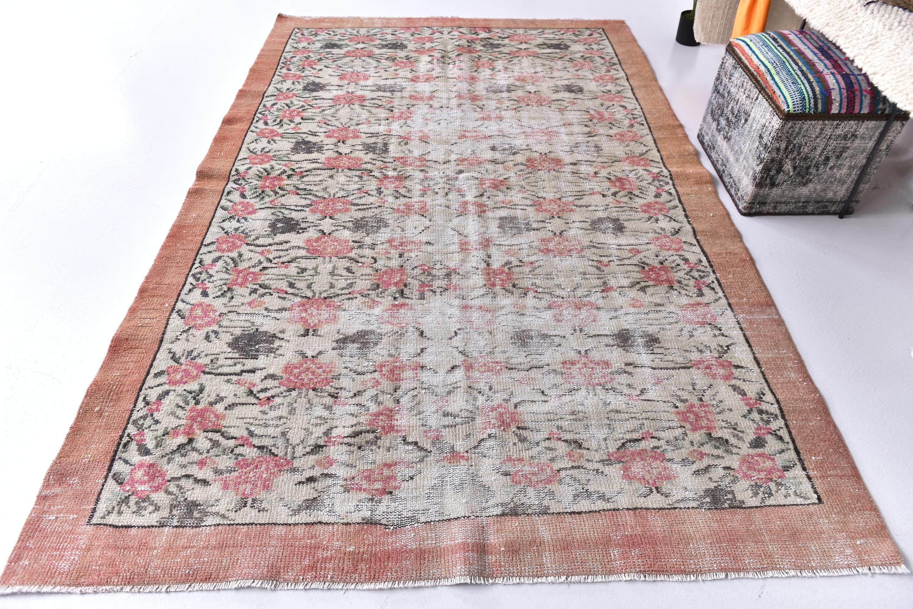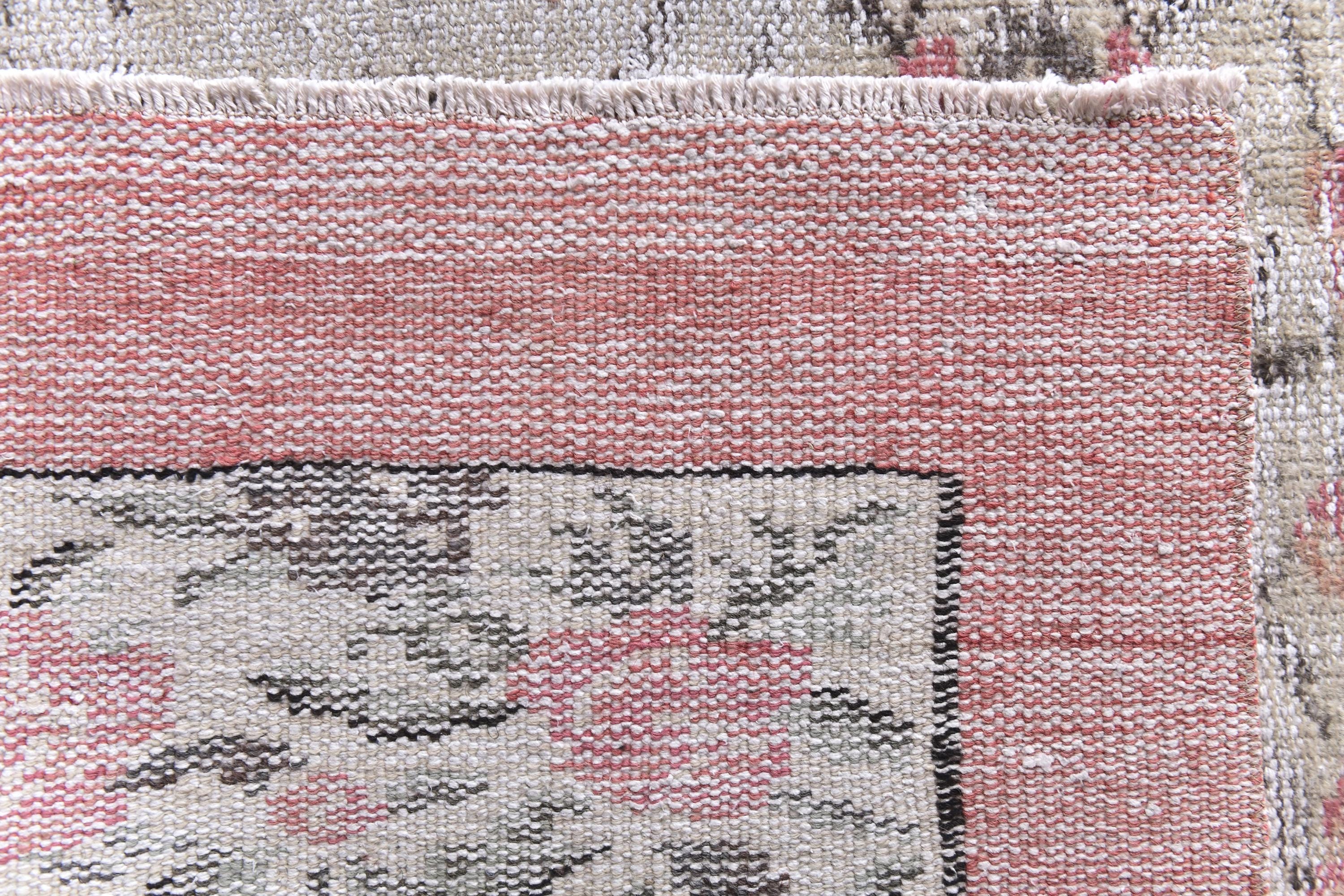 📜📌 Antique Turkish Oushak area rug with worn vintage character showing neutral gray field scattered with pink and coral floral motifs and wide salmon pink border frame. Hand-woven oversized wool carpet with distressed finish in muted tones including rose, taupe, charcoal, and sage with traditional botanical design.
