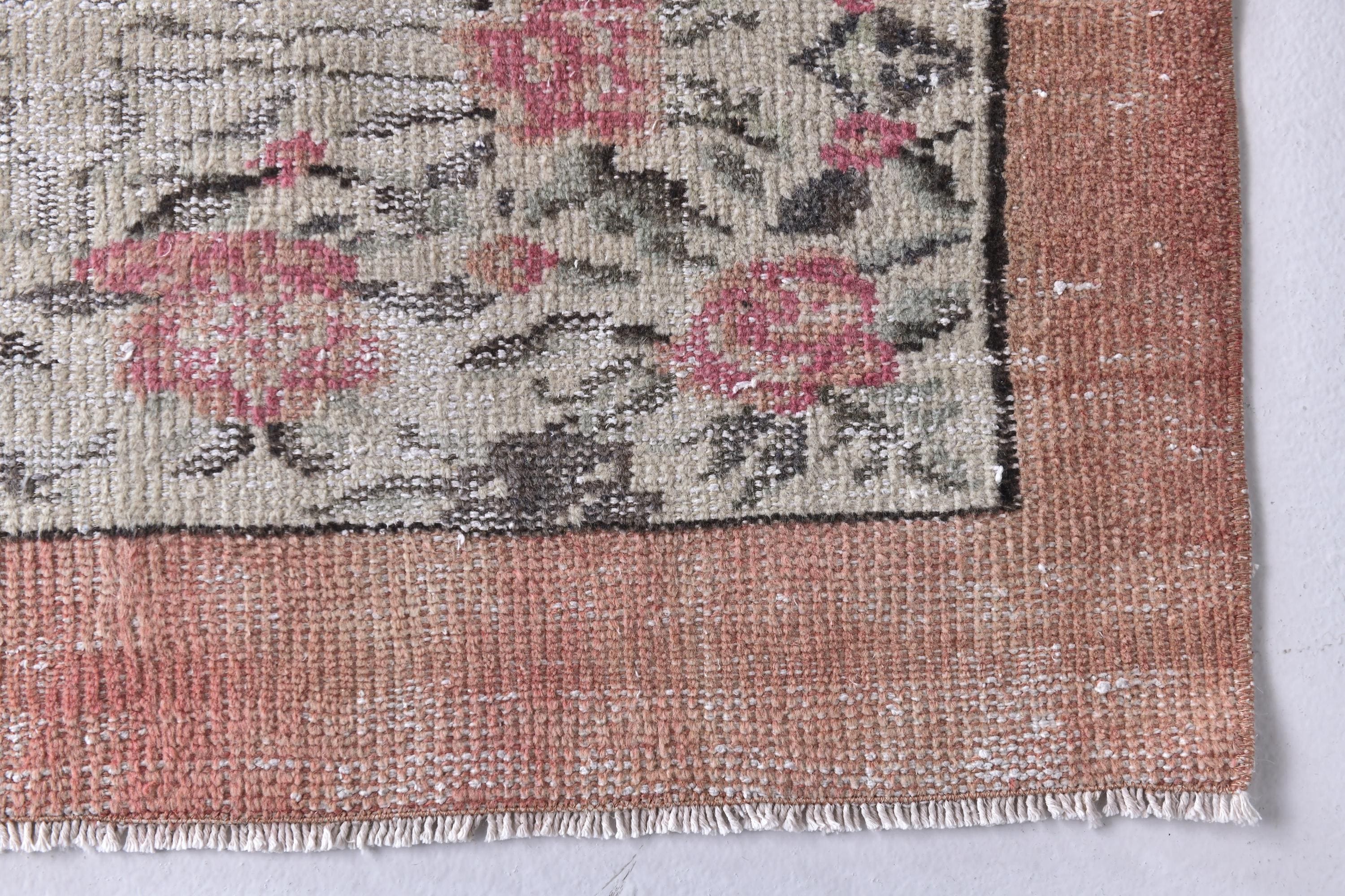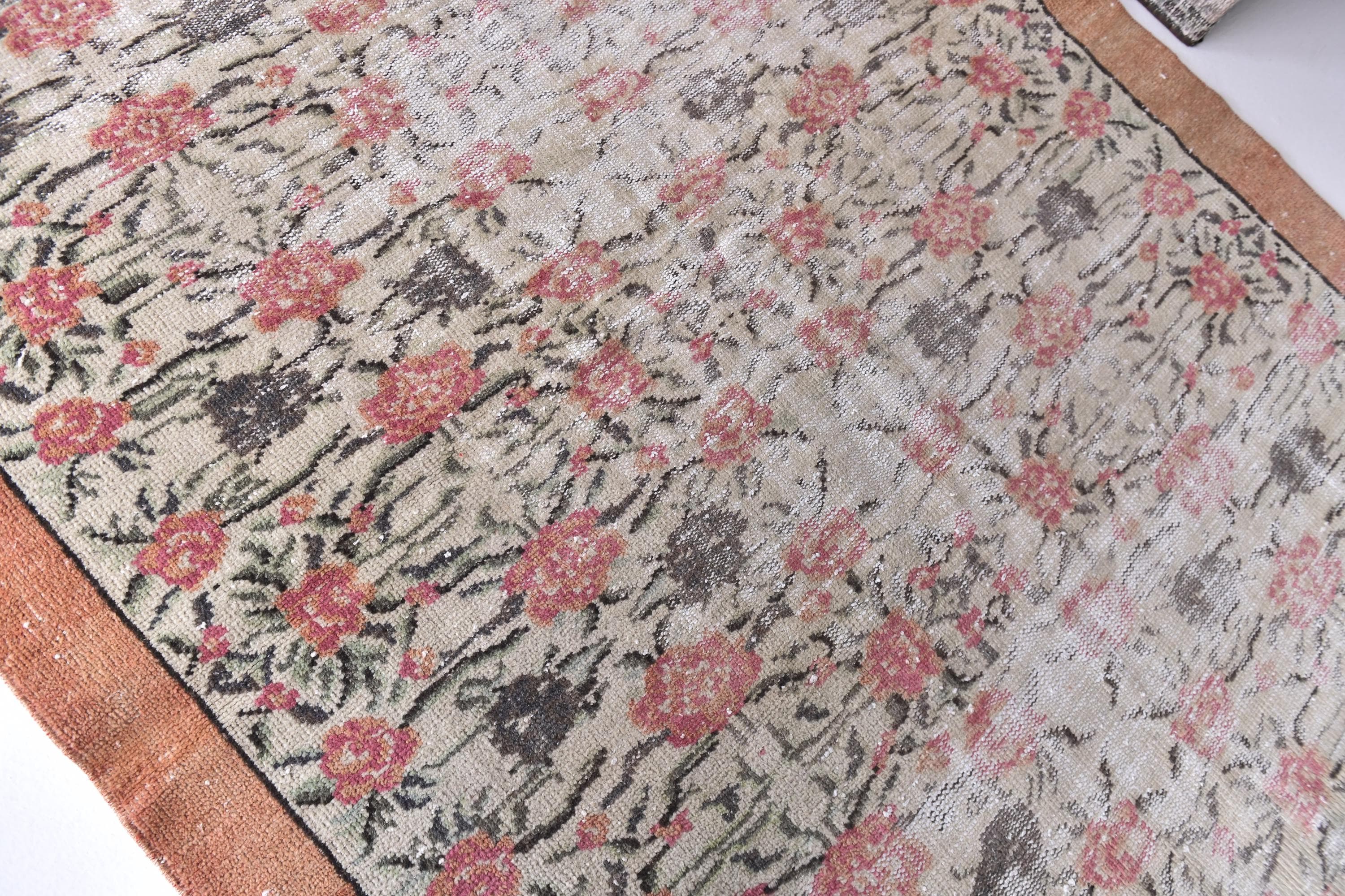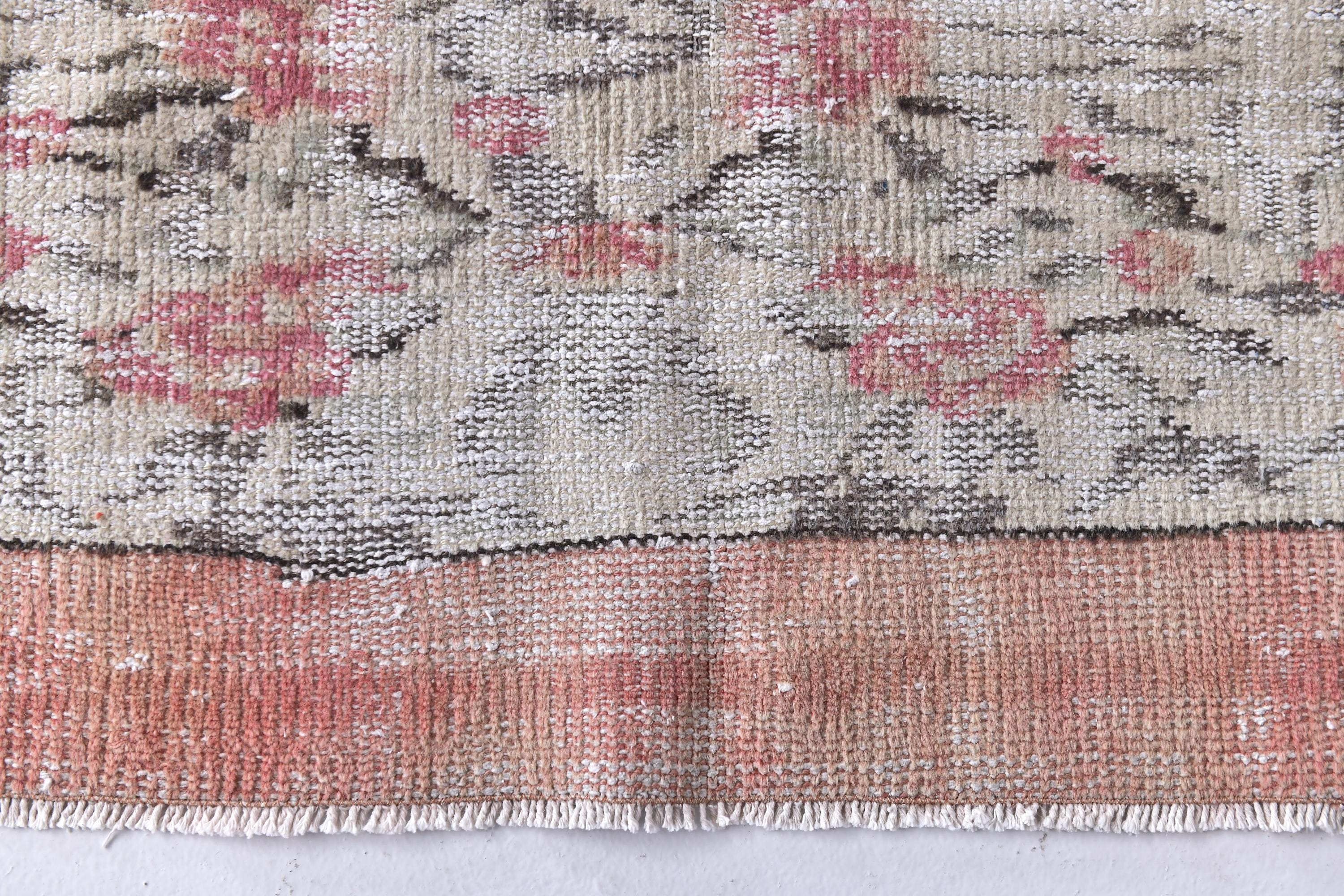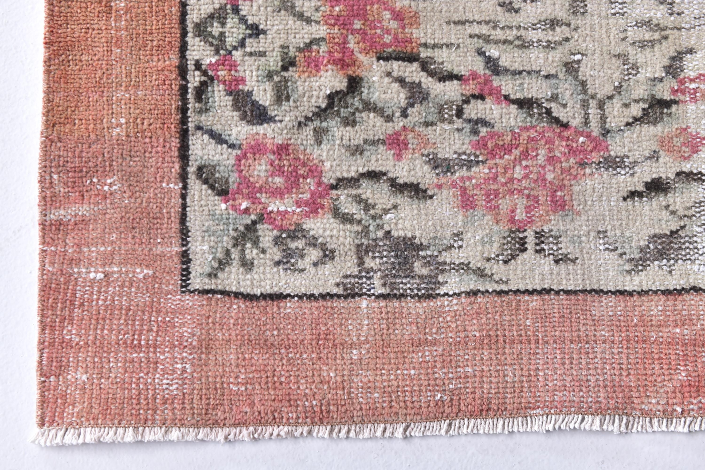 📜📌 Antique Turkish Oushak area rug with worn vintage character showing neutral gray field scattered with pink and coral floral motifs and wide salmon pink border frame. Hand-woven oversized wool carpet with distressed finish in muted tones including rose, taupe, charcoal, and sage with traditional botanical design.