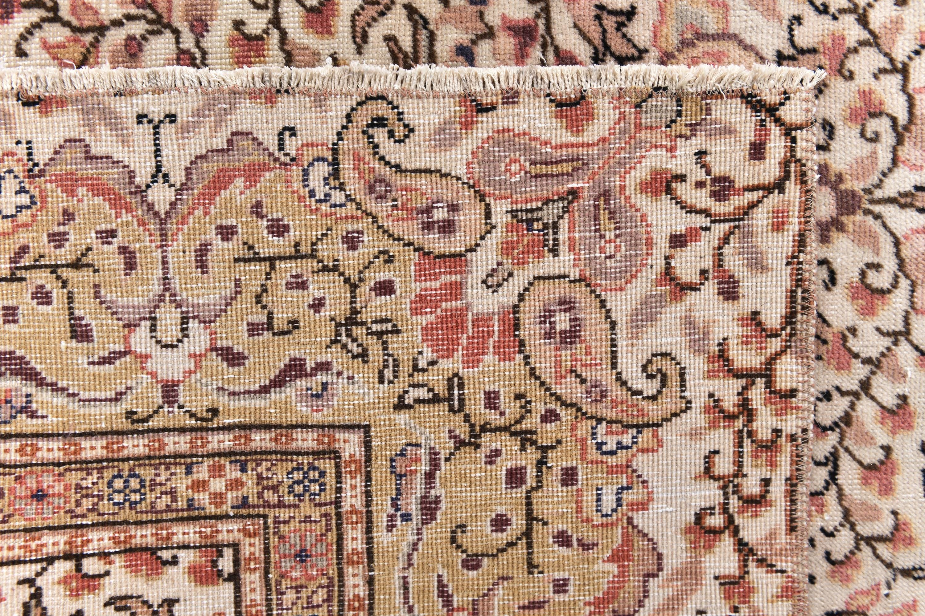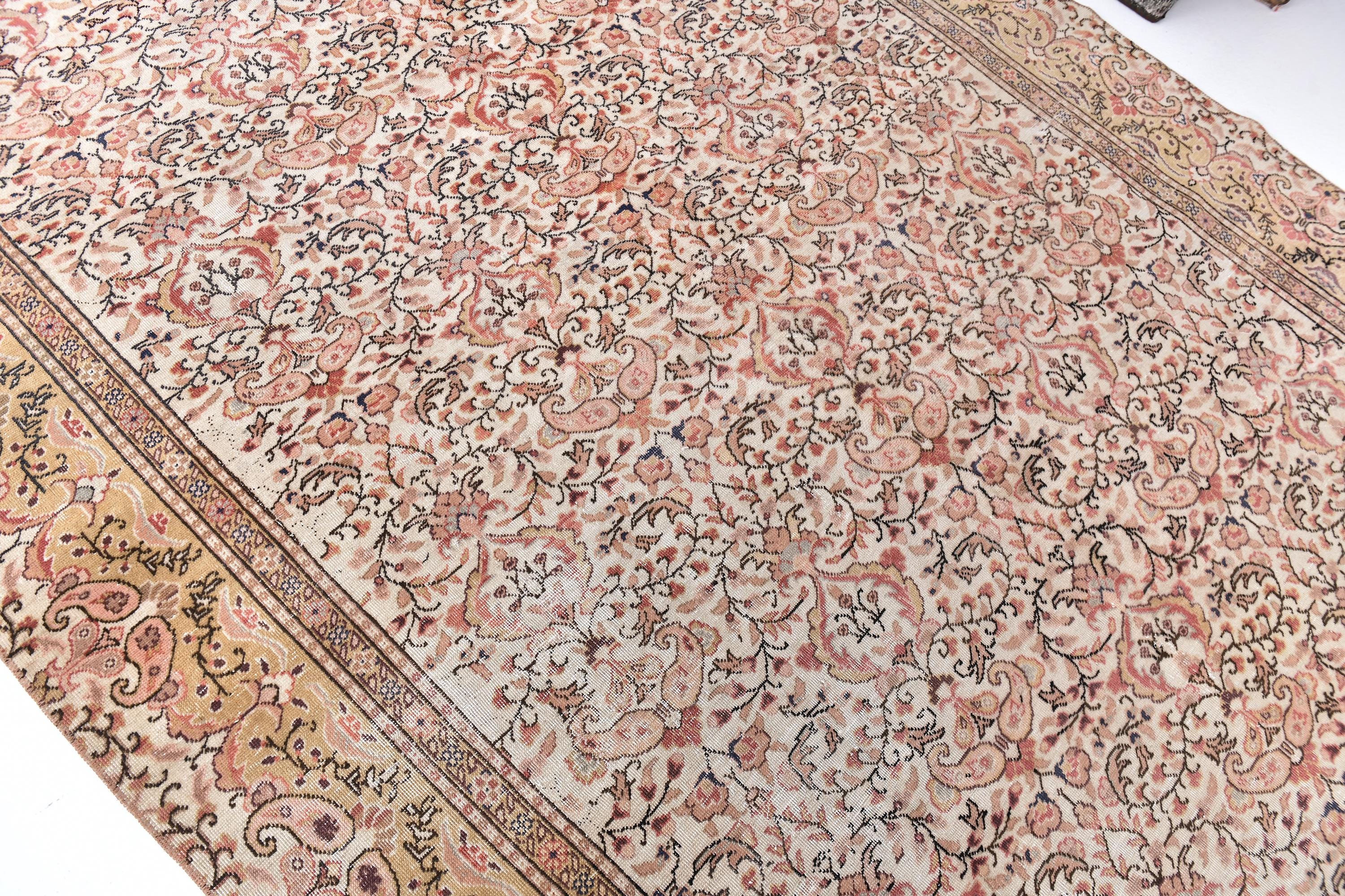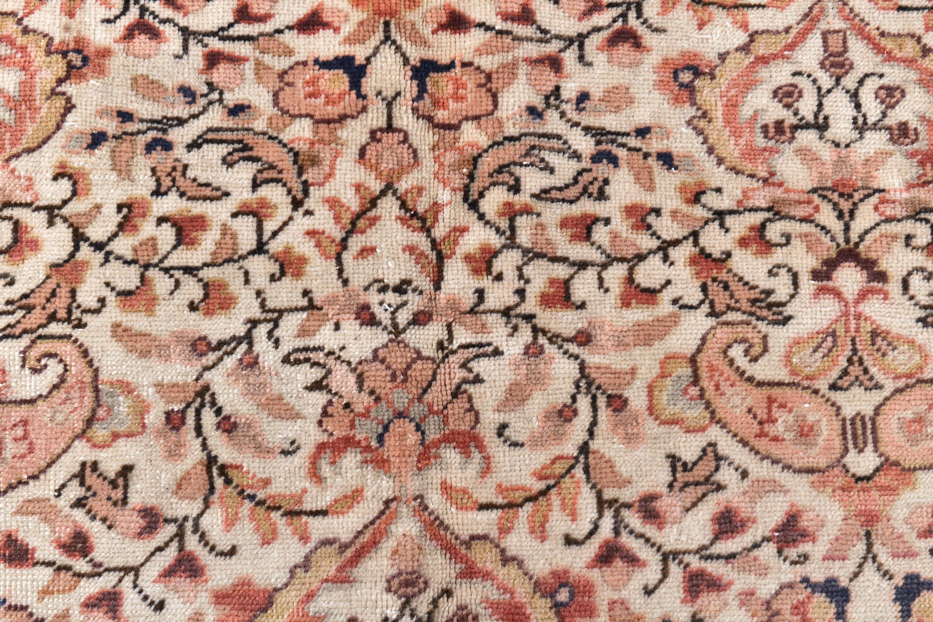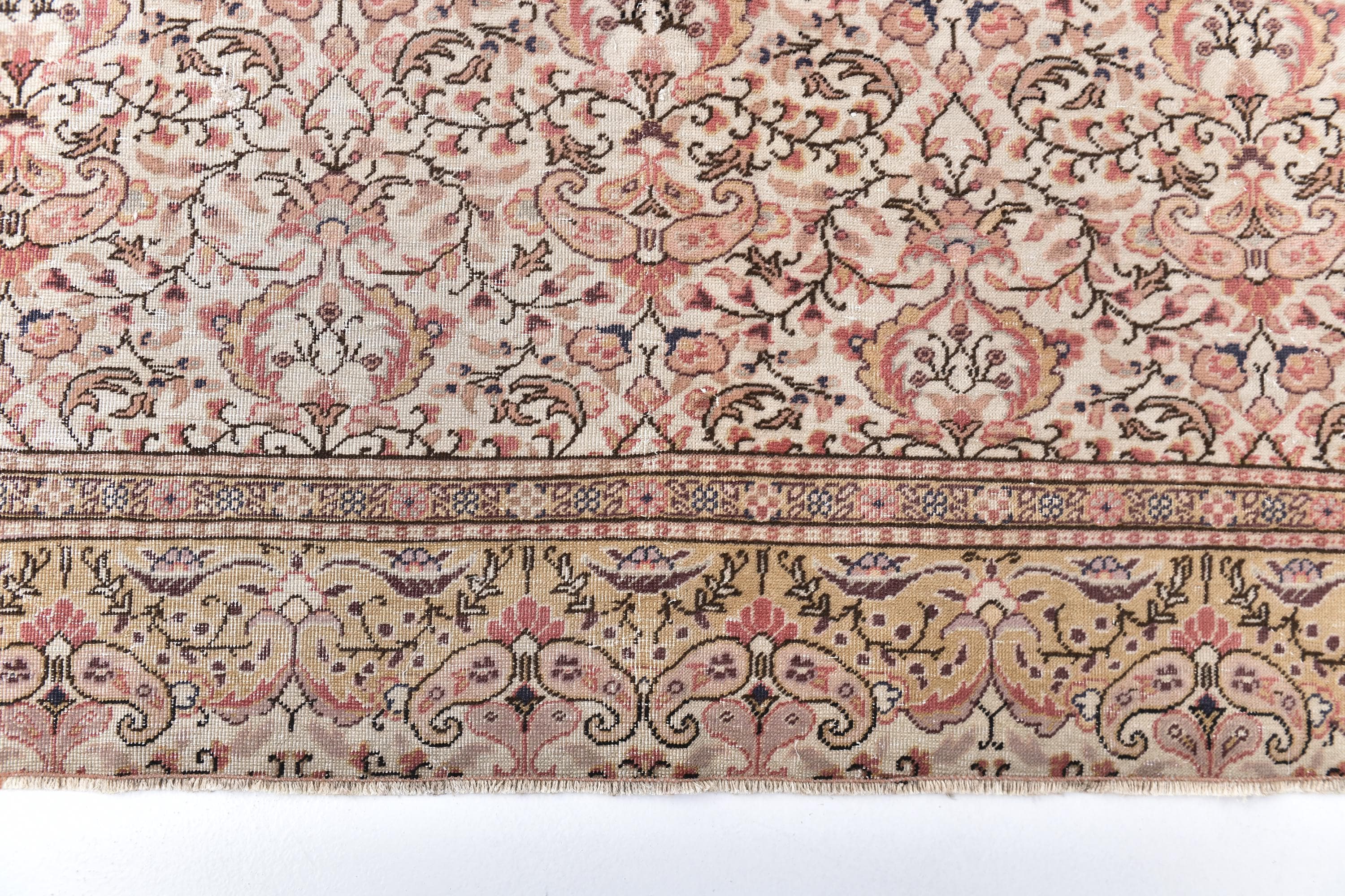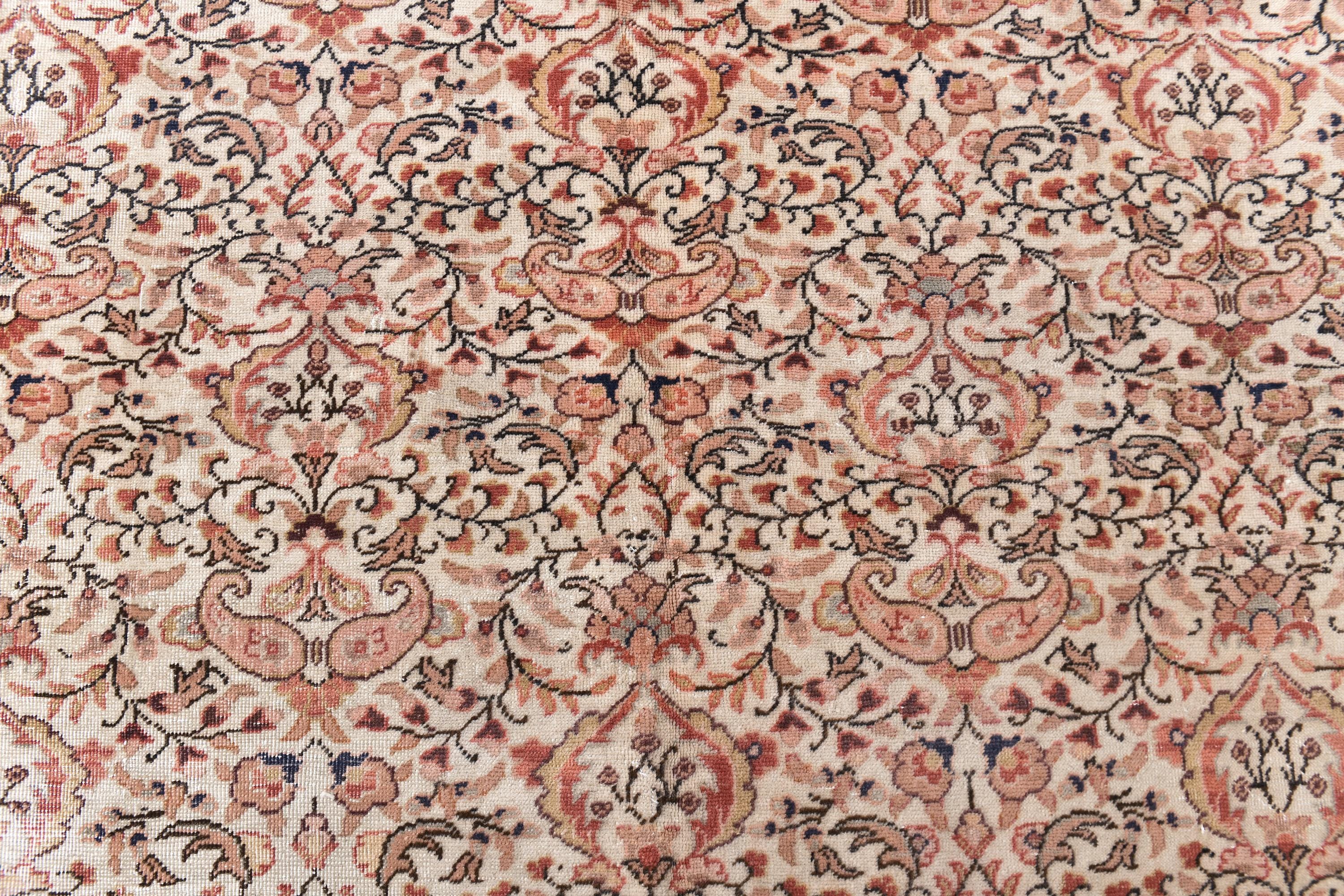 📜📌📌 Antique Tehran Oriental area rug with elaborate all-over floral pattern showing coral, salmon pink, gold, and cream palette. Hand-woven oversized wool carpet with dense scrolling vine design, multiple decorative borders, and highly detailed craftsmanship in traditional Tehran style with symmetrical botanical motifs and ornate corner details.