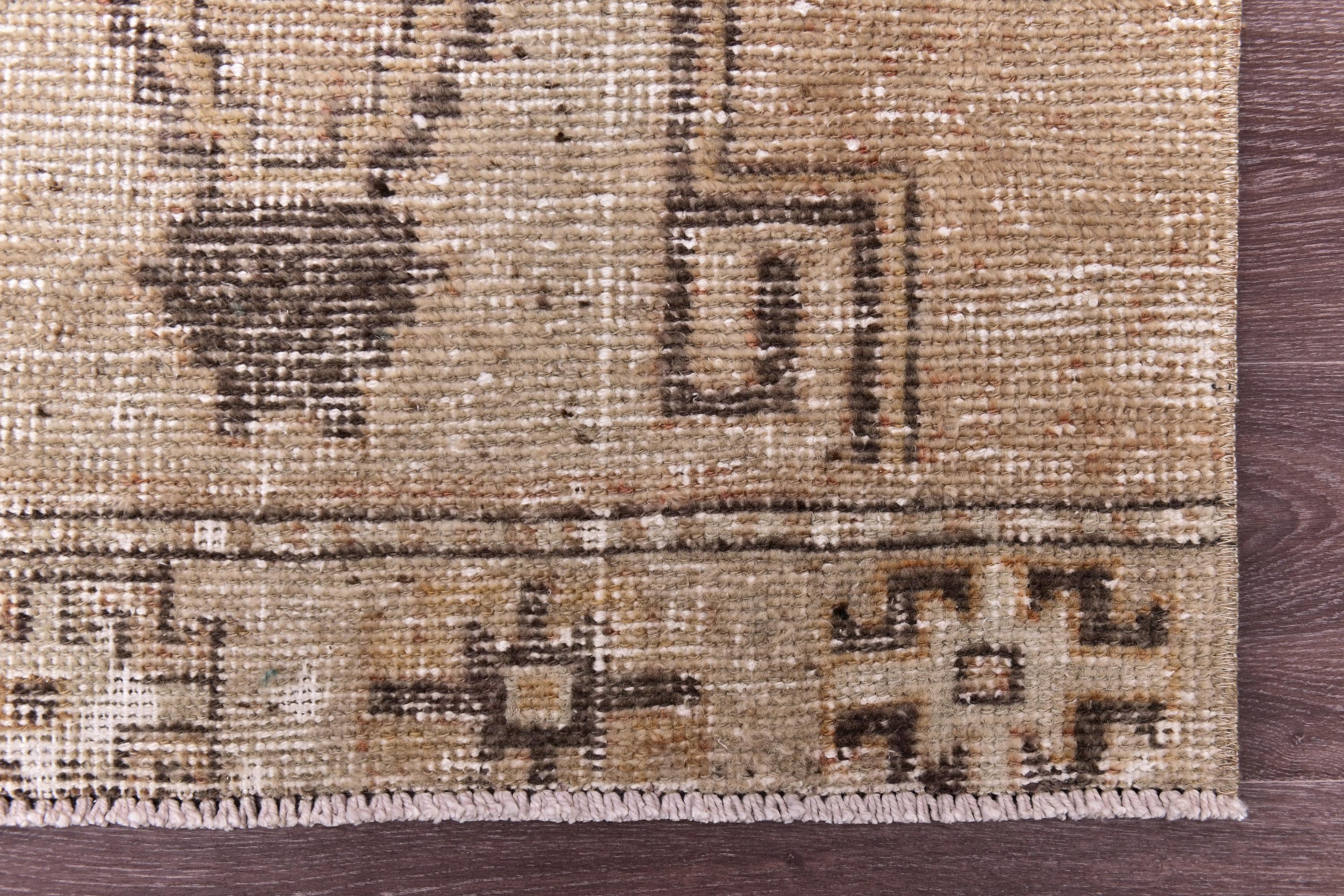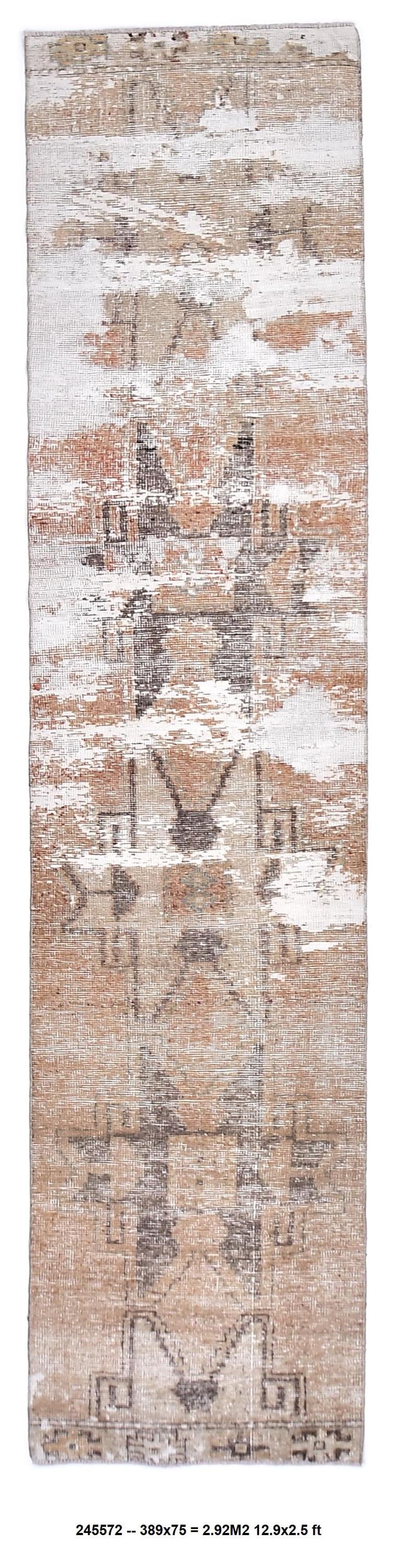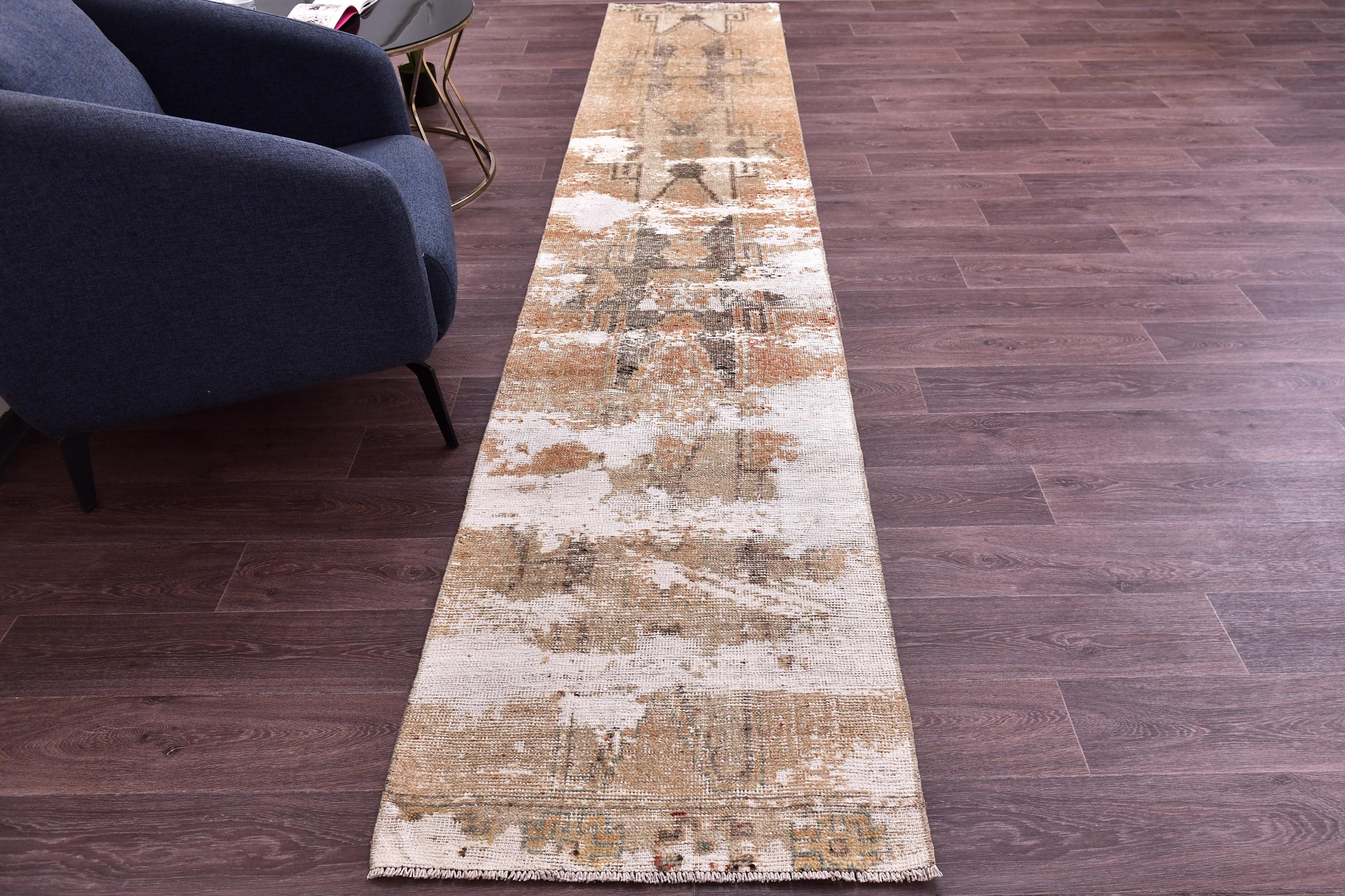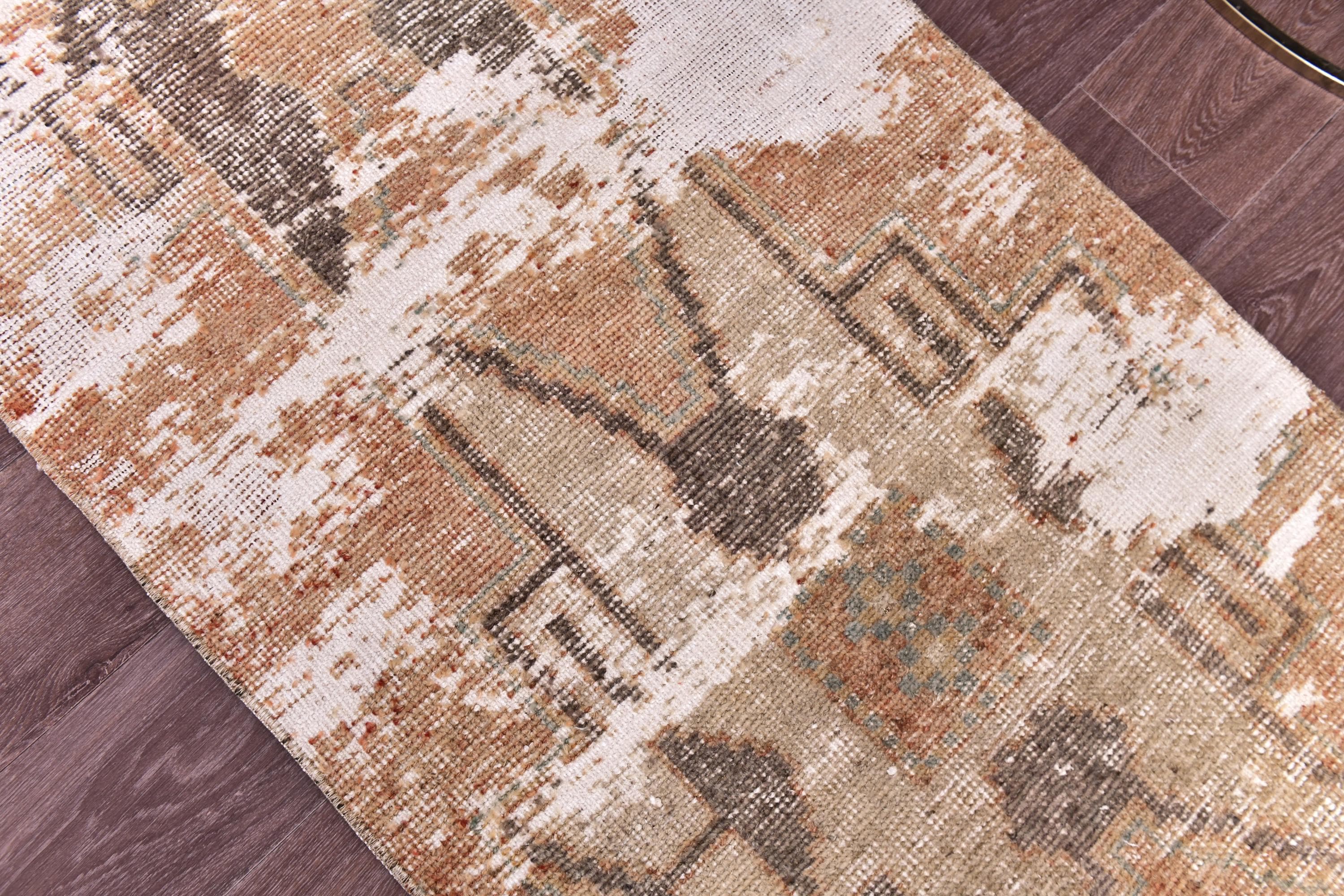 📜📌 Heavily distressed vintage Turkish runner rug featuring worn beige, white, and taupe abstract patterns with authentic aged patina. The narrow wool runner displays extremely faded design with visible weave texture, earthy neutral tones, and shabby chic character perfect for hallways, kitchens, and entryways seeking rustic charm.