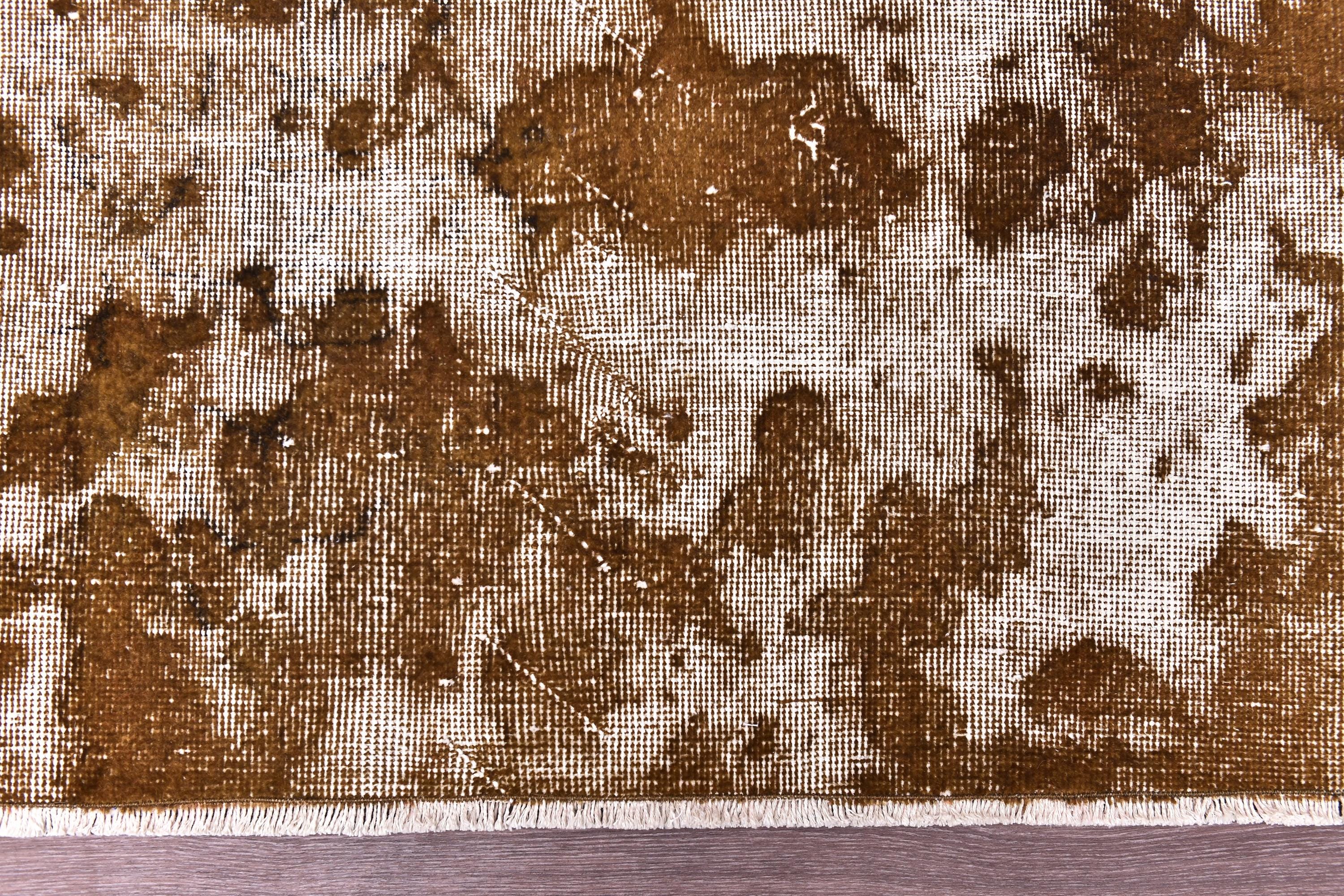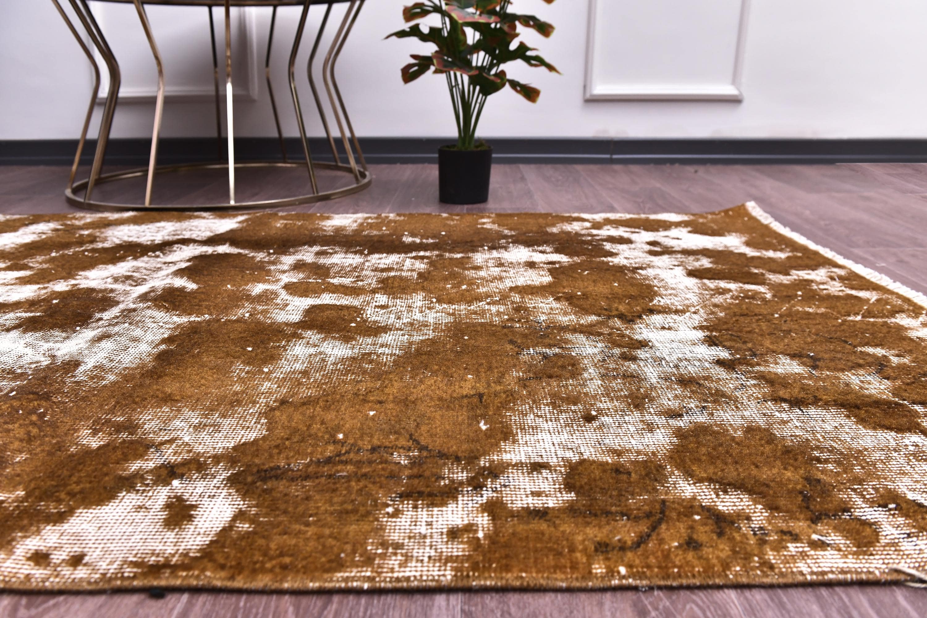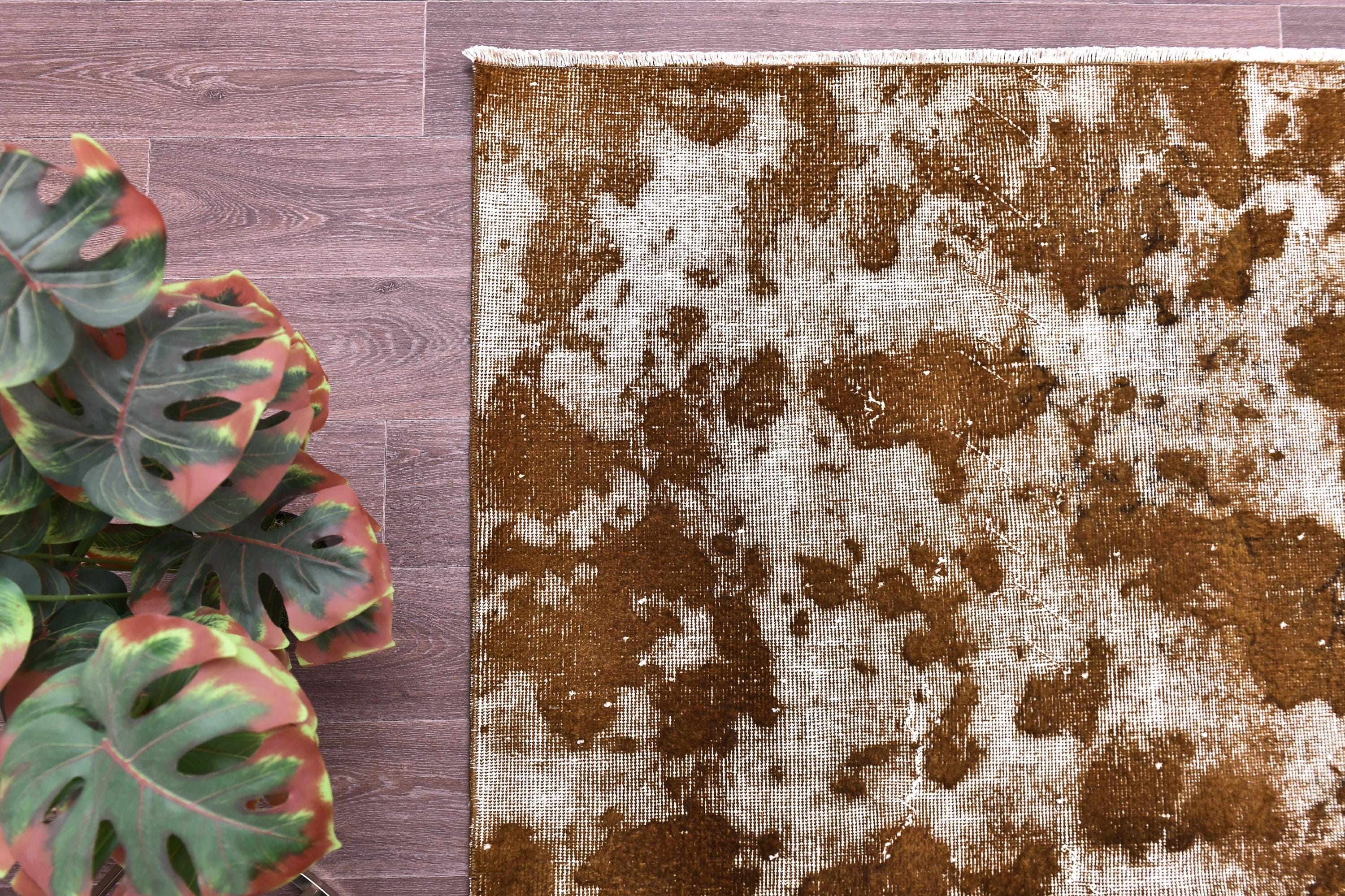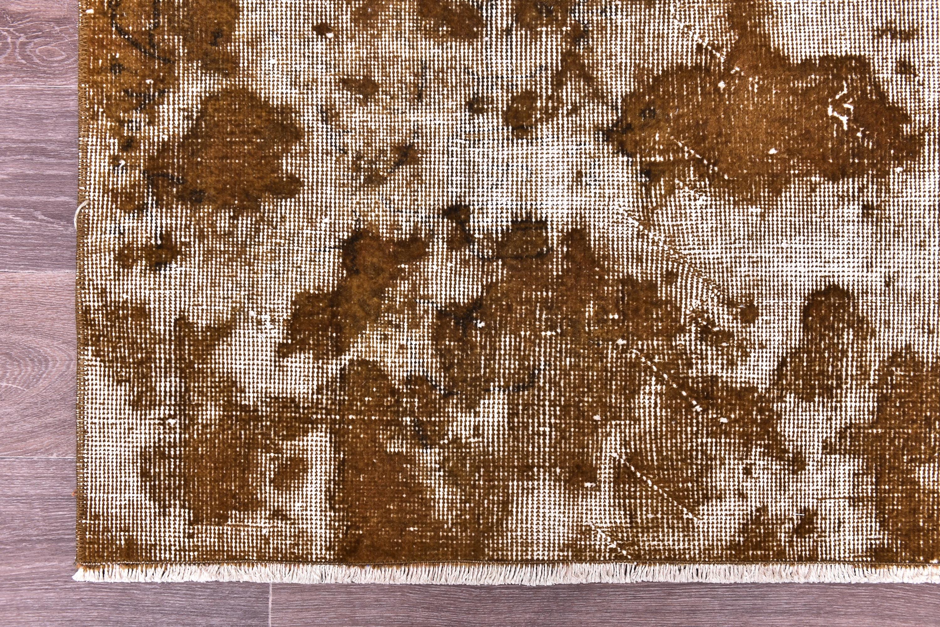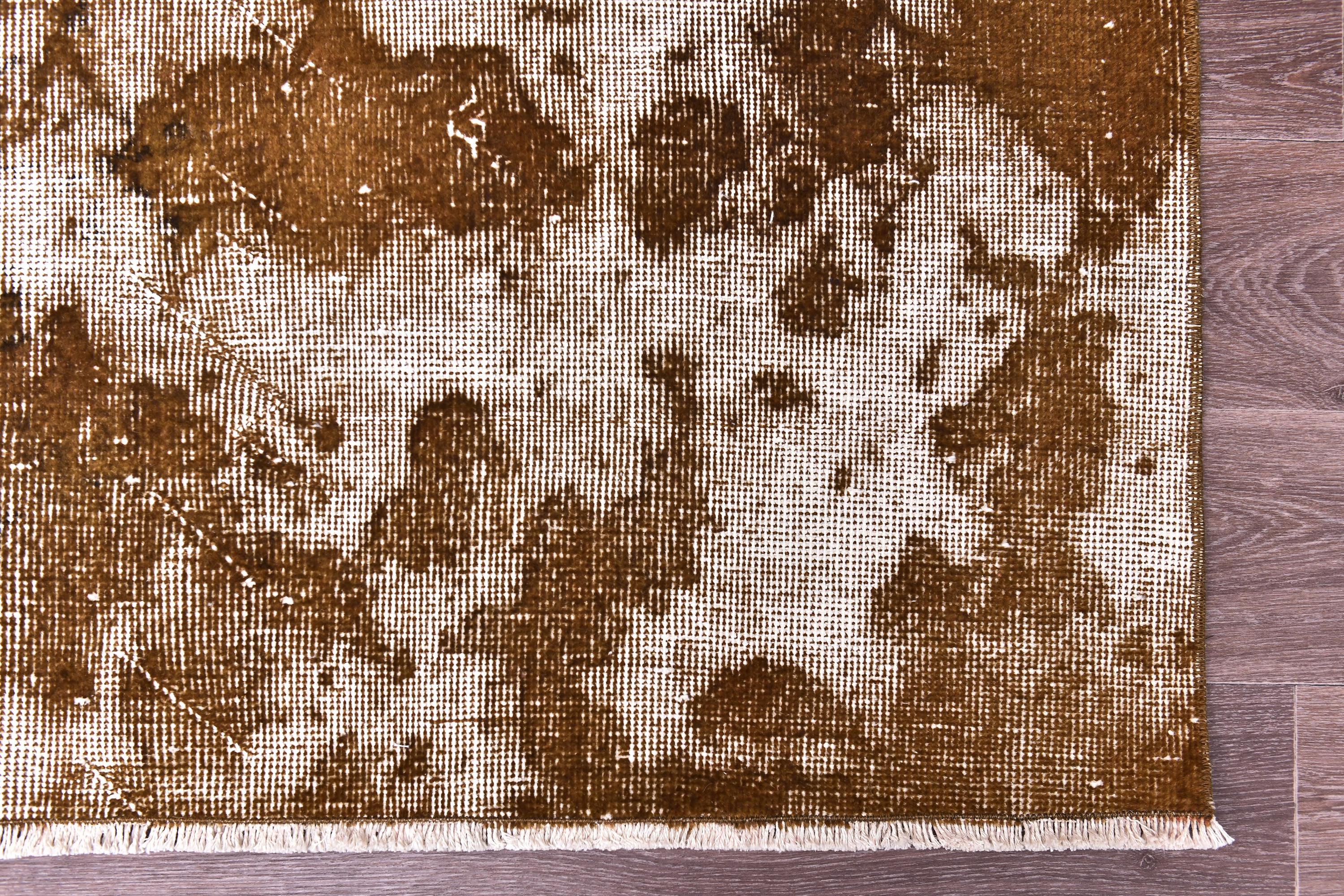 📜📌 Vintage Turkish overdyed area rug featuring warm golden brown and cream tones with heavily distressed floral motifs throughout. Hand-knotted wool carpet displays weathered appearance with natural ivory abrash effects and traditional botanical design. Perfect for bohemian or modern eclectic interior spaces seeking authentic vintage character