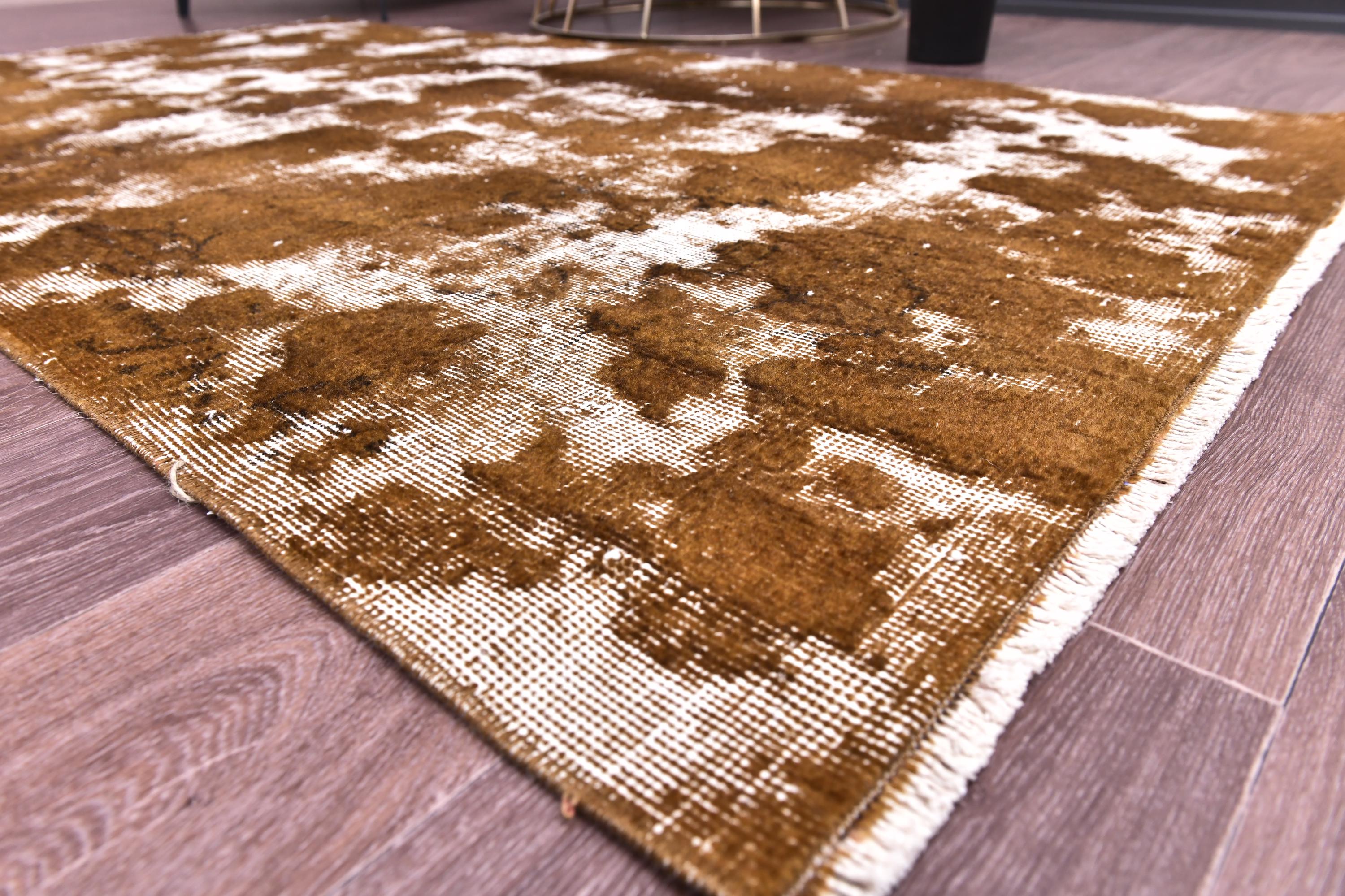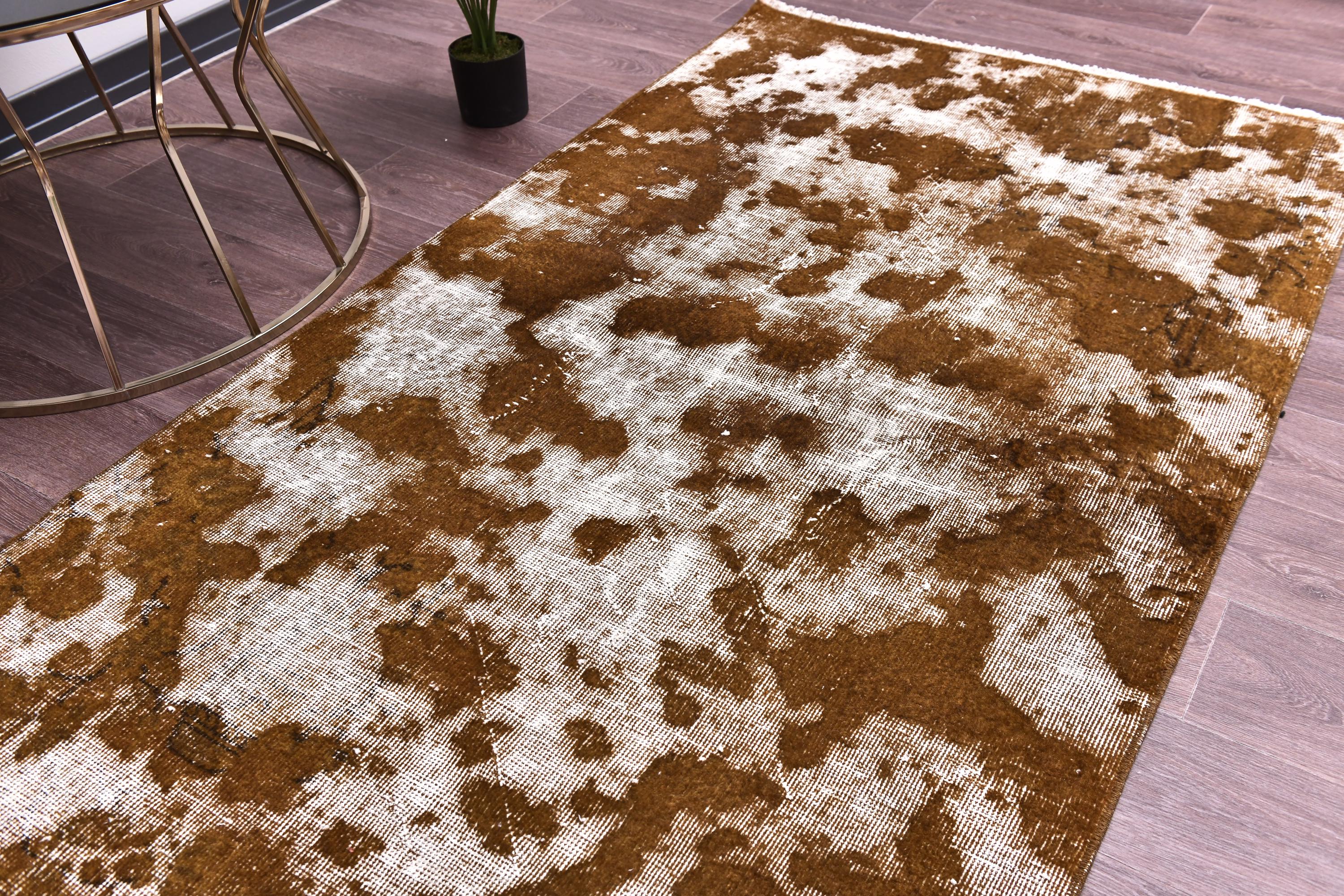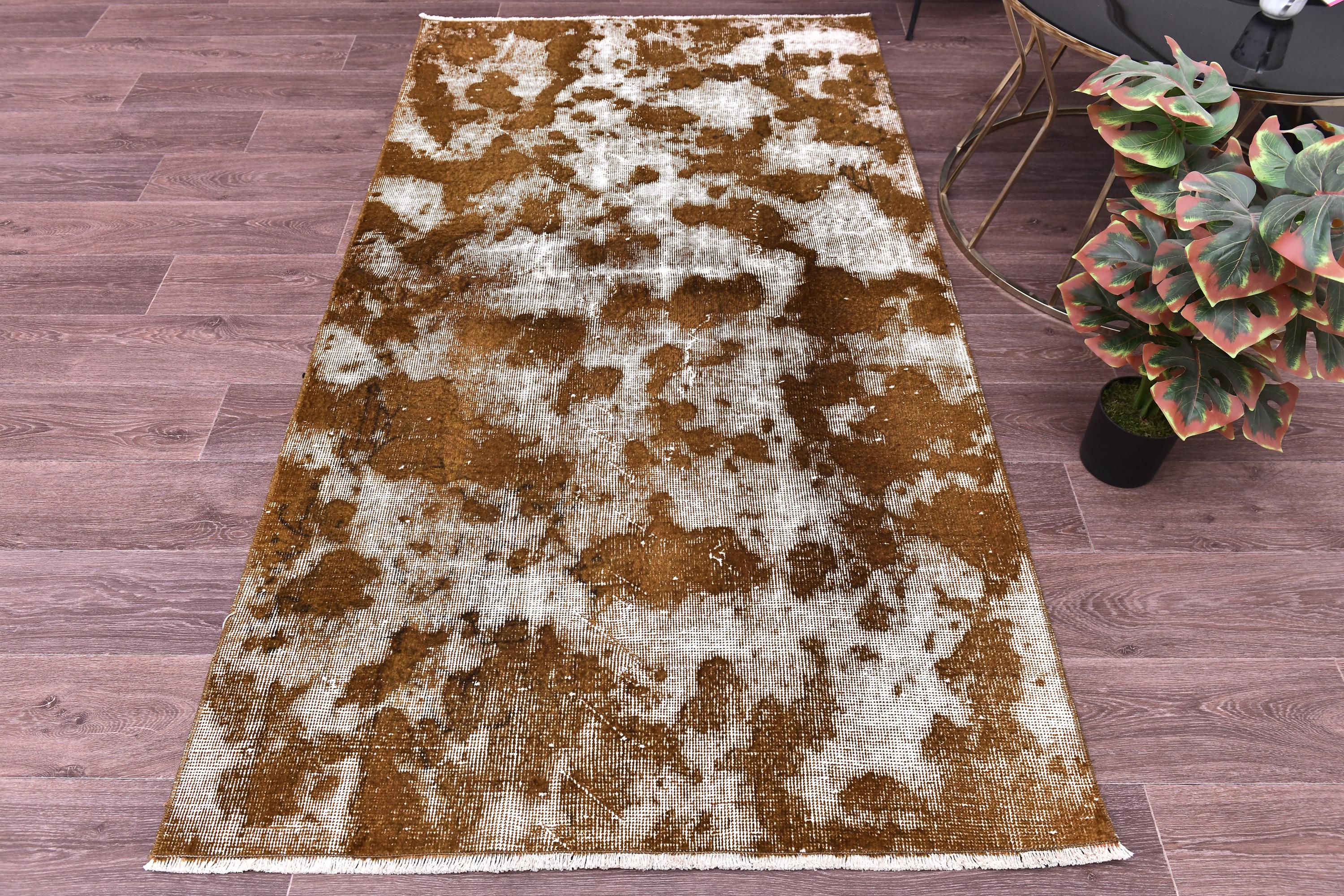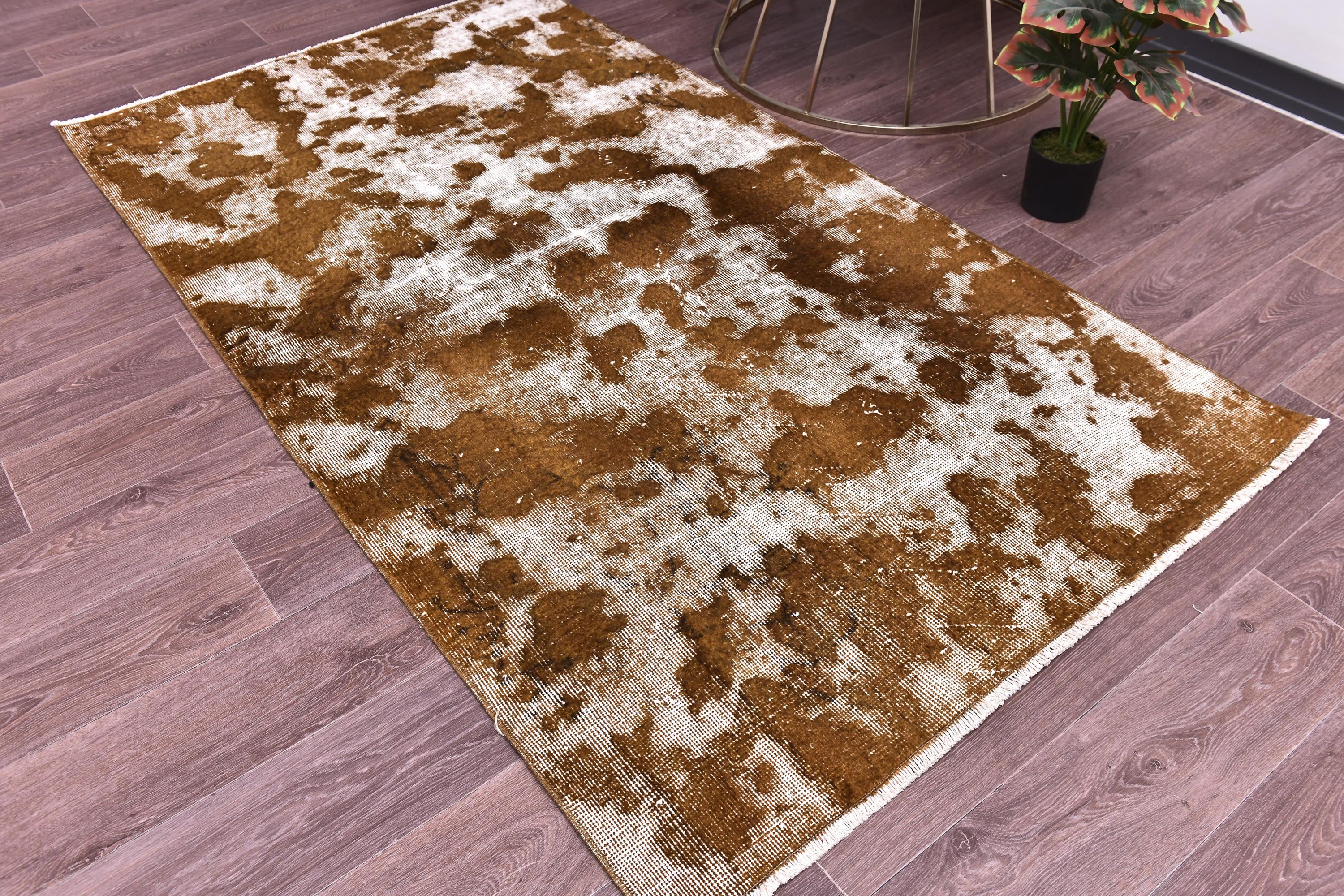 📜📌 Vintage Turkish overdyed area rug featuring warm golden brown and cream tones with heavily distressed floral motifs throughout. Hand-knotted wool carpet displays weathered appearance with natural ivory abrash effects and traditional botanical design. Perfect for bohemian or modern eclectic interior spaces seeking authentic vintage character