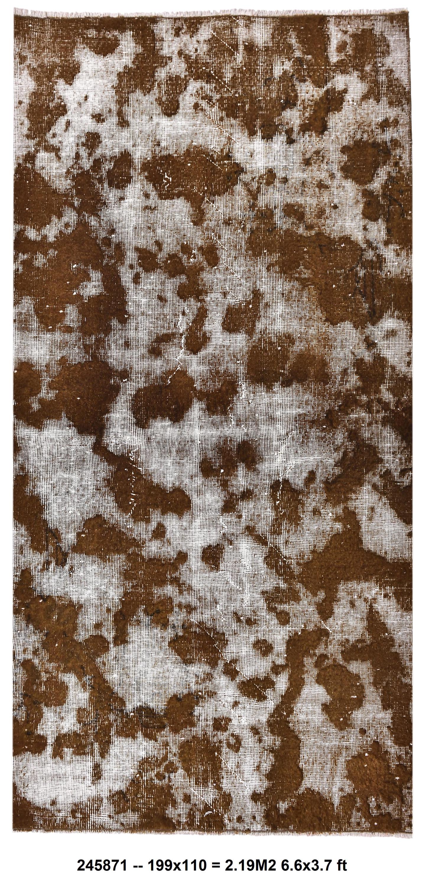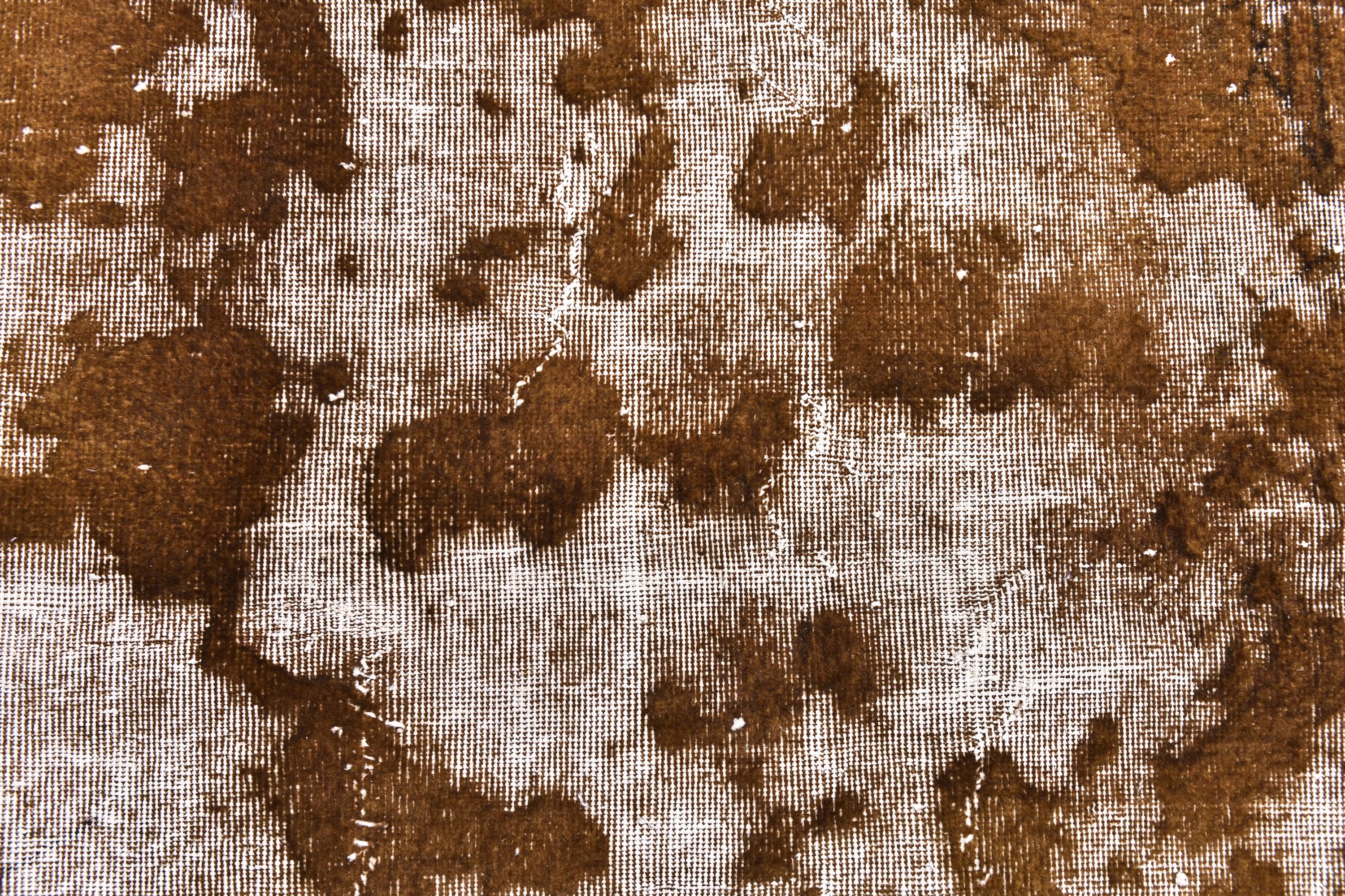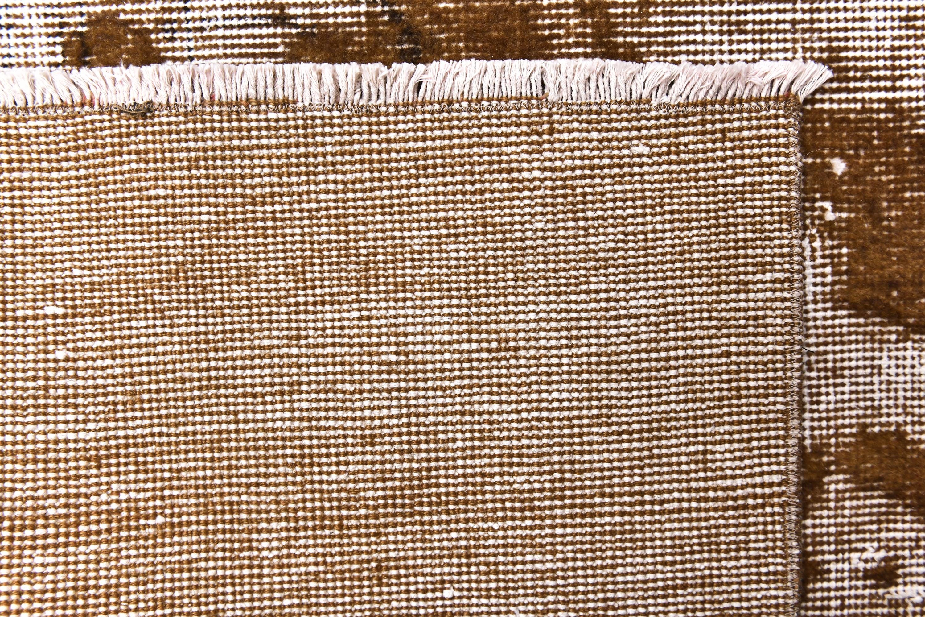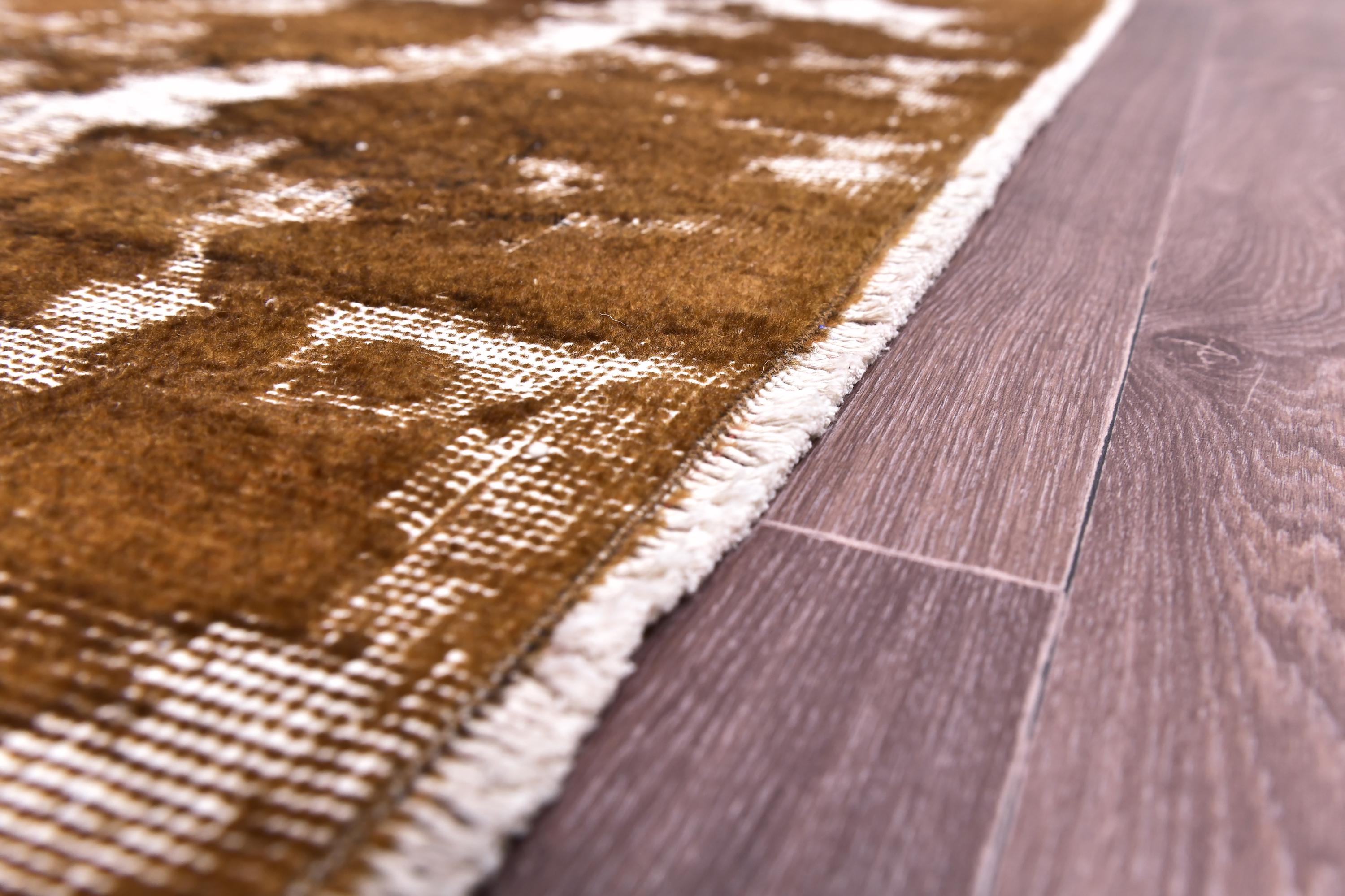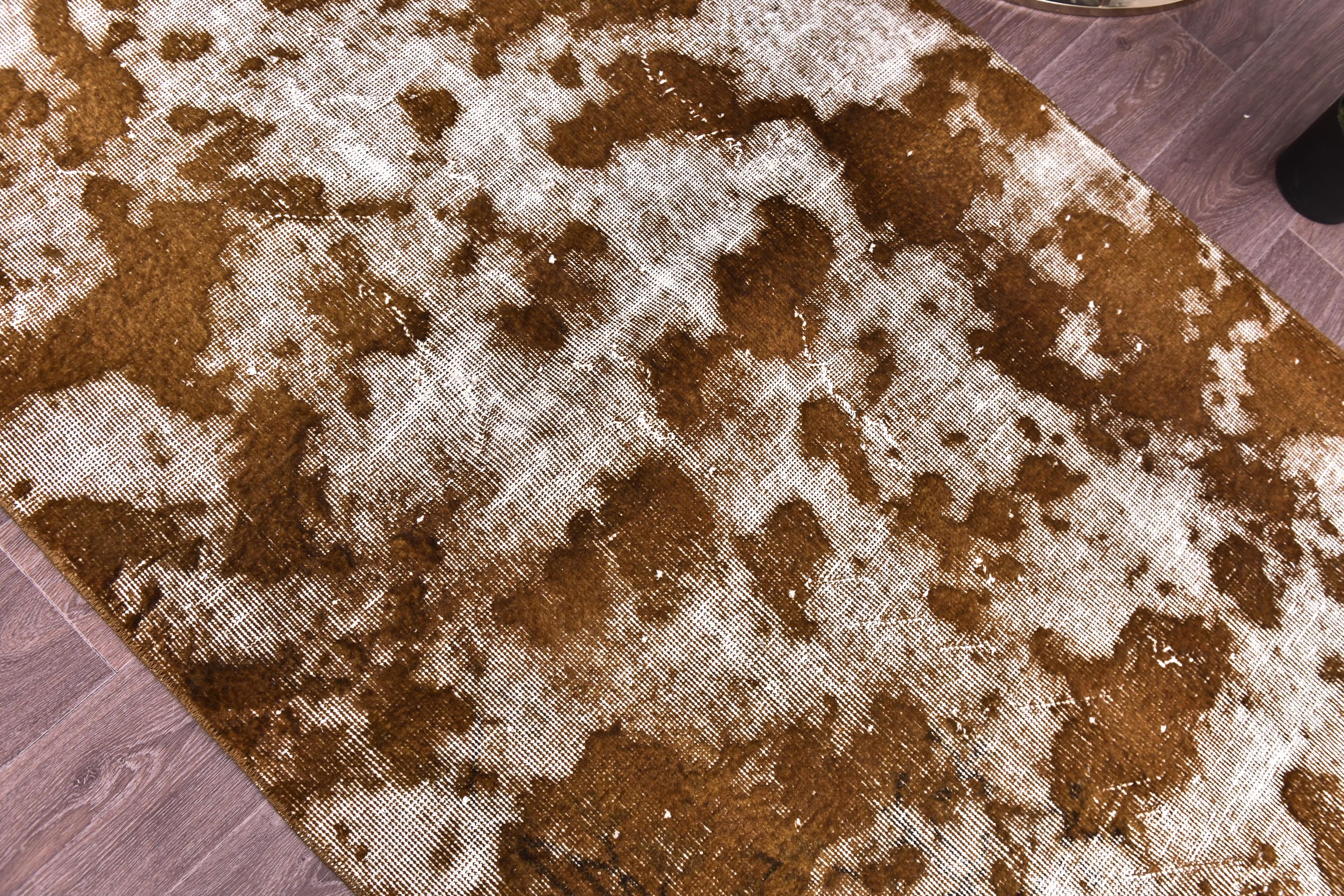 📜📌 Vintage Turkish overdyed area rug featuring warm golden brown and cream tones with heavily distressed floral motifs throughout. Hand-knotted wool carpet displays weathered appearance with natural ivory abrash effects and traditional botanical design. Perfect for bohemian or modern eclectic interior spaces seeking authentic vintage character