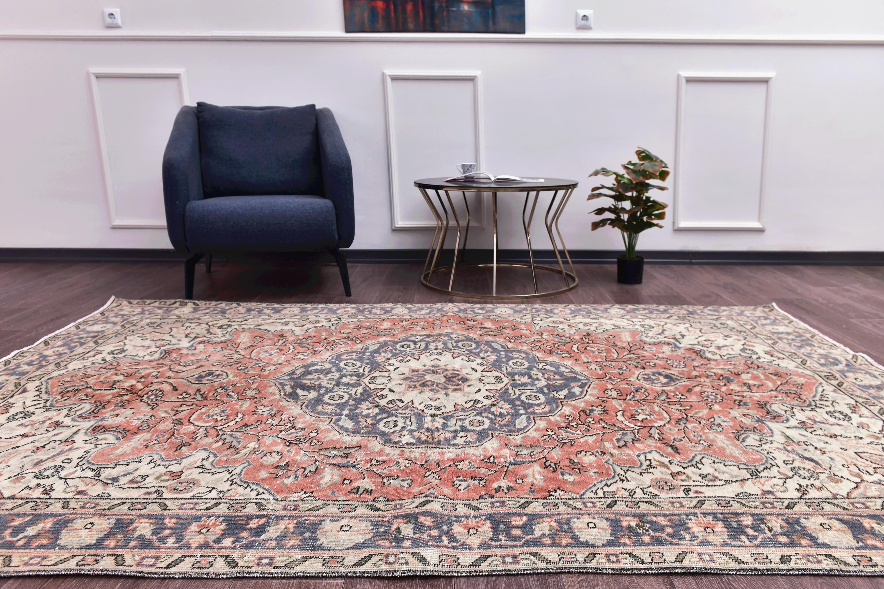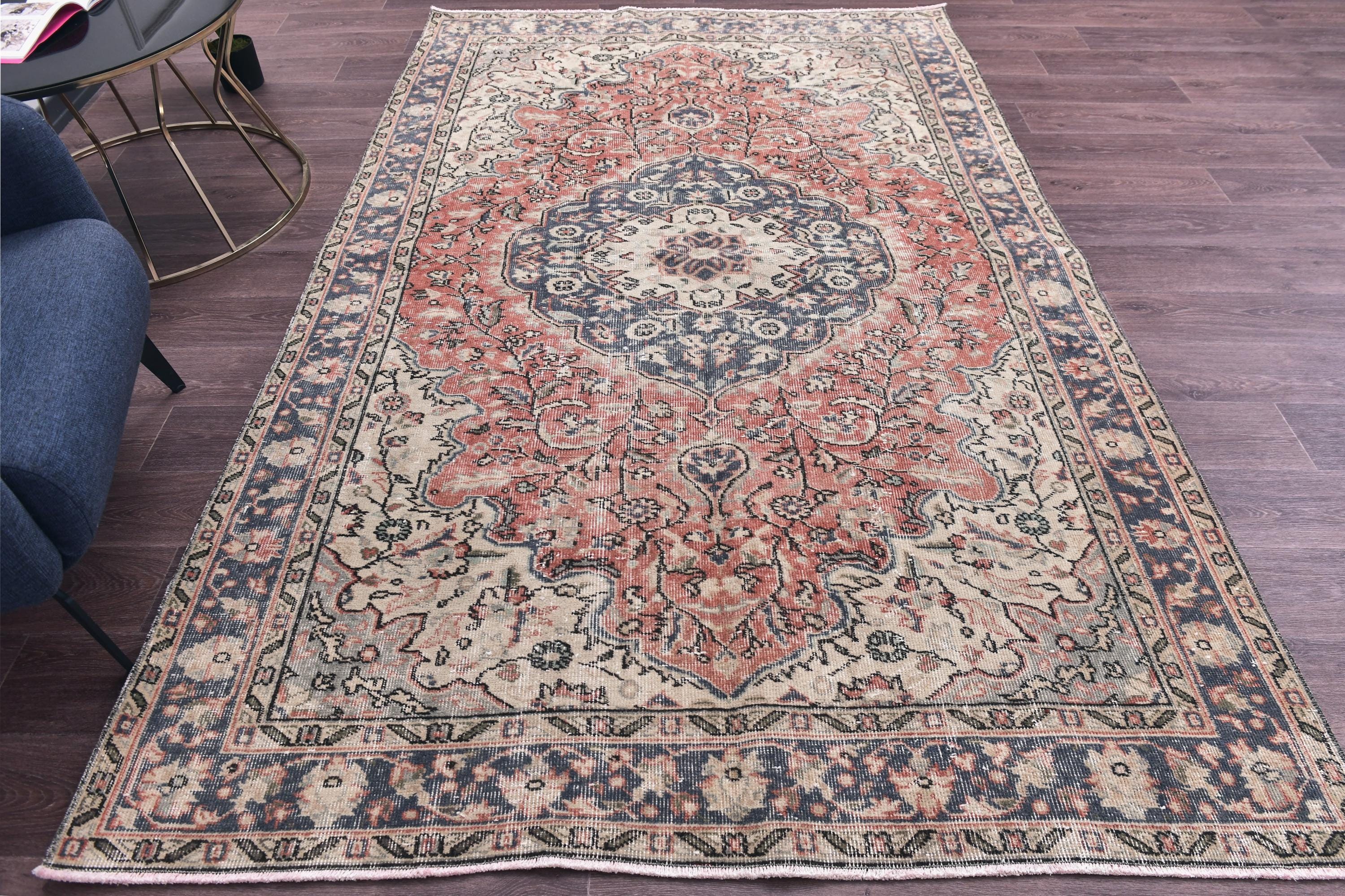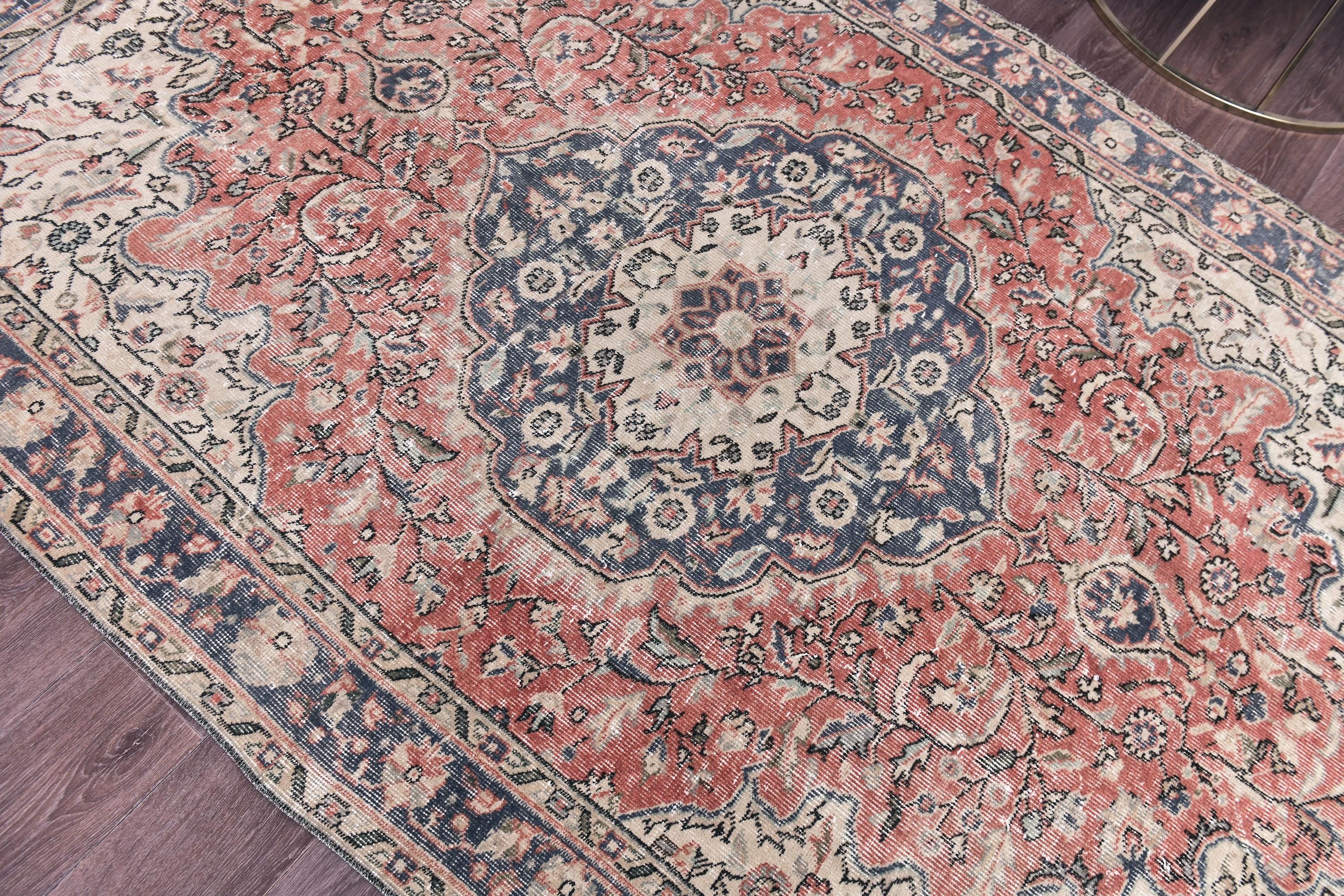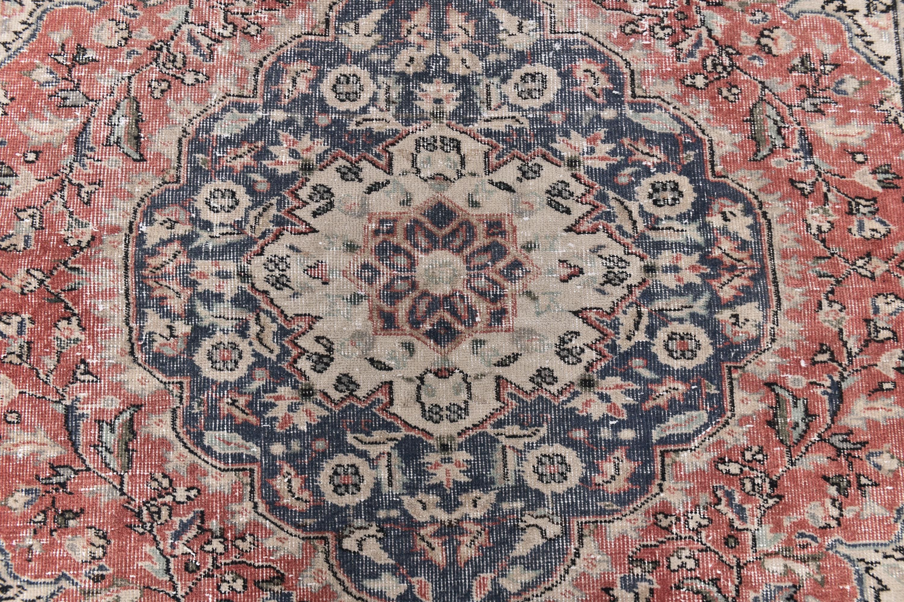 📜📌 Traditional Turkish medallion rug with ornate center rosette surrounded by coral pink field and elaborate floral motifs. Navy blue border with repeated botanical patterns frames the design. Hand-woven wool construction with faded vintage aesthetic and visible texture.
