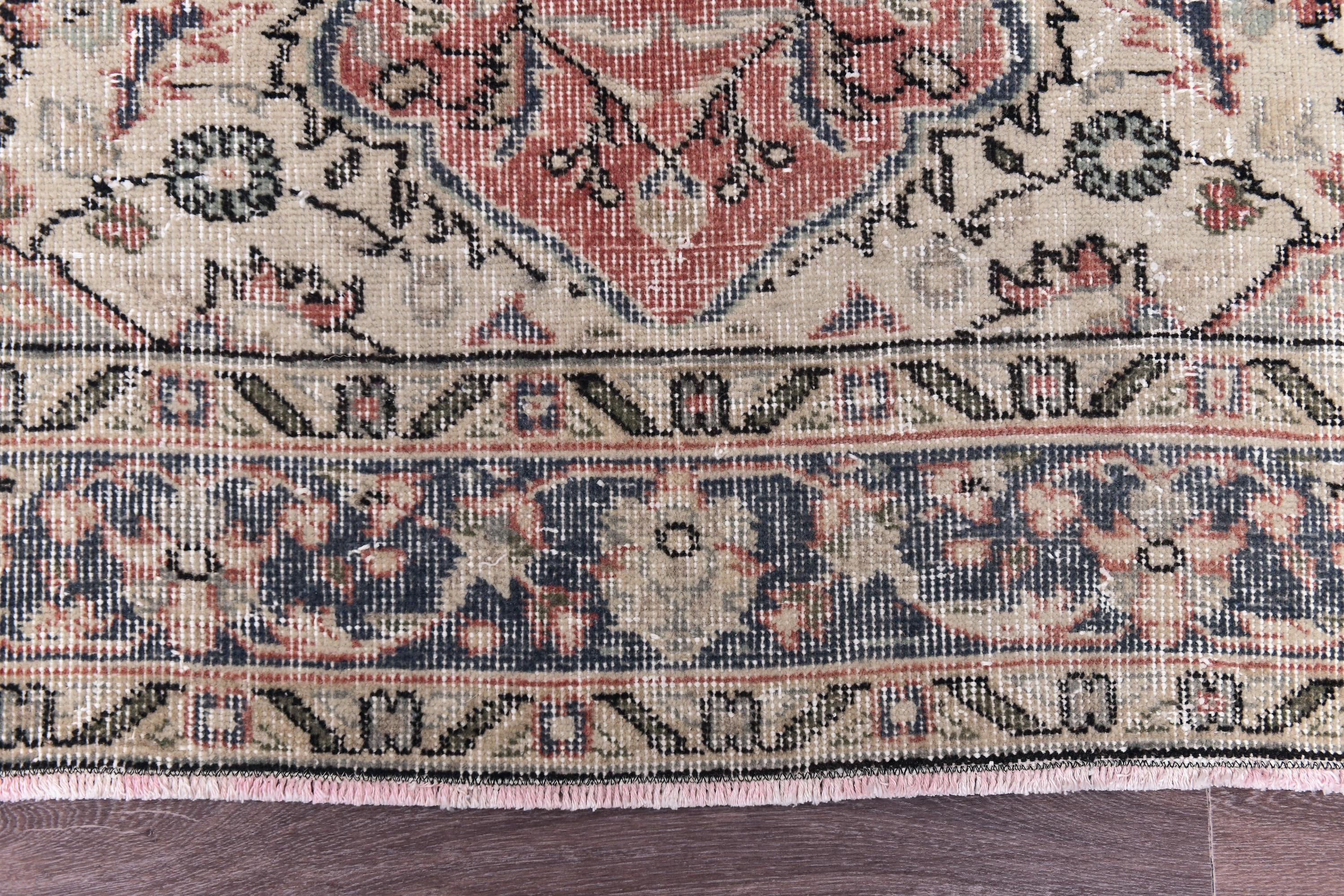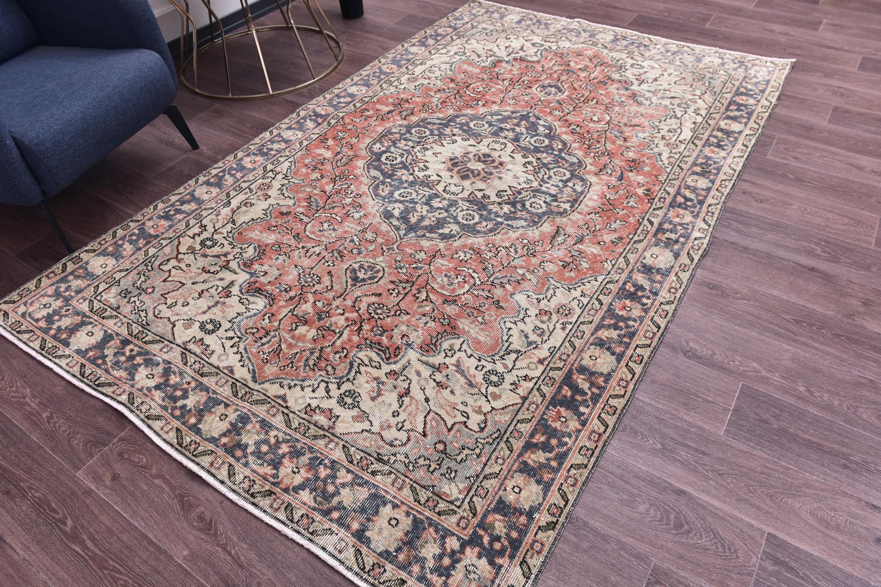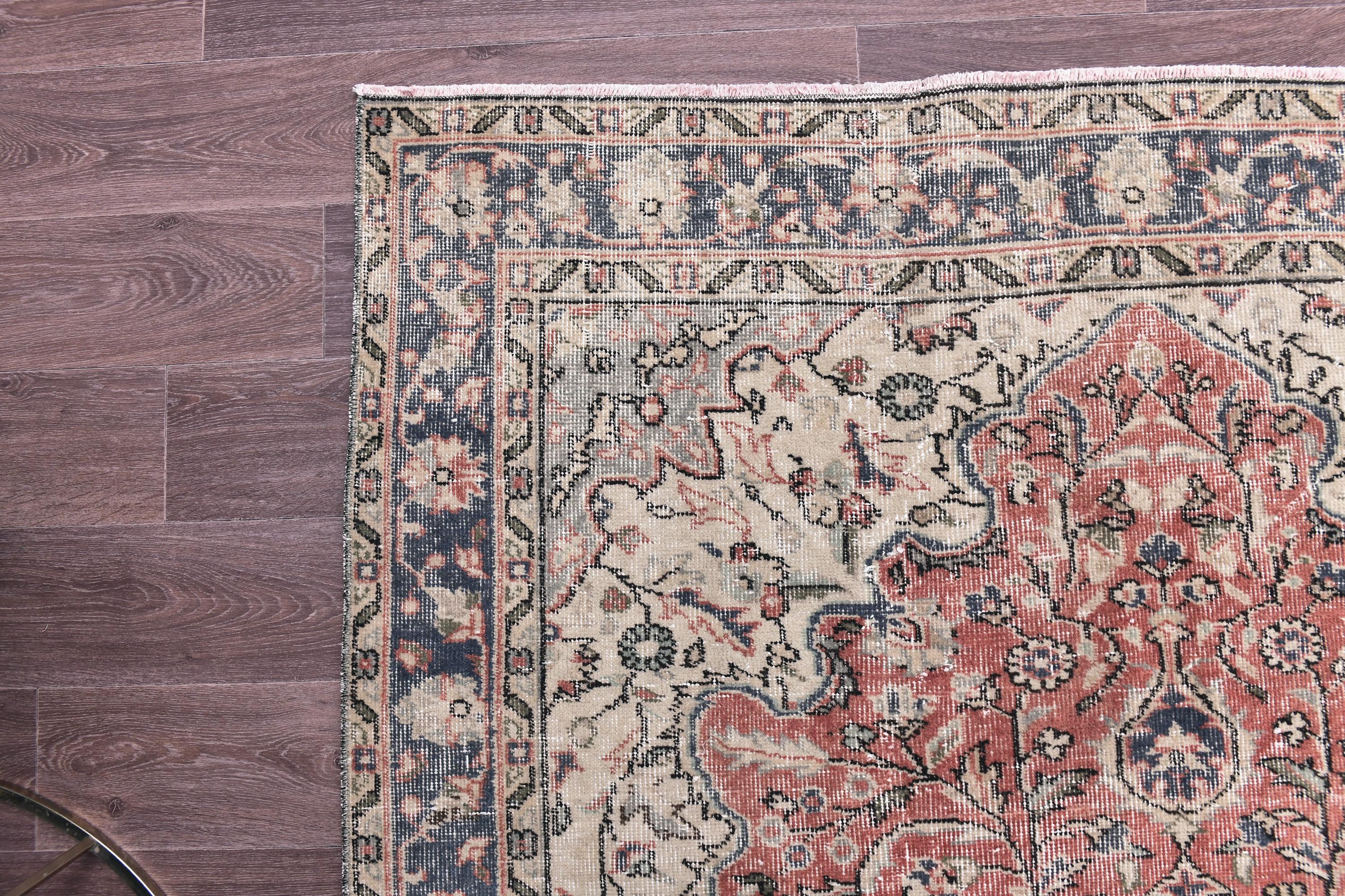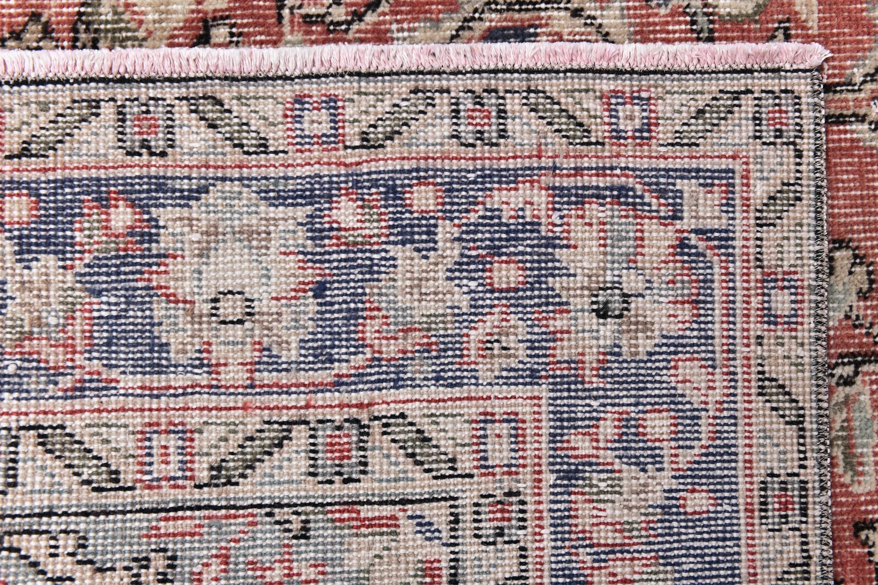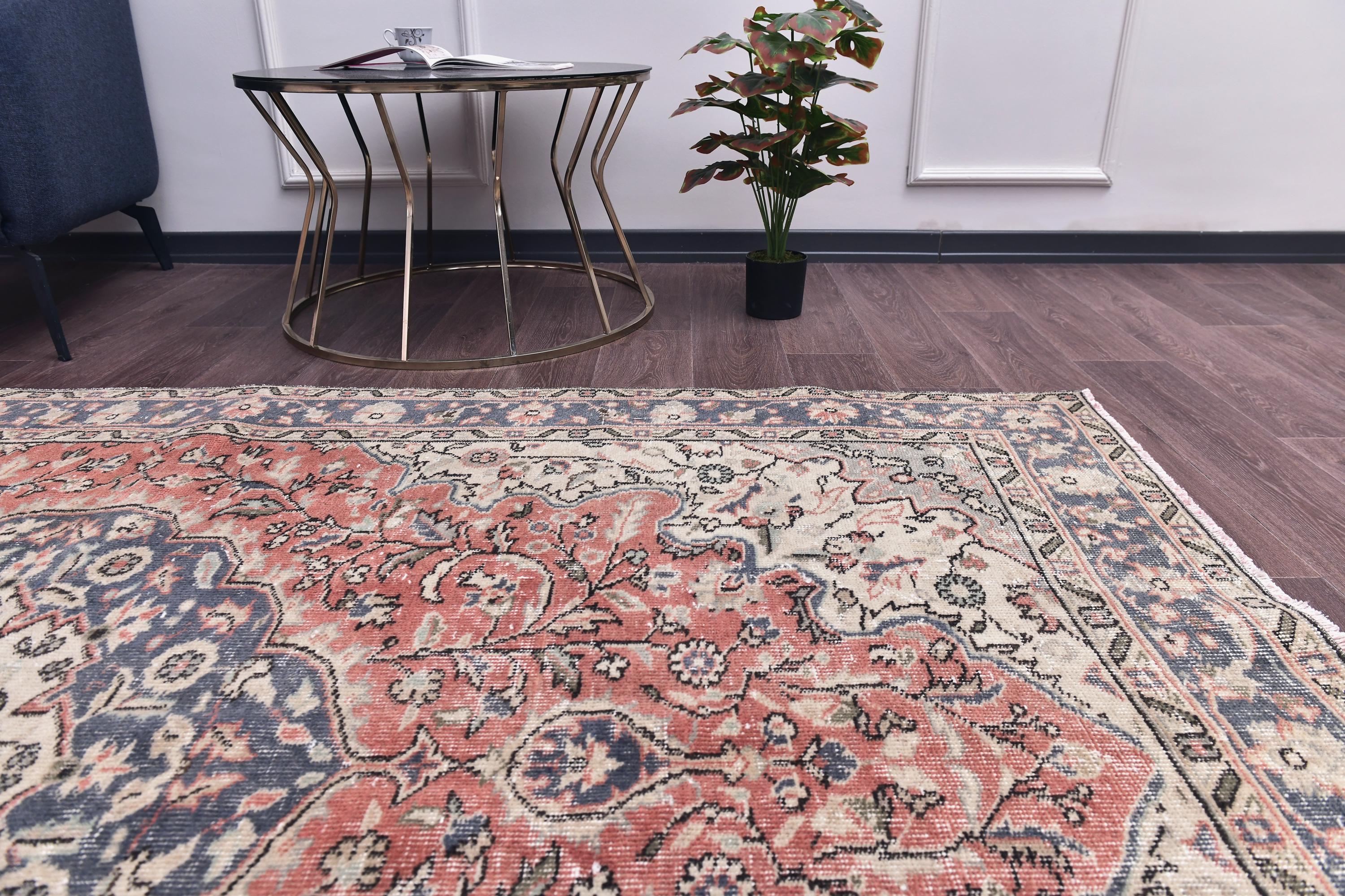 📜📌 Traditional Turkish medallion rug with ornate center rosette surrounded by coral pink field and elaborate floral motifs. Navy blue border with repeated botanical patterns frames the design. Hand-woven wool construction with faded vintage aesthetic and visible texture.