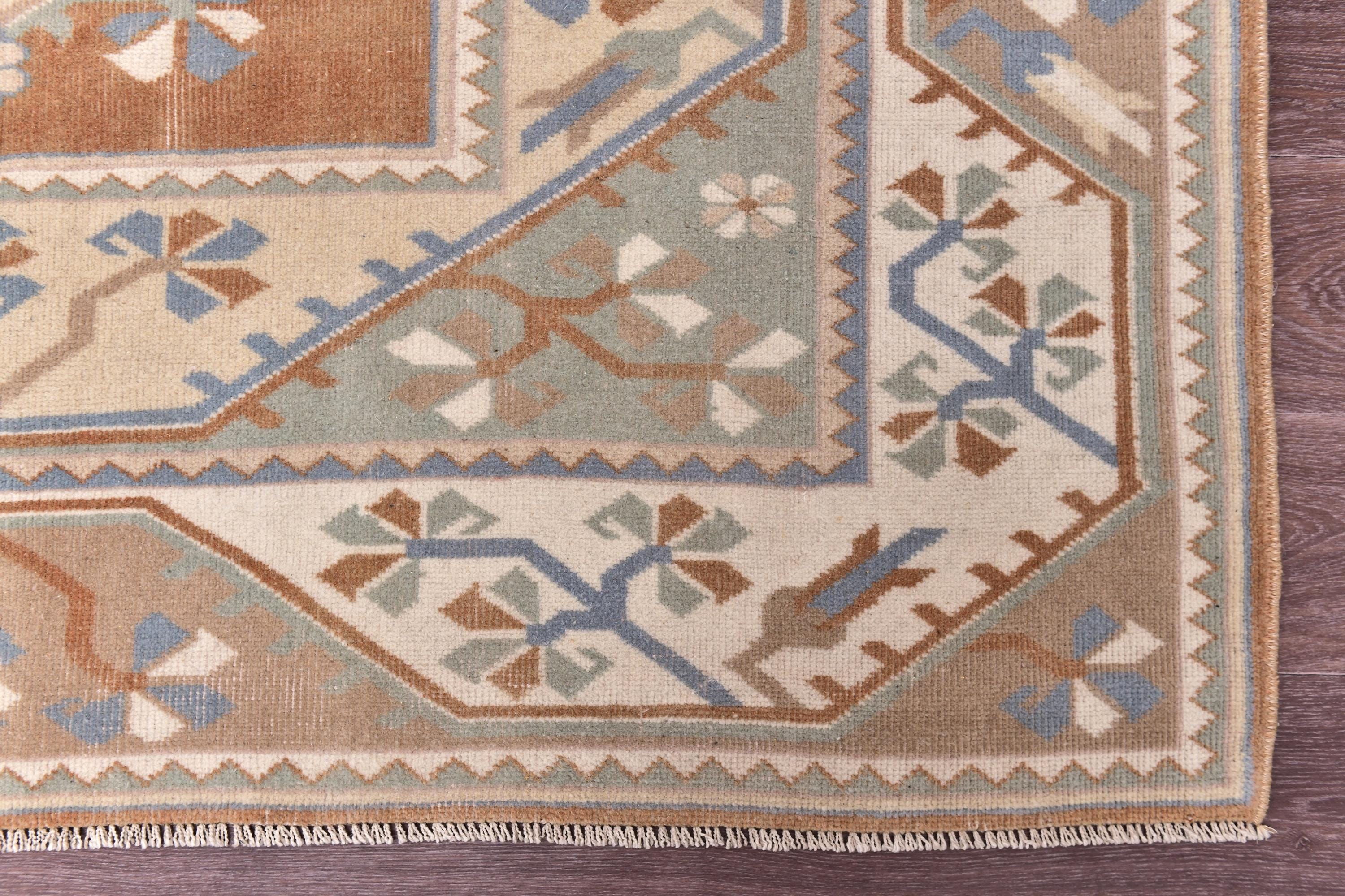 📜📌 Vintage Turkish Milas area rug featuring three geometric diamond medallions in the center field with warm beige, peach, and faded blue tones. The hand-knotted wool rug displays traditional geometric borders with distressed patina, tribal motifs, and natural color variations throughout its aged surface.