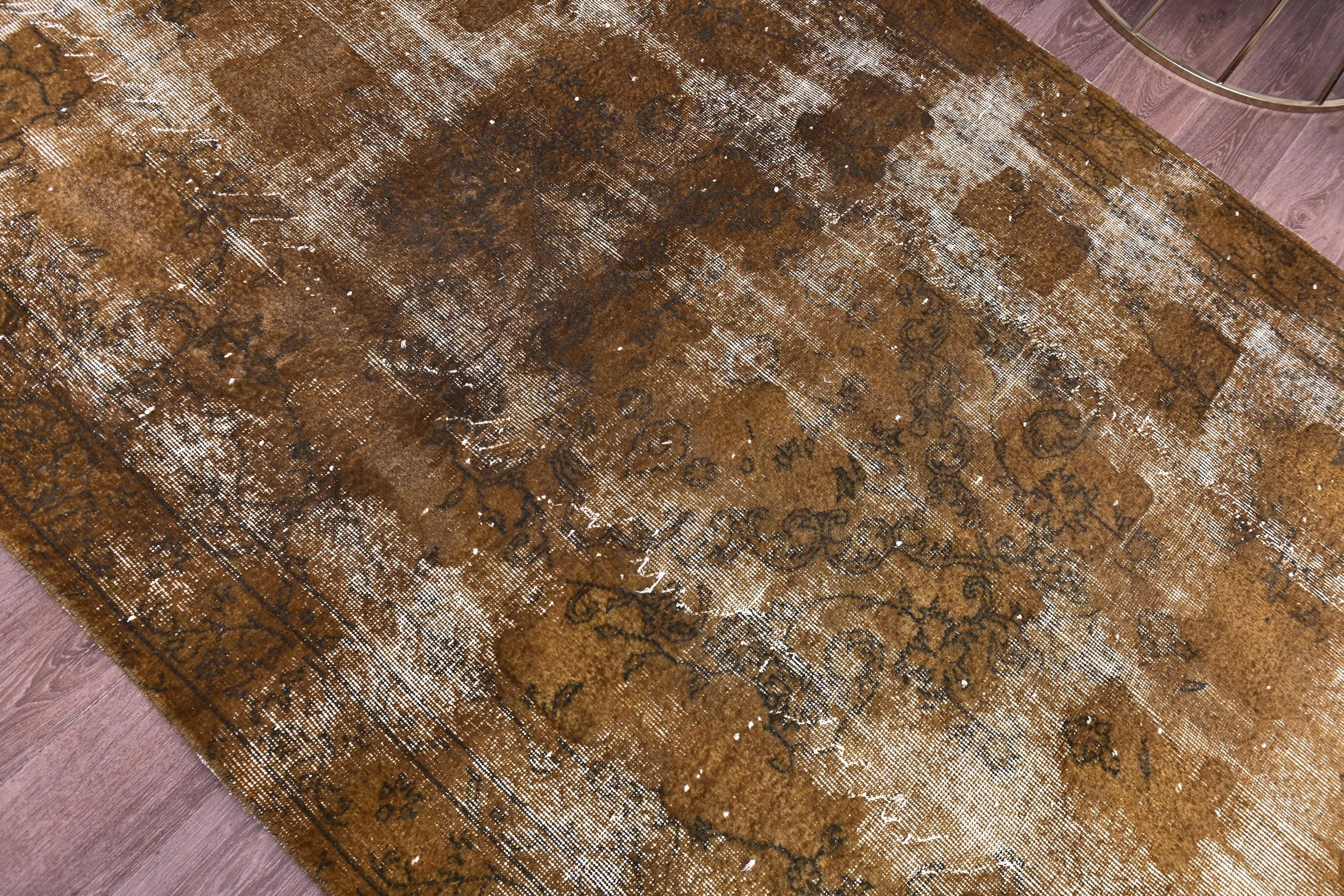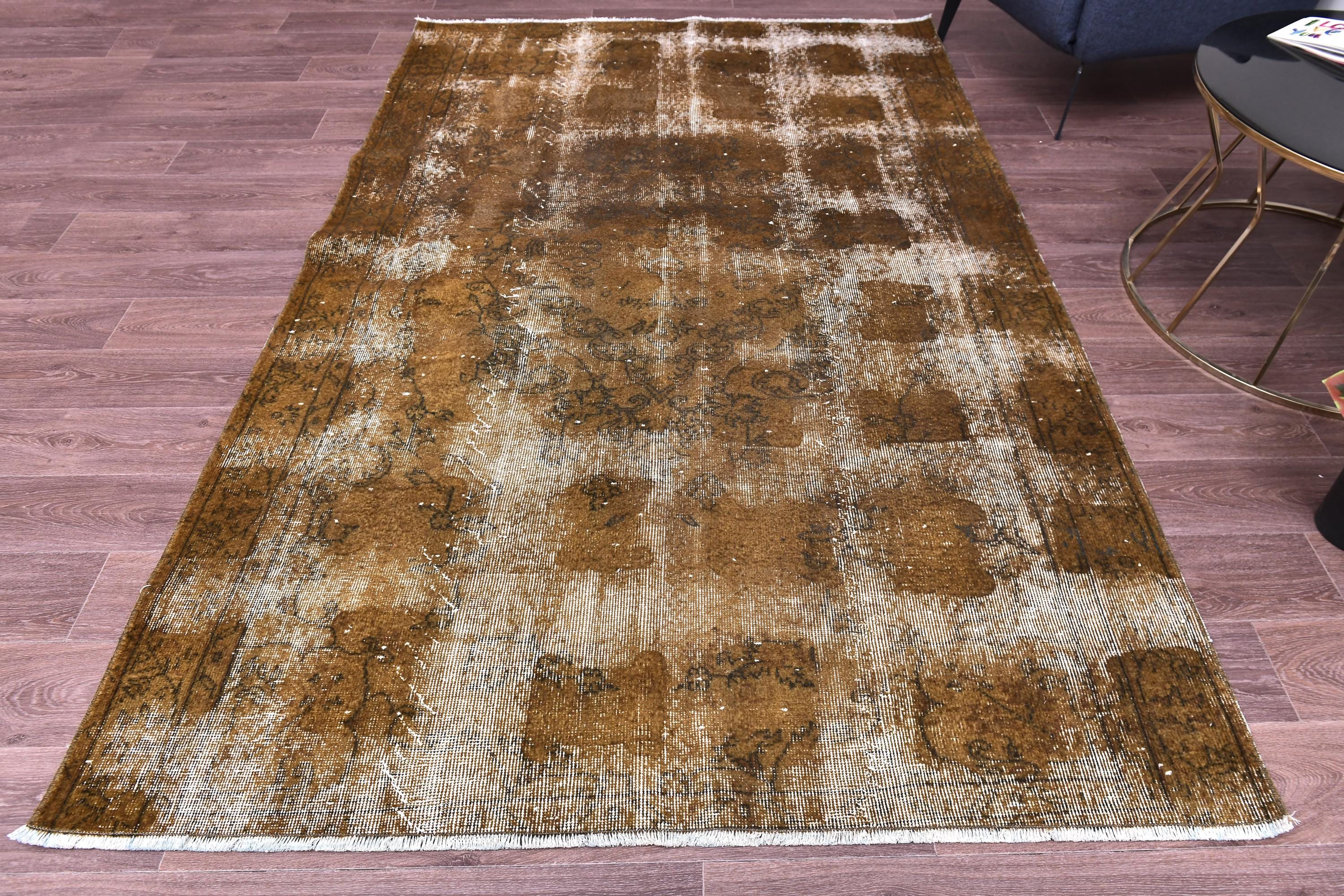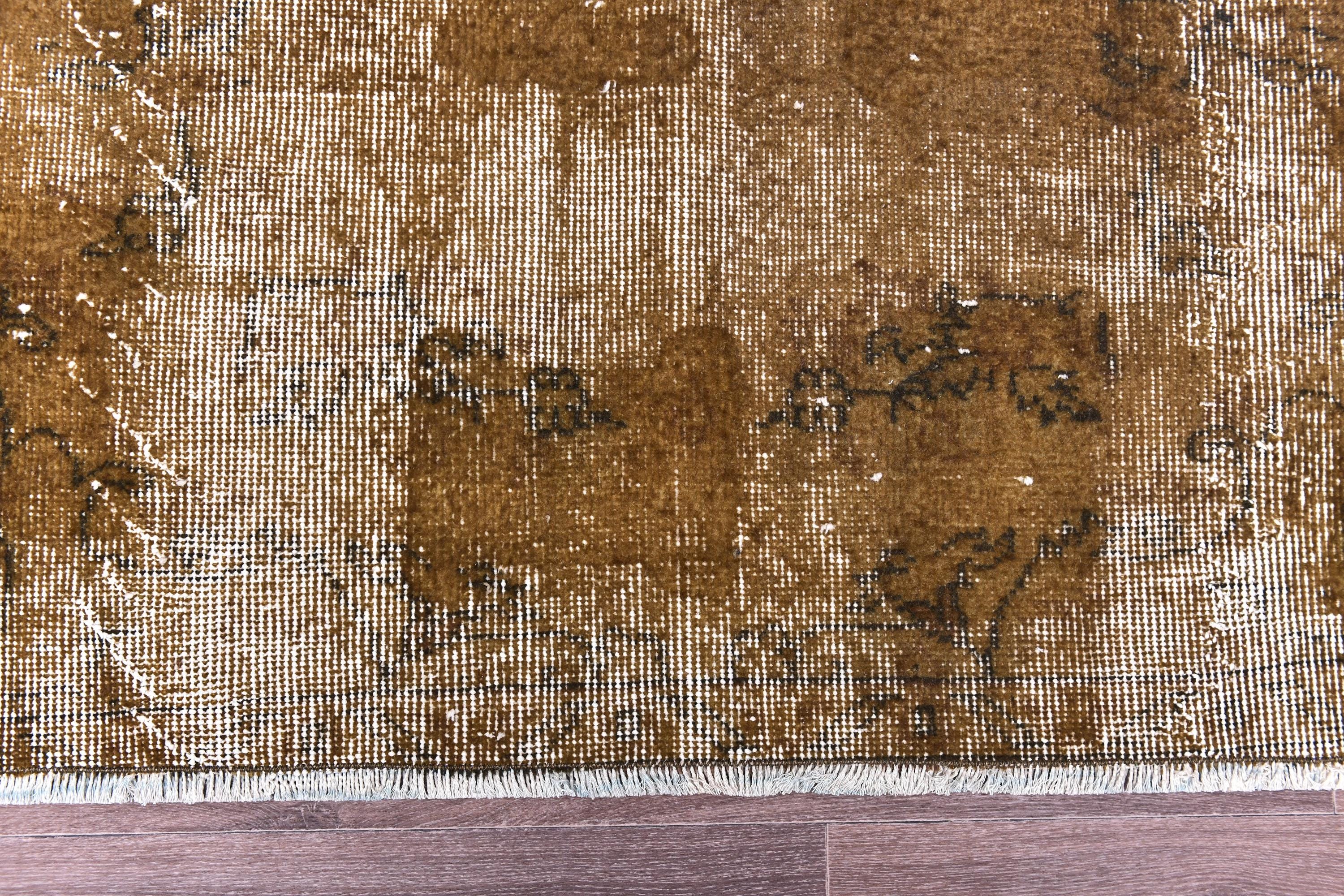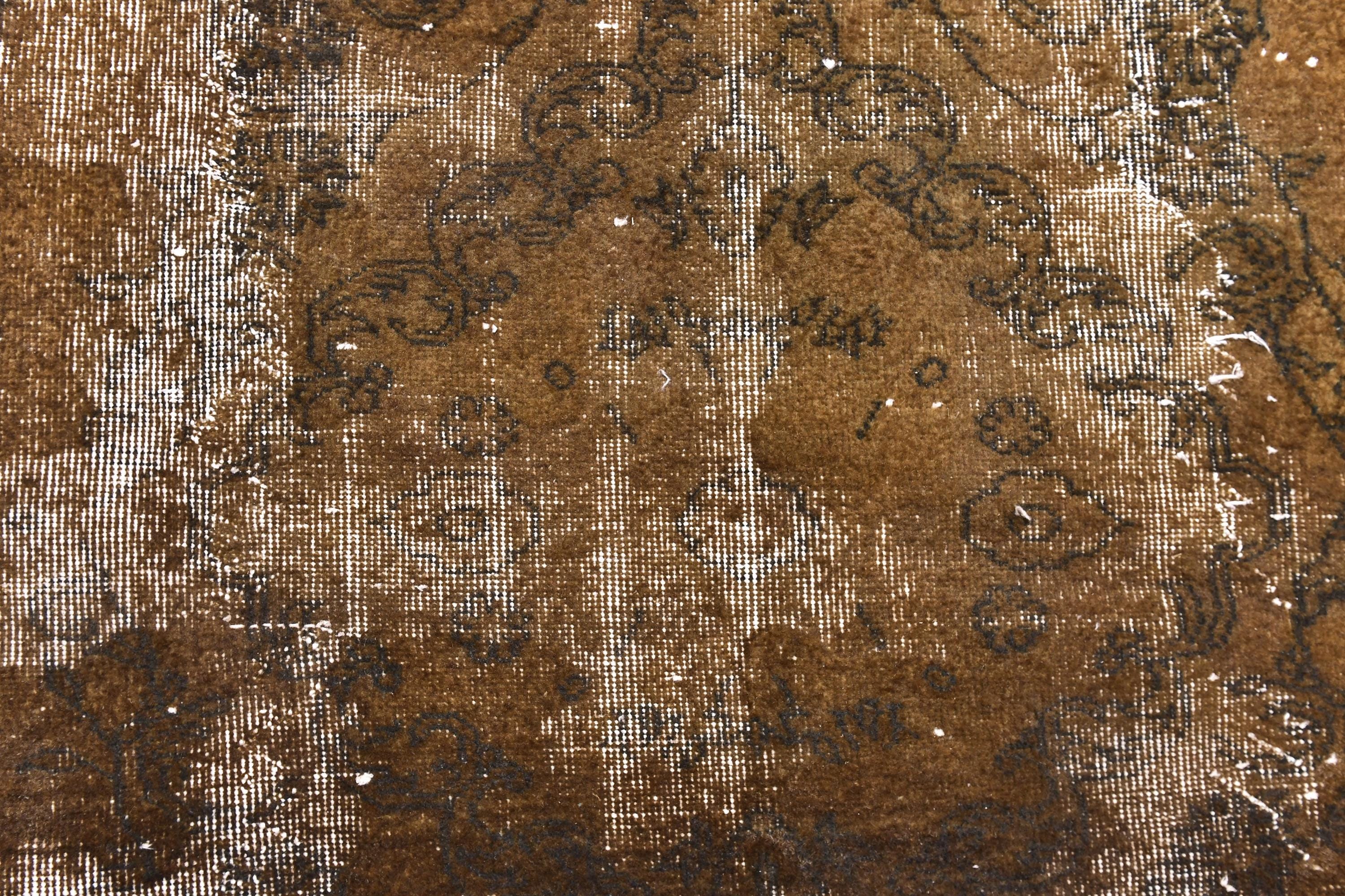 📜📌 Vintage Turkish overdyed area rug featuring rich brown and beige tones with distressed floral medallion patterns throughout. Hand-knotted wool carpet with weathered appearance, cream-colored abrash effects, and traditional Oriental border design. Perfect for bohemian or eclectic interior spaces.