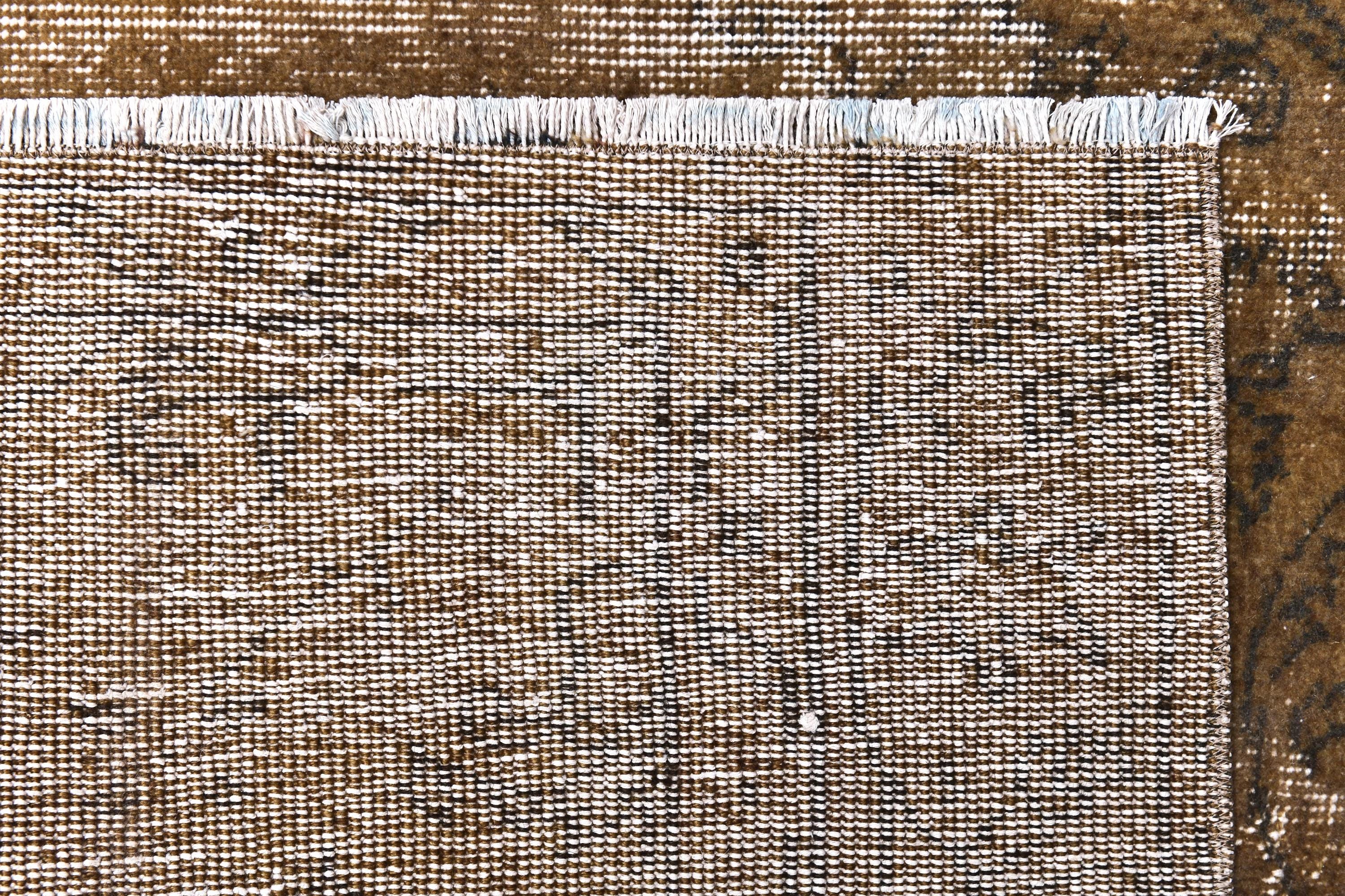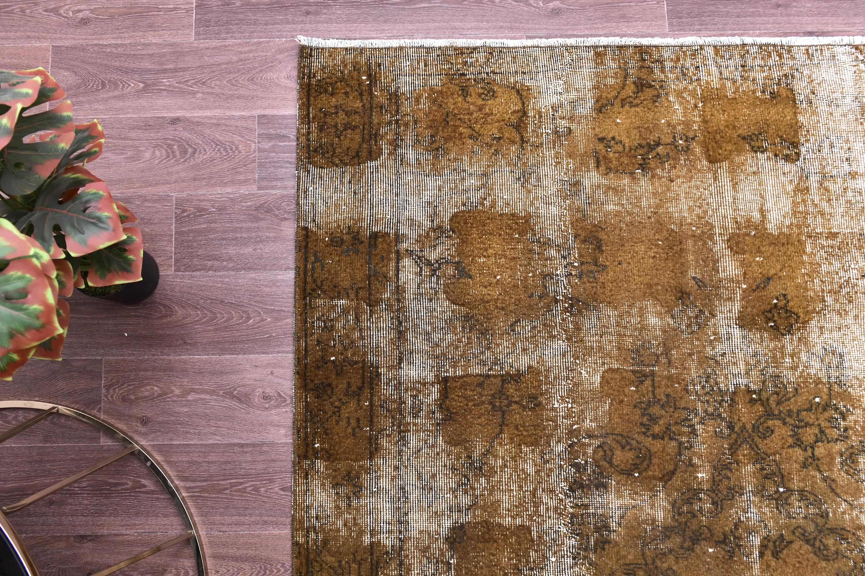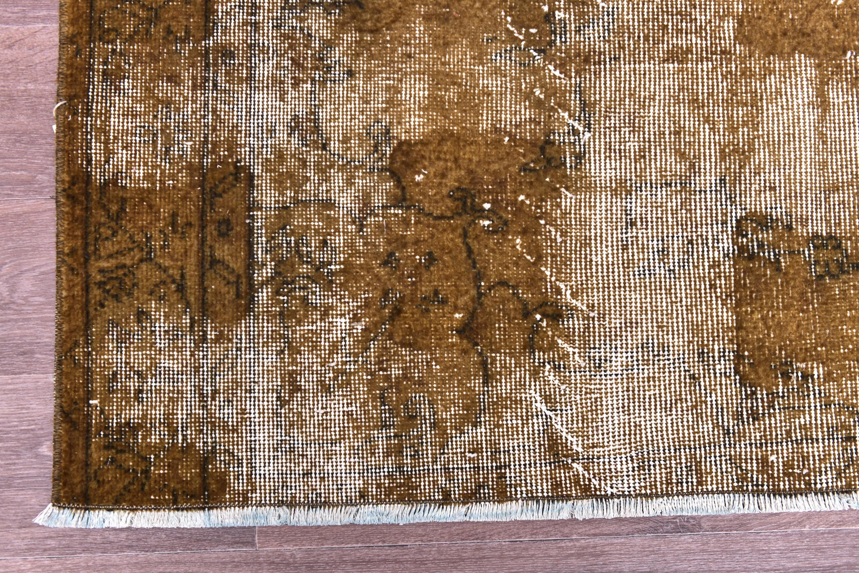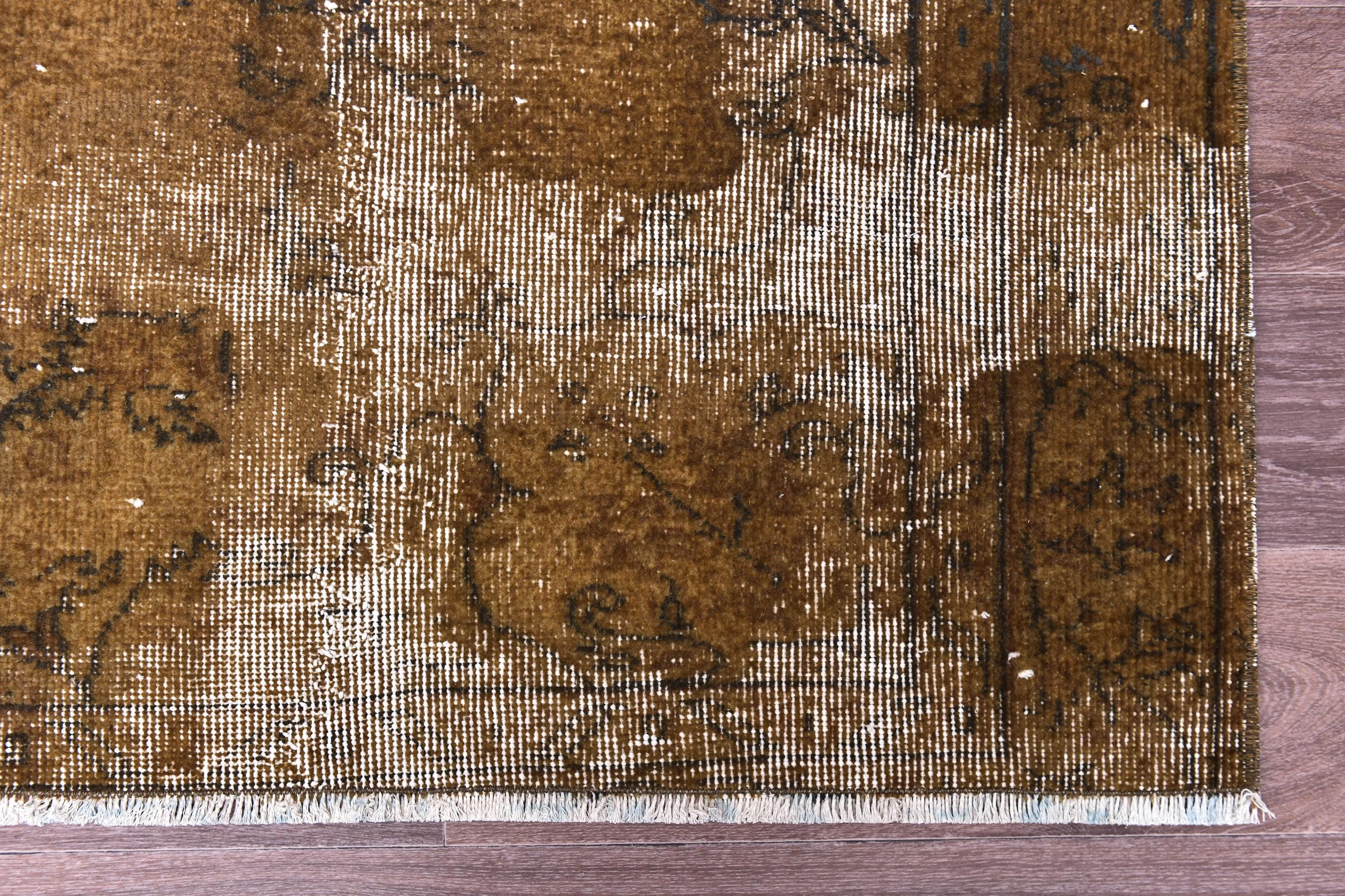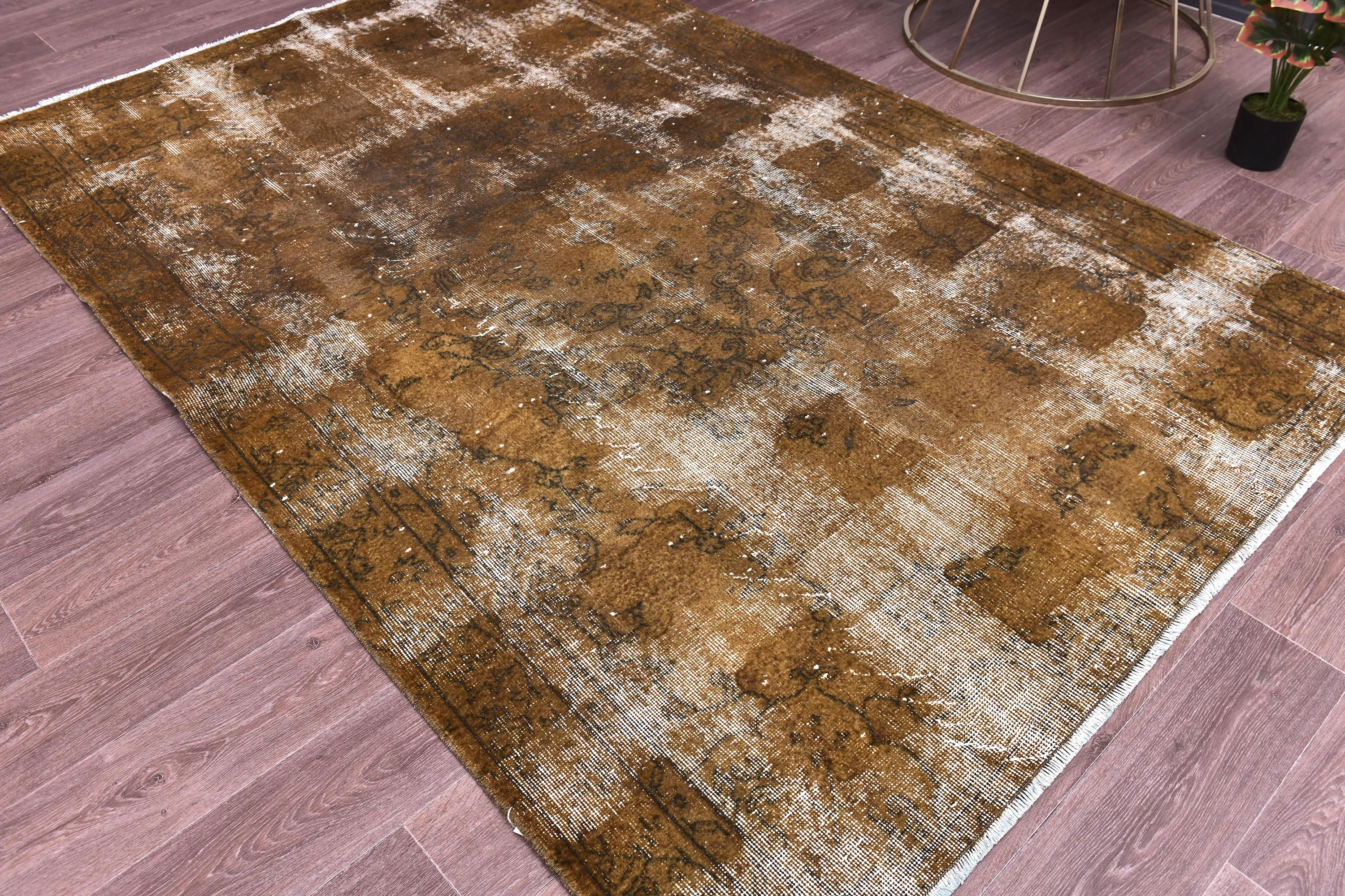 📜📌 Vintage Turkish overdyed area rug featuring rich brown and beige tones with distressed floral medallion patterns throughout. Hand-knotted wool carpet with weathered appearance, cream-colored abrash effects, and traditional Oriental border design. Perfect for bohemian or eclectic interior spaces.