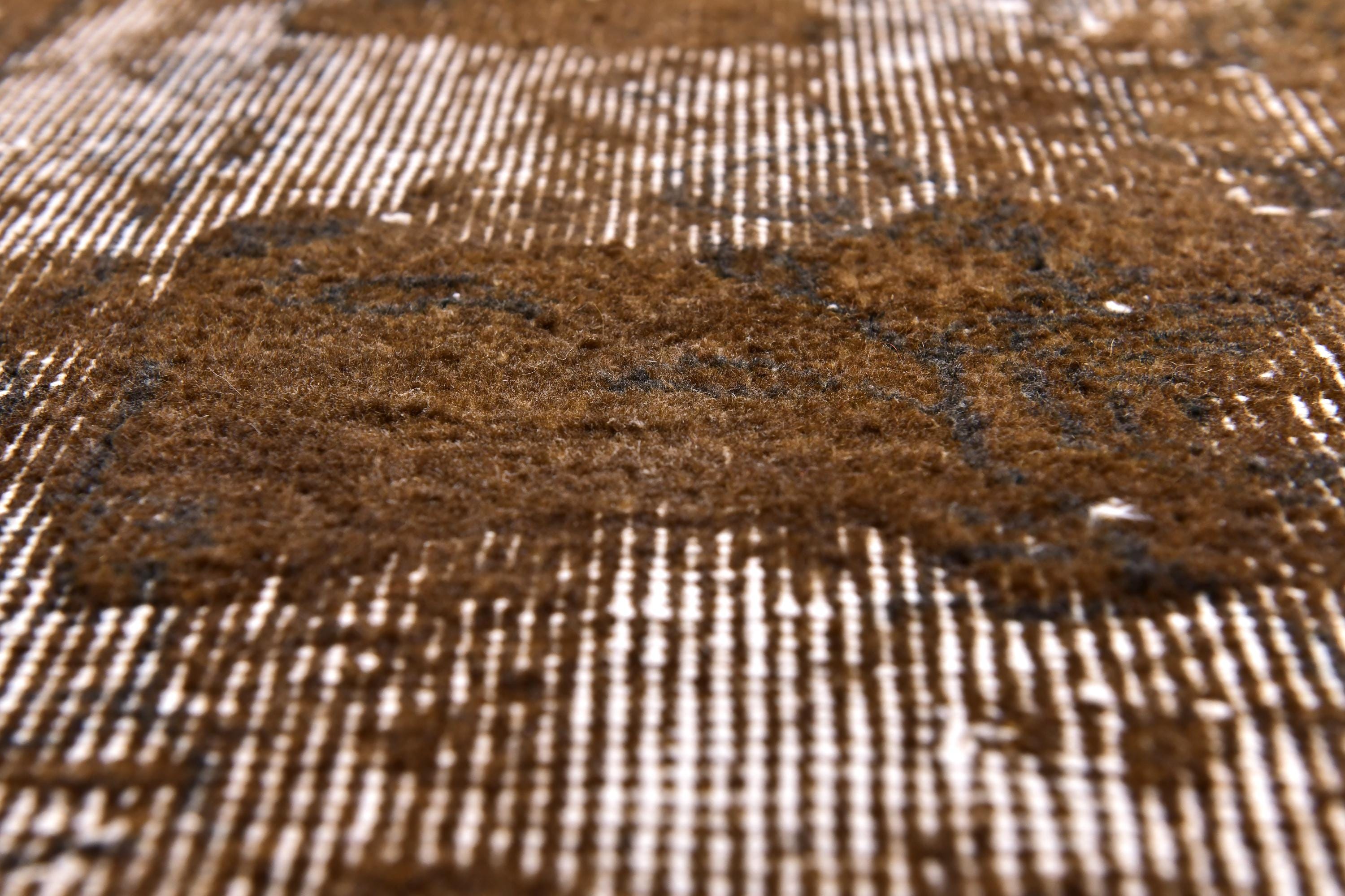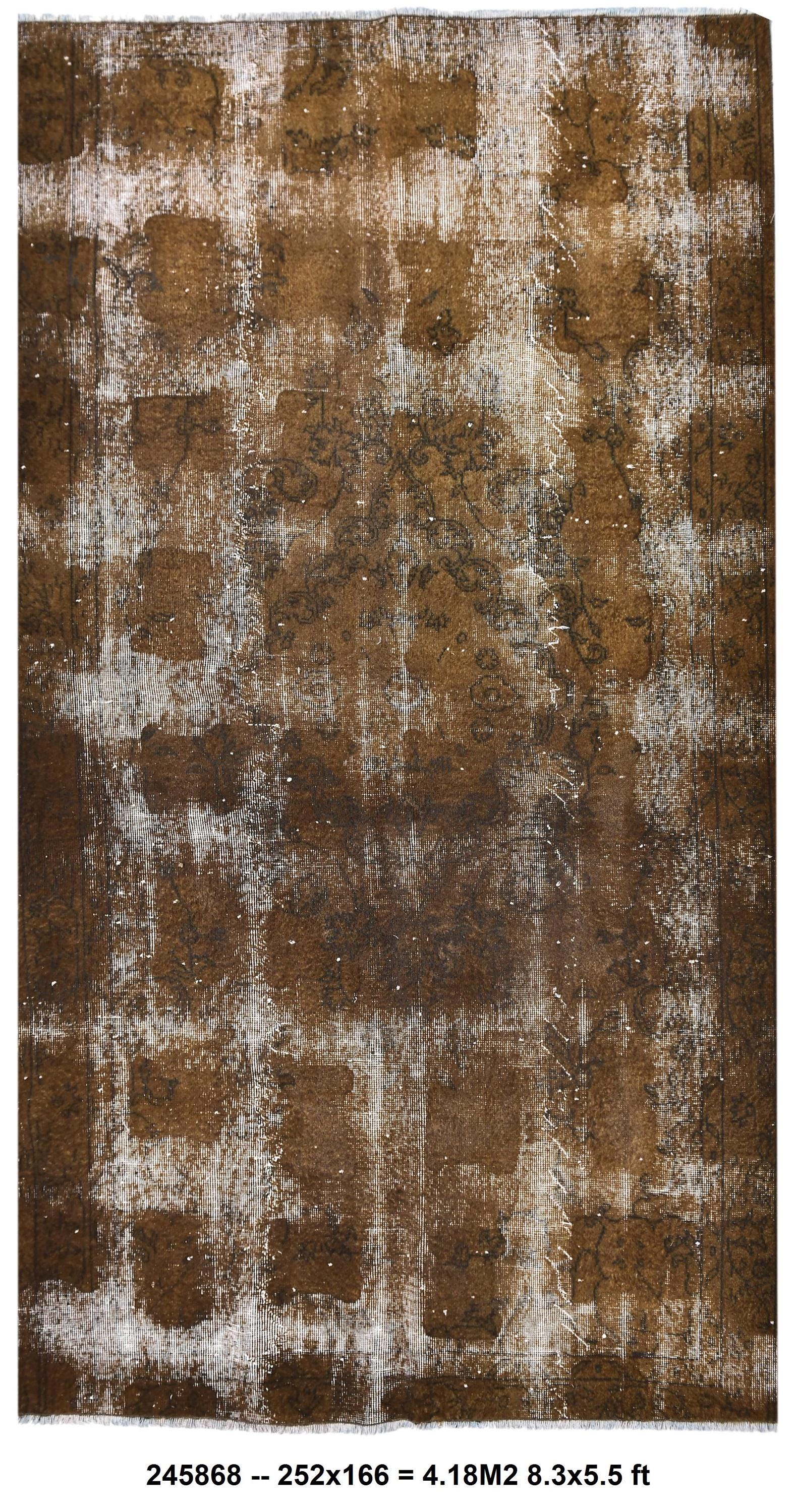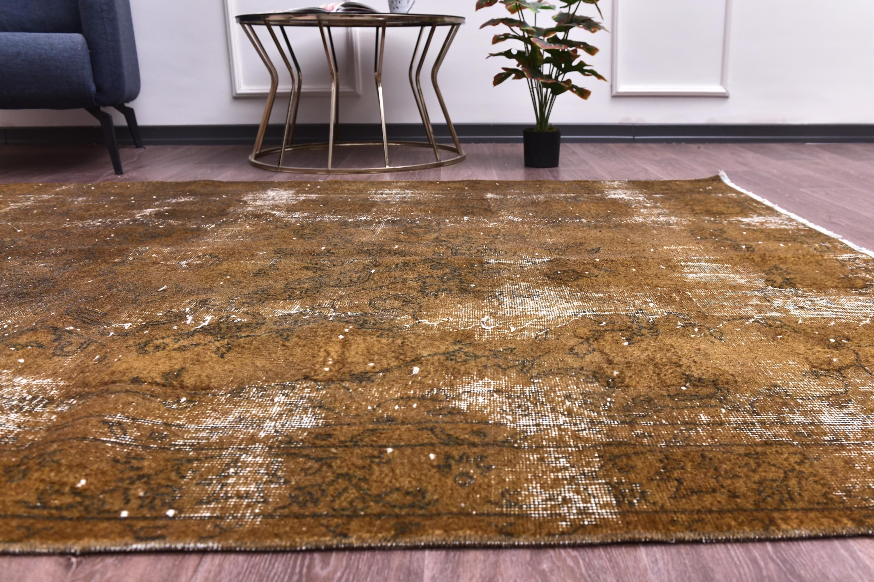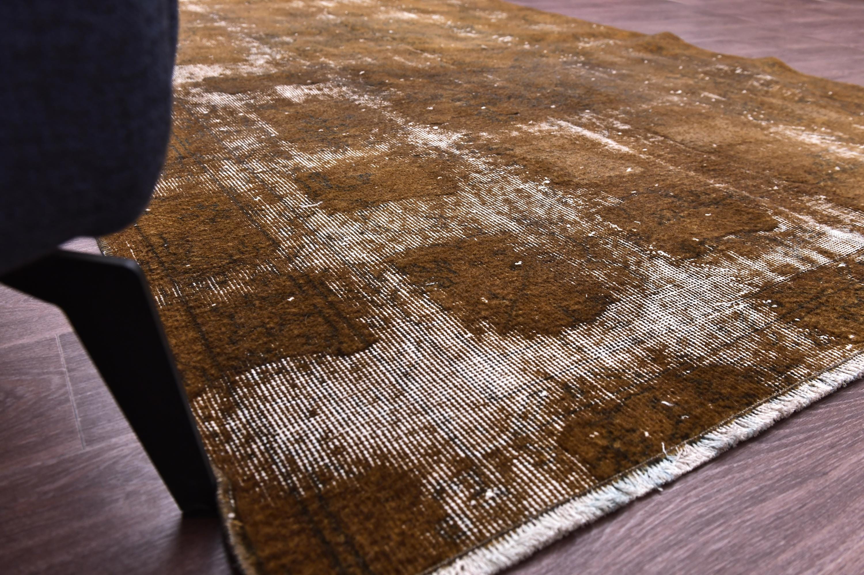📜📌 Vintage Turkish overdyed area rug featuring rich brown and beige tones with distressed floral medallion patterns throughout. Hand-knotted wool carpet with weathered appearance, cream-colored abrash effects, and traditional Oriental border design. Perfect for bohemian or eclectic interior spaces.