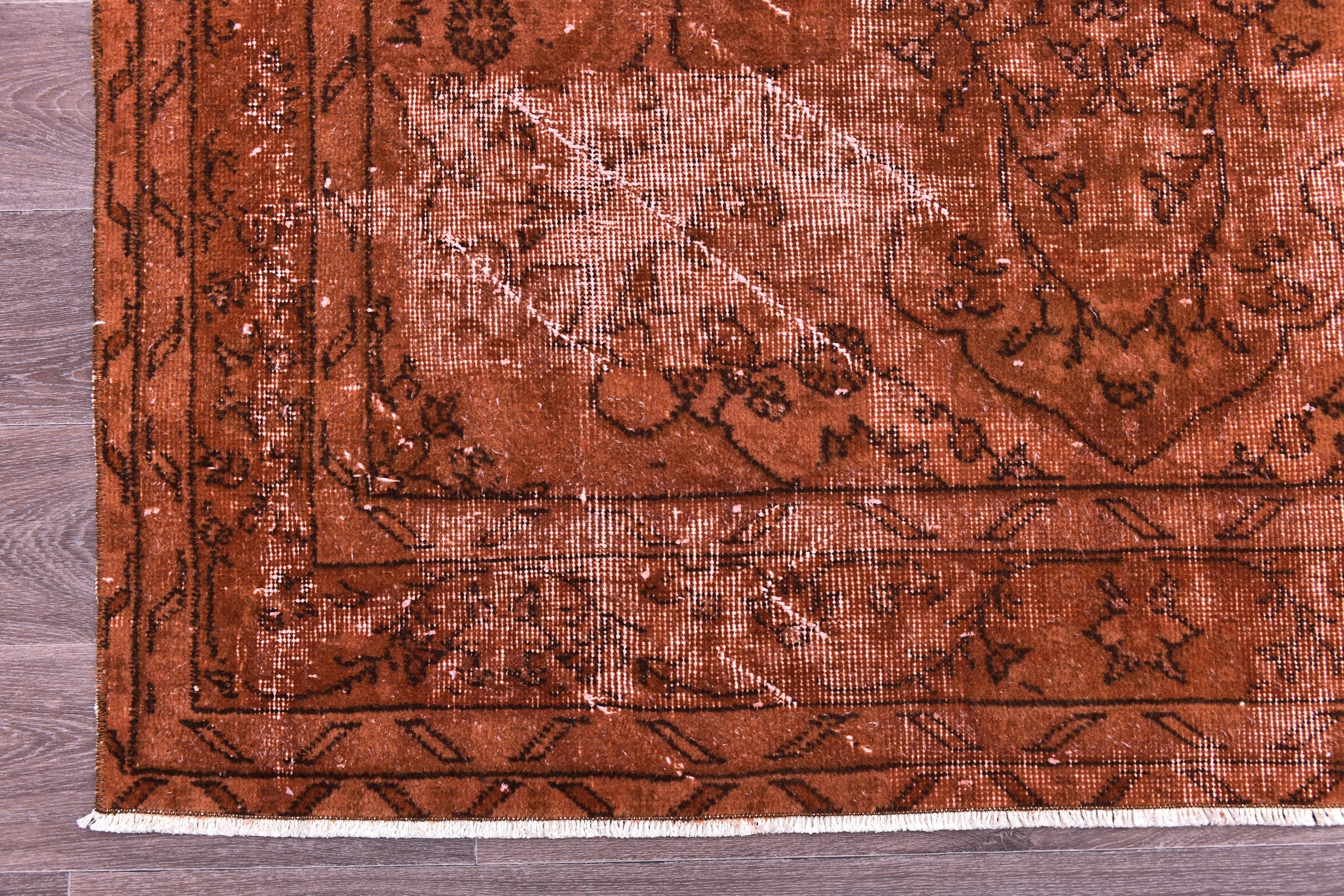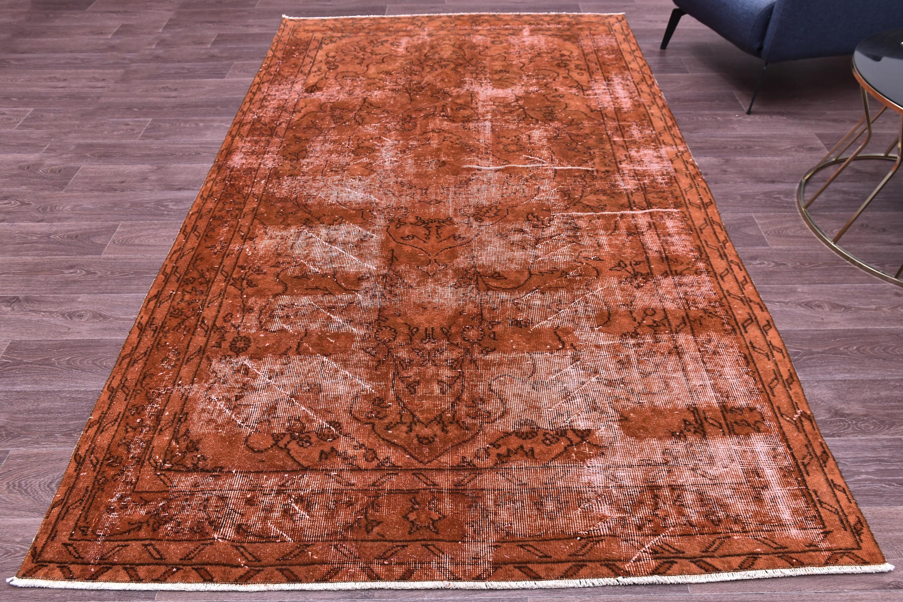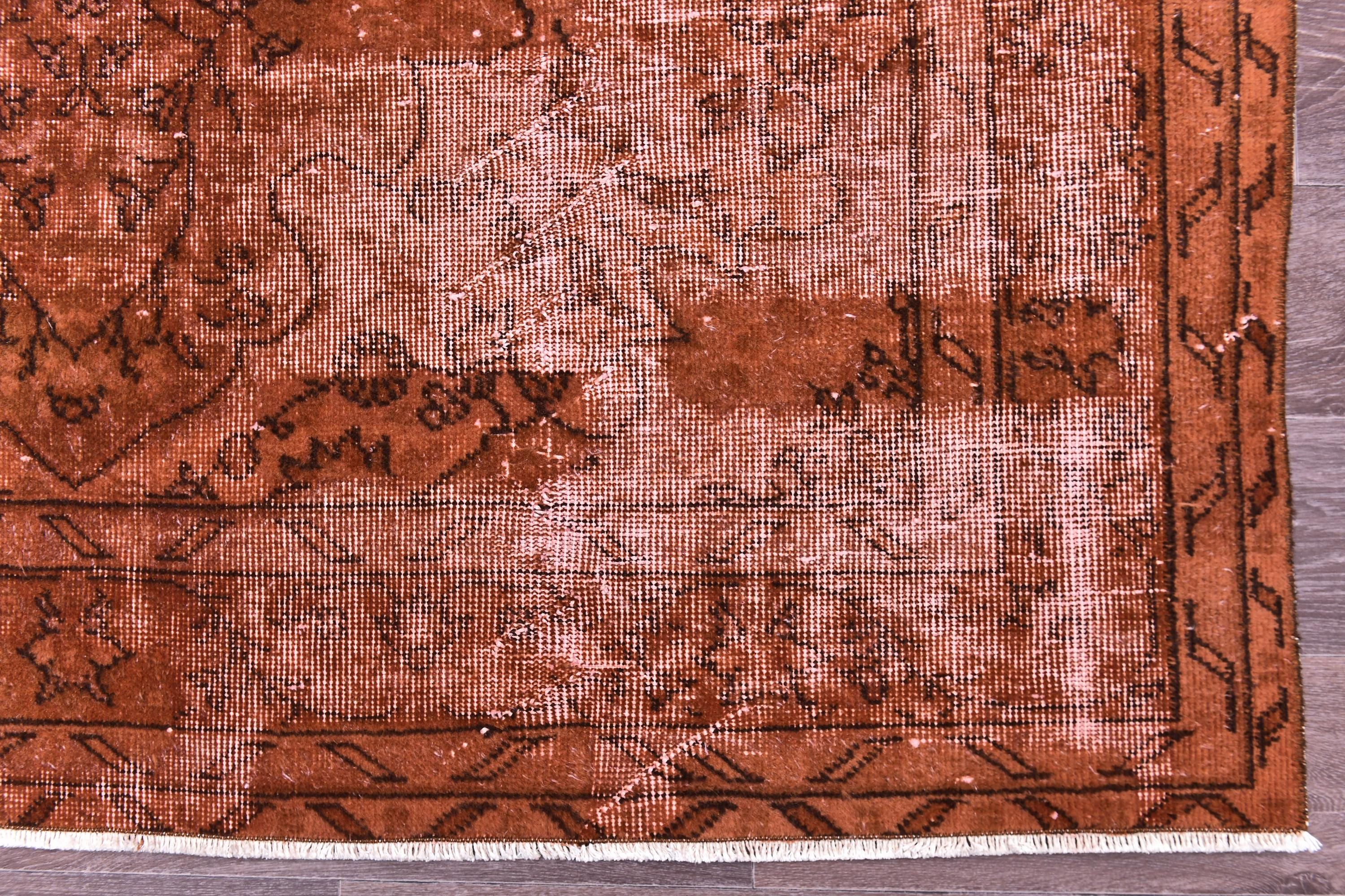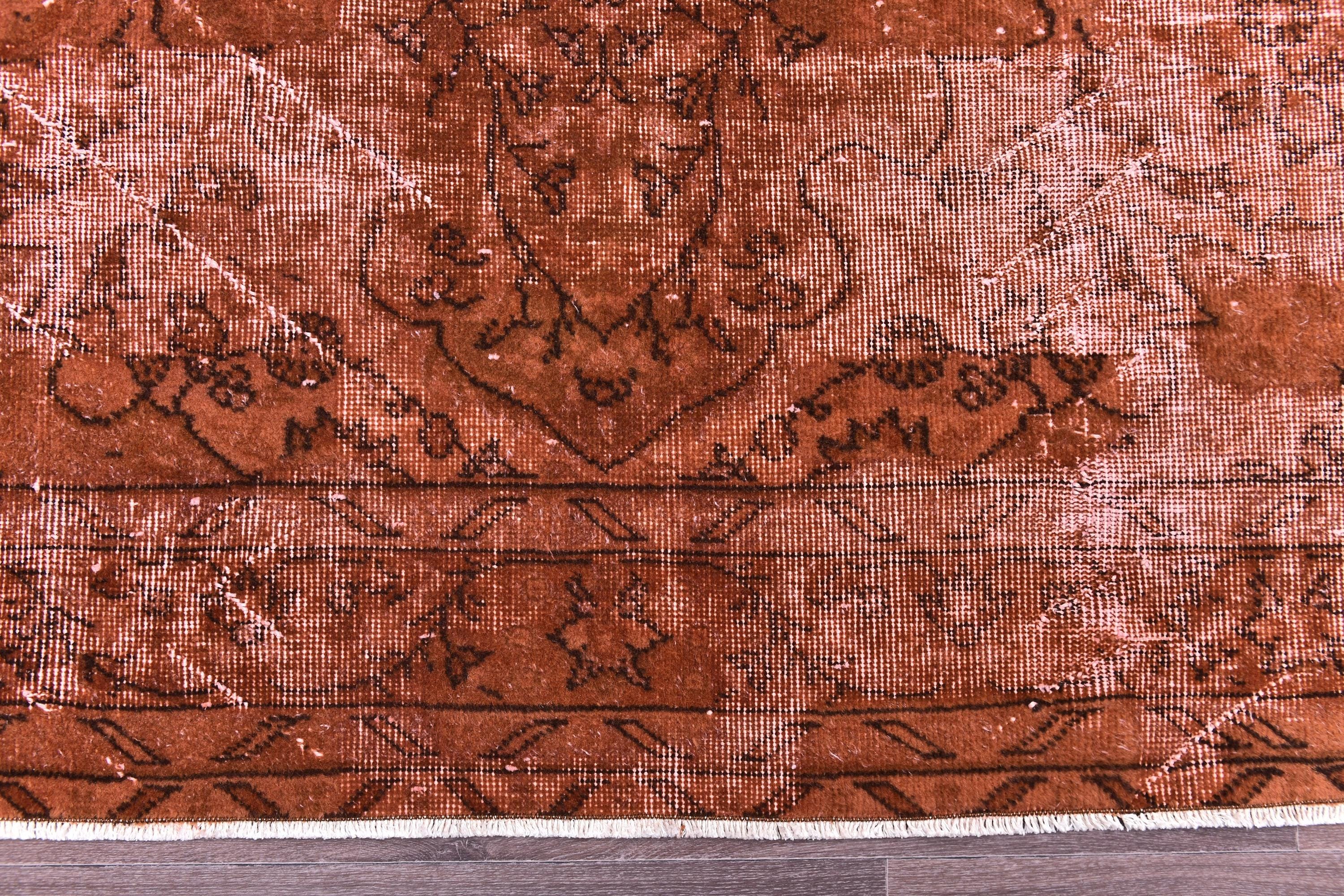 📜📌Overdyed vintage Turkish area rug in rich burnt terracotta and rust tones featuring distressed floral and botanical motifs. The hand-knotted wool rug displays intentional color saturation with faded ivory undertones showing through, multiple decorative borders, and traditional oriental patterns perfect for modern bohemian and eclectic interiors.