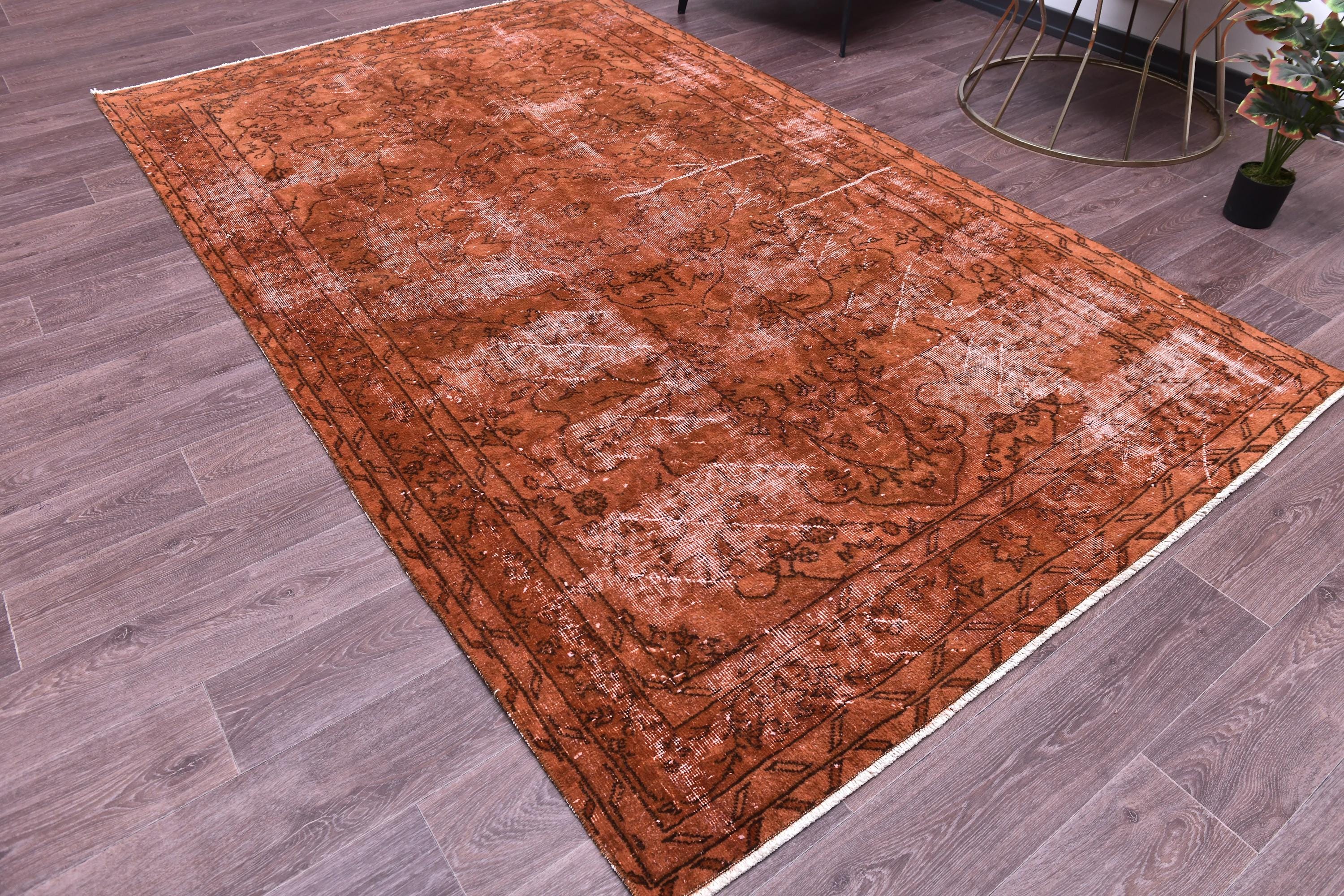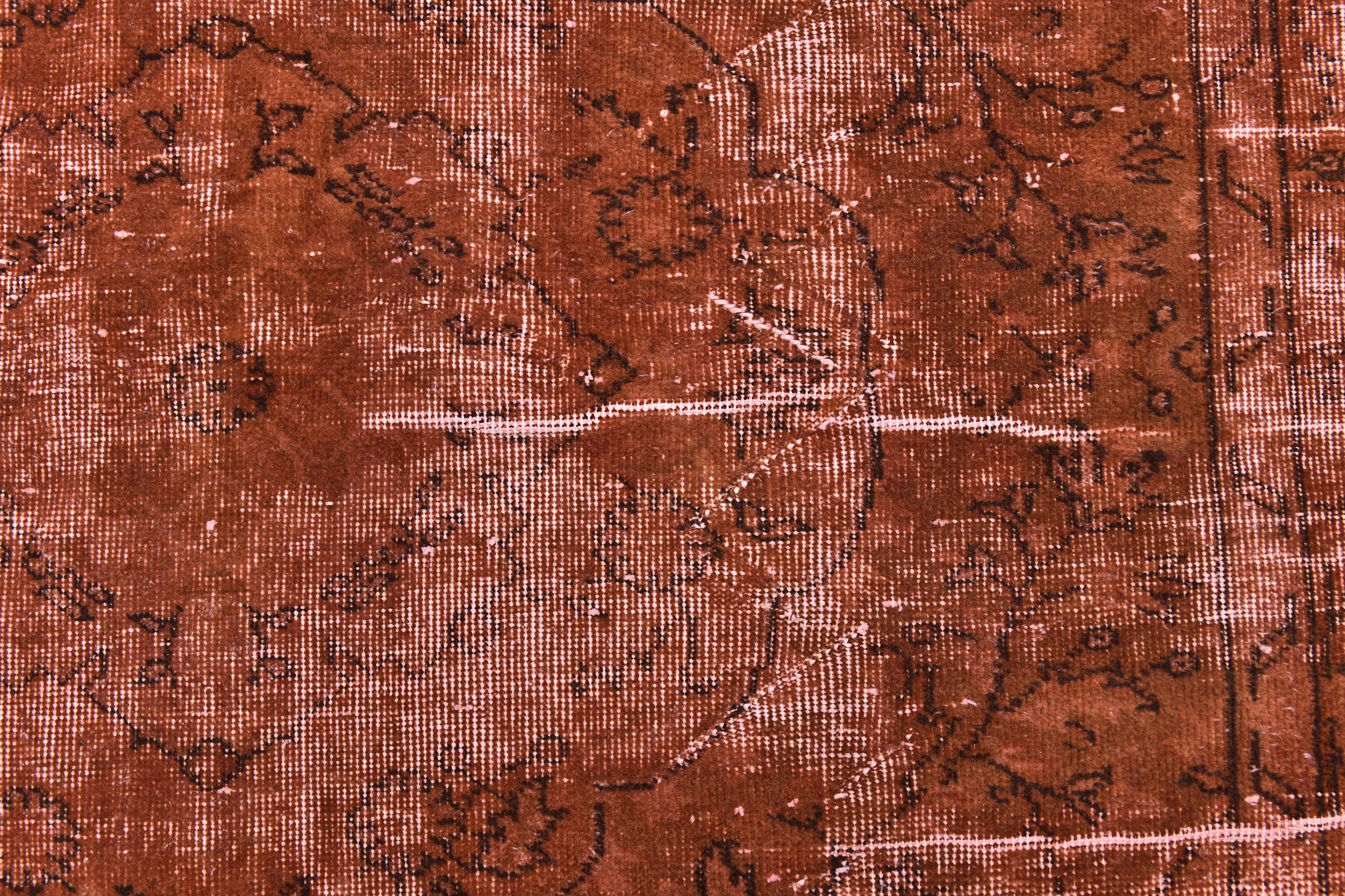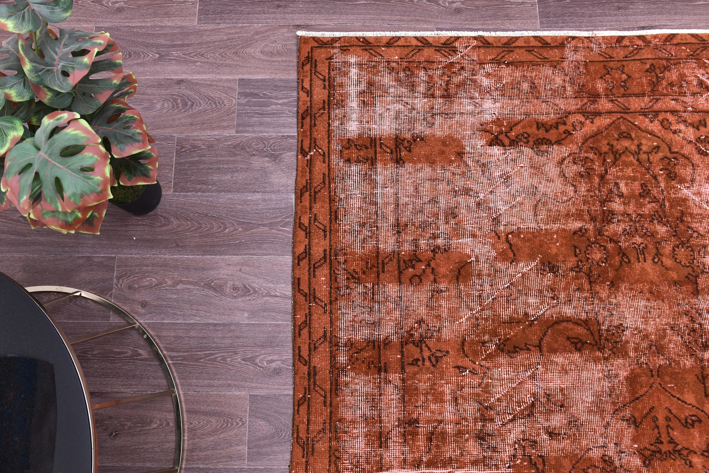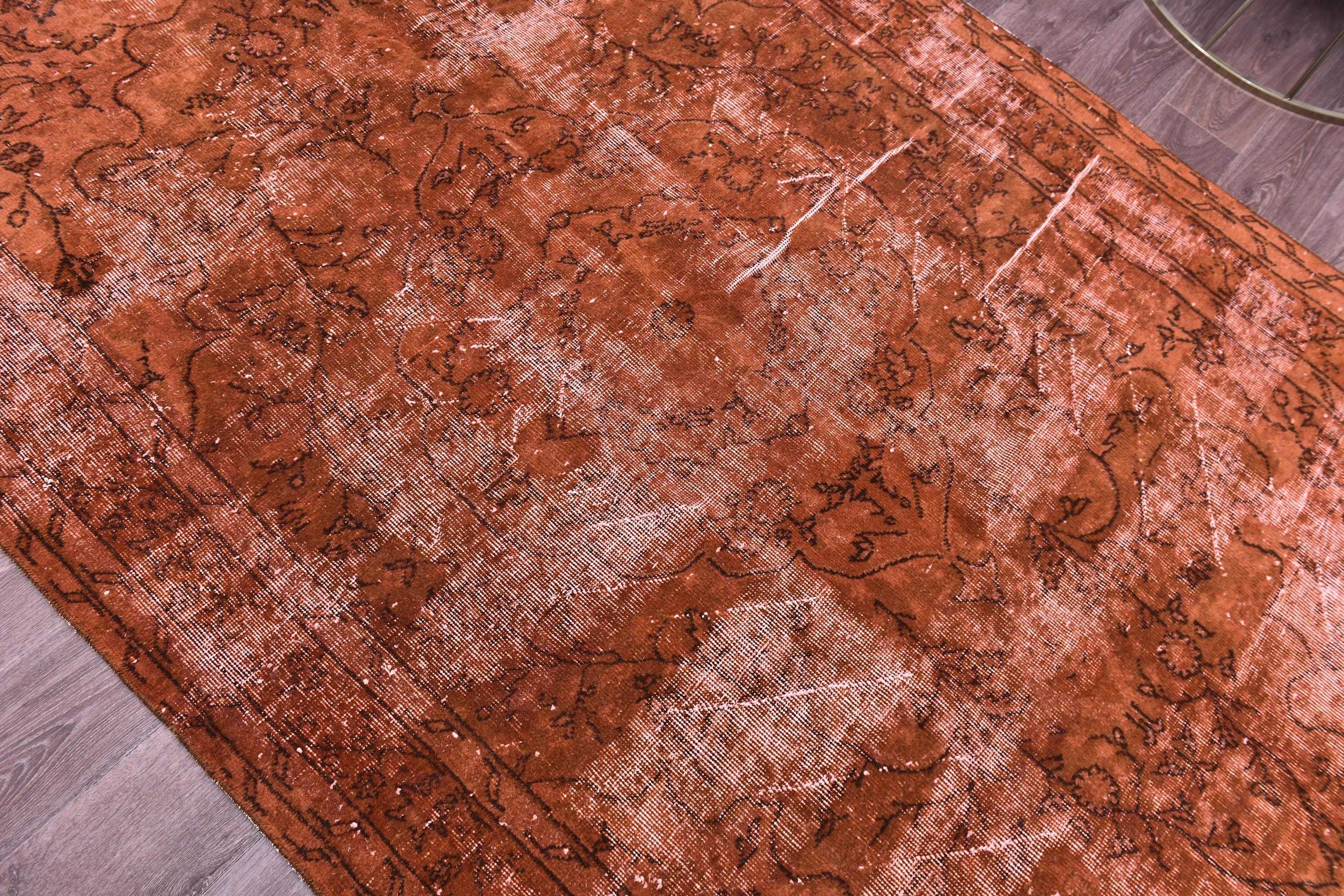 📜📌Overdyed vintage Turkish area rug in rich burnt terracotta and rust tones featuring distressed floral and botanical motifs. The hand-knotted wool rug displays intentional color saturation with faded ivory undertones showing through, multiple decorative borders, and traditional oriental patterns perfect for modern bohemian and eclectic interiors.