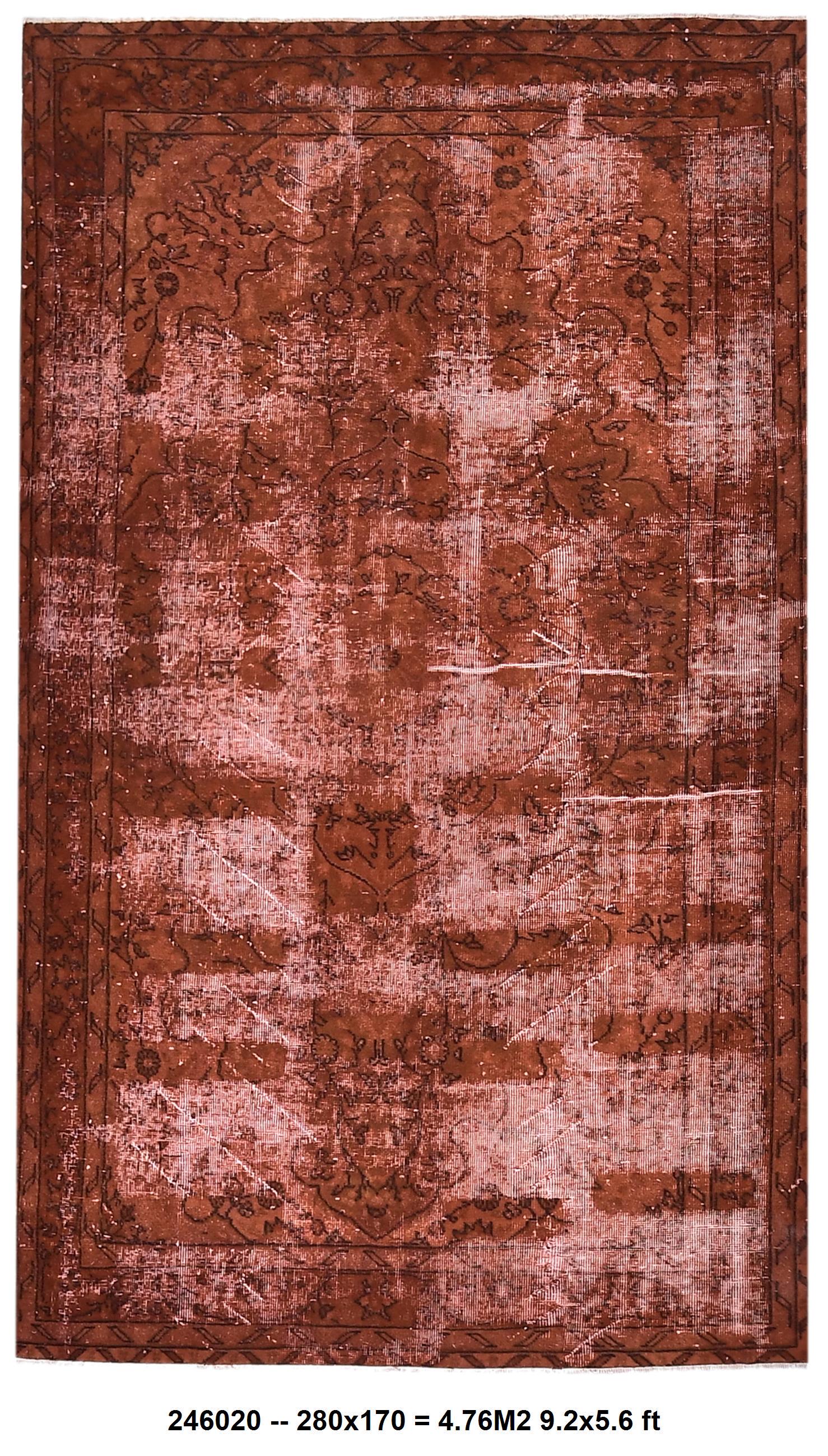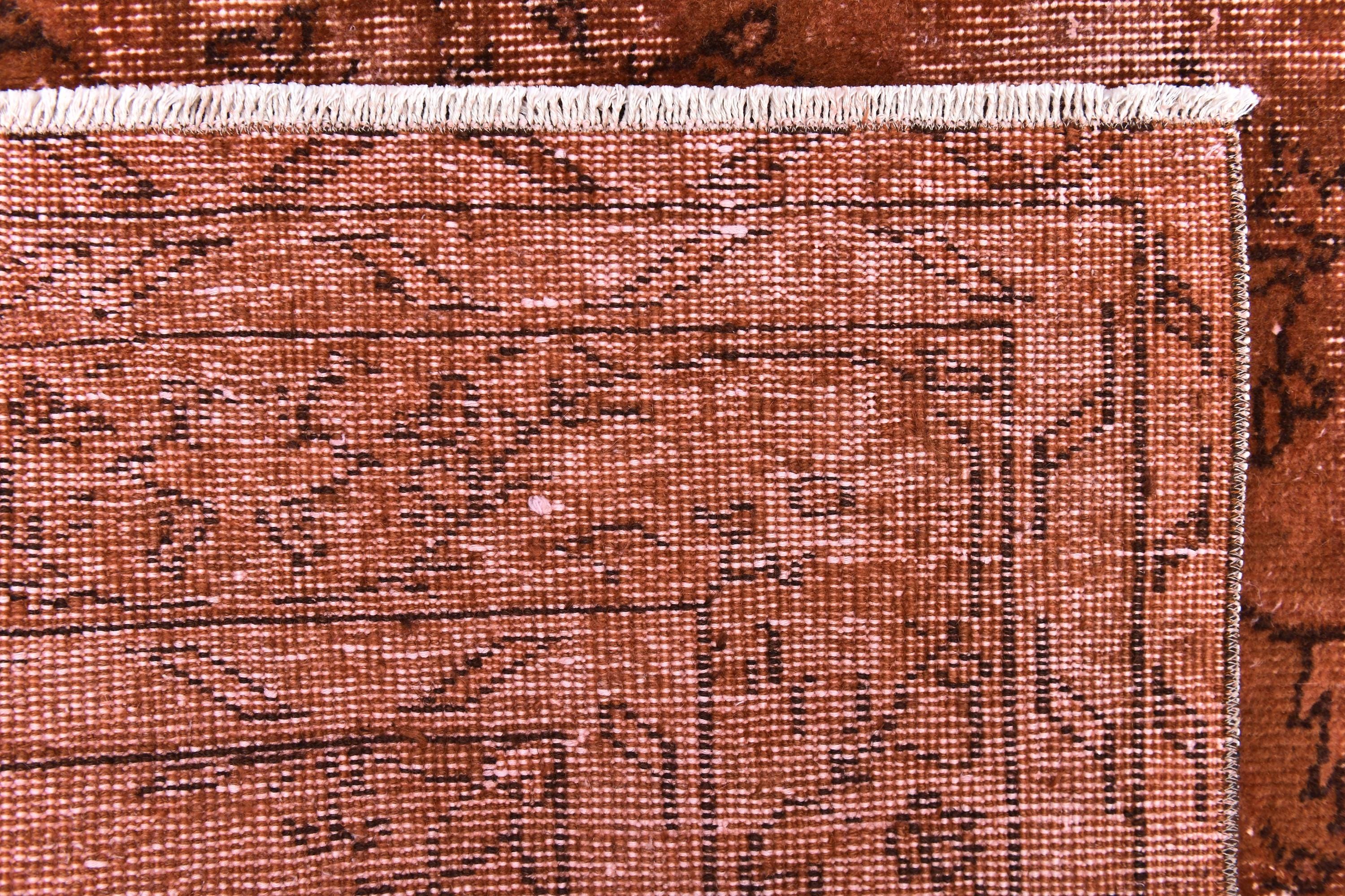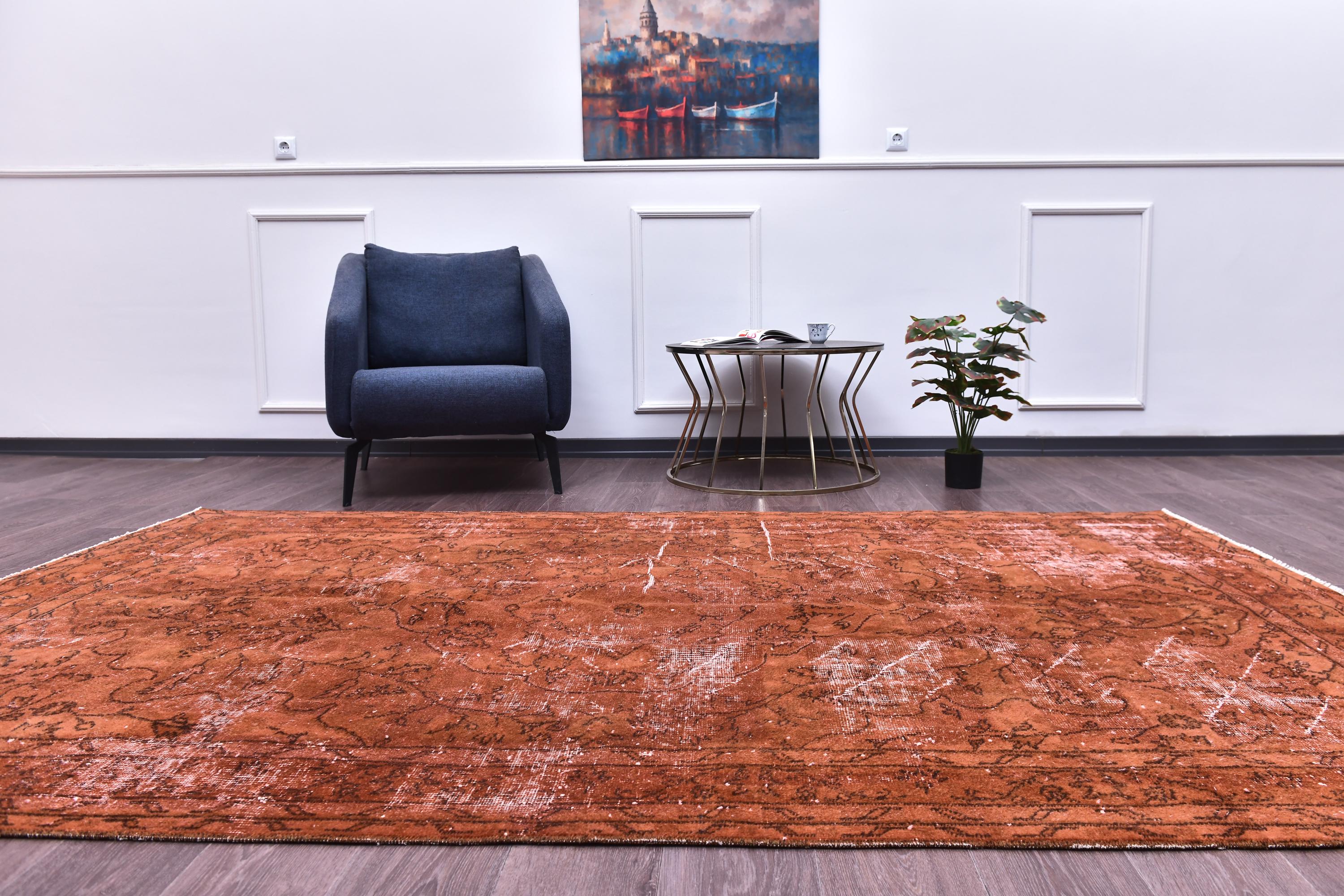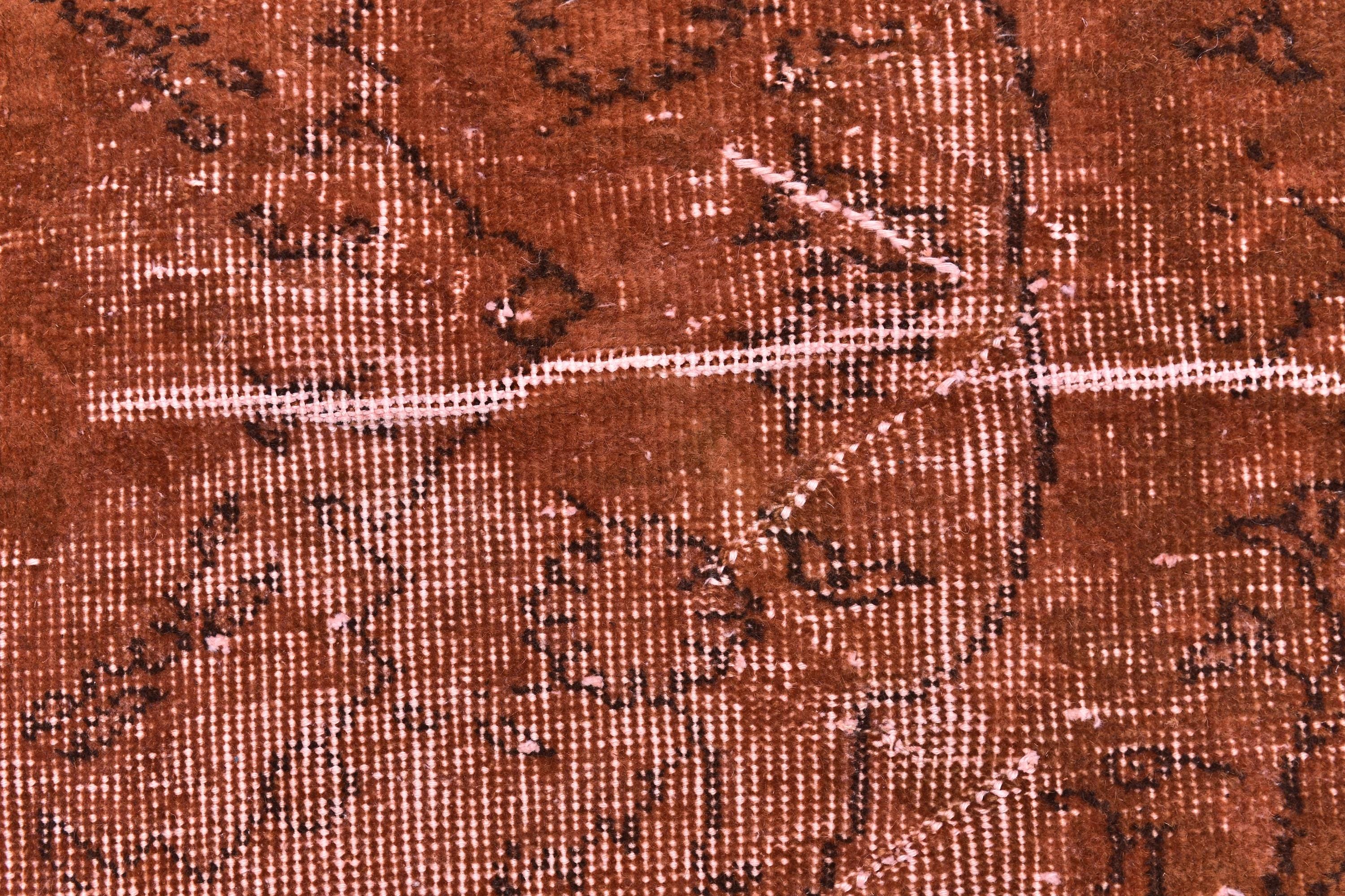 📜📌Overdyed vintage Turkish area rug in rich burnt terracotta and rust tones featuring distressed floral and botanical motifs. The hand-knotted wool rug displays intentional color saturation with faded ivory undertones showing through, multiple decorative borders, and traditional oriental patterns perfect for modern bohemian and eclectic interiors.