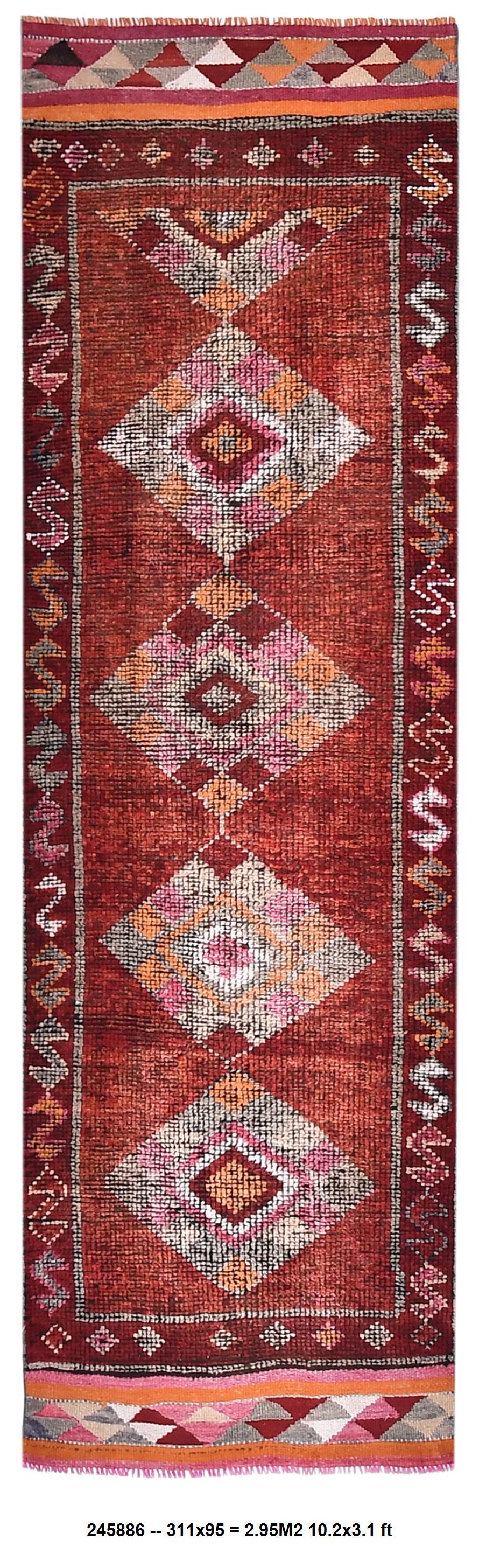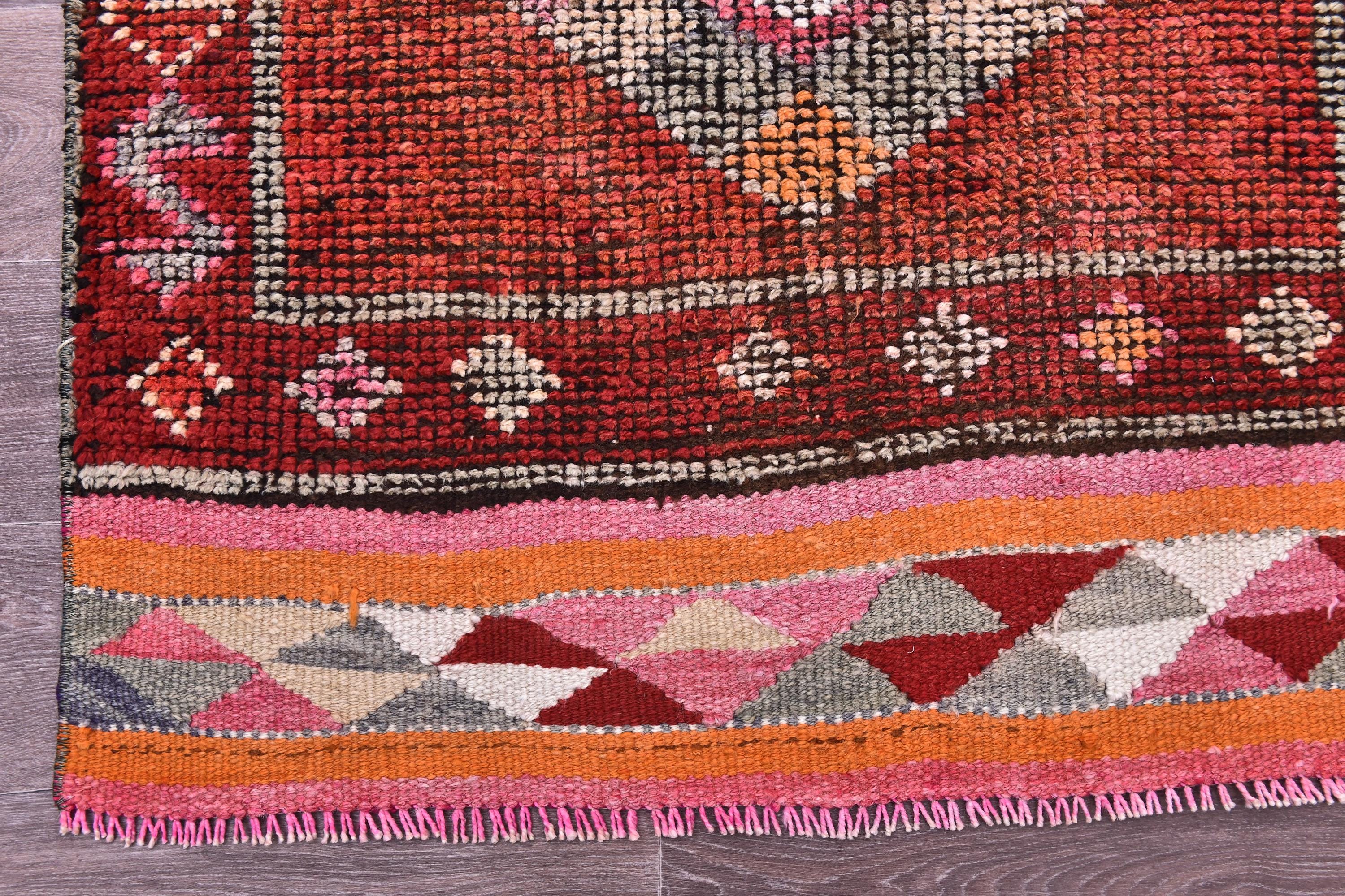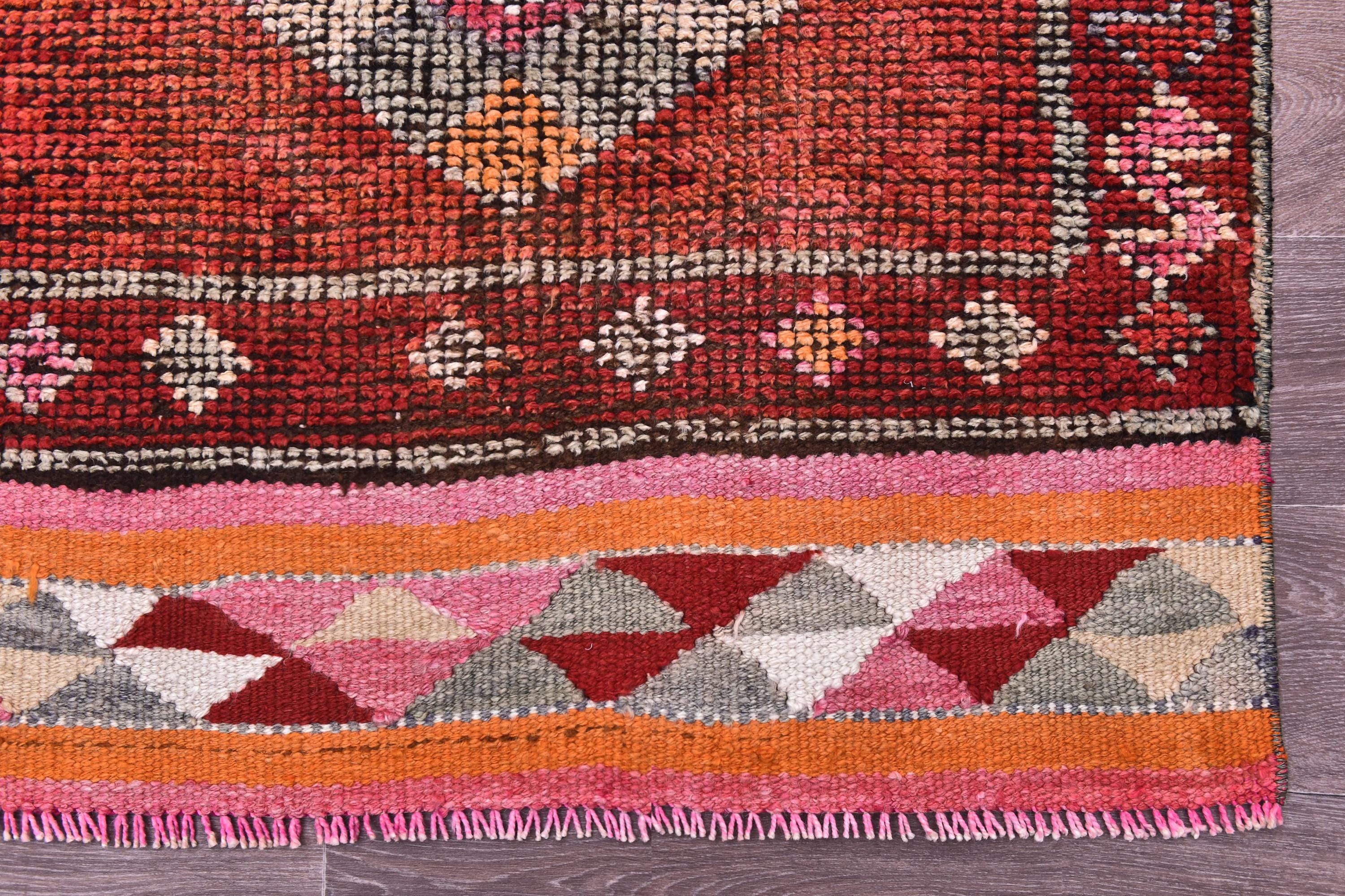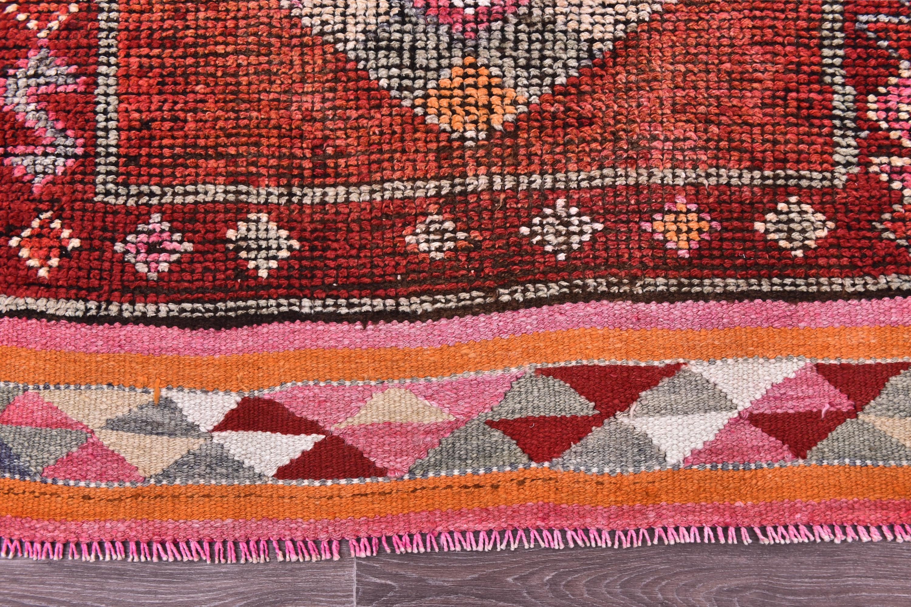 📜📌 Vintage Turkish runner rug featuring rich rust red base with three large geometric diamond medallions in cream, sage green, and coral accents. Hand-knotted wool runner displays traditional tribal motifs with colorful kilim-style end panel showing diamond patterns in pink, orange, and cream. Perfect for hallways, kitchens, or narrow spaces.
