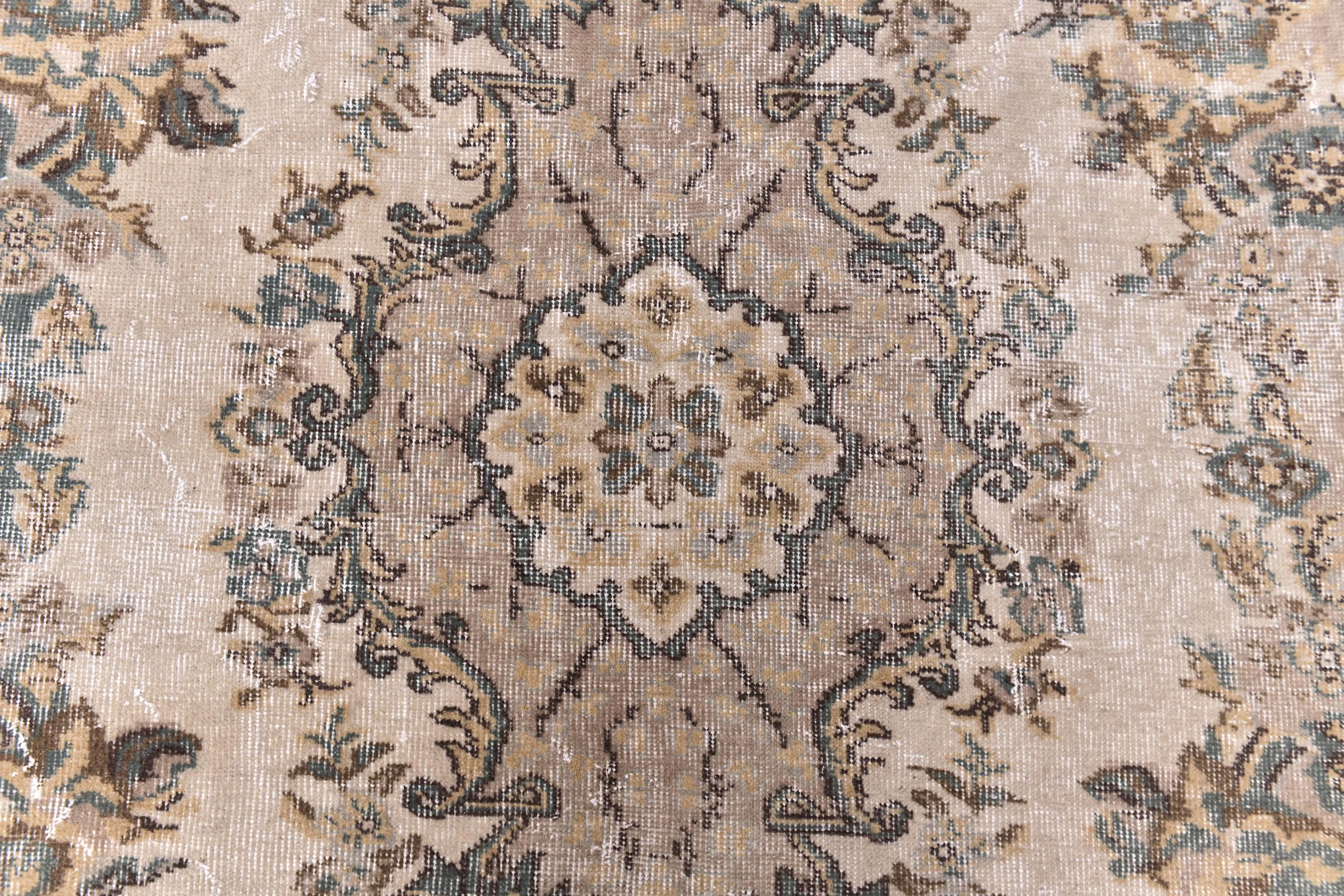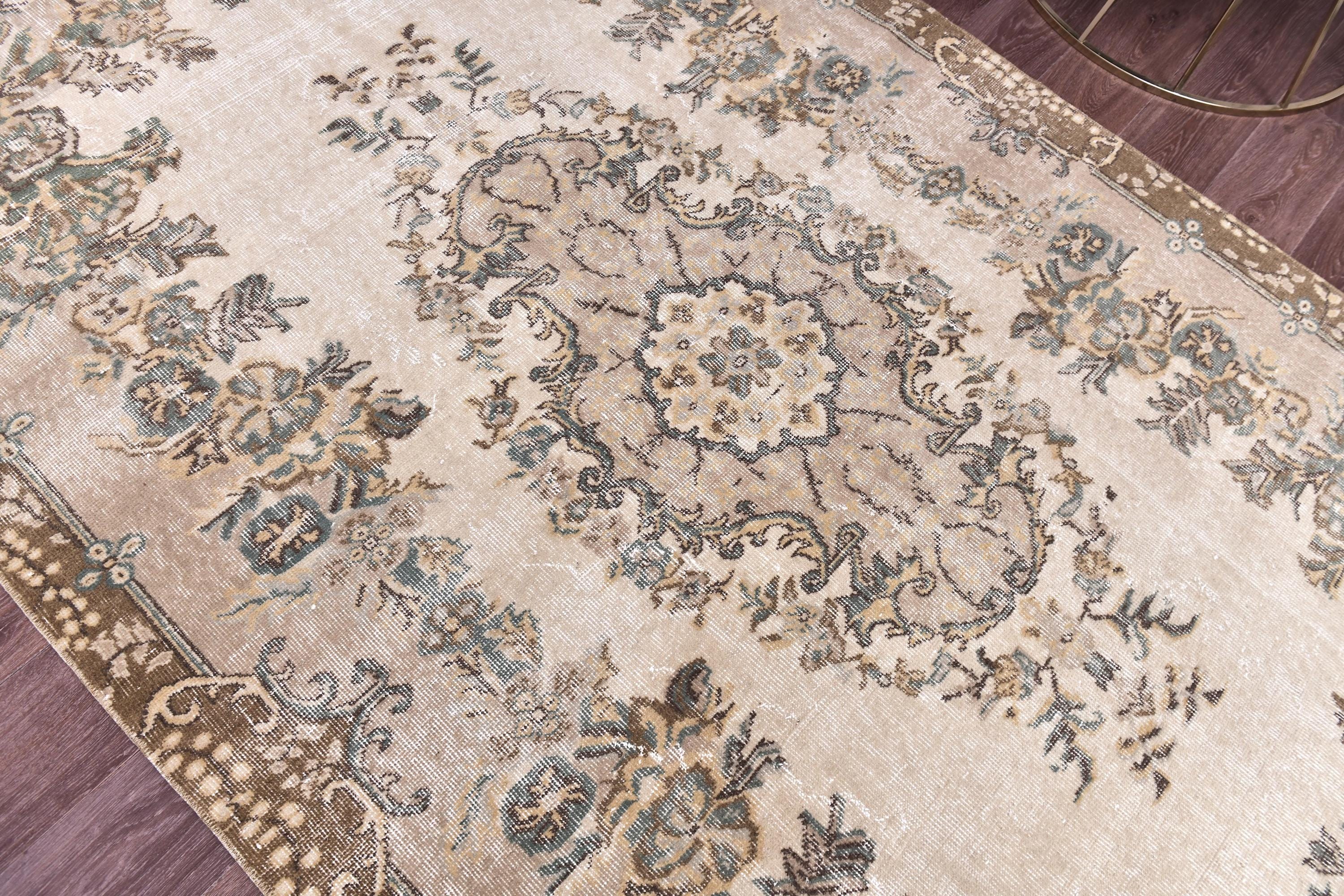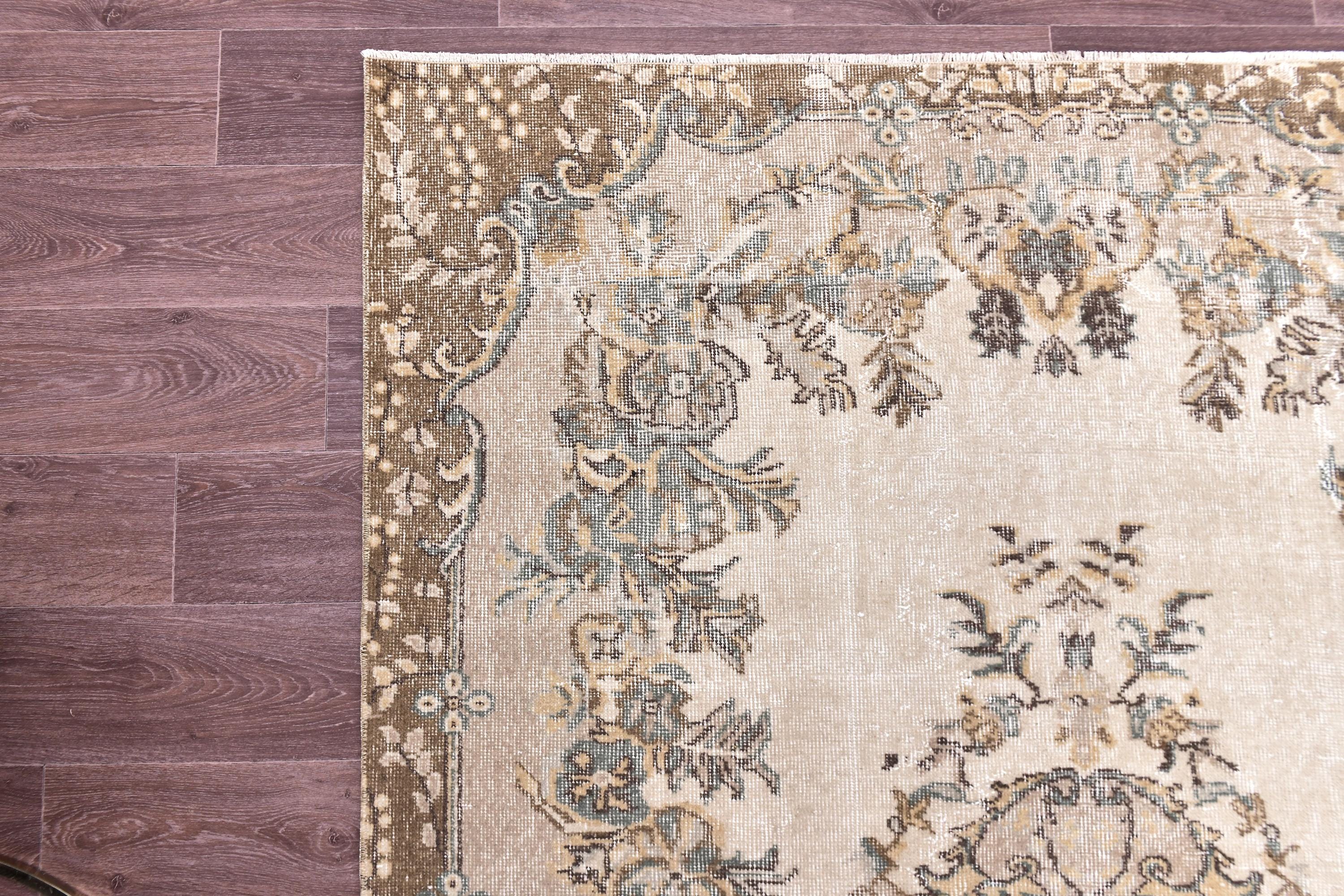 📜📌 Vintage Turkish Oushak area rug featuring soft neutral beige and cream base with central floral medallion design in faded blue-gray and taupe tones. Hand-knotted wool rug displays distressed appearance with delicate botanical motifs, ornate borders, and traditional oriental patterns. Low pile construction perfect for elegant living rooms and transitional interiors.