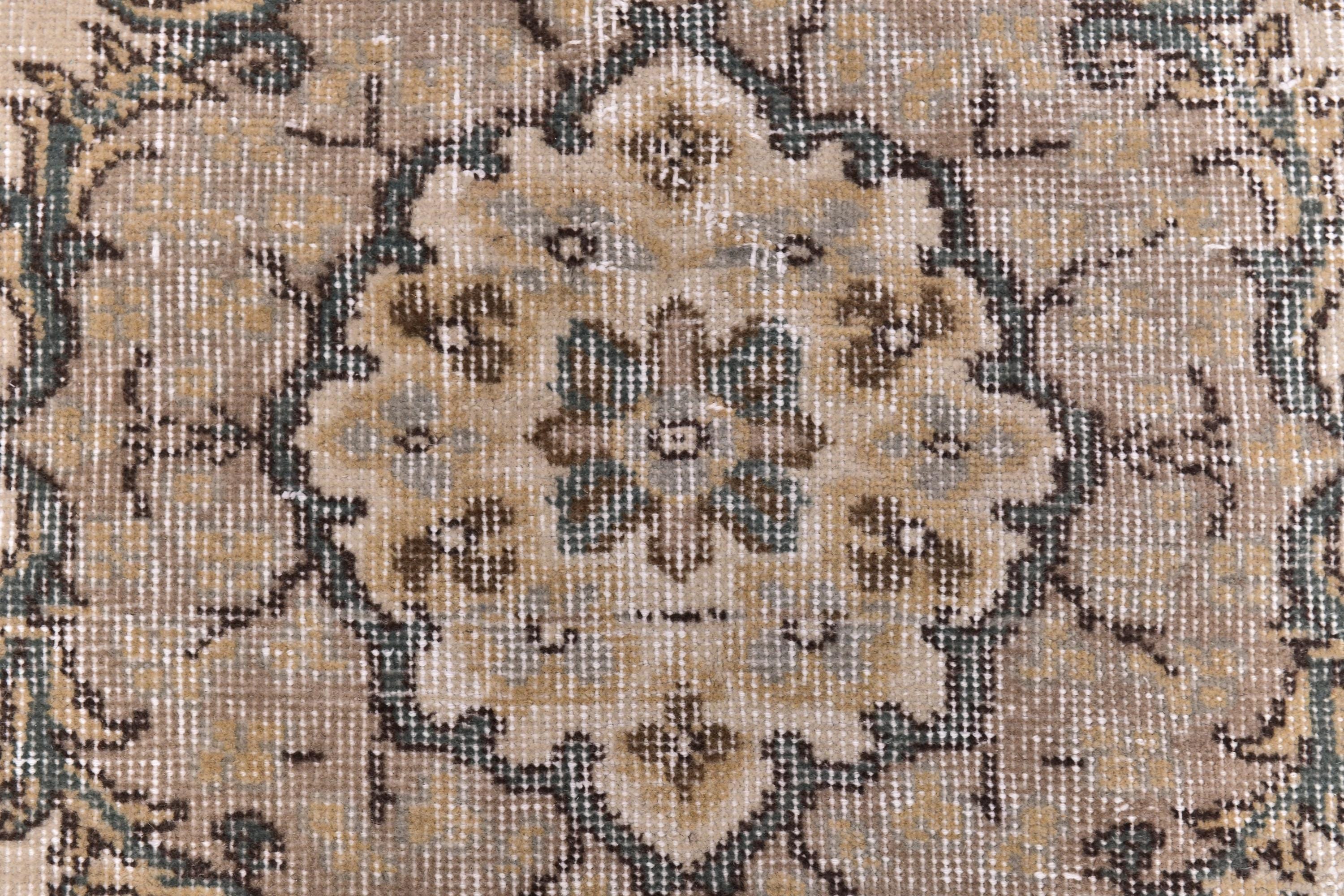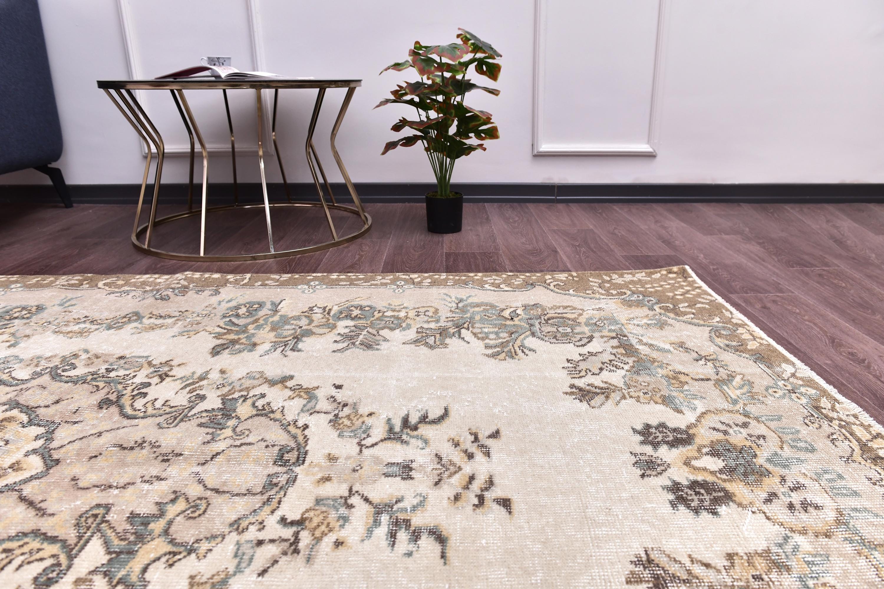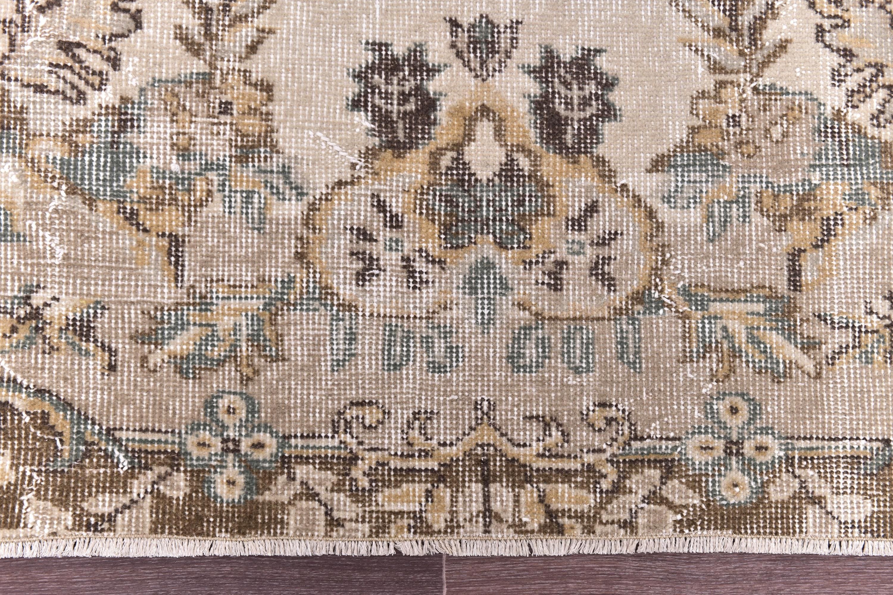 📜📌 Vintage Turkish Oushak area rug featuring soft neutral beige and cream base with central floral medallion design in faded blue-gray and taupe tones. Hand-knotted wool rug displays distressed appearance with delicate botanical motifs, ornate borders, and traditional oriental patterns. Low pile construction perfect for elegant living rooms and transitional interiors.