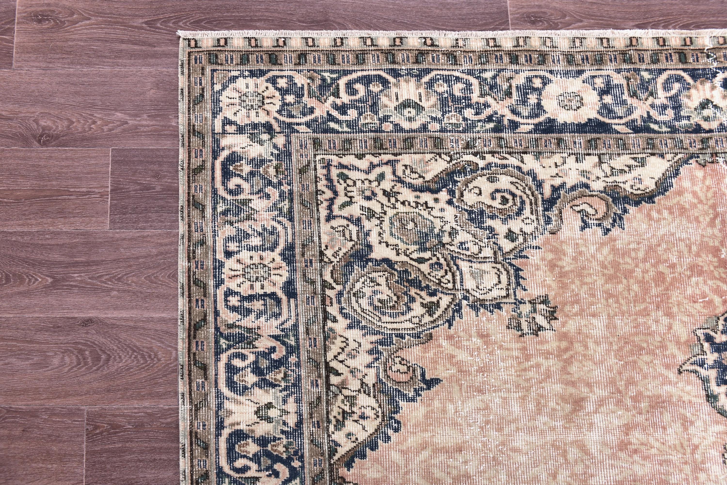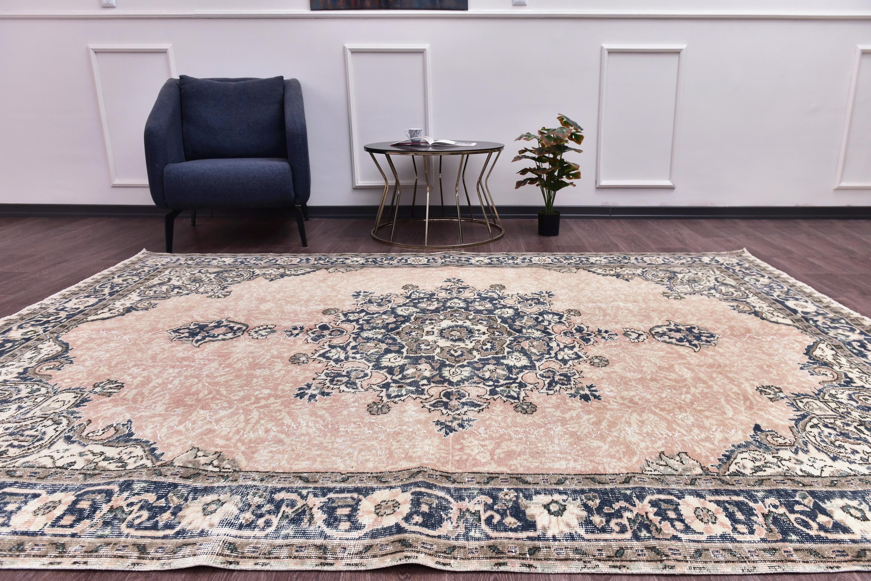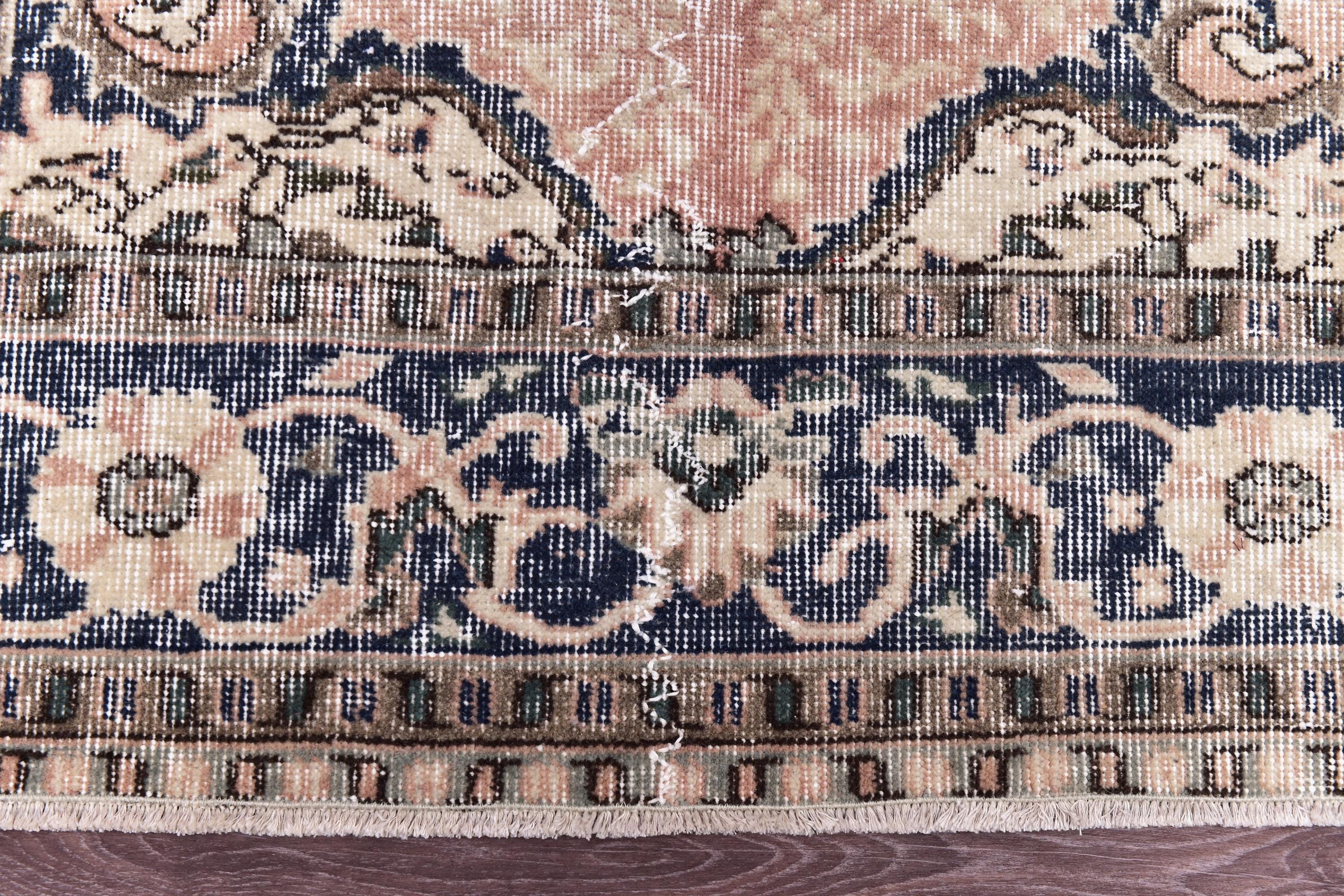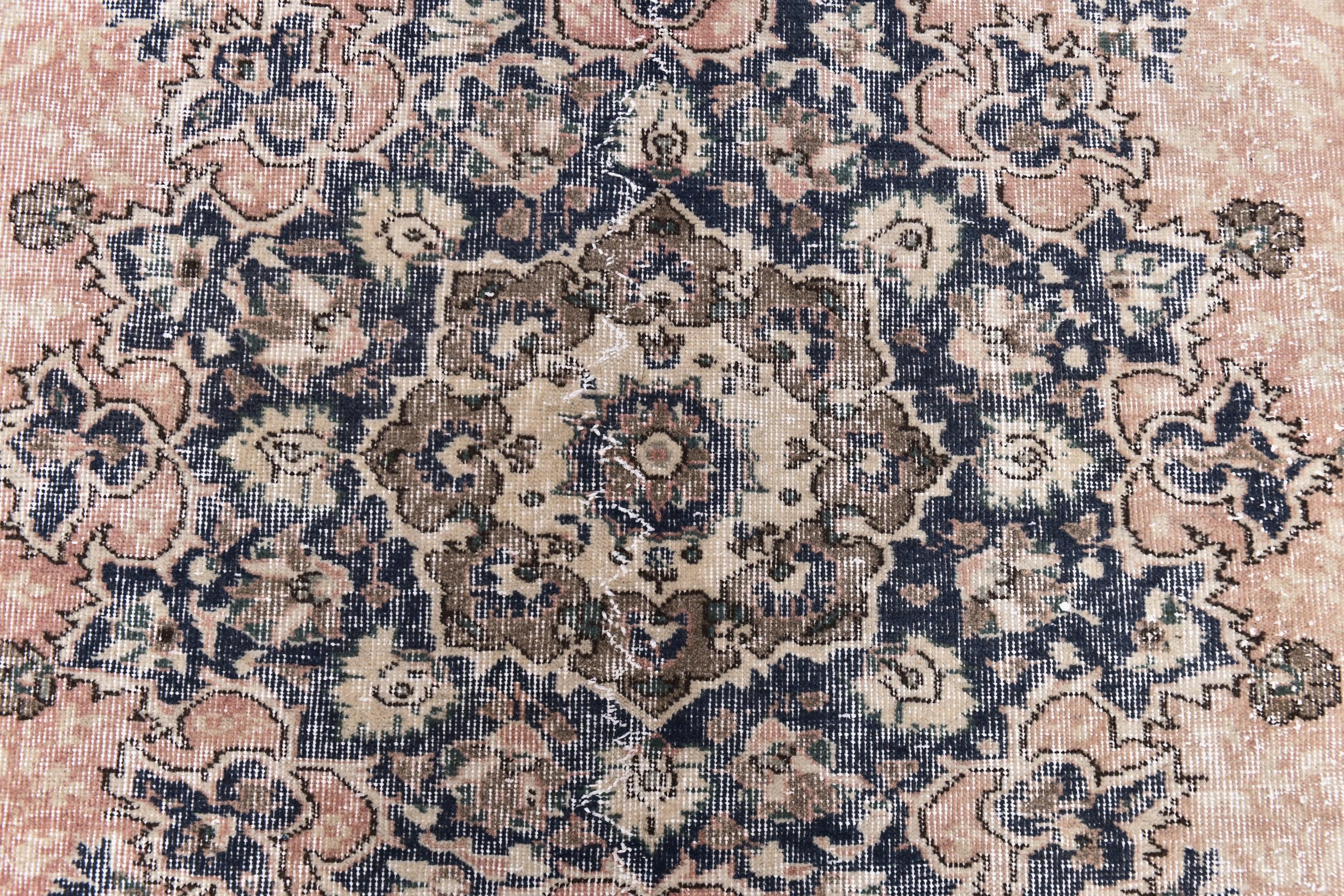 📜📌📌 Distressed vintage area rug in romantic blush pink palette showcasing large navy blue floral medallion surrounded by scattered flower sprays and corner spandrels. Hand-knotted Turkish carpet features peachy-pink to cream gradient with intricate navy and cream decorative borders and authentic worn patina. Elegant color combination ideal for feminine and transitional decor styles.