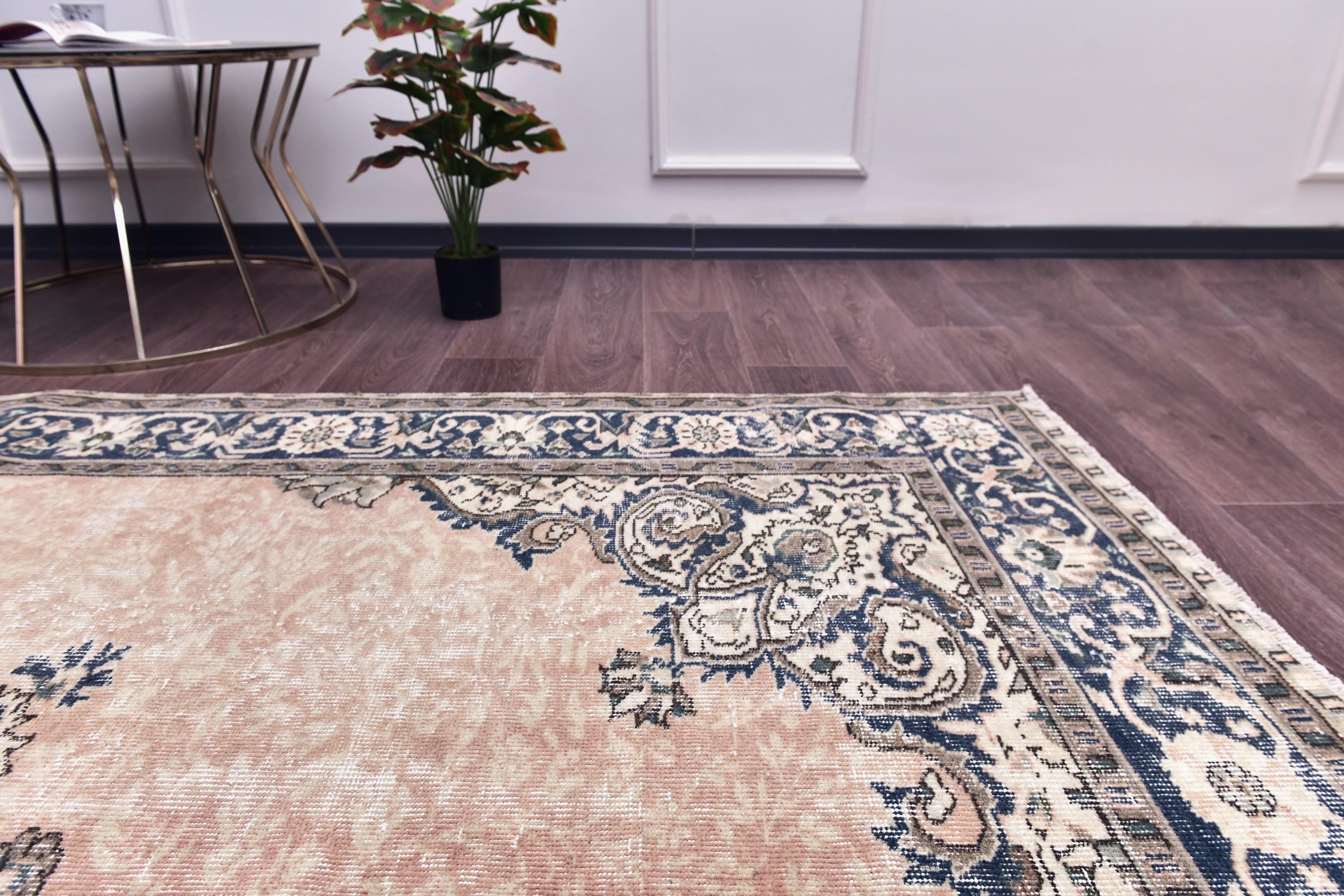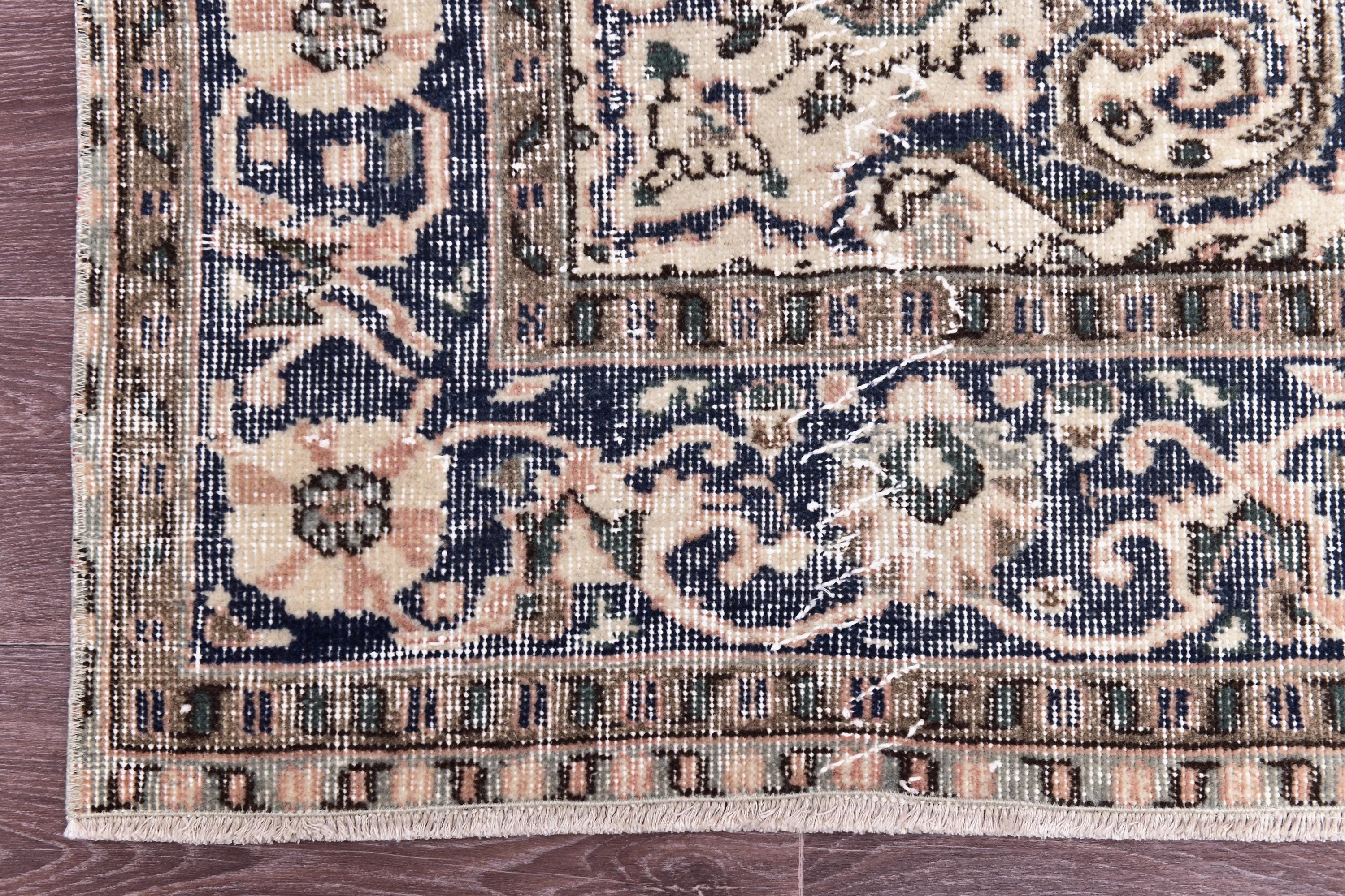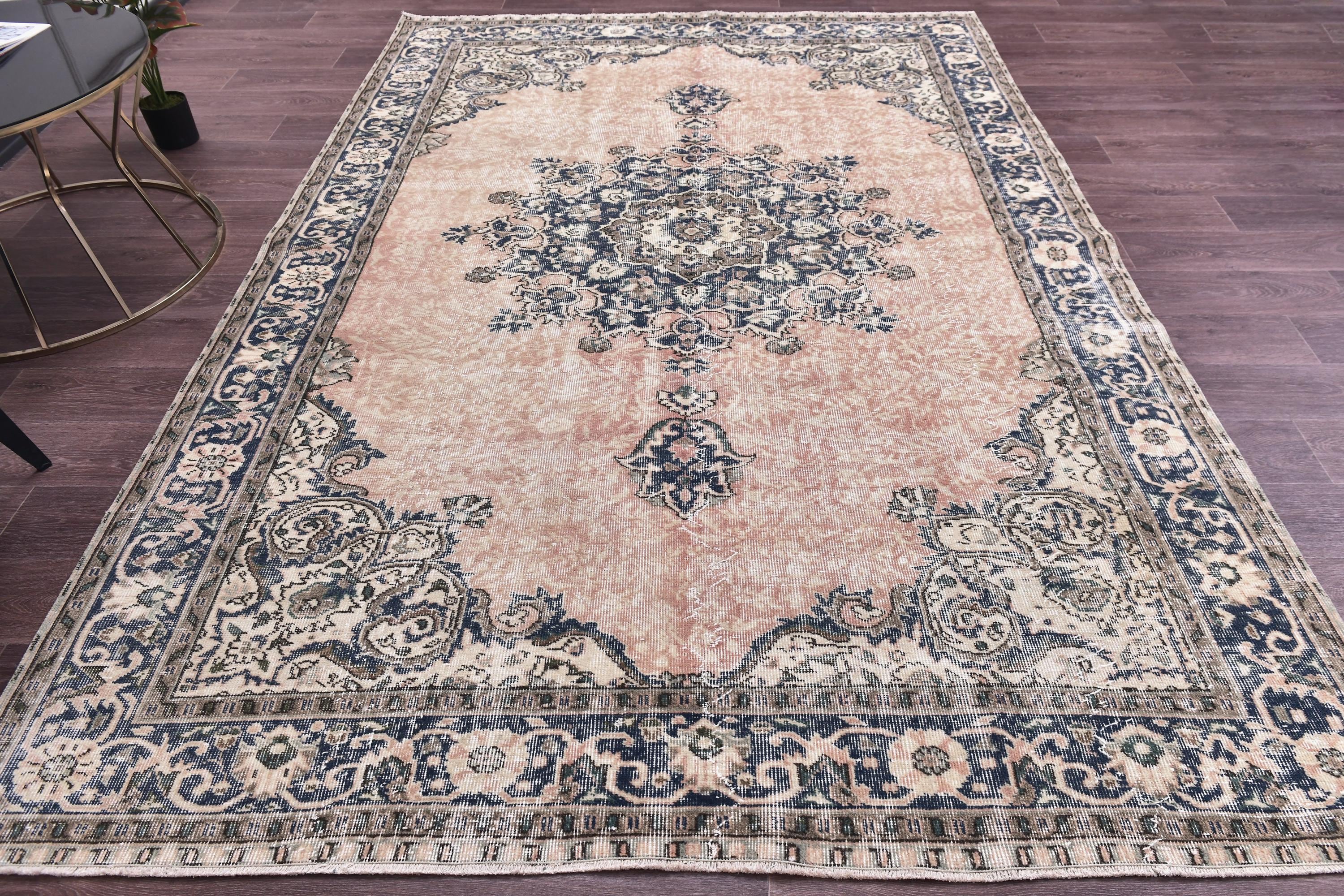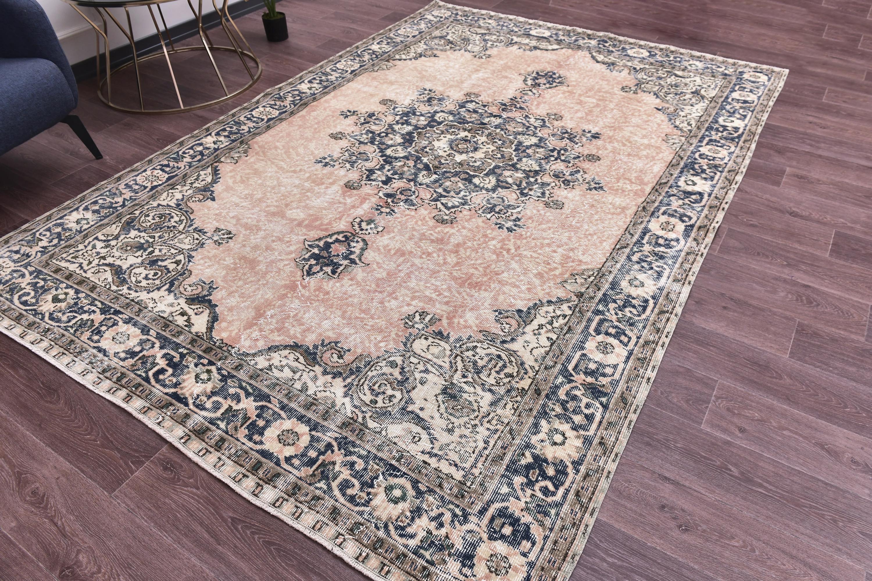 📜📌📌 Distressed vintage area rug in romantic blush pink palette showcasing large navy blue floral medallion surrounded by scattered flower sprays and corner spandrels. Hand-knotted Turkish carpet features peachy-pink to cream gradient with intricate navy and cream decorative borders and authentic worn patina. Elegant color combination ideal for feminine and transitional decor styles.