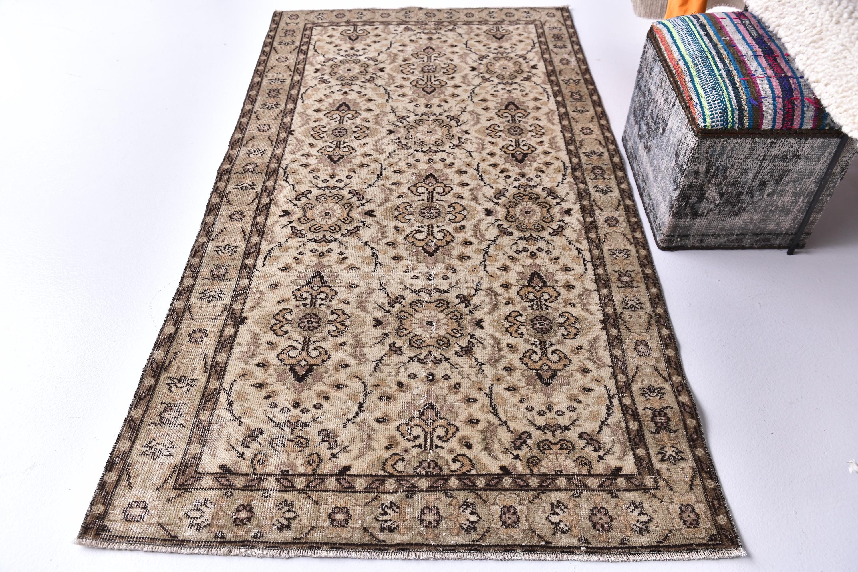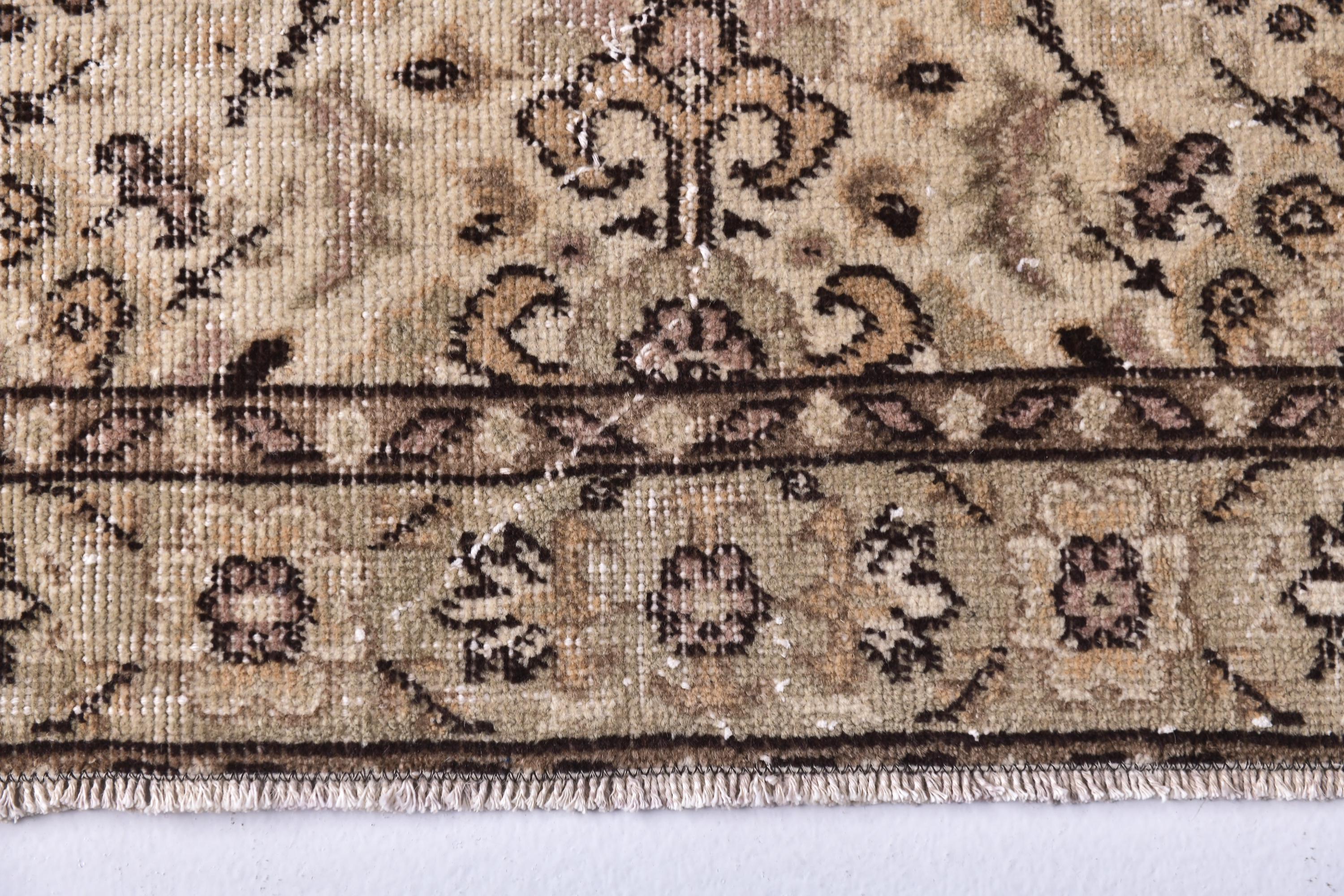 📜📌 Antique Turkish Accent area rug with worn vintage aesthetic showing soft brown and cream Color. Hand-woven wool carpet with distressed finish, visible weave texture, and symmetrical design in muted tones including rose, burgundy, cream, and charcoal with elegant corner motifs.