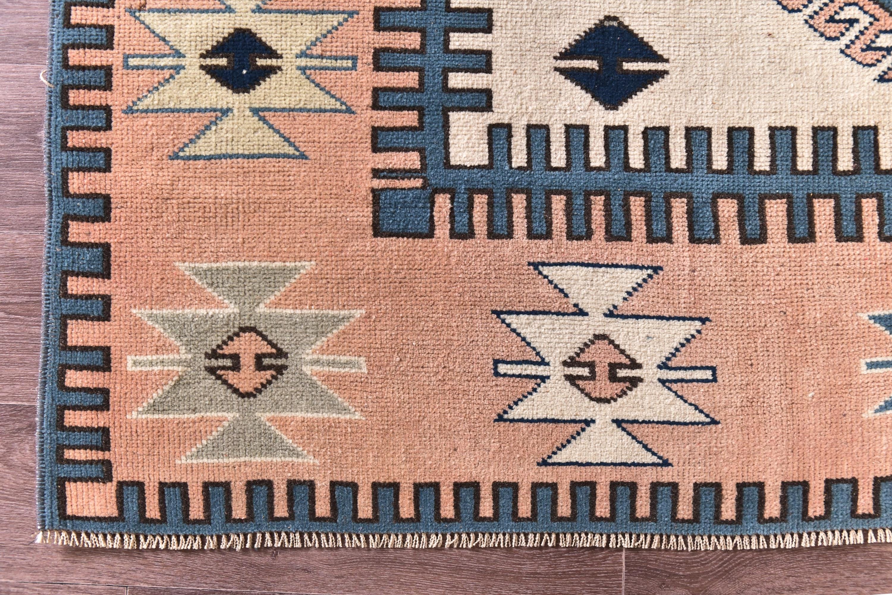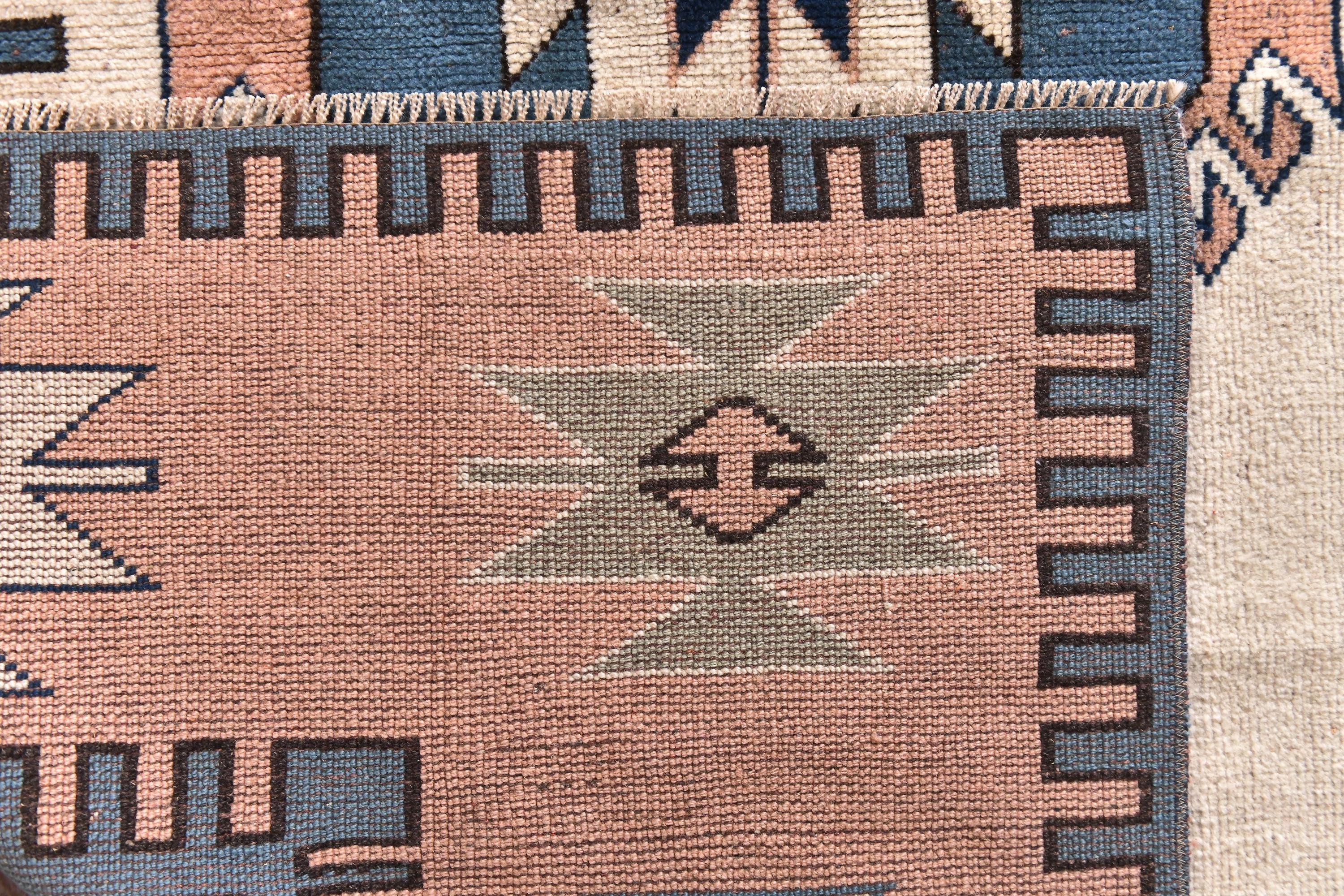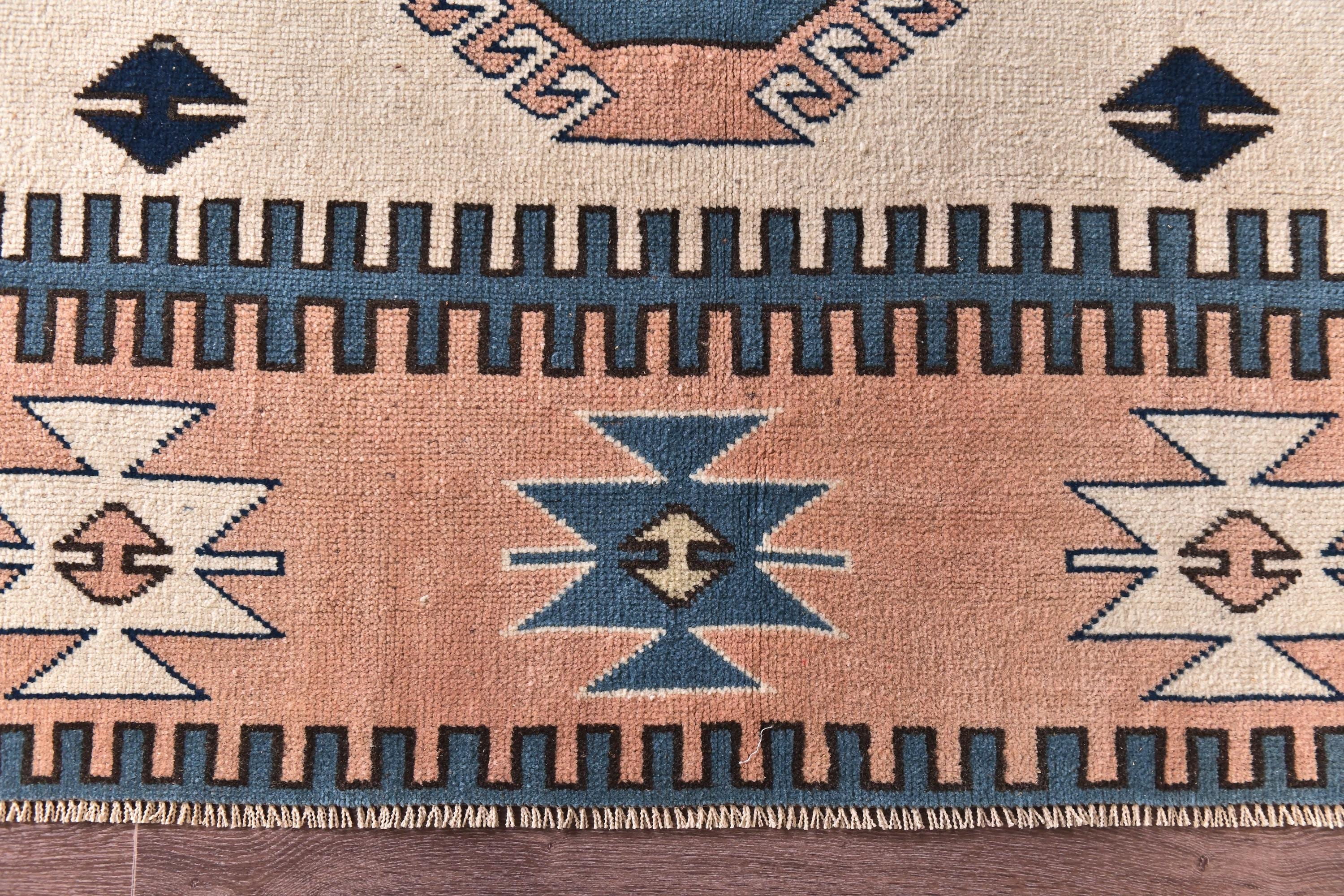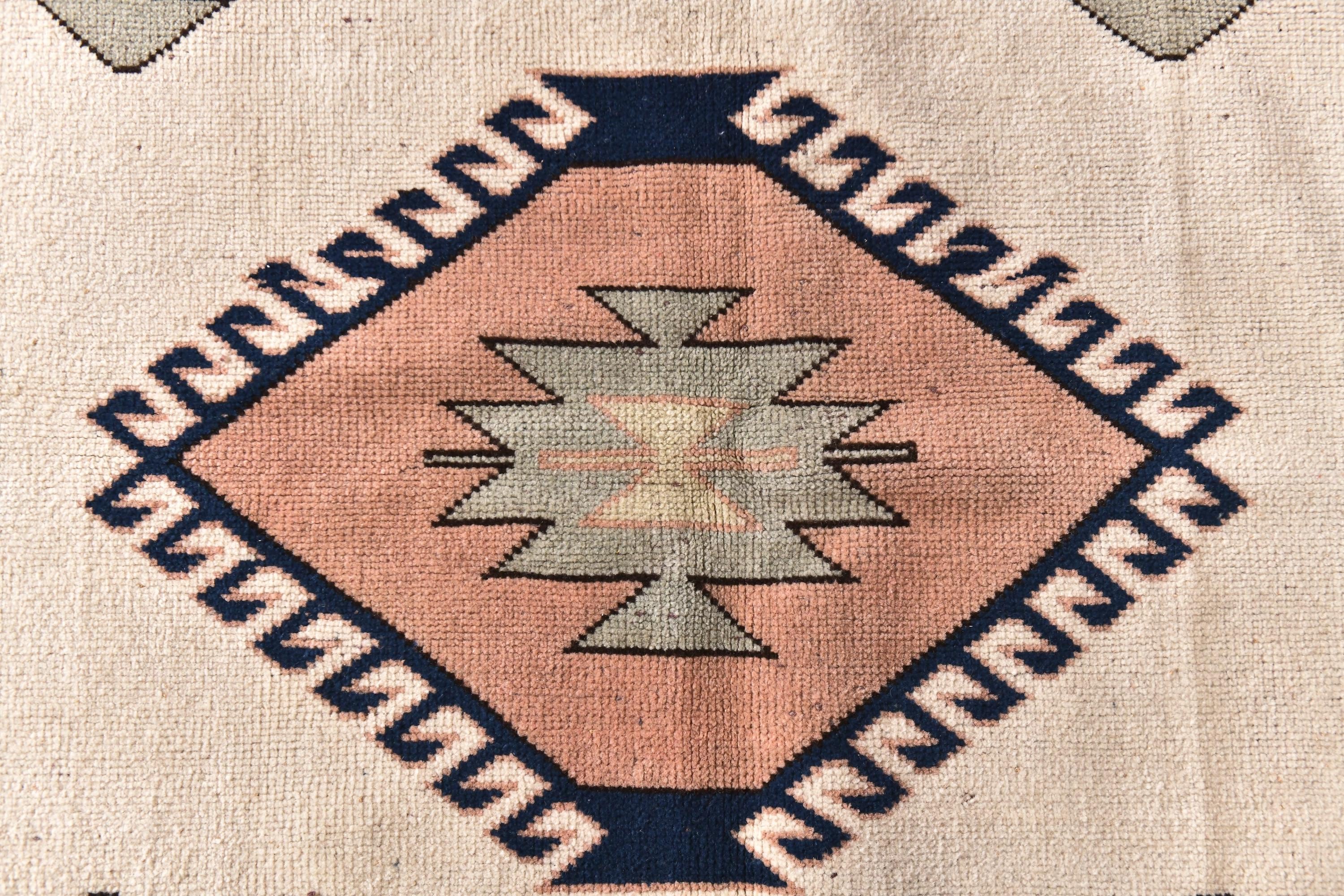 📜📌 Traditional Turkish area rug featuring geometric medallion patterns in navy blue and peach tones on cream background. Handwoven wool flat-weave rug with tribal diamond motifs and zigzag borders. Southwestern bohemian style runner perfect for living rooms and bedrooms.