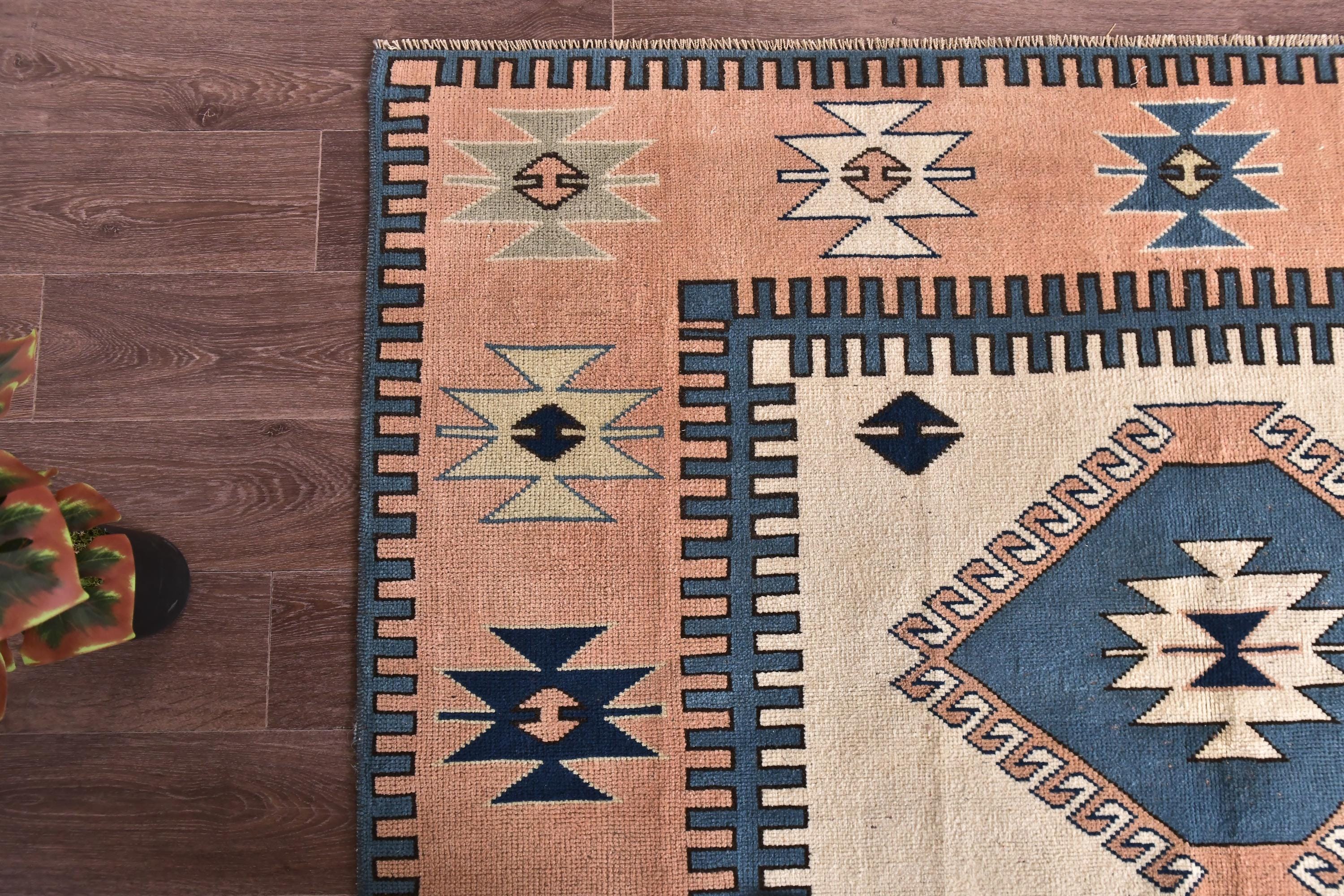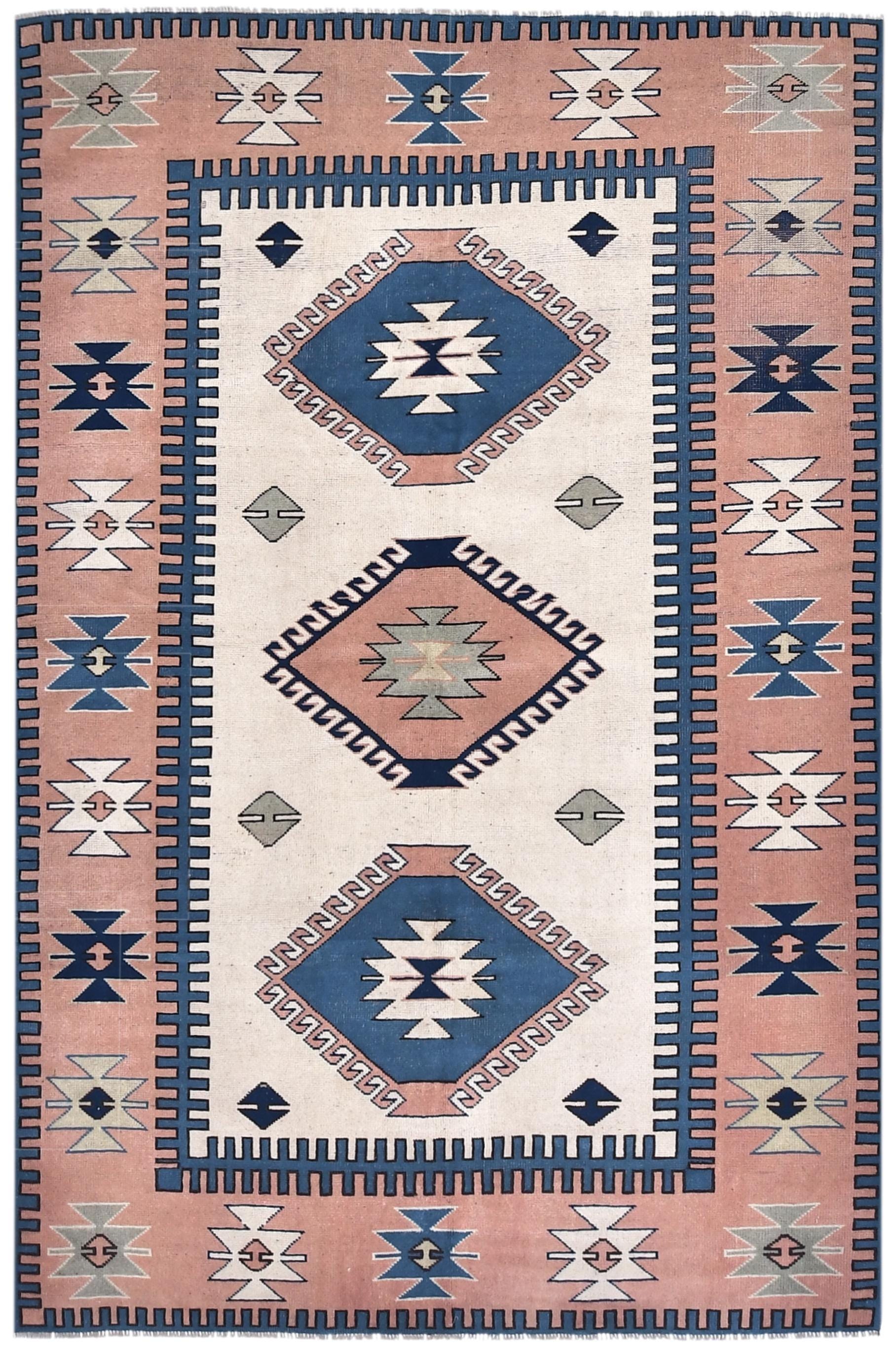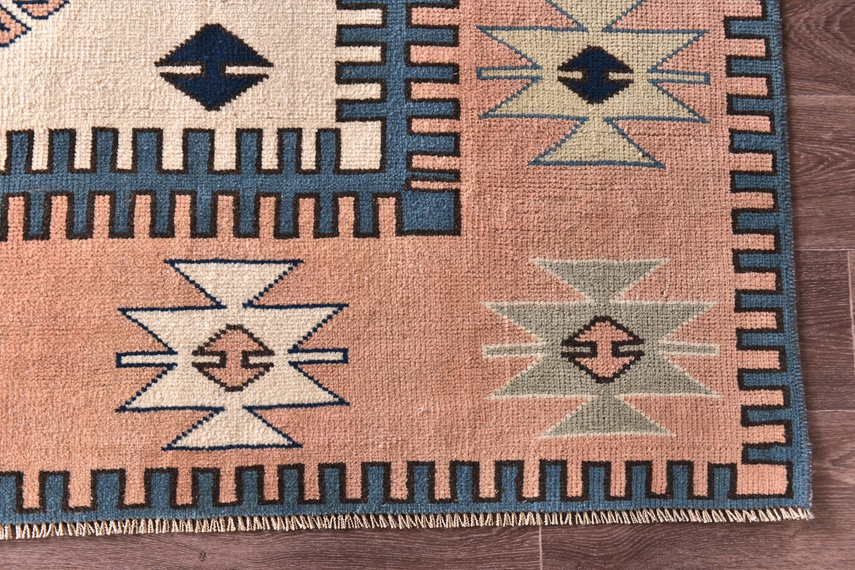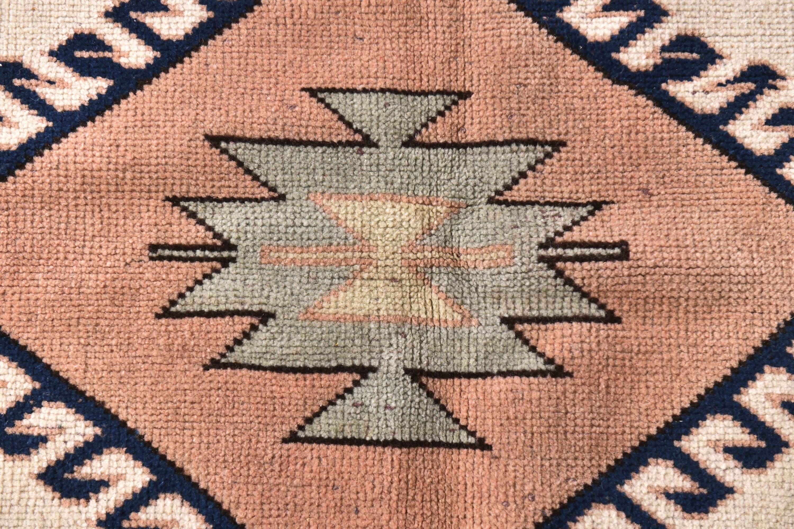 📜📌 Traditional Turkish area rug featuring geometric medallion patterns in navy blue and peach tones on cream background. Handwoven wool flat-weave rug with tribal diamond motifs and zigzag borders. Southwestern bohemian style runner perfect for living rooms and bedrooms.