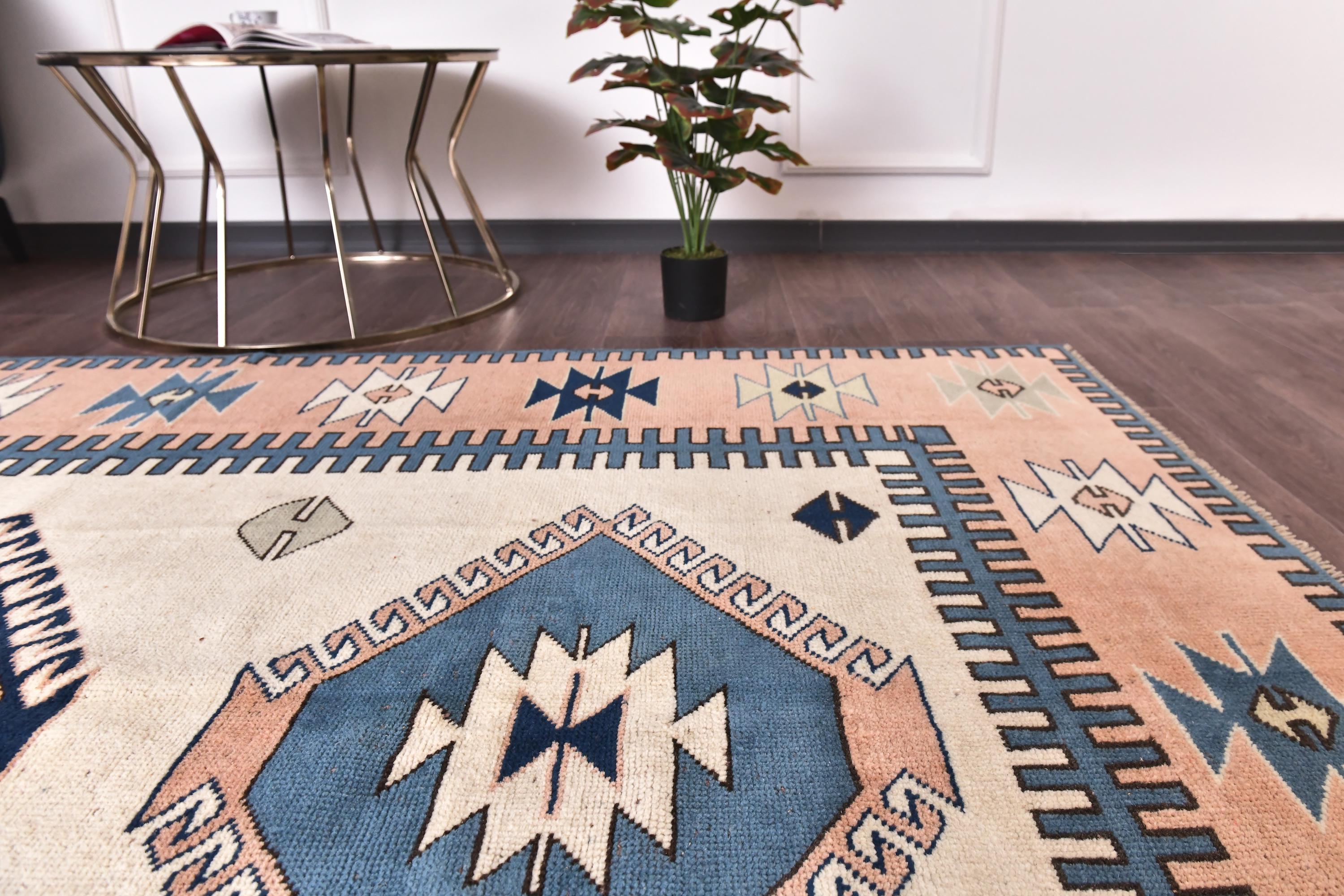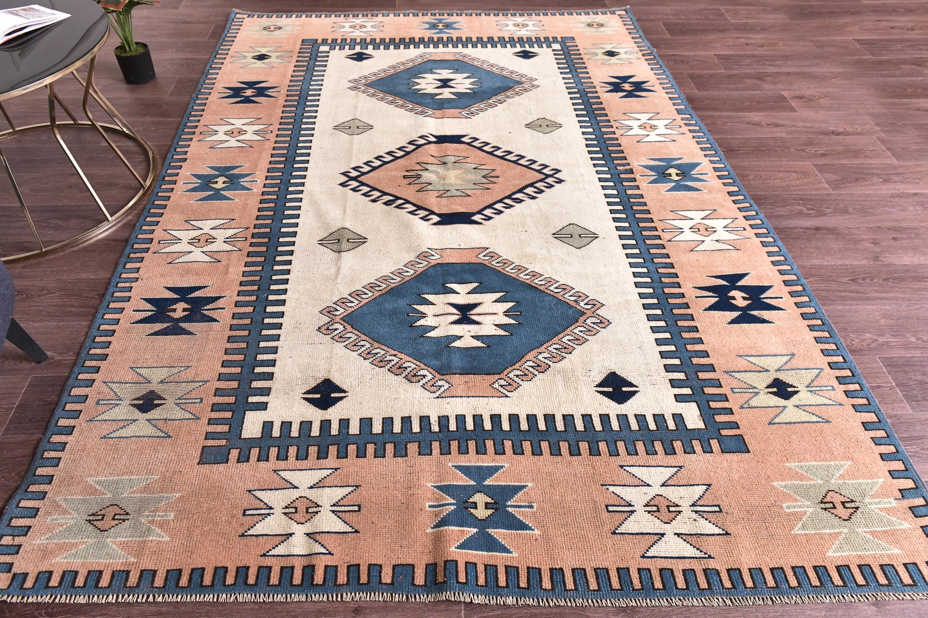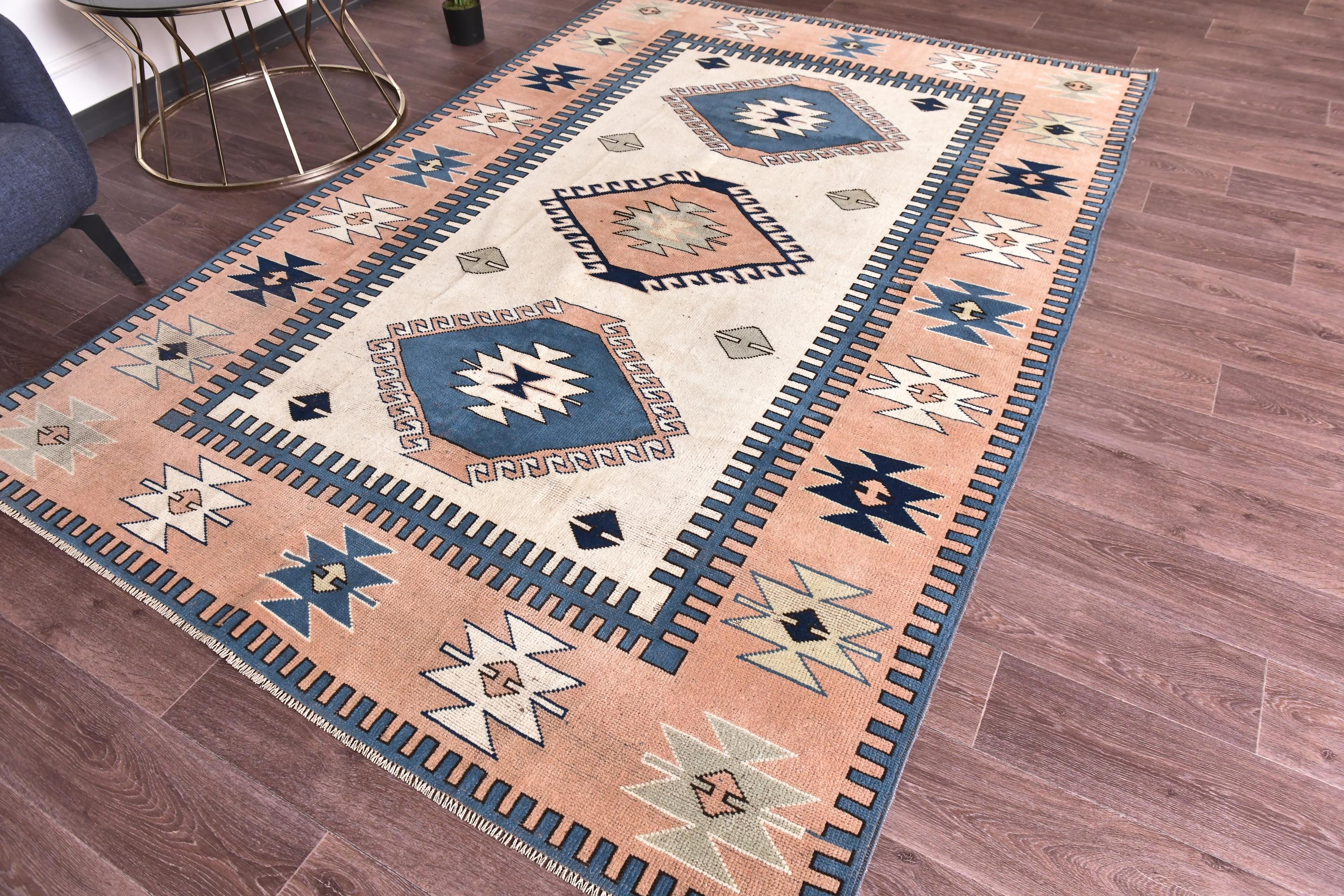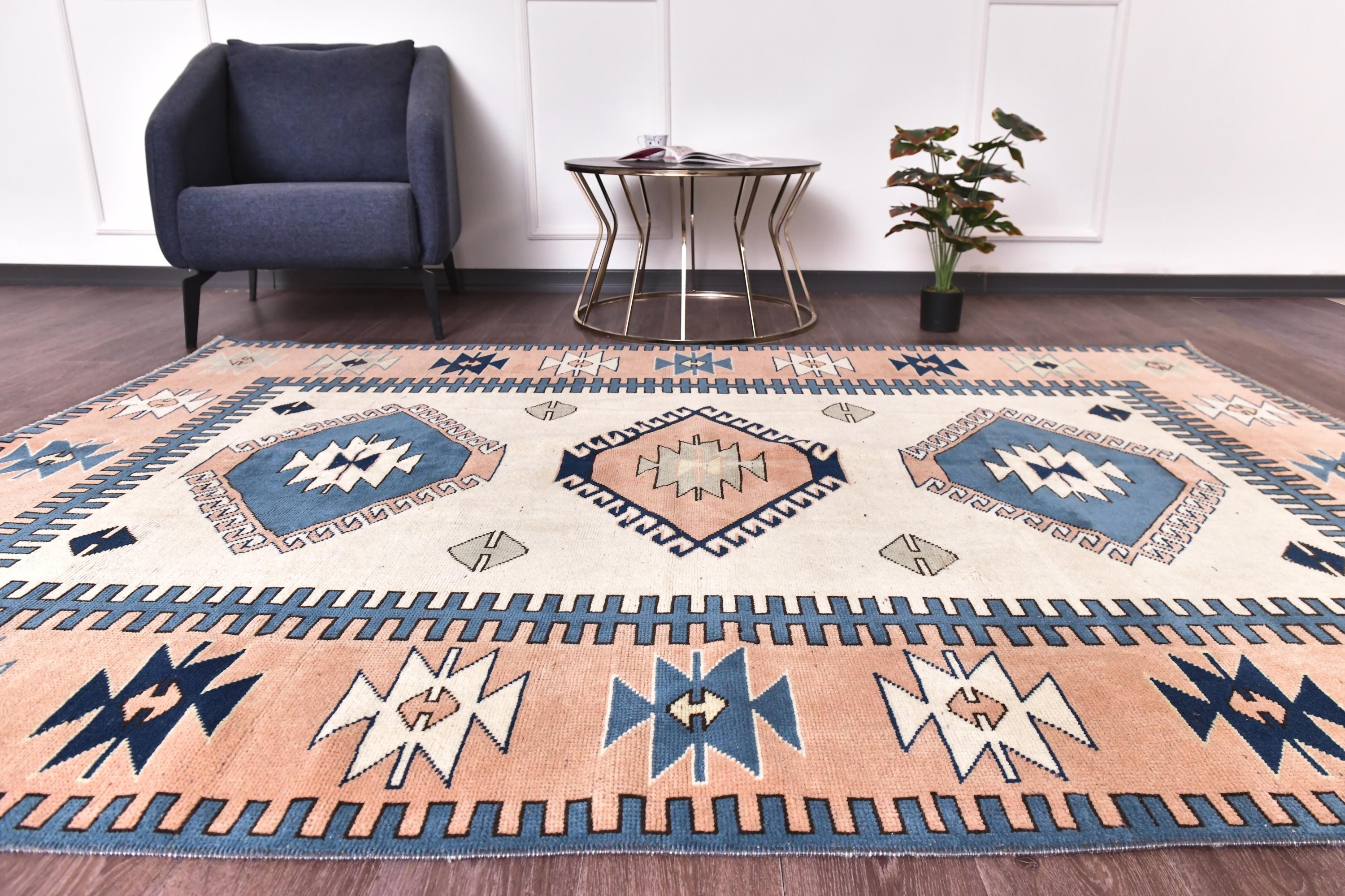 📜📌 Traditional Turkish area rug featuring geometric medallion patterns in navy blue and peach tones on cream background. Handwoven wool flat-weave rug with tribal diamond motifs and zigzag borders. Southwestern bohemian style runner perfect for living rooms and bedrooms.