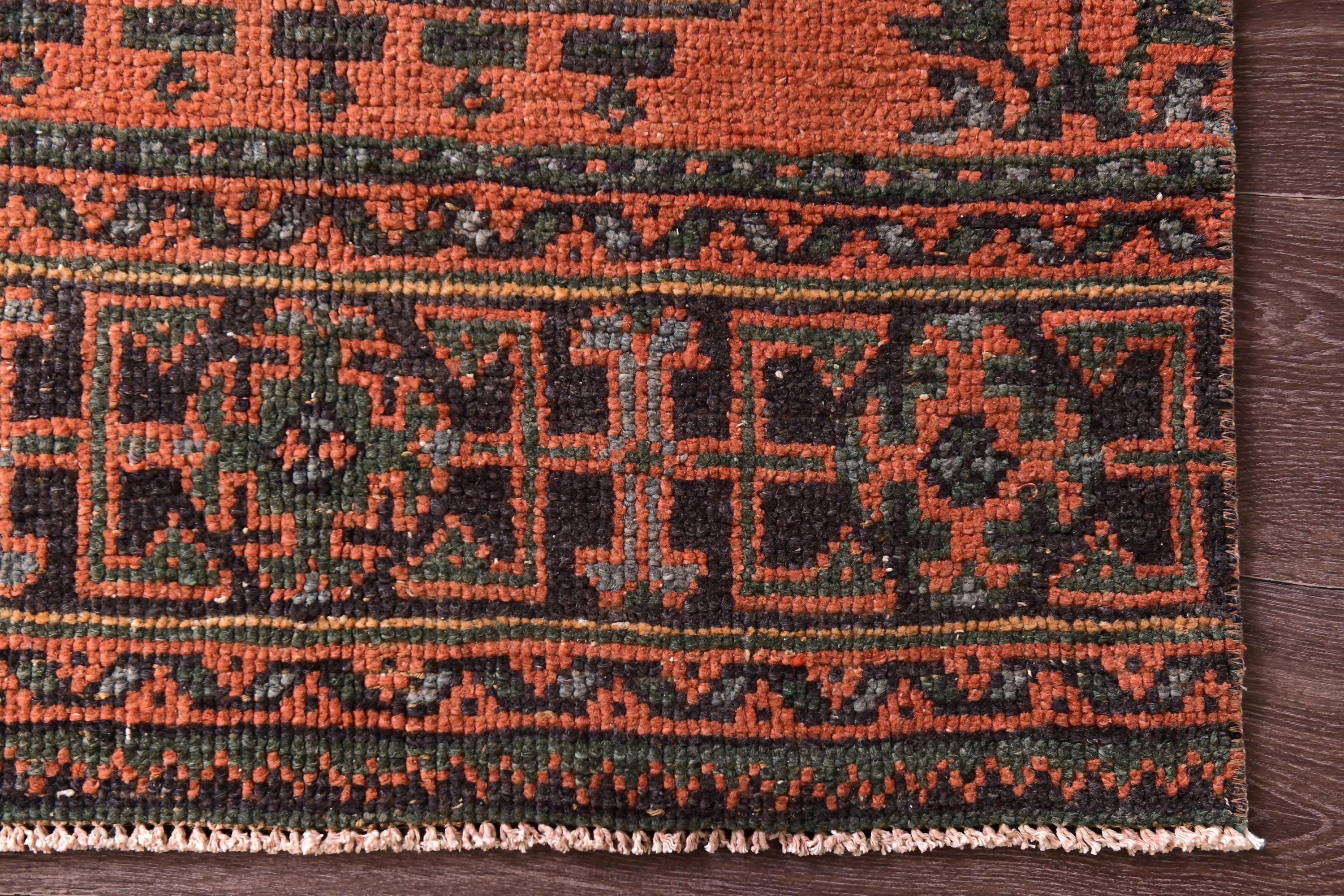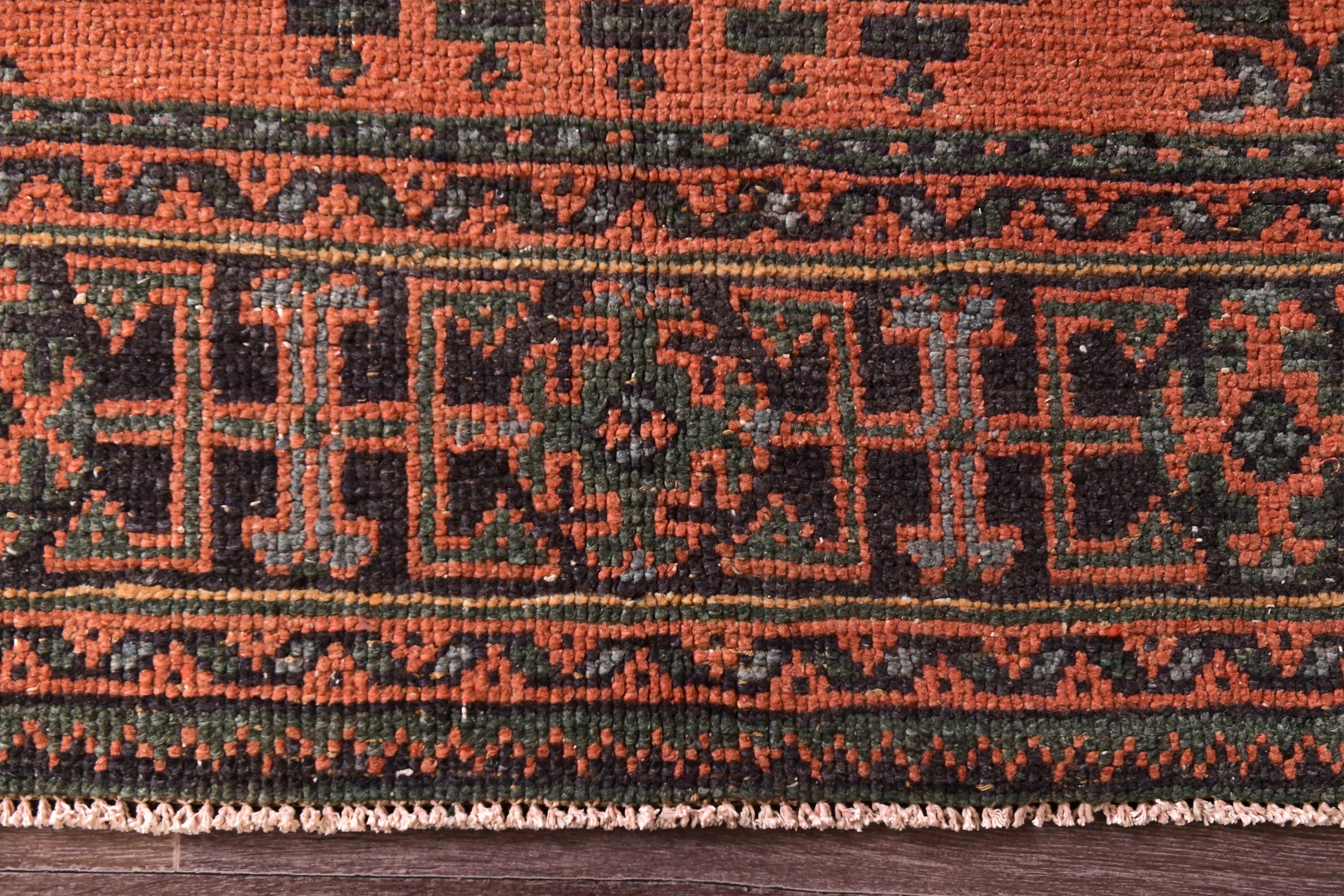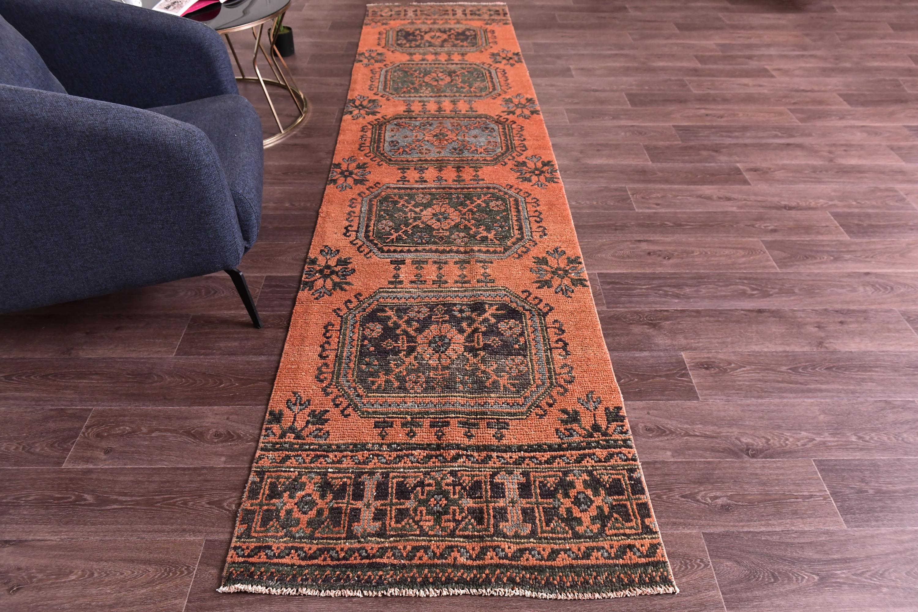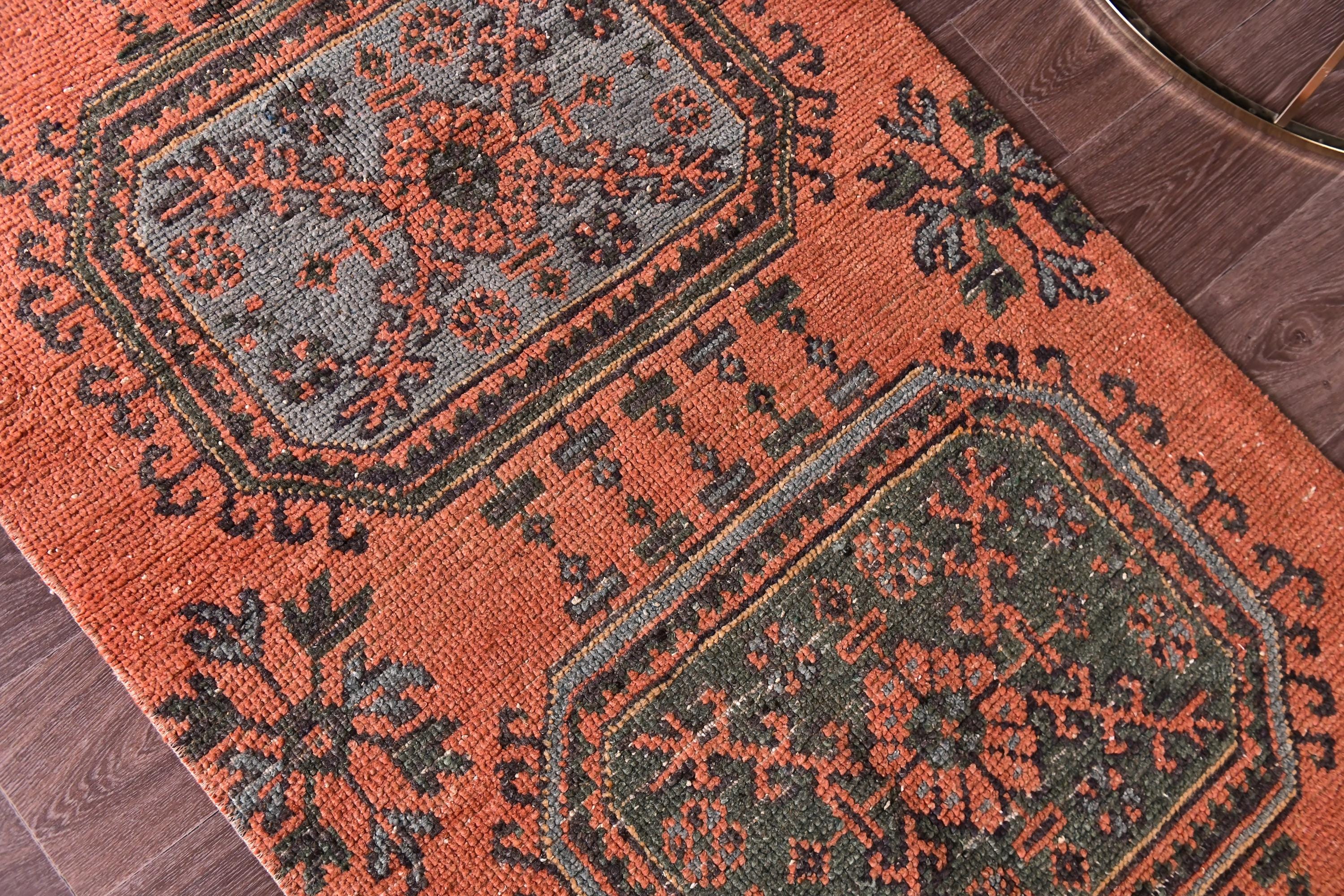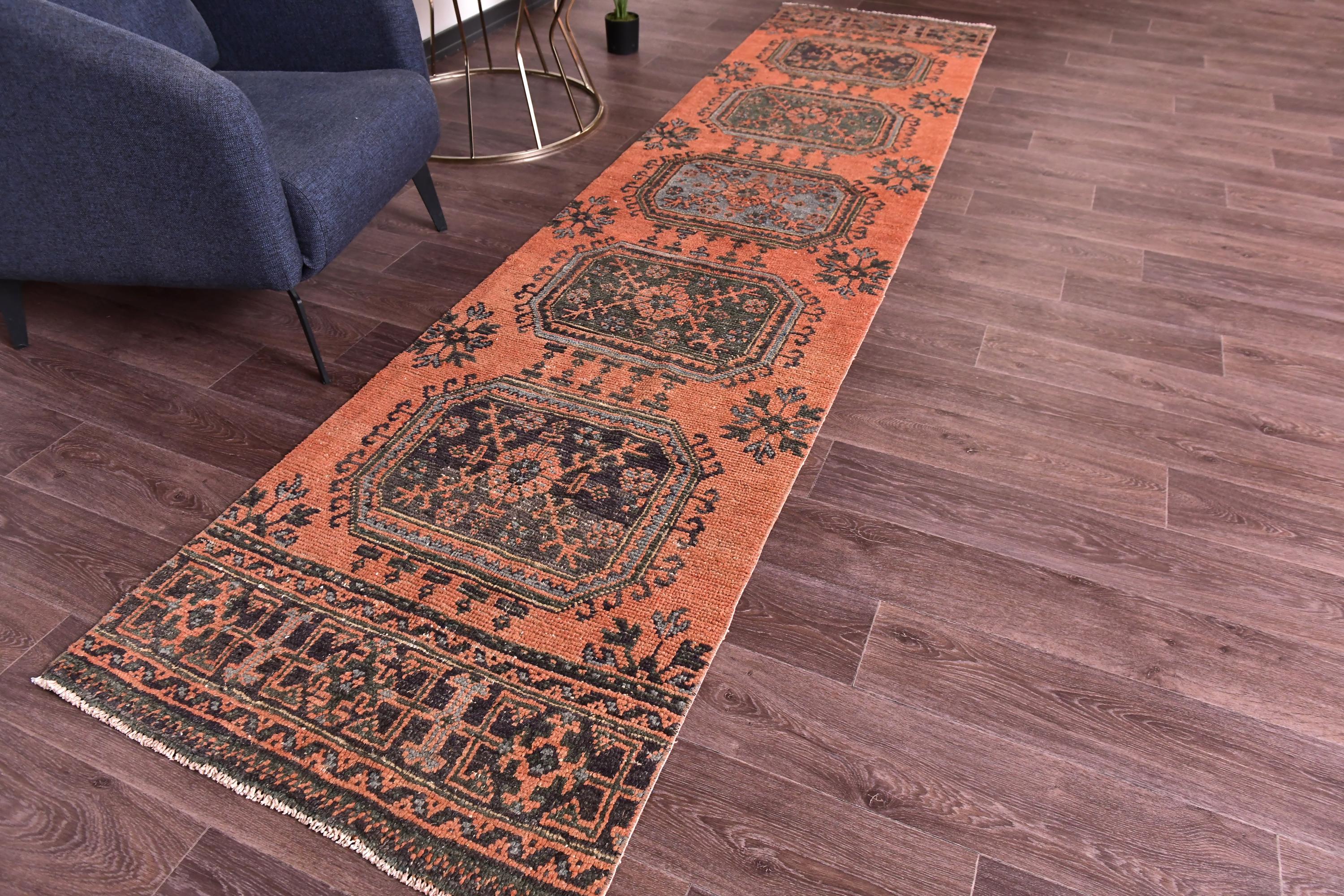 📜📌 Long vintage Turkish runner rug in vibrant burnt orange and coral tones with charcoal gray medallion patterns. Hand-knotted wool hallway carpet featuring repeating hexagonal medallions with intricate floral motifs. Extra-long narrow format ideal for corridors, entryways, and kitchen spaces. Bold bohemian style with traditional tribal designs.