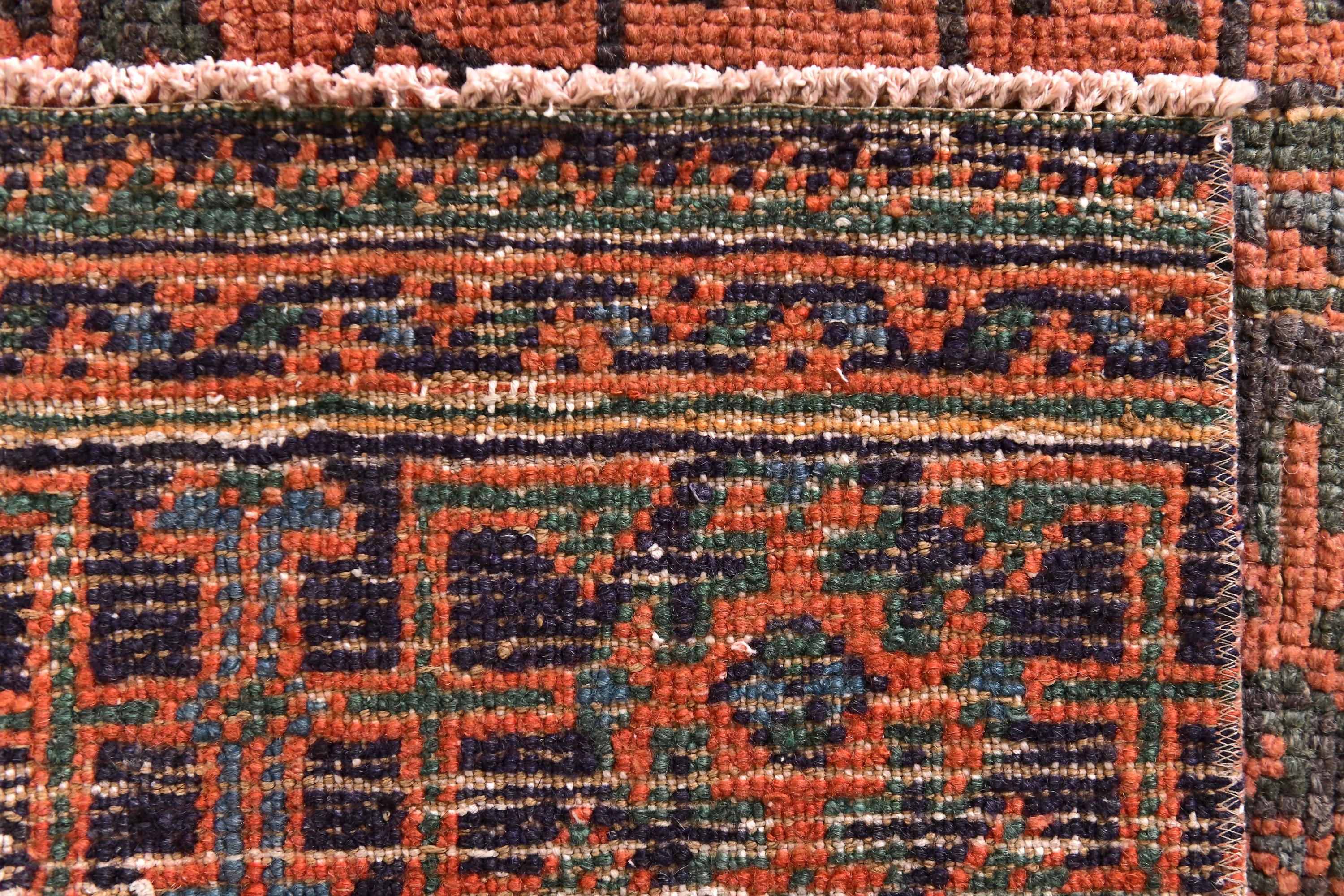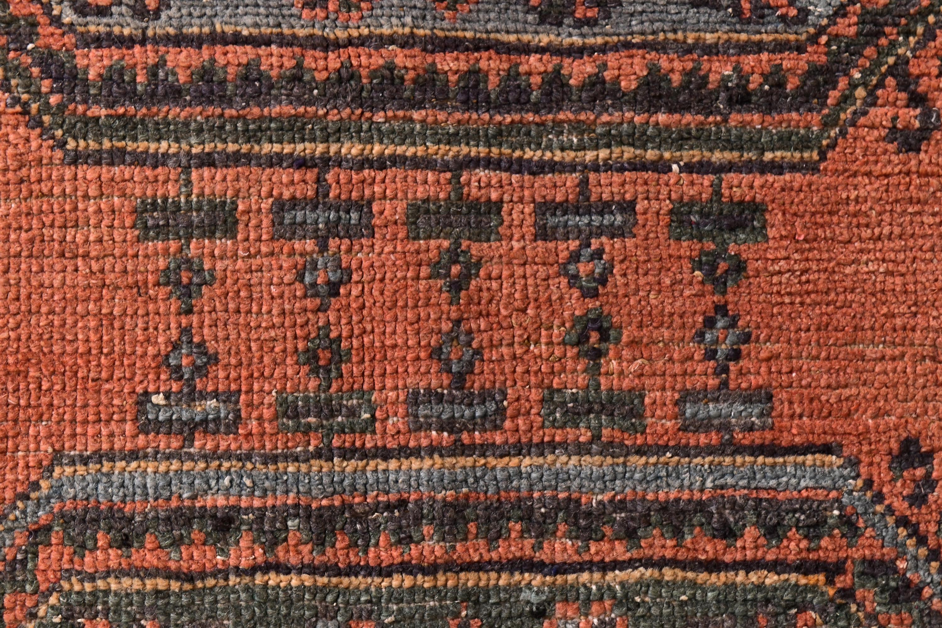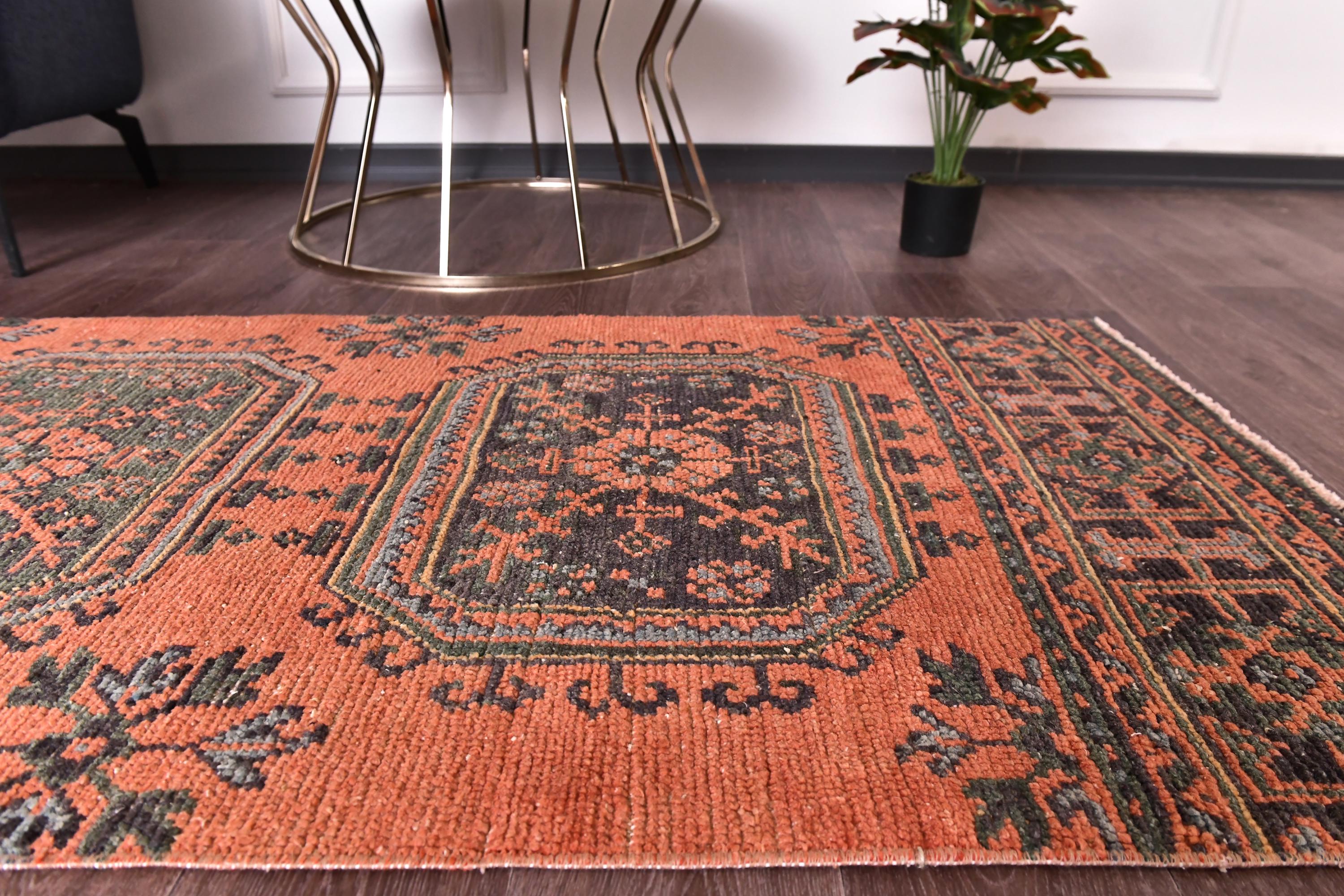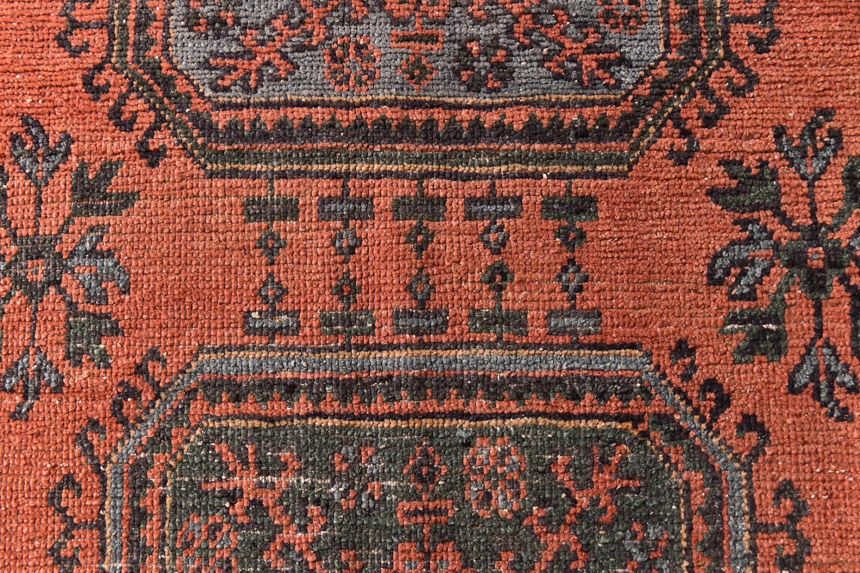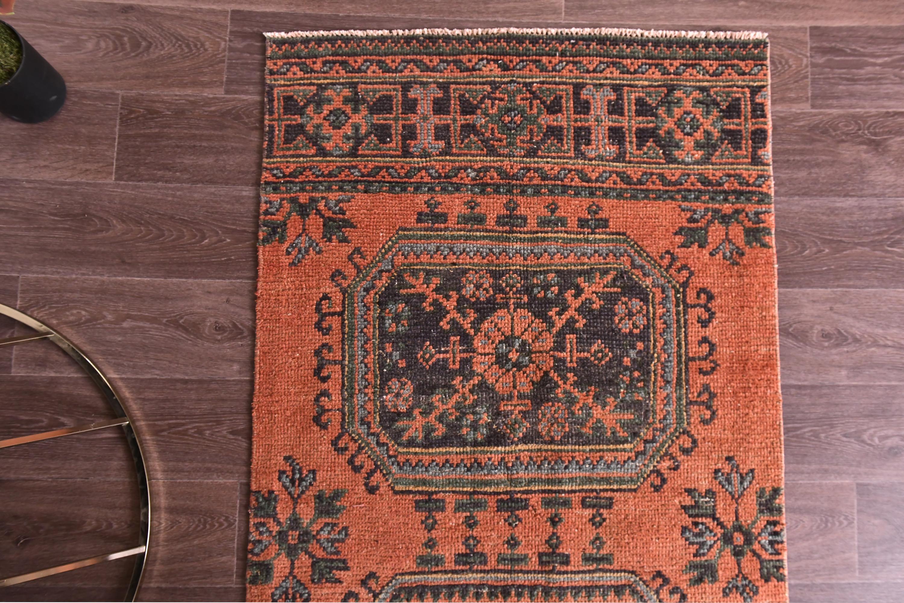 📜📌 Long vintage Turkish runner rug in vibrant burnt orange and coral tones with charcoal gray medallion patterns. Hand-knotted wool hallway carpet featuring repeating hexagonal medallions with intricate floral motifs. Extra-long narrow format ideal for corridors, entryways, and kitchen spaces. Bold bohemian style with traditional tribal designs.