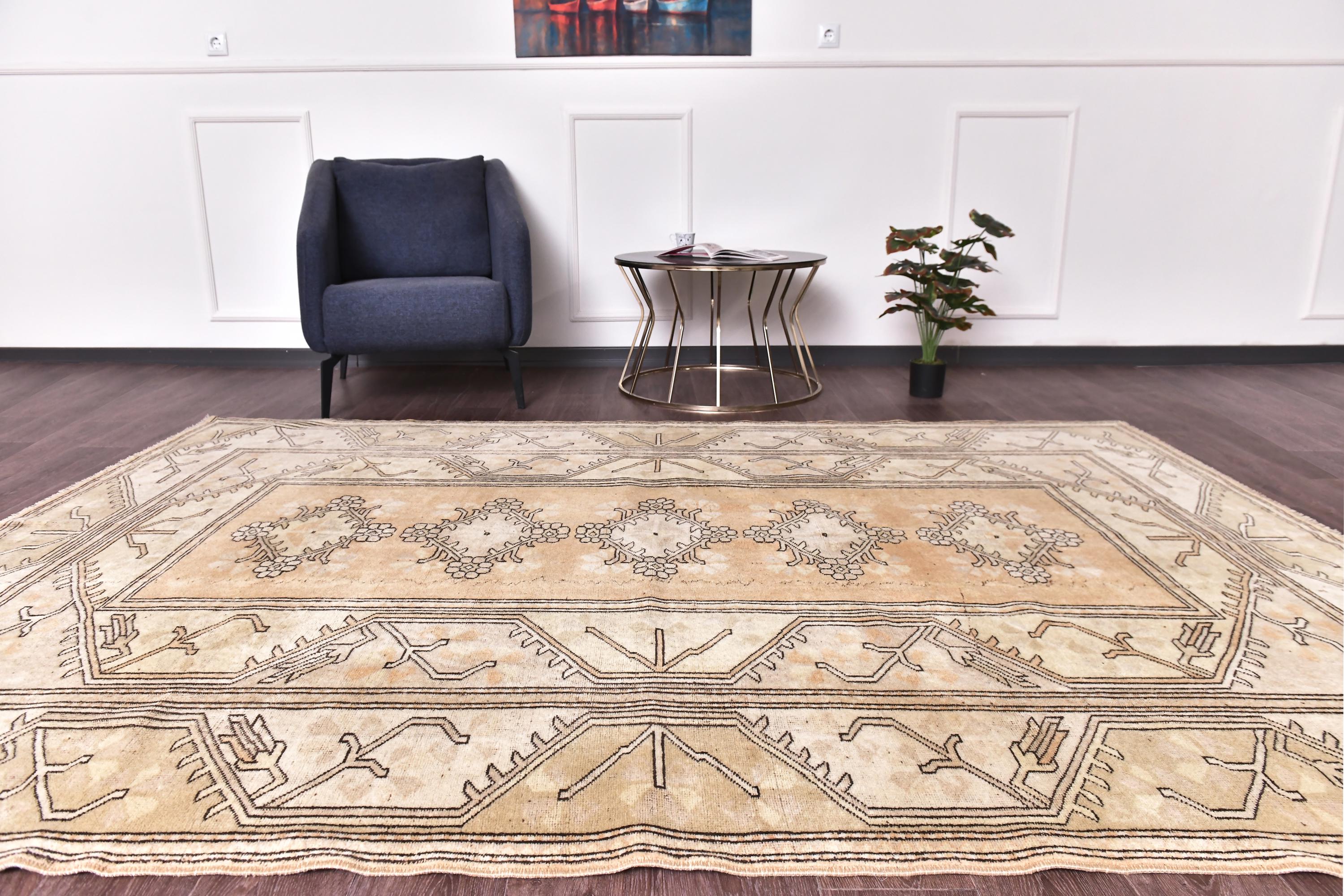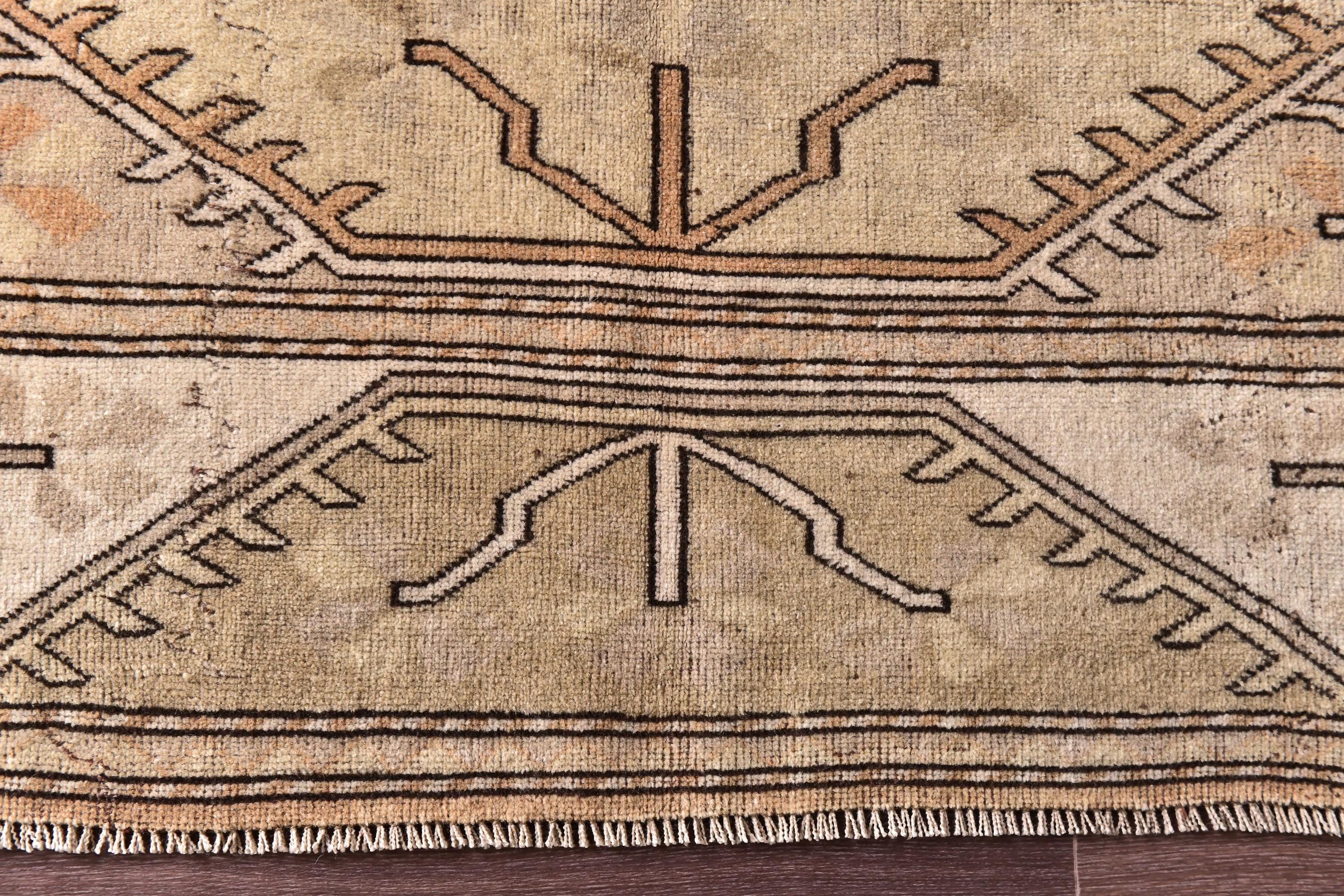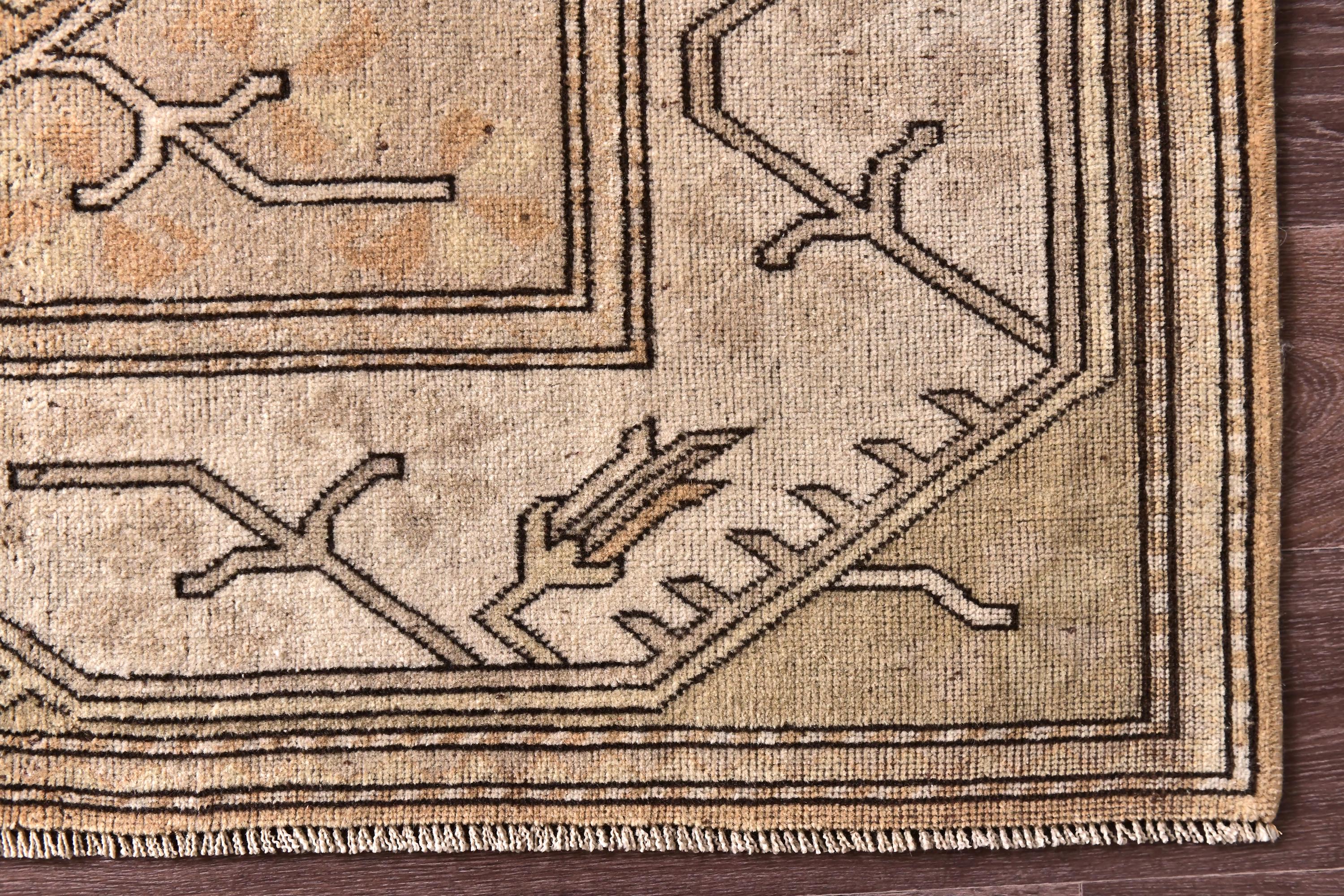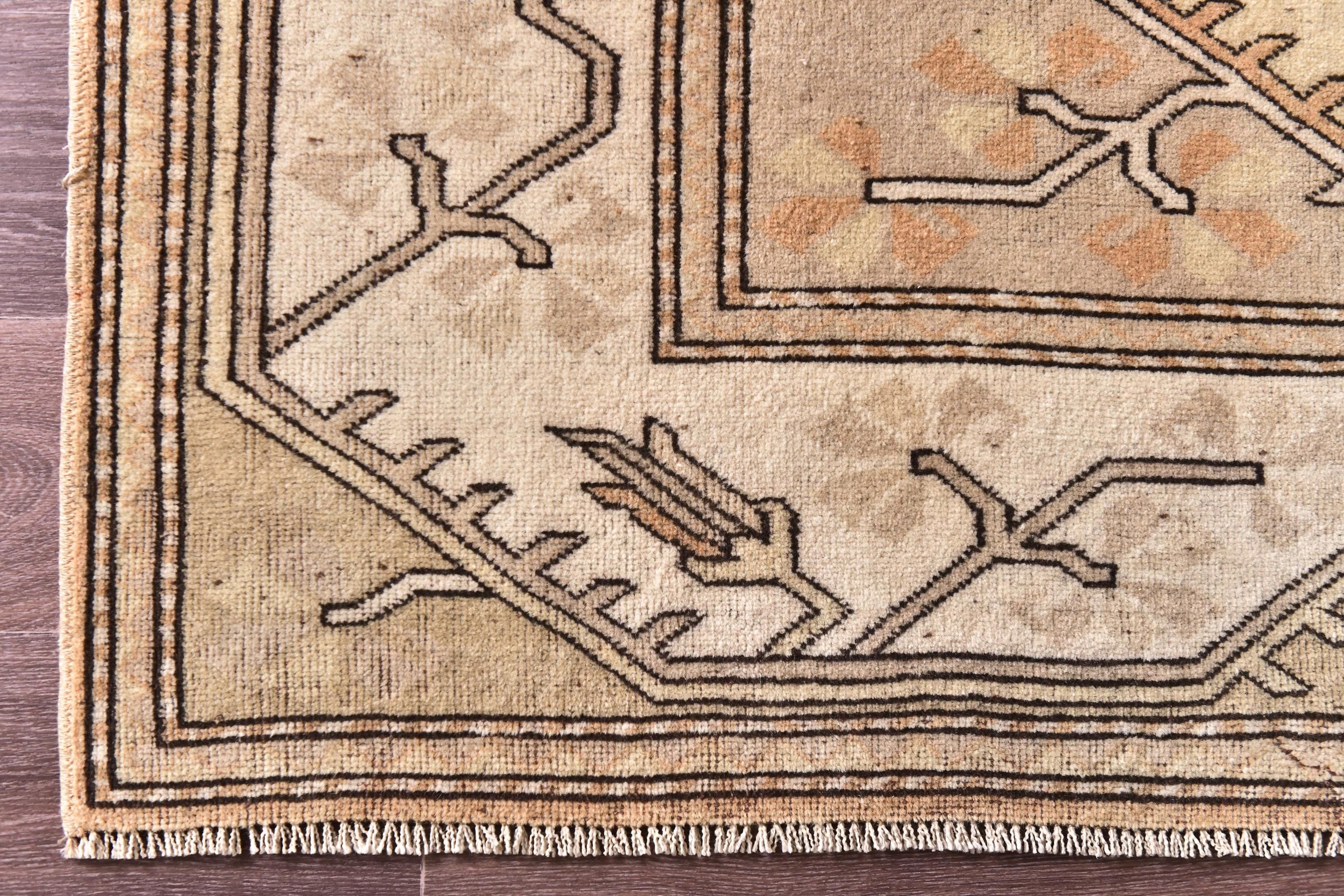 📜📌Vintage Turkish Milas area rug featuring neutral beige and tan color palette with traditional medallion pattern down the center. Hand-knotted wool carpet with distressed appearance and geometric tribal border designs. Natural aged patina with cream and caramel tones, perfect for bohemian and modern farmhouse interiors.