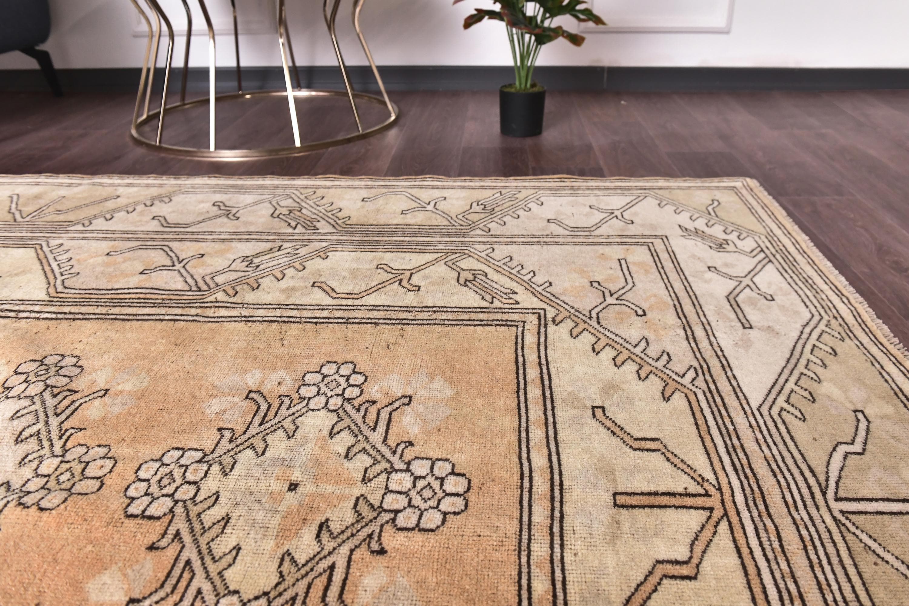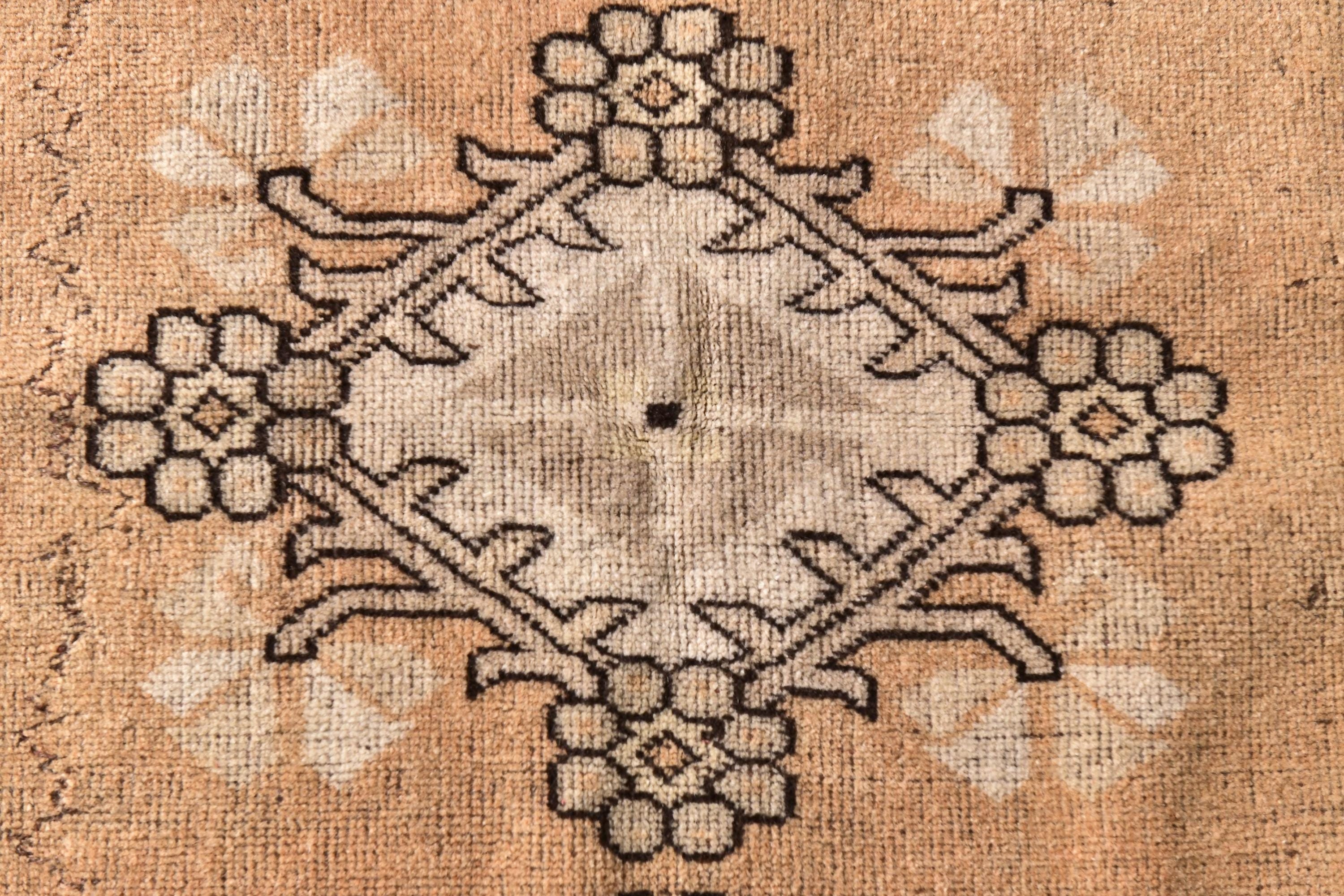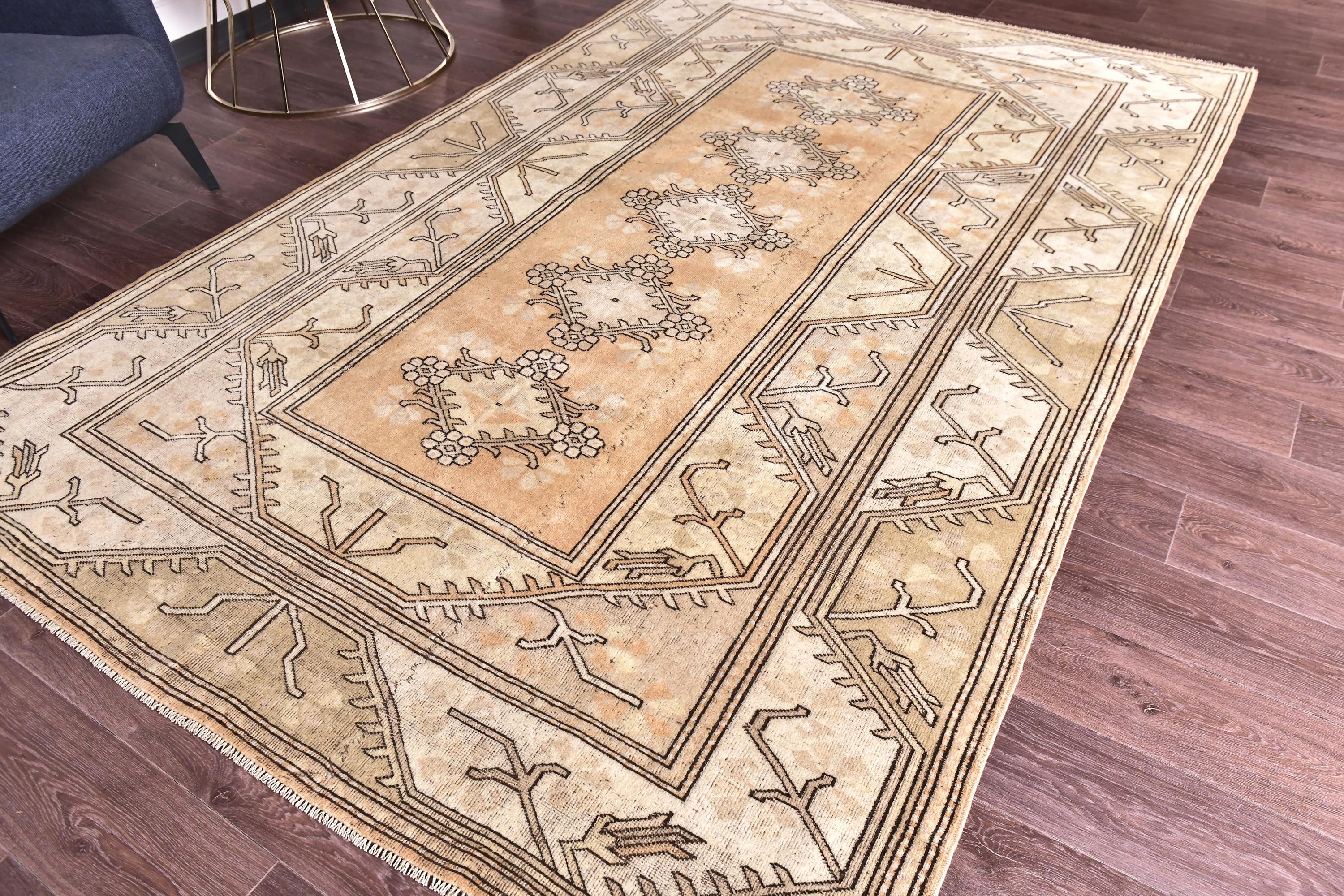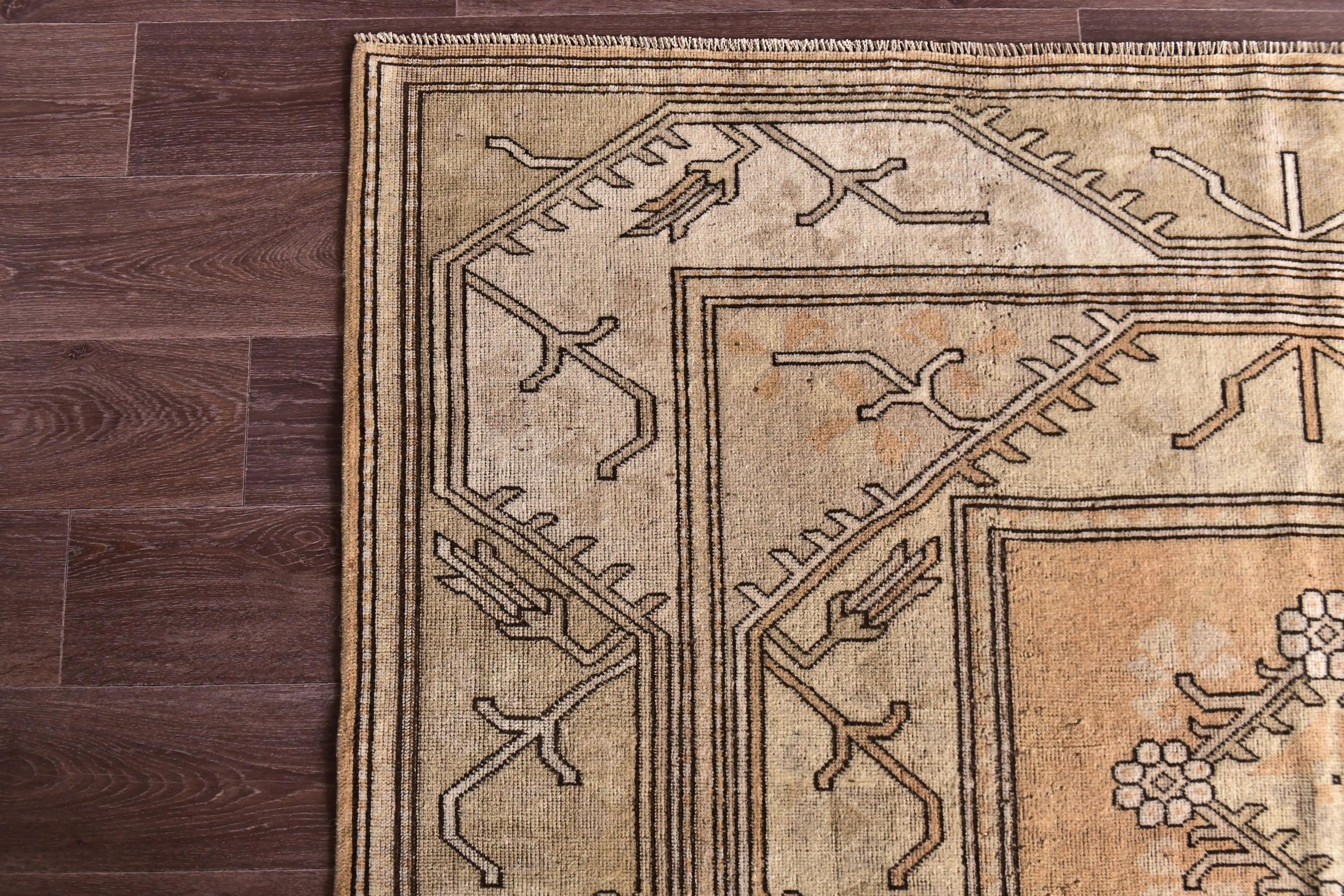 📜📌Vintage Turkish Milas area rug featuring neutral beige and tan color palette with traditional medallion pattern down the center. Hand-knotted wool carpet with distressed appearance and geometric tribal border designs. Natural aged patina with cream and caramel tones, perfect for bohemian and modern farmhouse interiors.