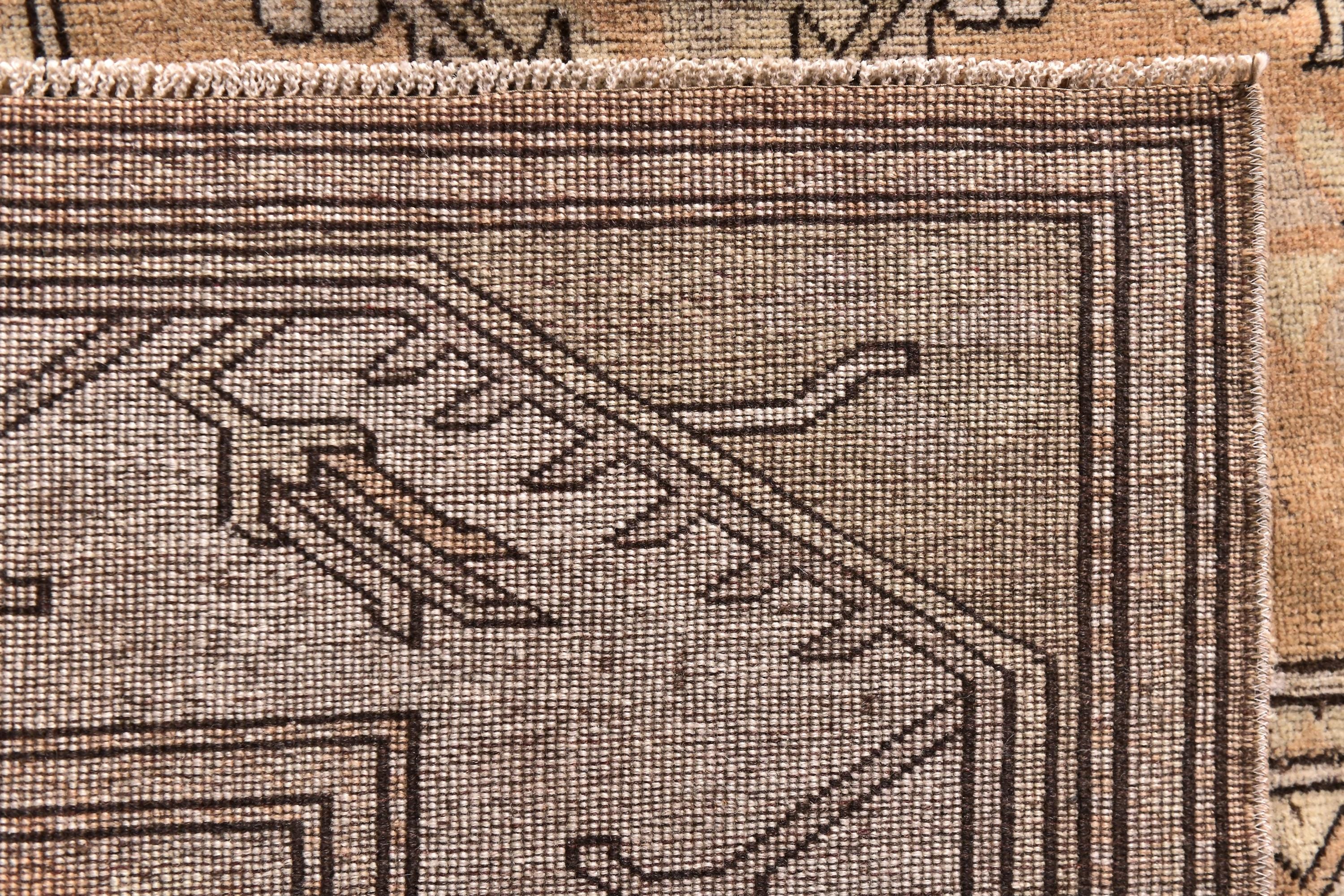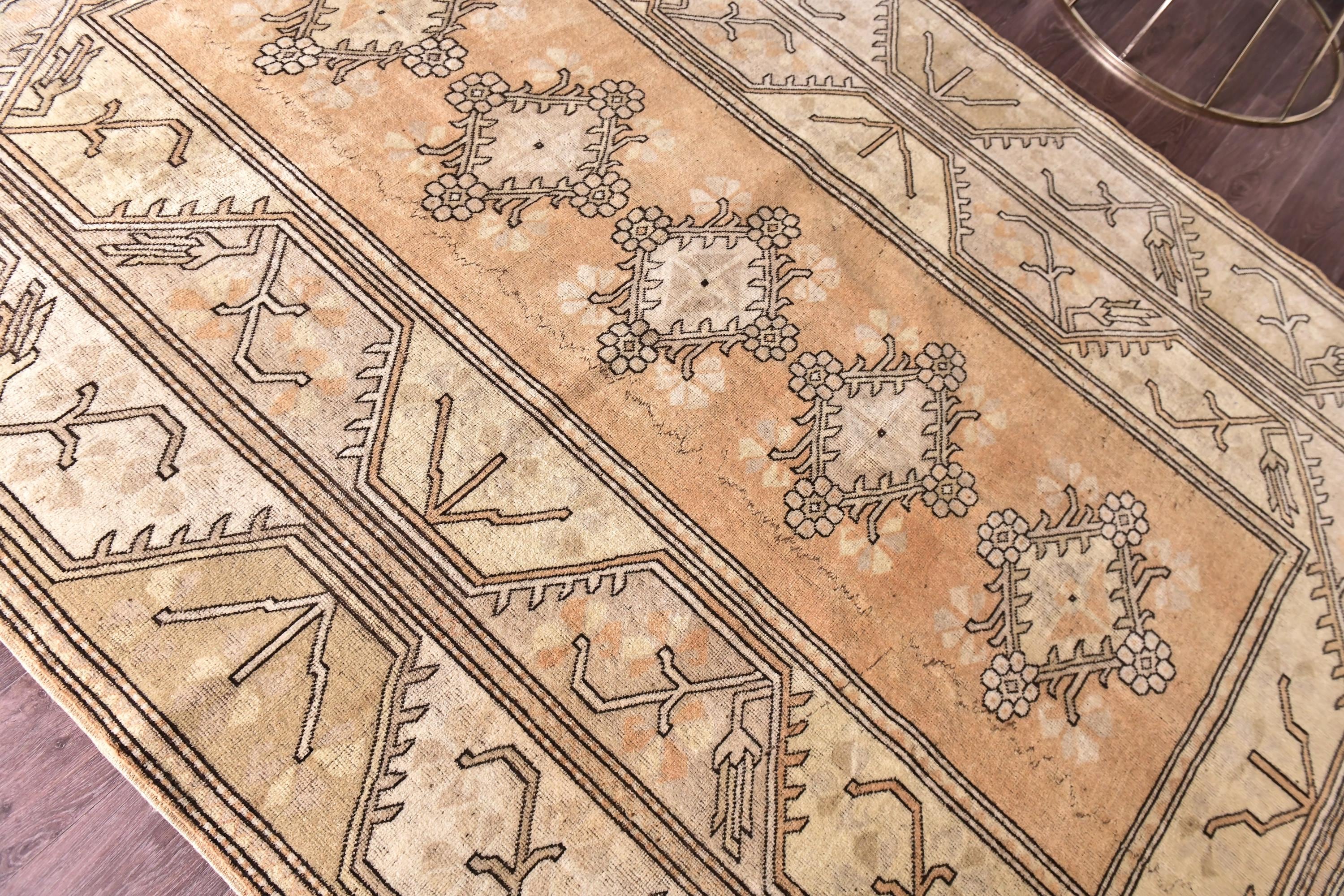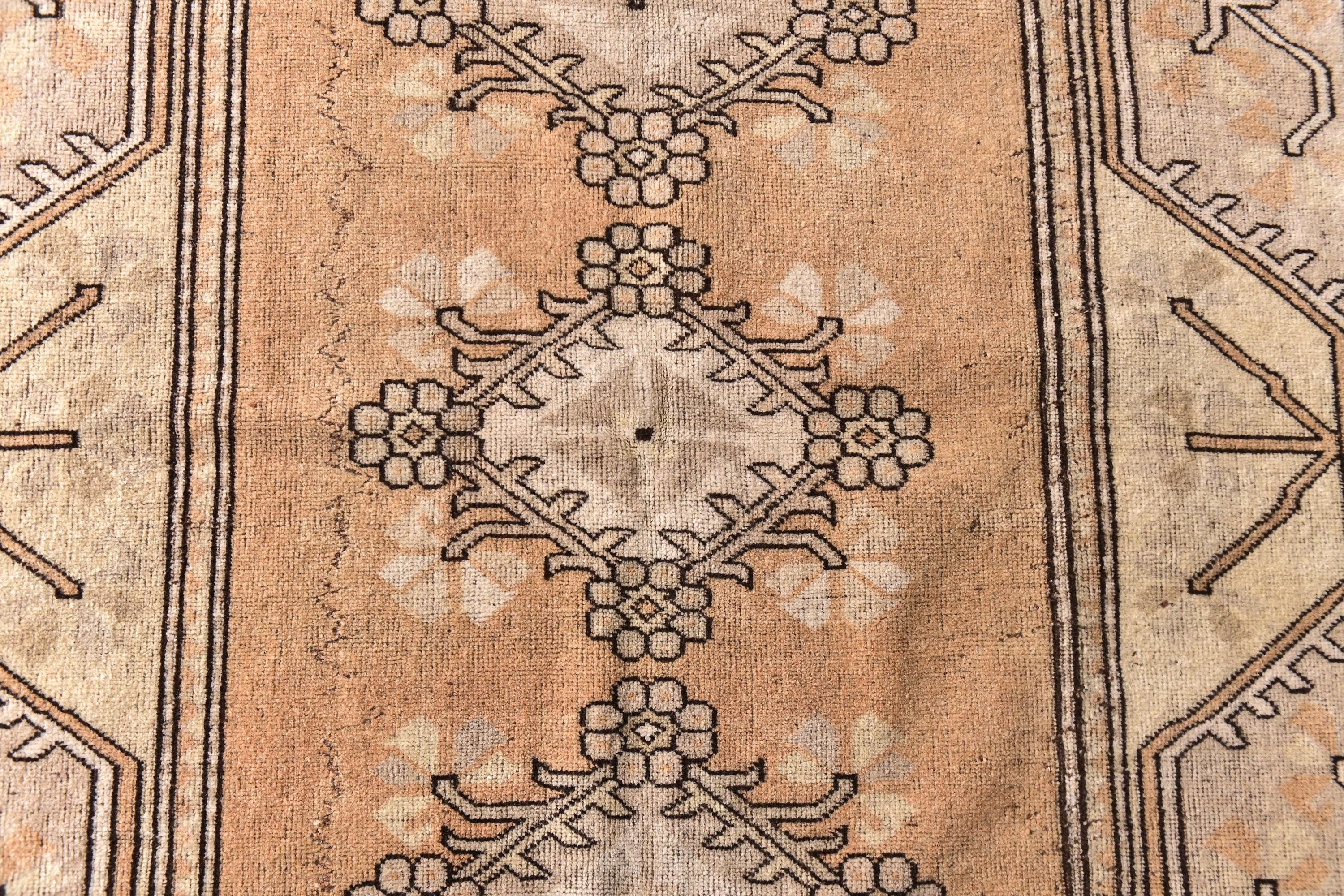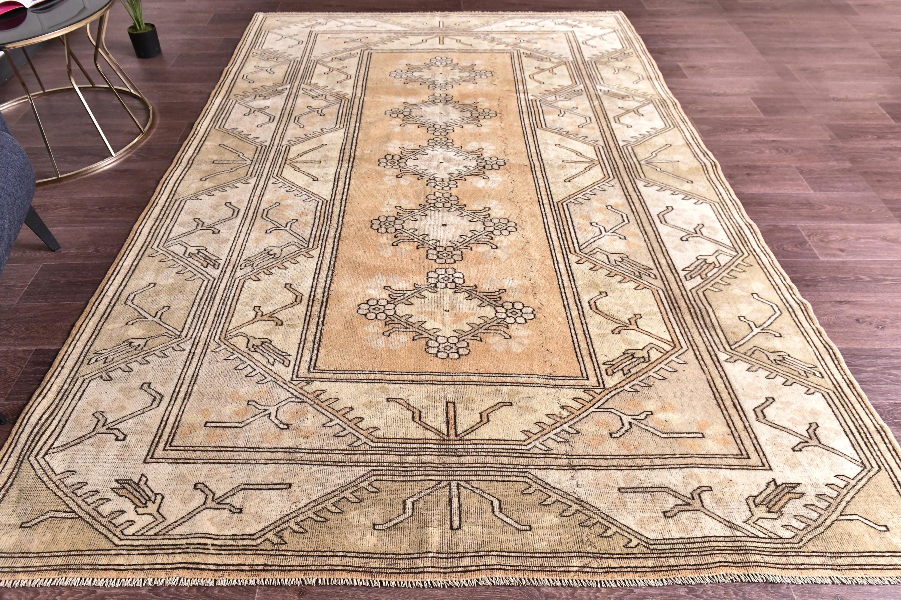 📜📌Vintage Turkish Milas area rug featuring neutral beige and tan color palette with traditional medallion pattern down the center. Hand-knotted wool carpet with distressed appearance and geometric tribal border designs. Natural aged patina with cream and caramel tones, perfect for bohemian and modern farmhouse interiors.