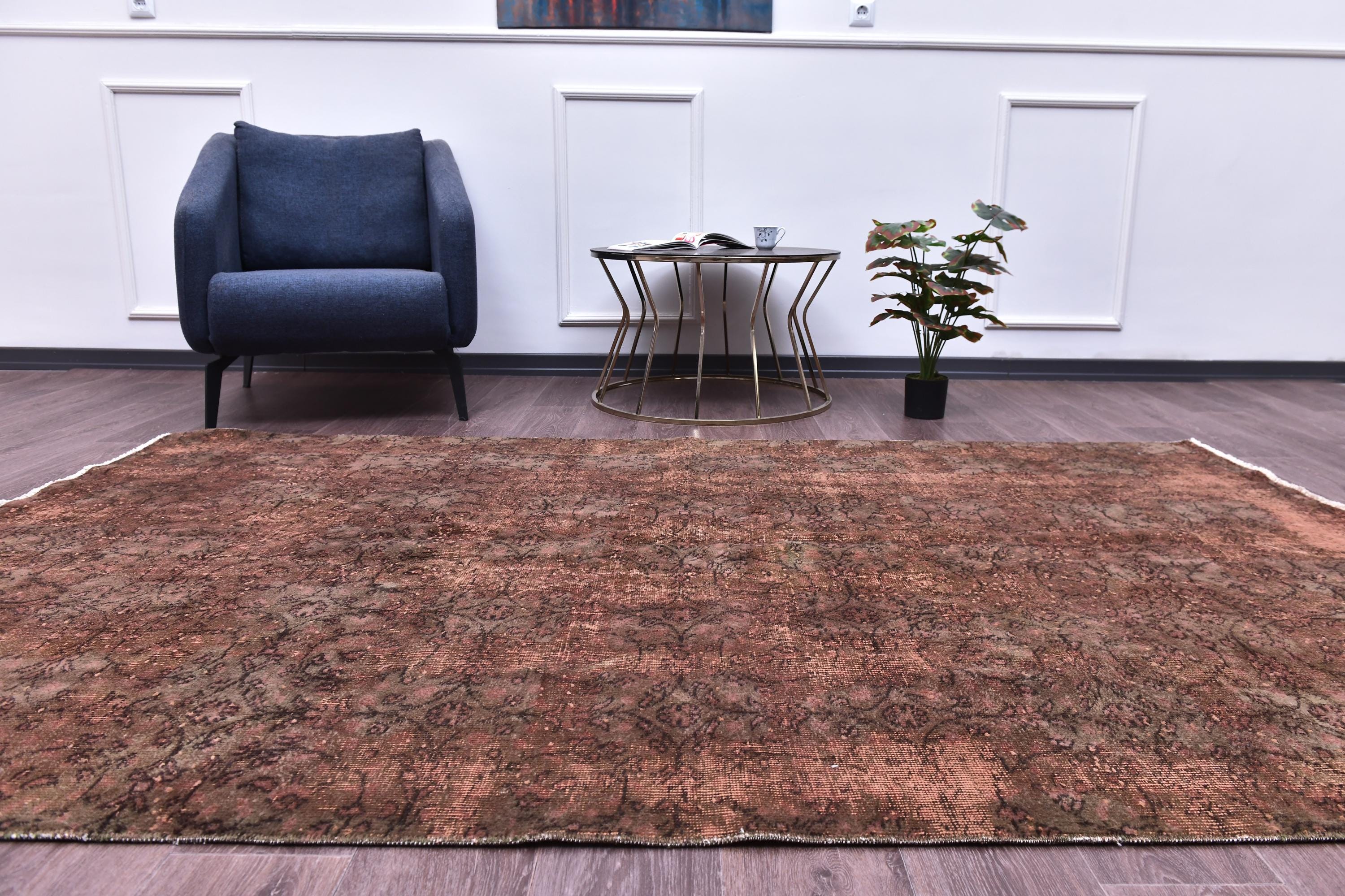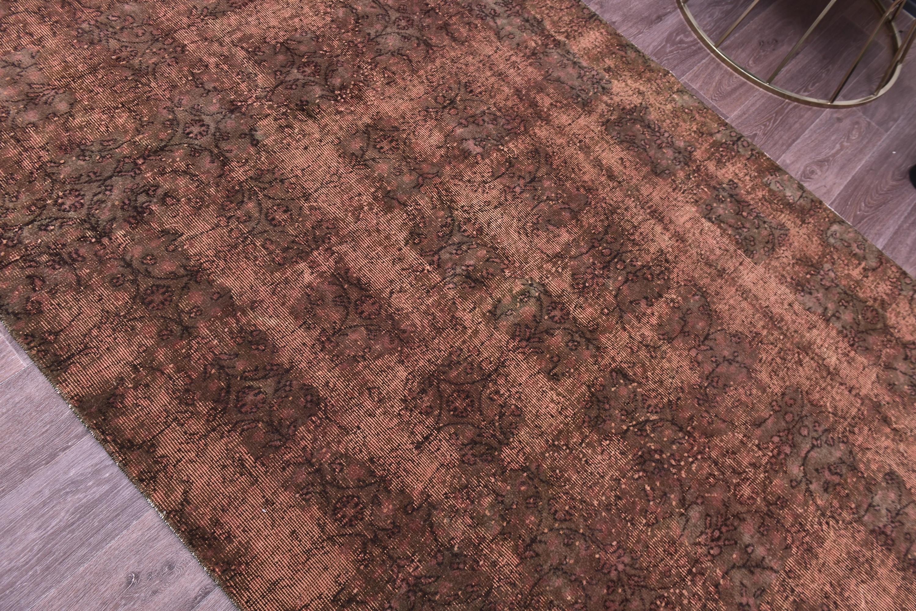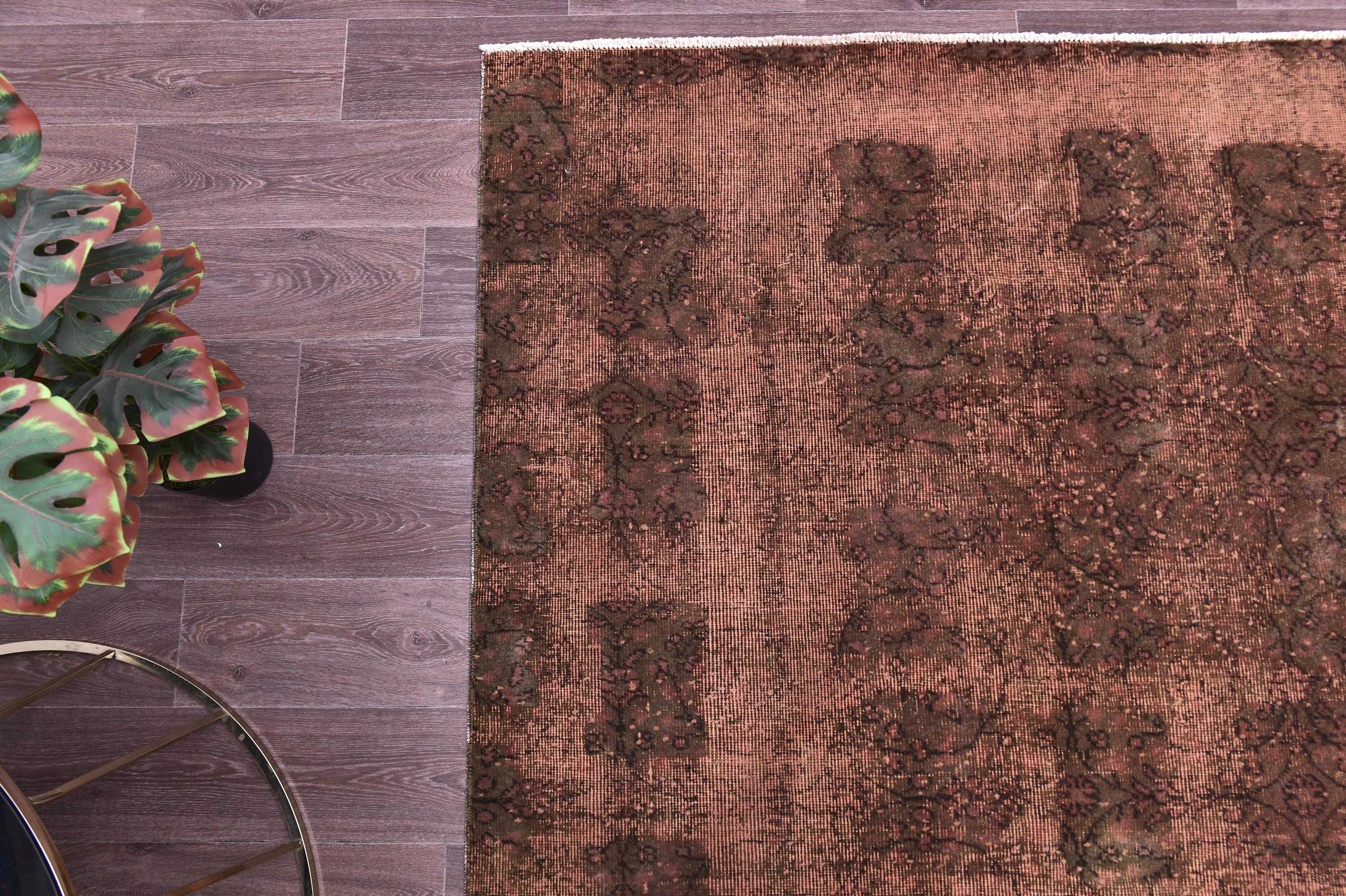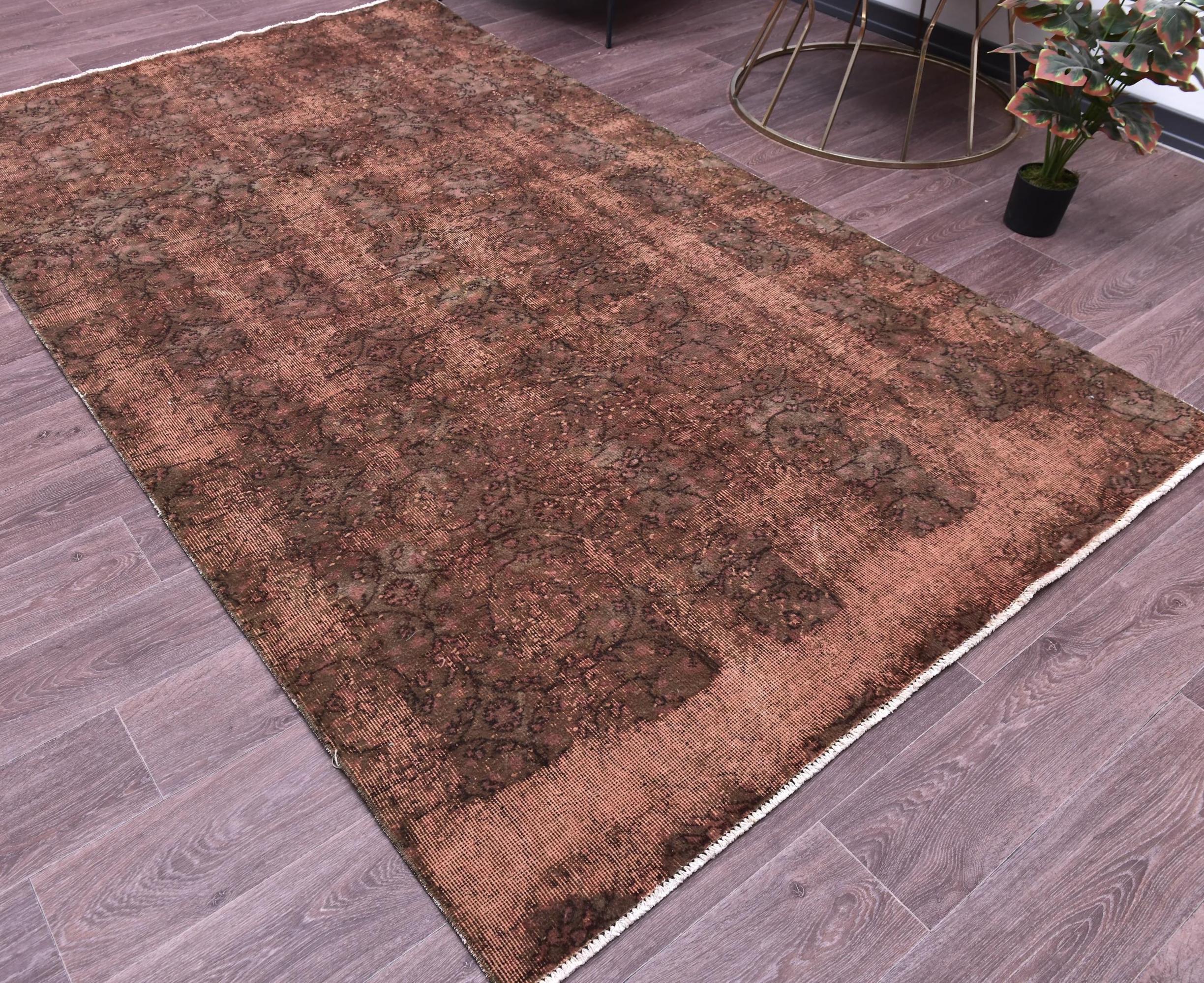 📜📌 Vintage Turkish overdyed area rug in rich brown and copper tones with heavily distressed appearance. Hand-knotted wool carpet featuring subtle faded medallion and floral patterns barely visible through the aged patina. Warm rustic color palette blending chocolate brown, burnt orange, and copper hues creates dramatic vintage aesthetic perfect for industrial and bohemian interiors.