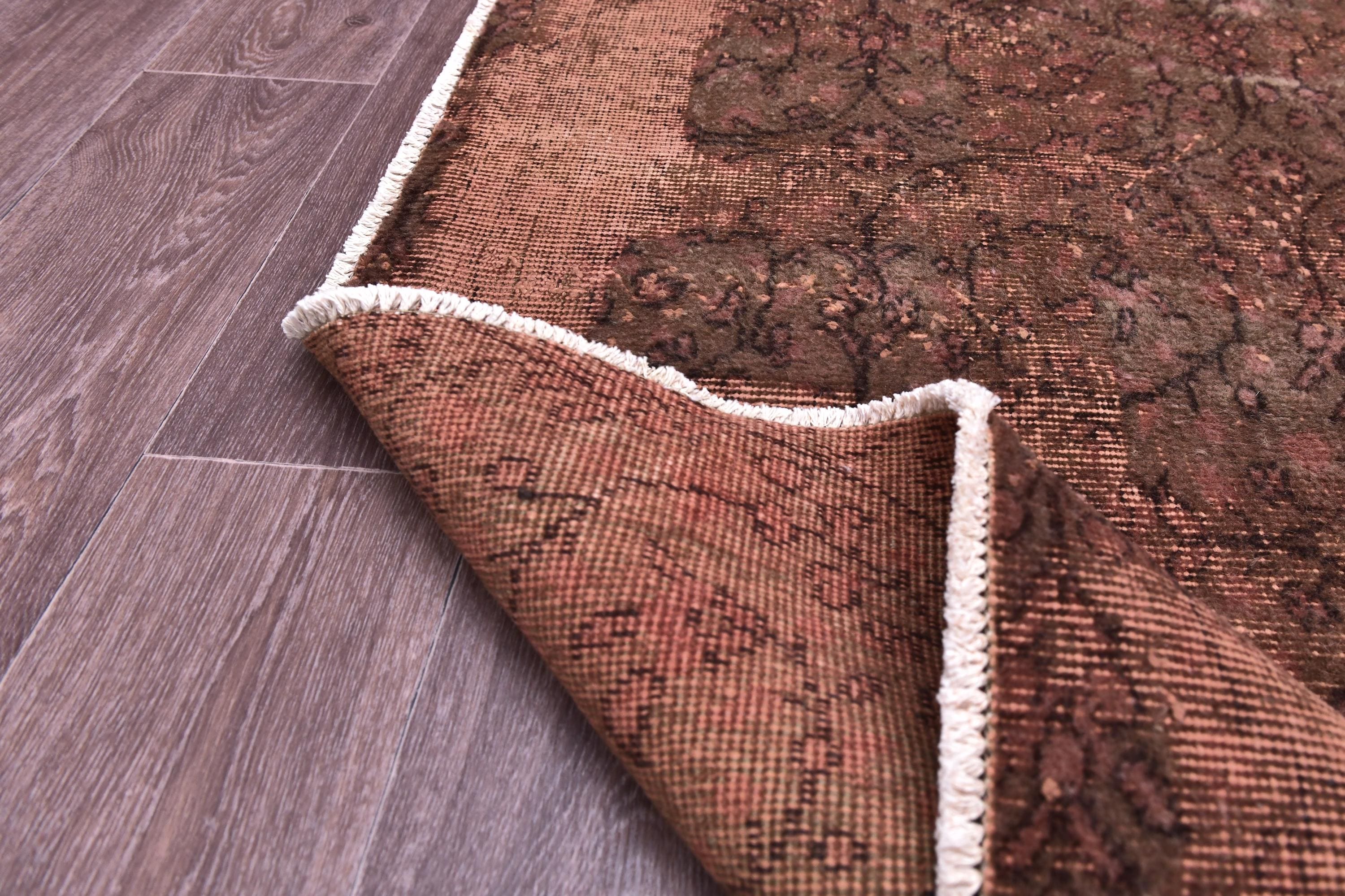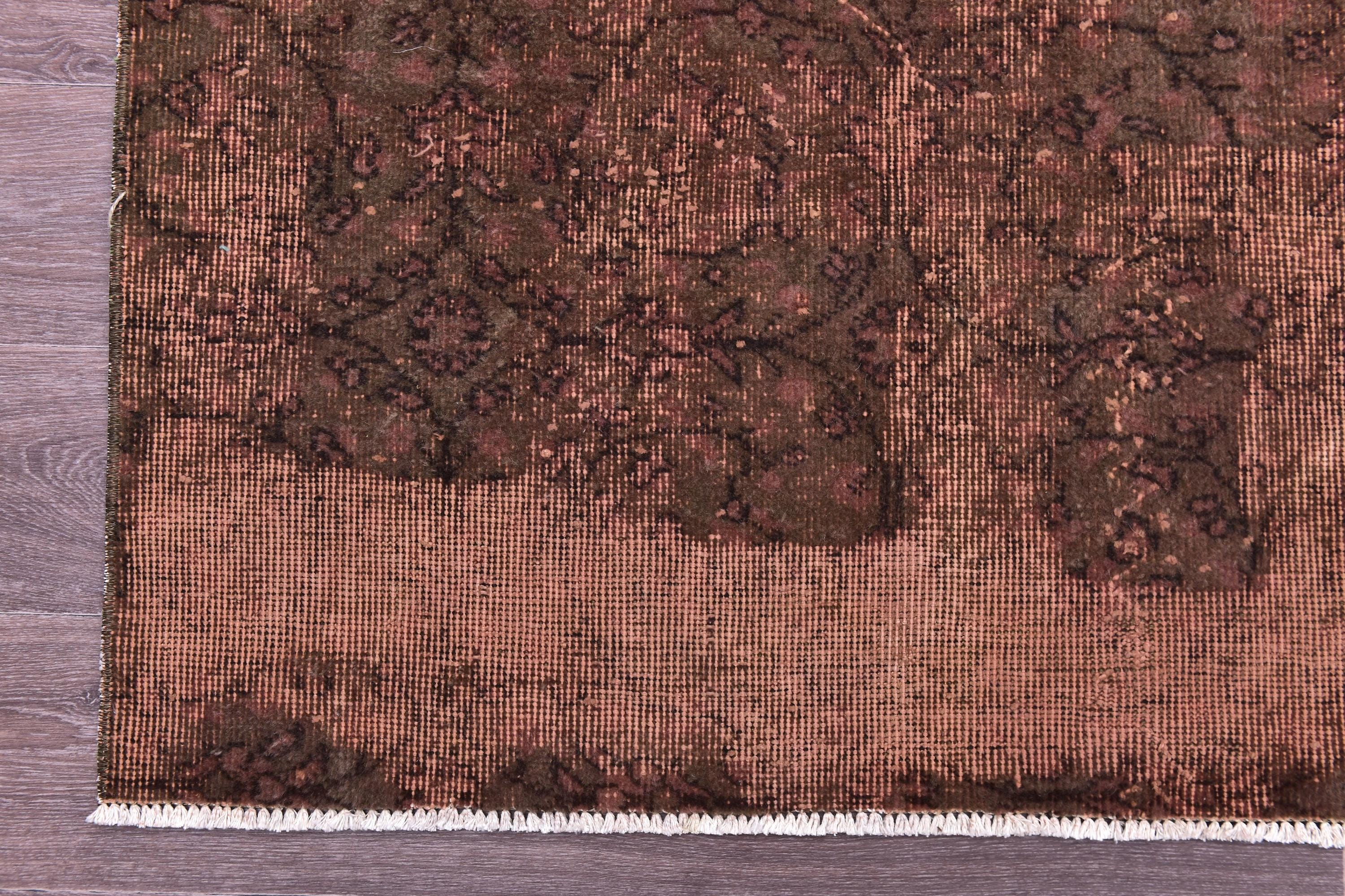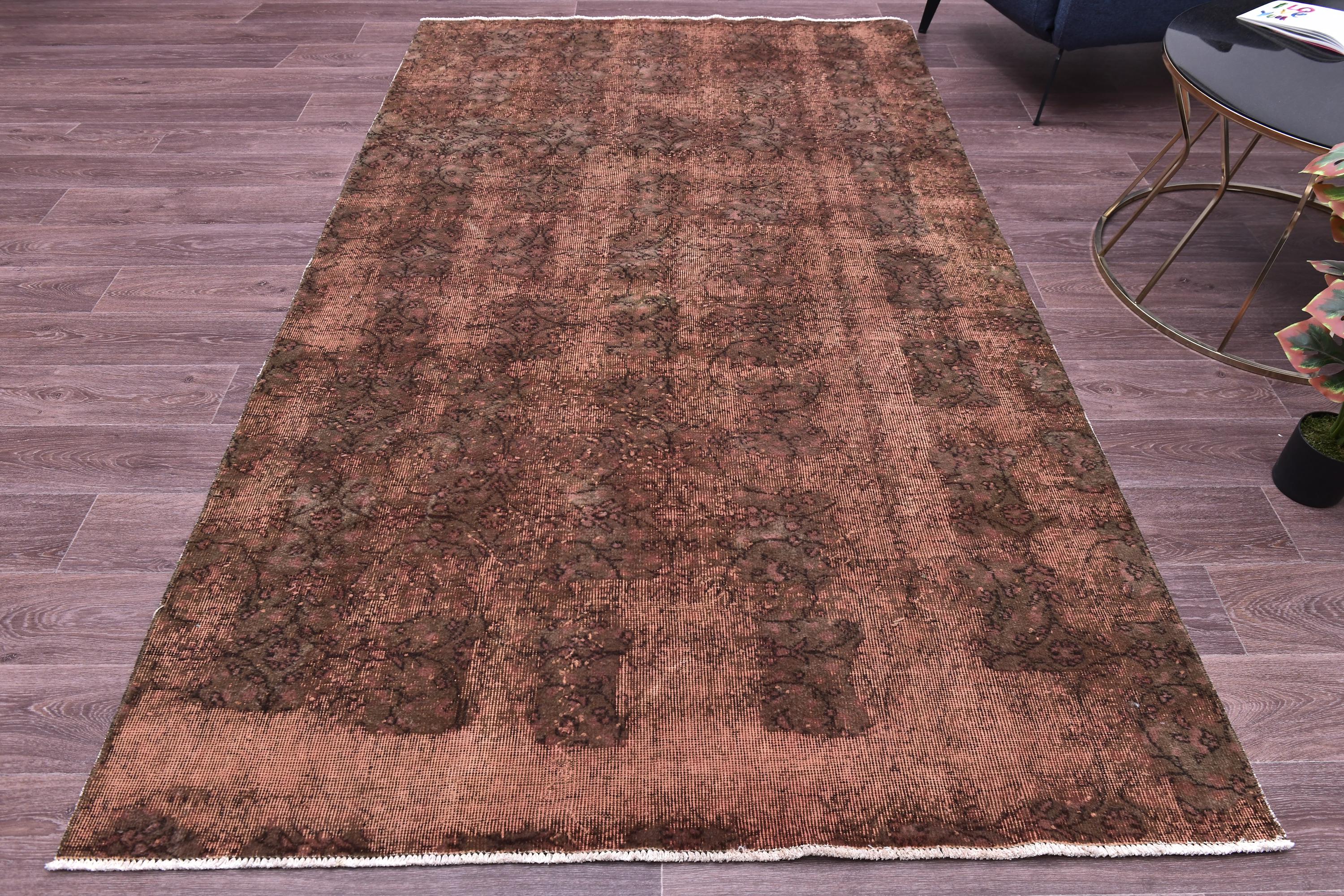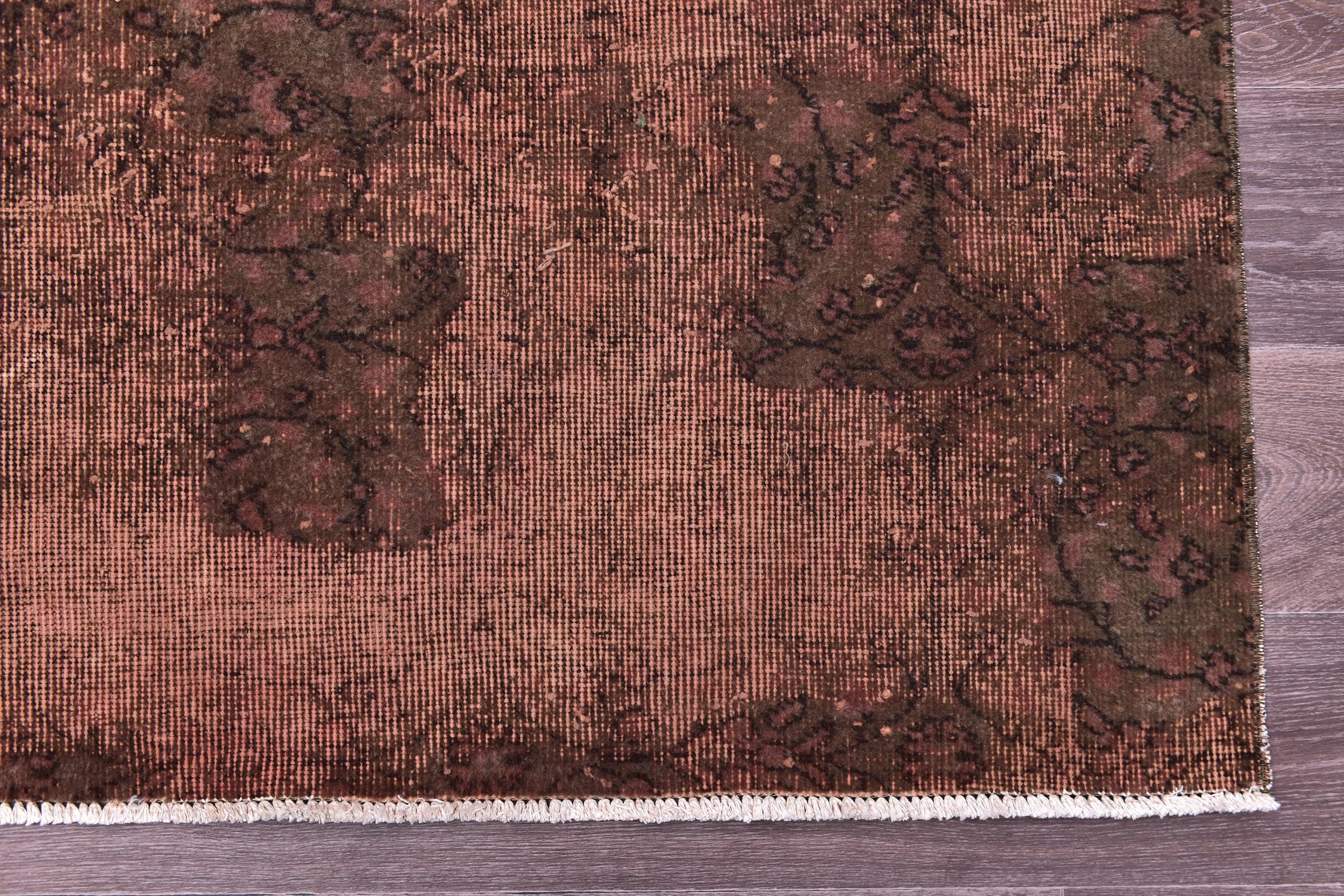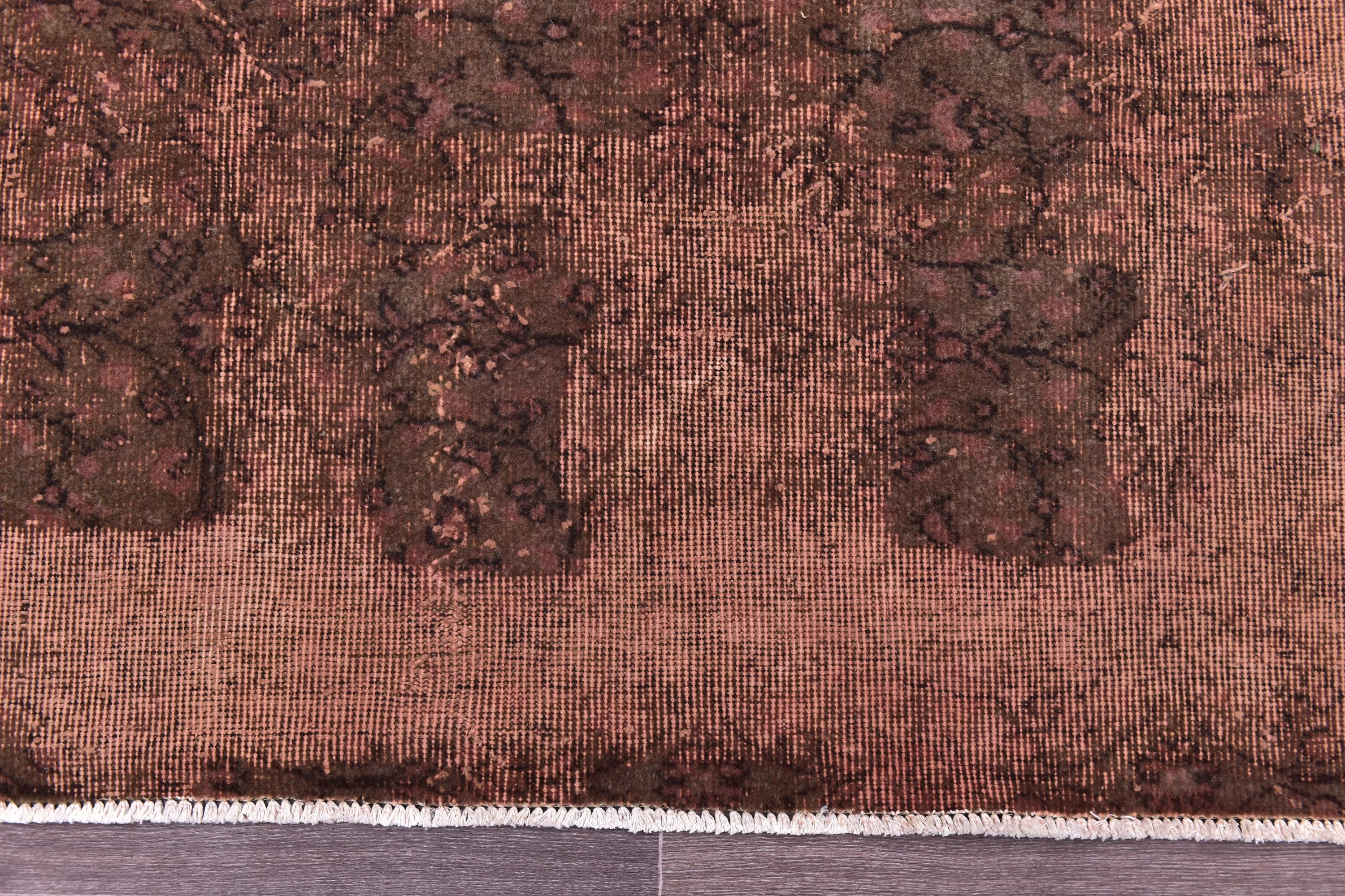 📜📌 Vintage Turkish overdyed area rug in rich brown and copper tones with heavily distressed appearance. Hand-knotted wool carpet featuring subtle faded medallion and floral patterns barely visible through the aged patina. Warm rustic color palette blending chocolate brown, burnt orange, and copper hues creates dramatic vintage aesthetic perfect for industrial and bohemian interiors.