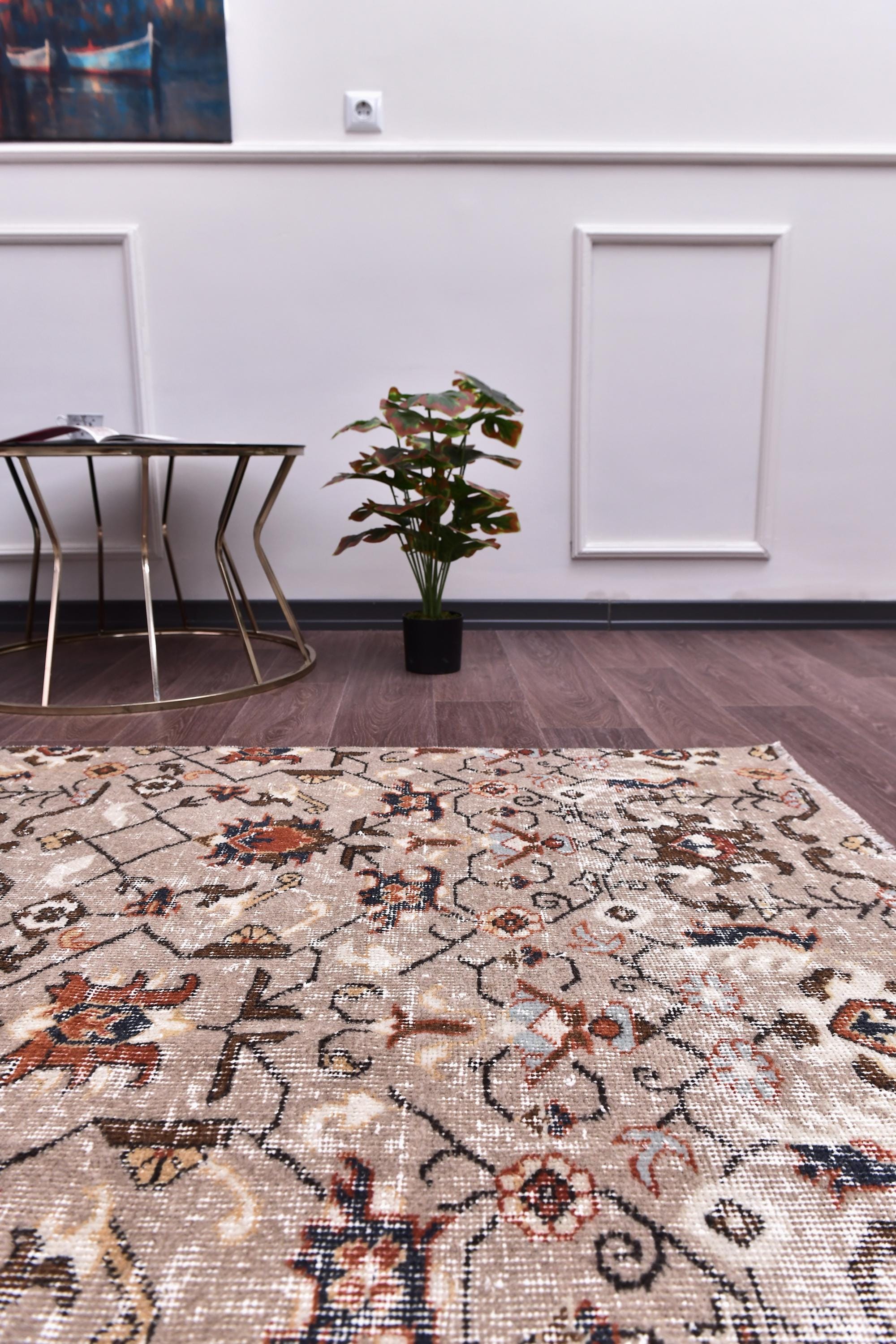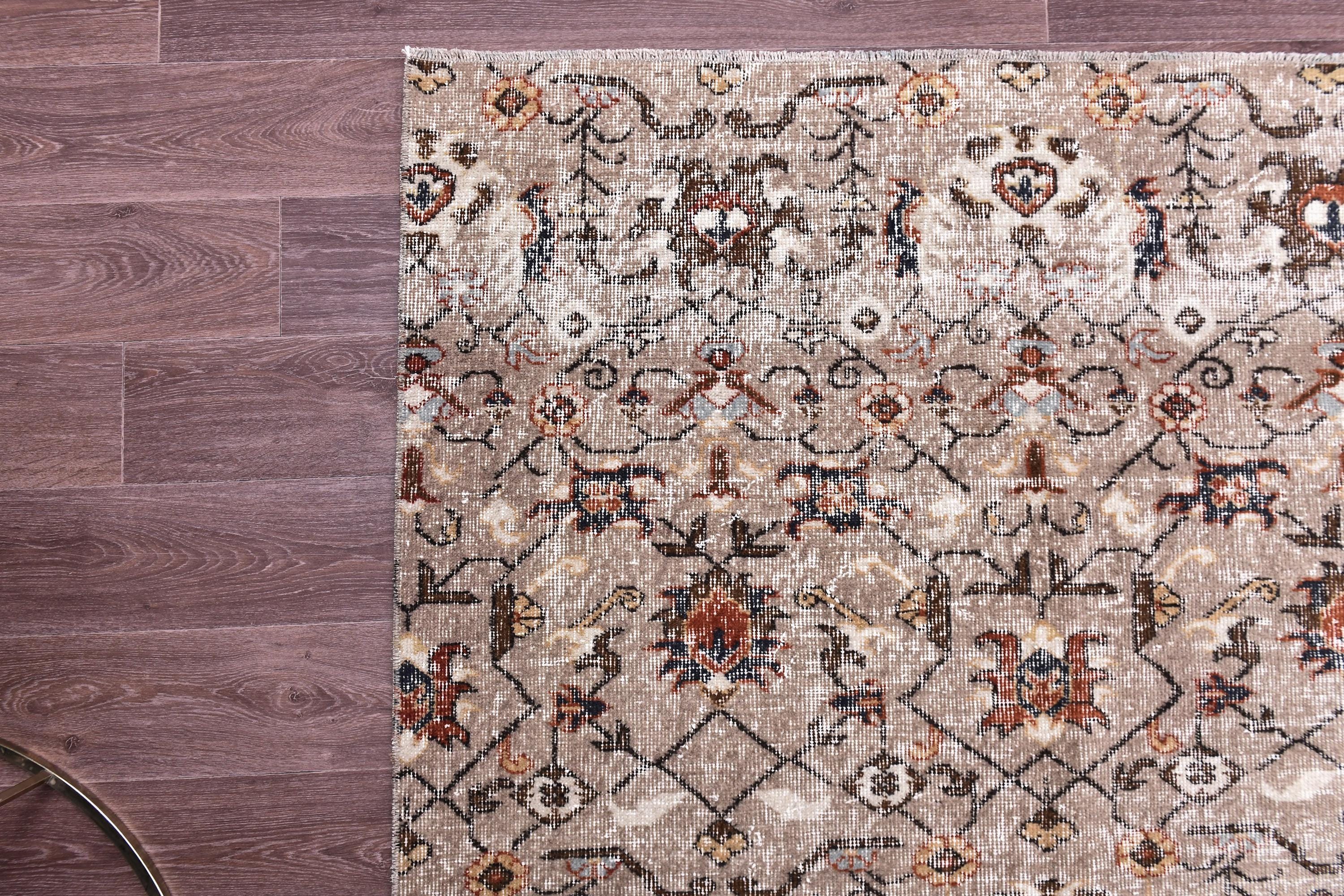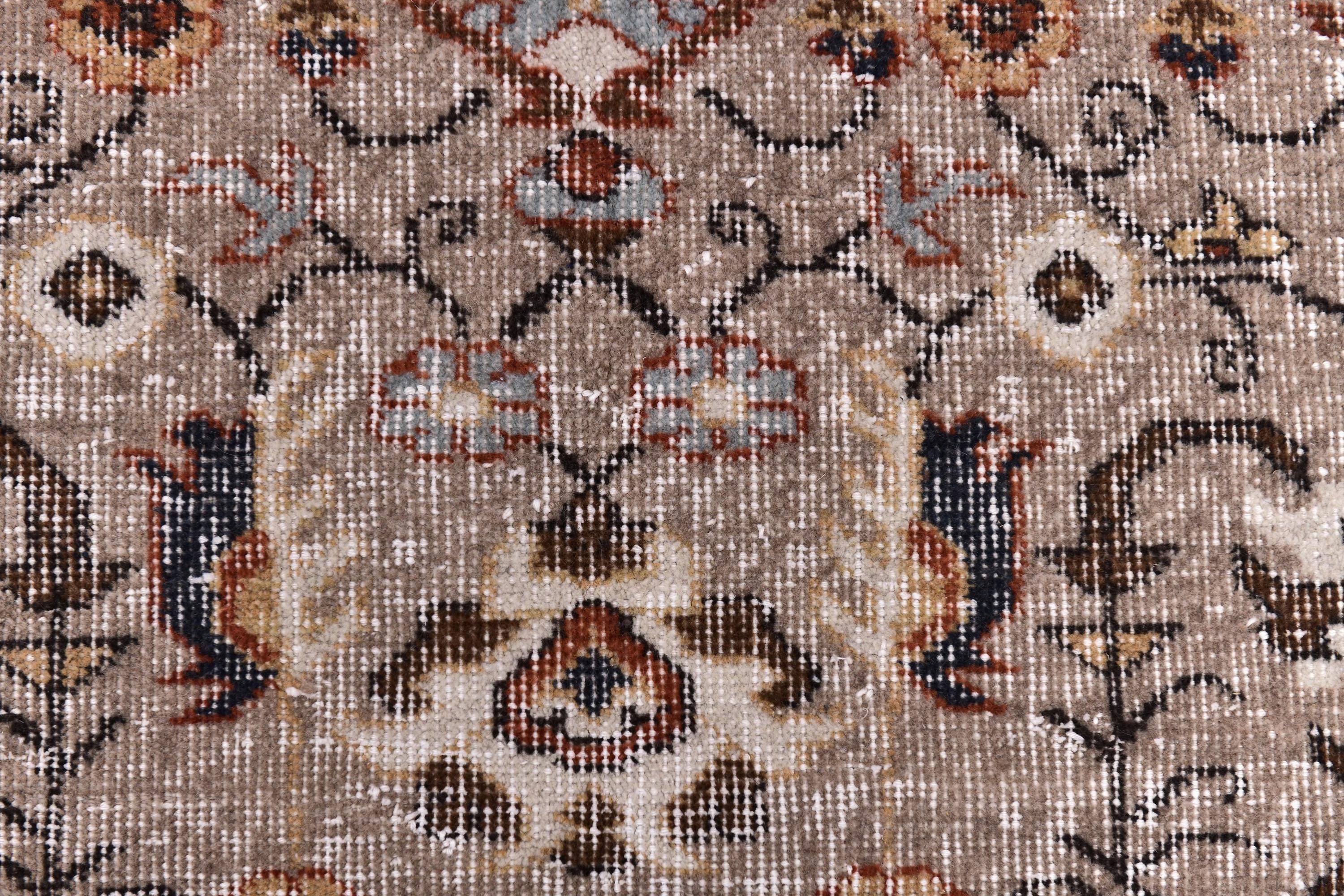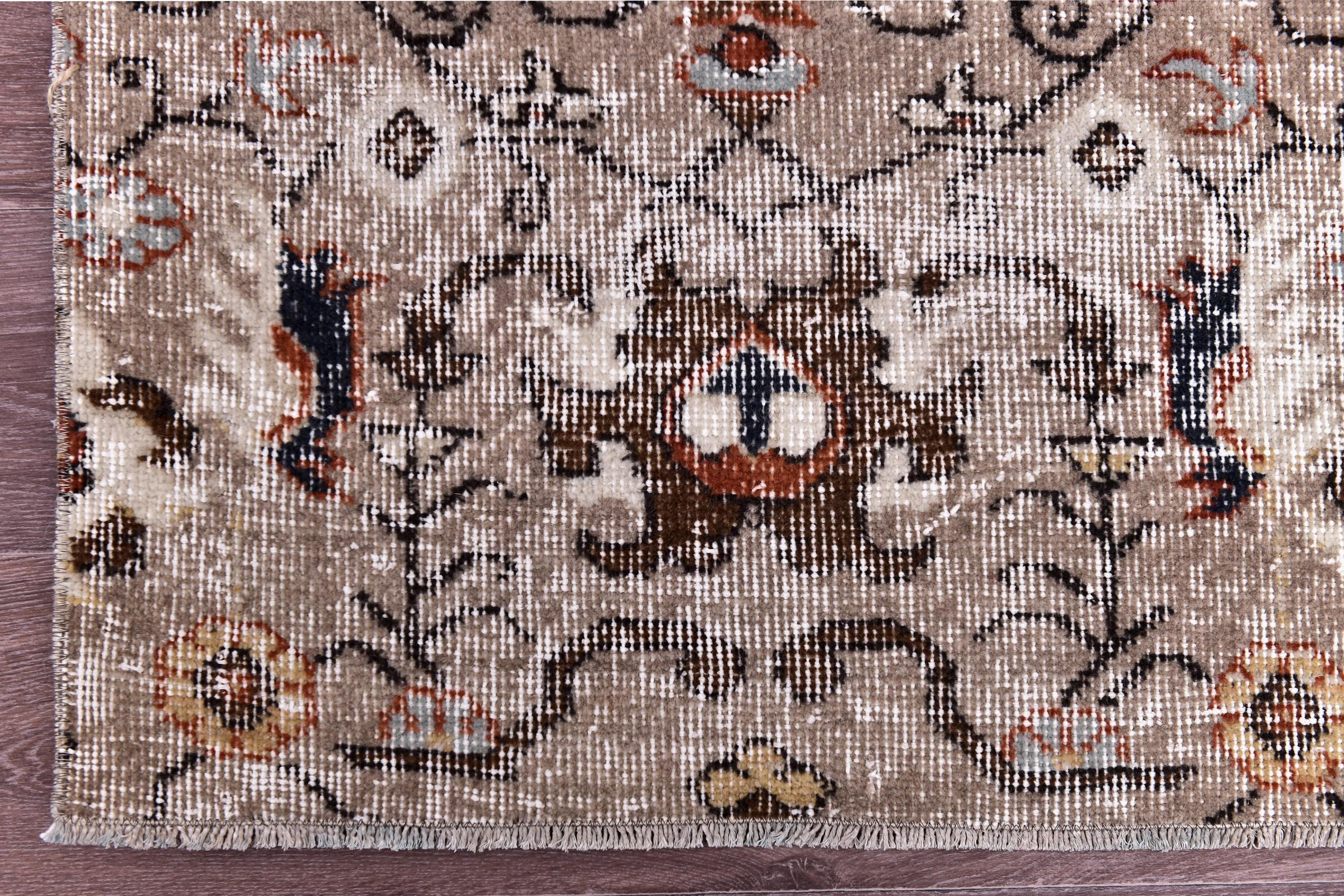📜📌 Vintage Turkish area rug featuring all-over floral and vine pattern in neutral beige, taupe, and brown tones. Hand-knotted wool carpet with heavily distressed appearance showing natural aged patina and worn texture. Intricate botanical design covers entire field with scattered flowers, leaves, and scrolling vines. Perfect for shabby chic and neutral vintage interiors.