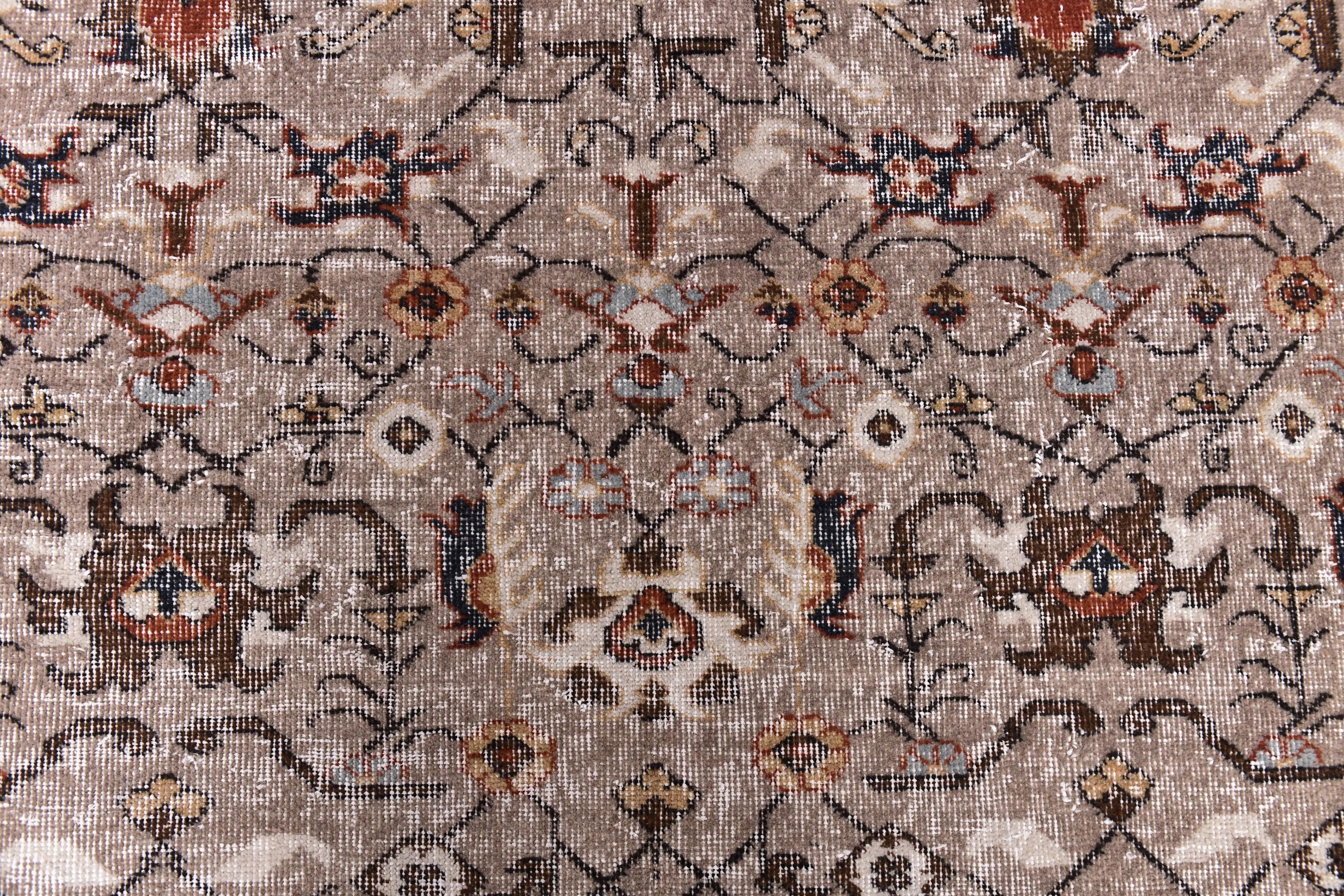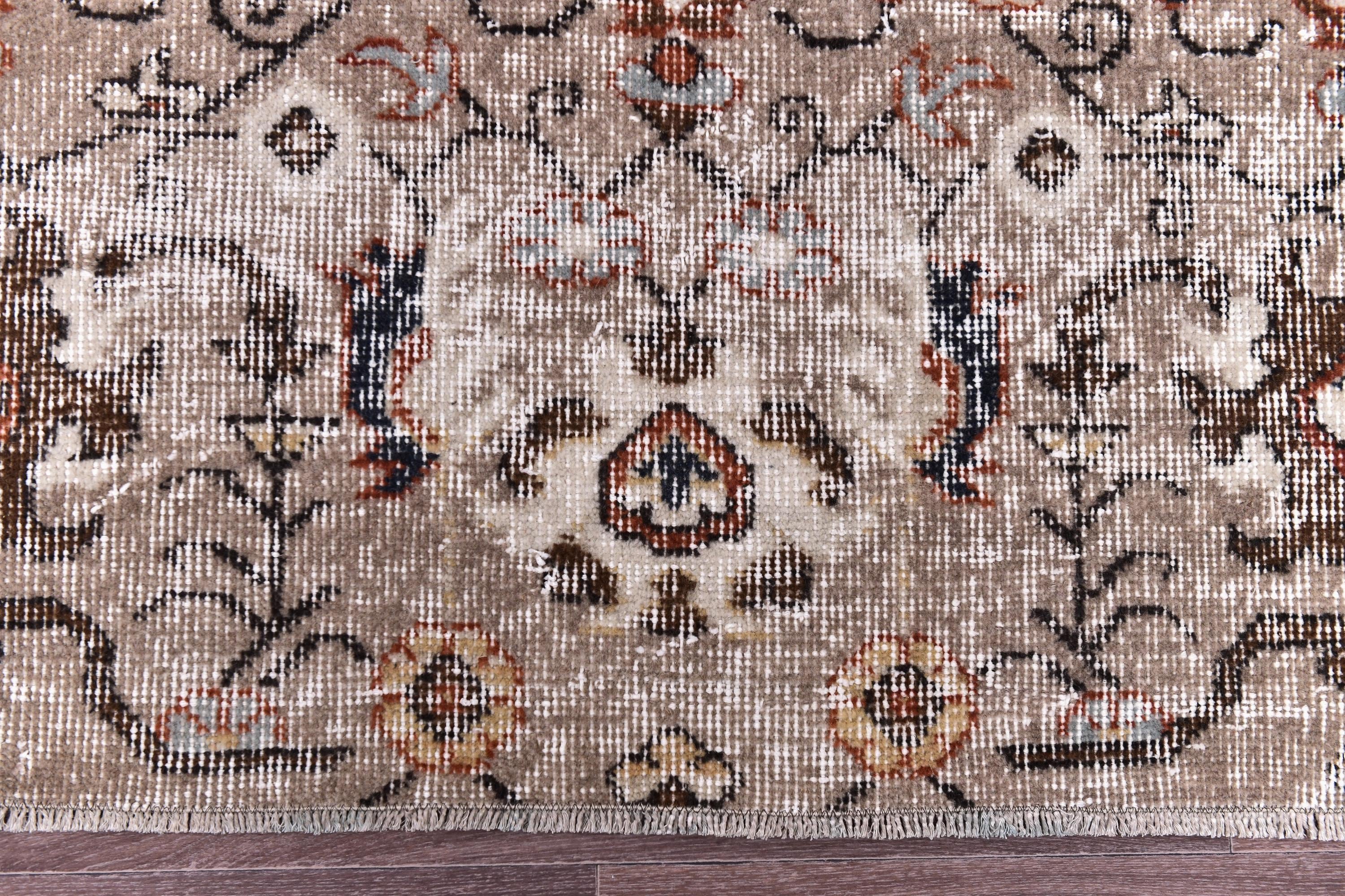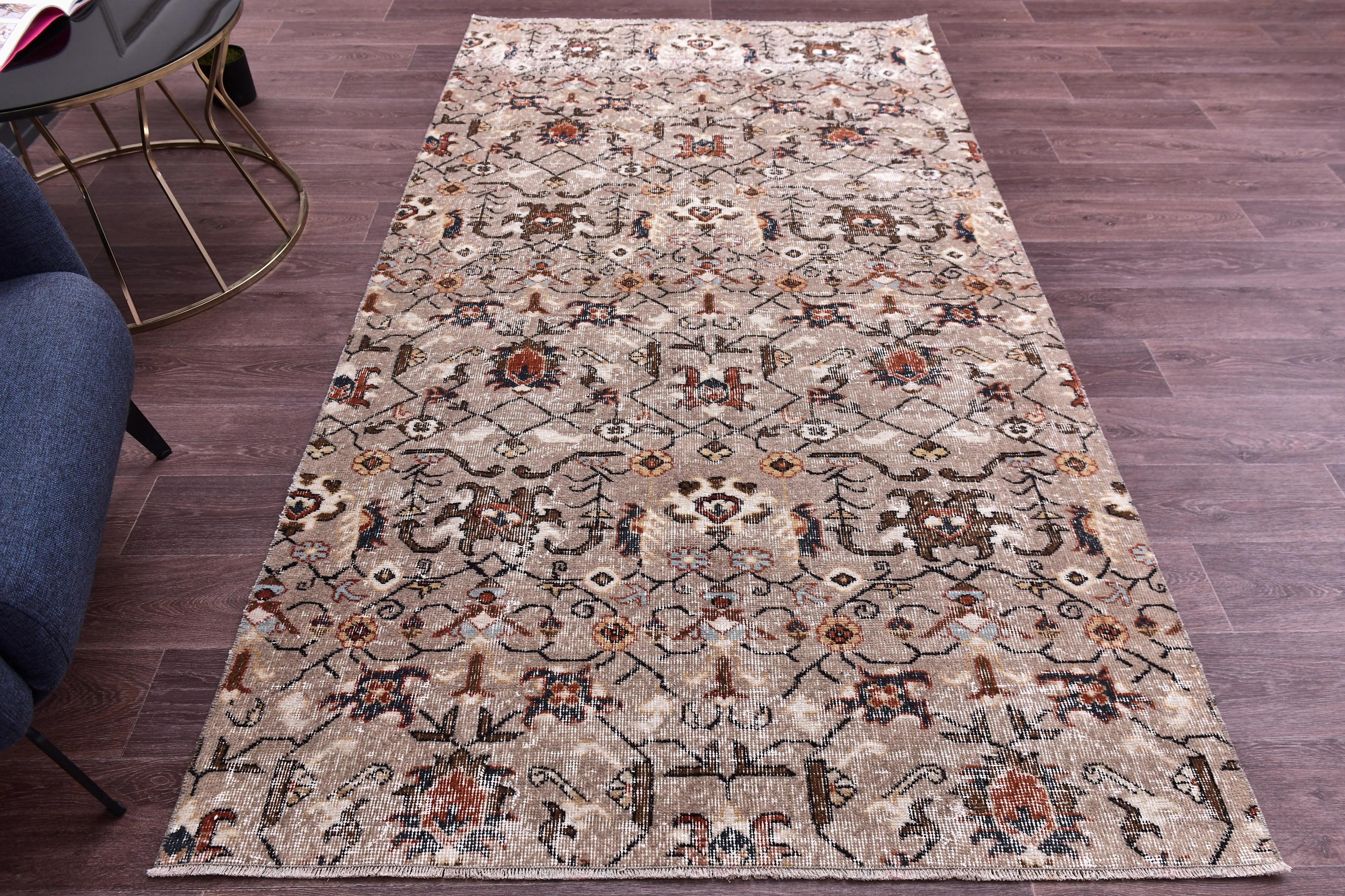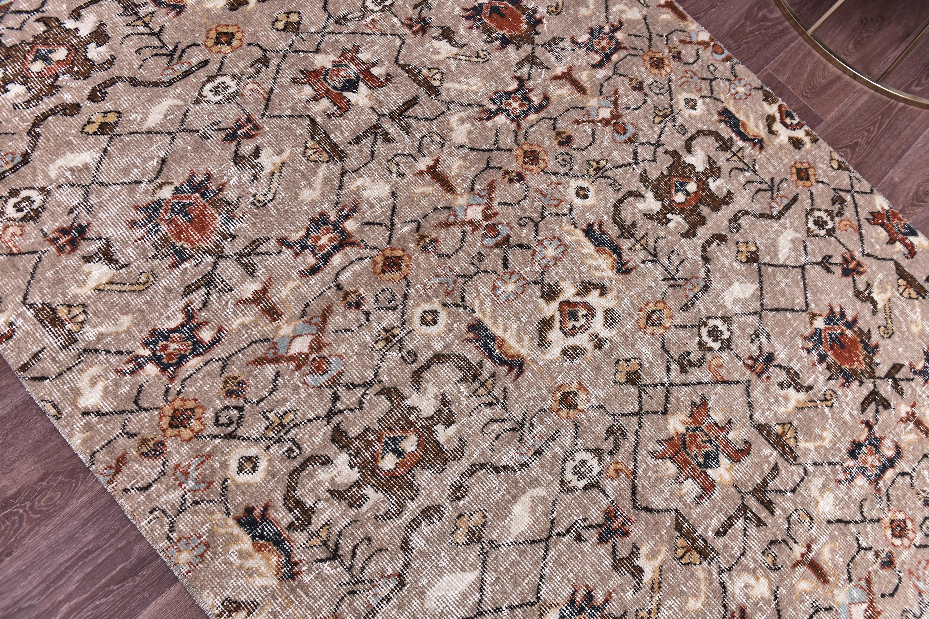 📜📌 Vintage Turkish area rug featuring all-over floral and vine pattern in neutral beige, taupe, and brown tones. Hand-knotted wool carpet with heavily distressed appearance showing natural aged patina and worn texture. Intricate botanical design covers entire field with scattered flowers, leaves, and scrolling vines. Perfect for shabby chic and neutral vintage interiors.