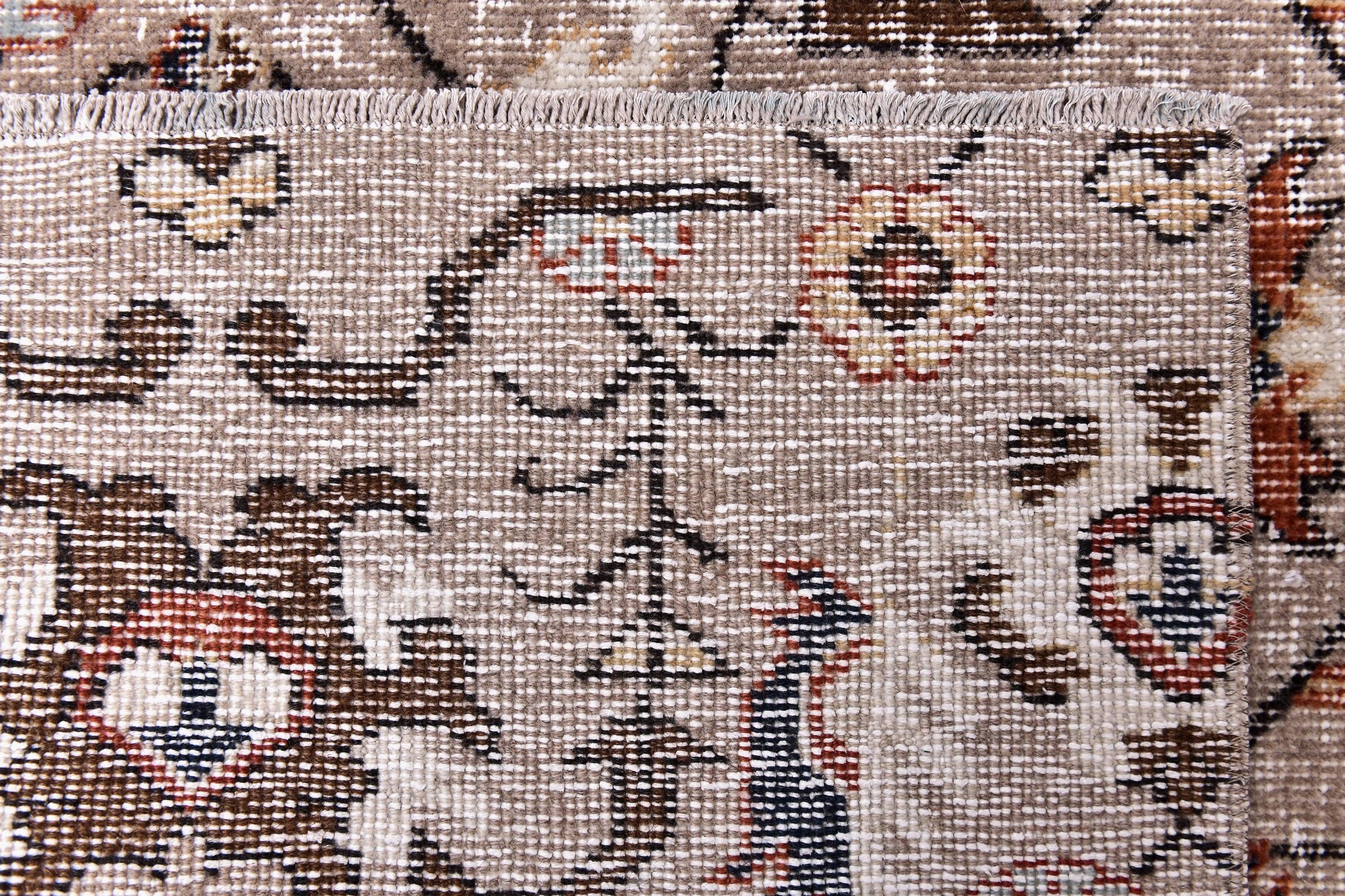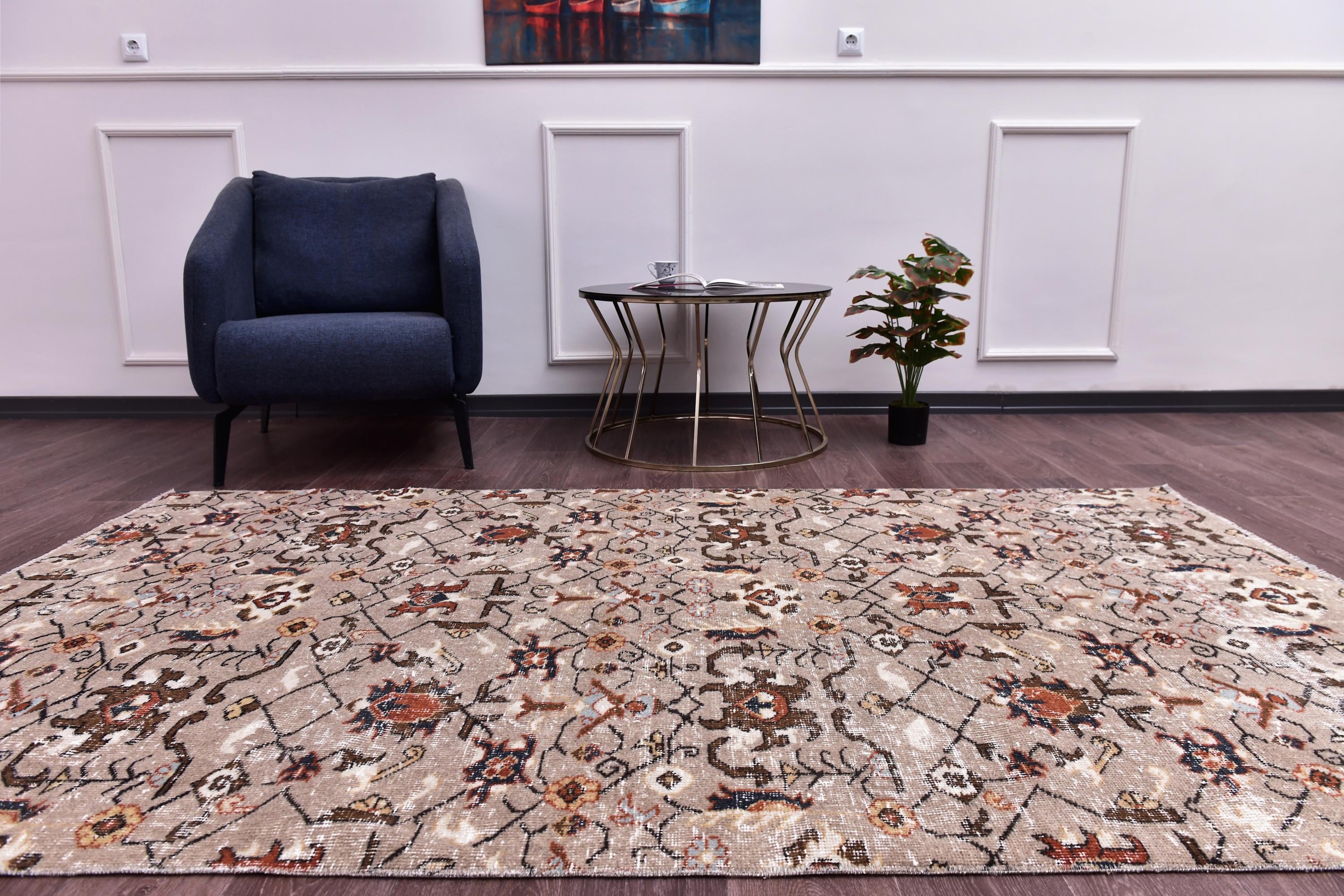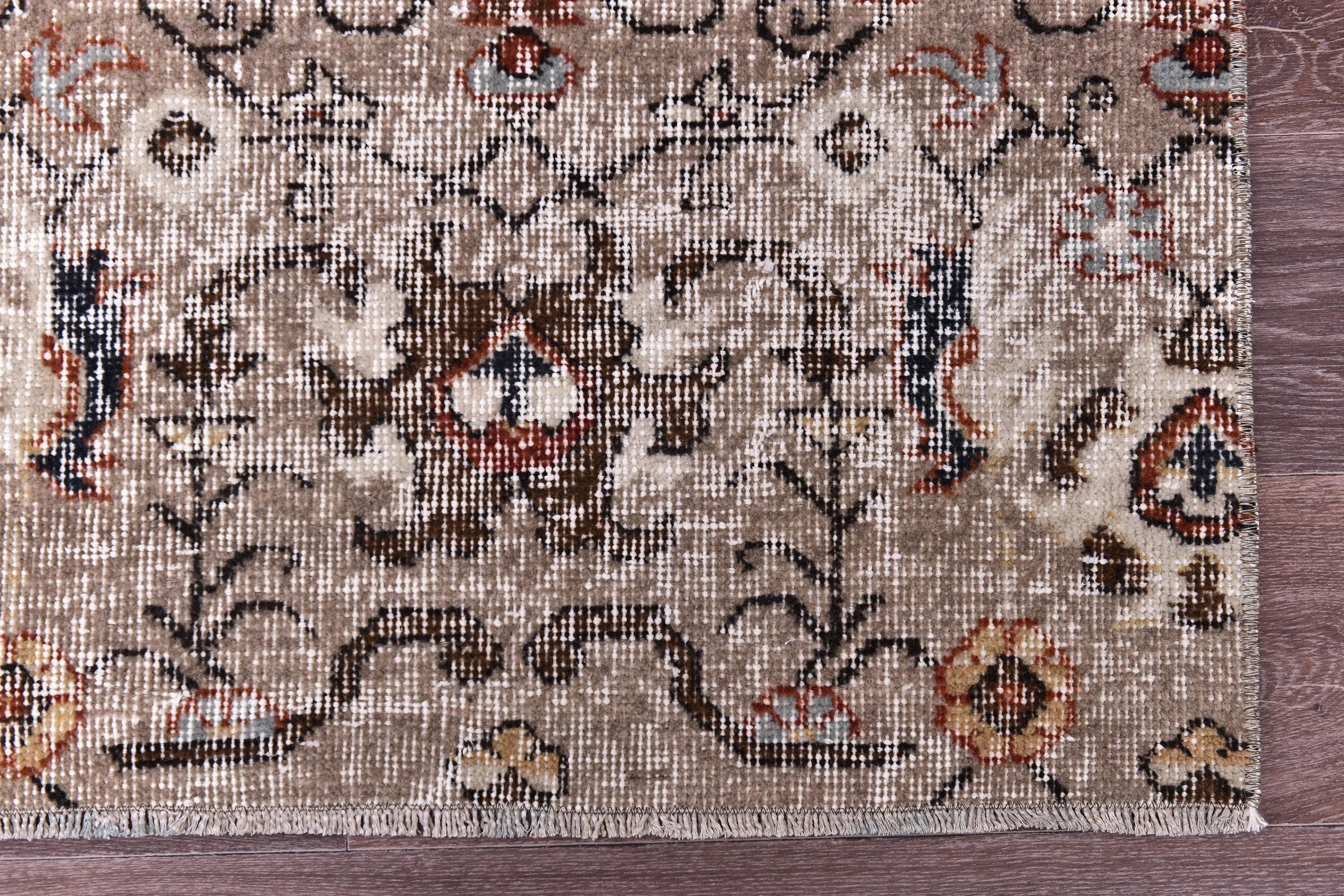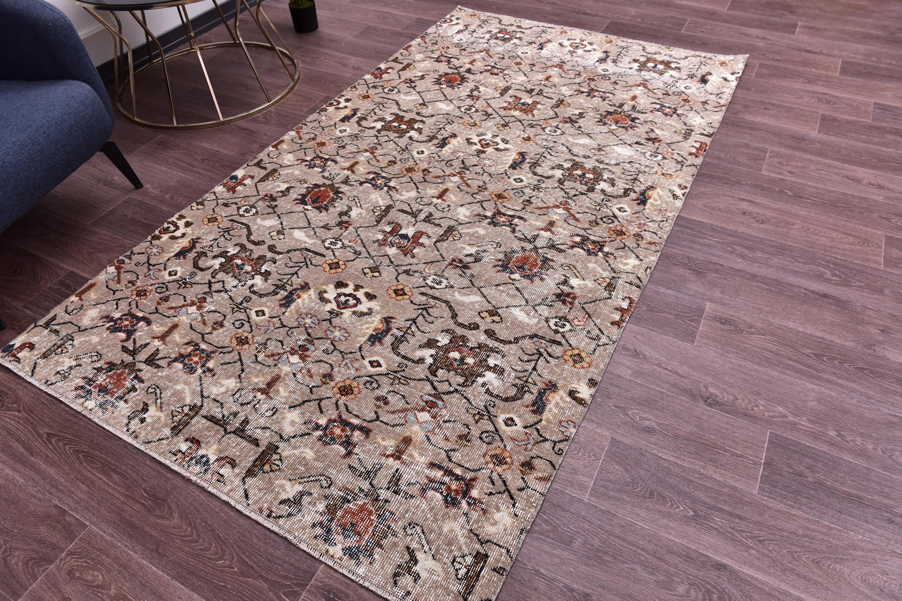📜📌 Vintage Turkish area rug featuring all-over floral and vine pattern in neutral beige, taupe, and brown tones. Hand-knotted wool carpet with heavily distressed appearance showing natural aged patina and worn texture. Intricate botanical design covers entire field with scattered flowers, leaves, and scrolling vines. Perfect for shabby chic and neutral vintage interiors.