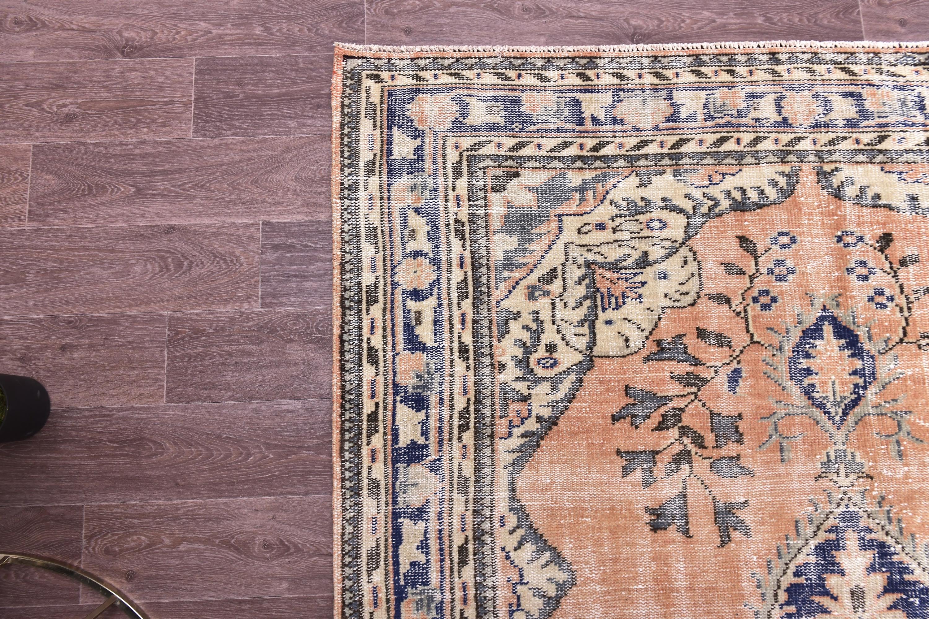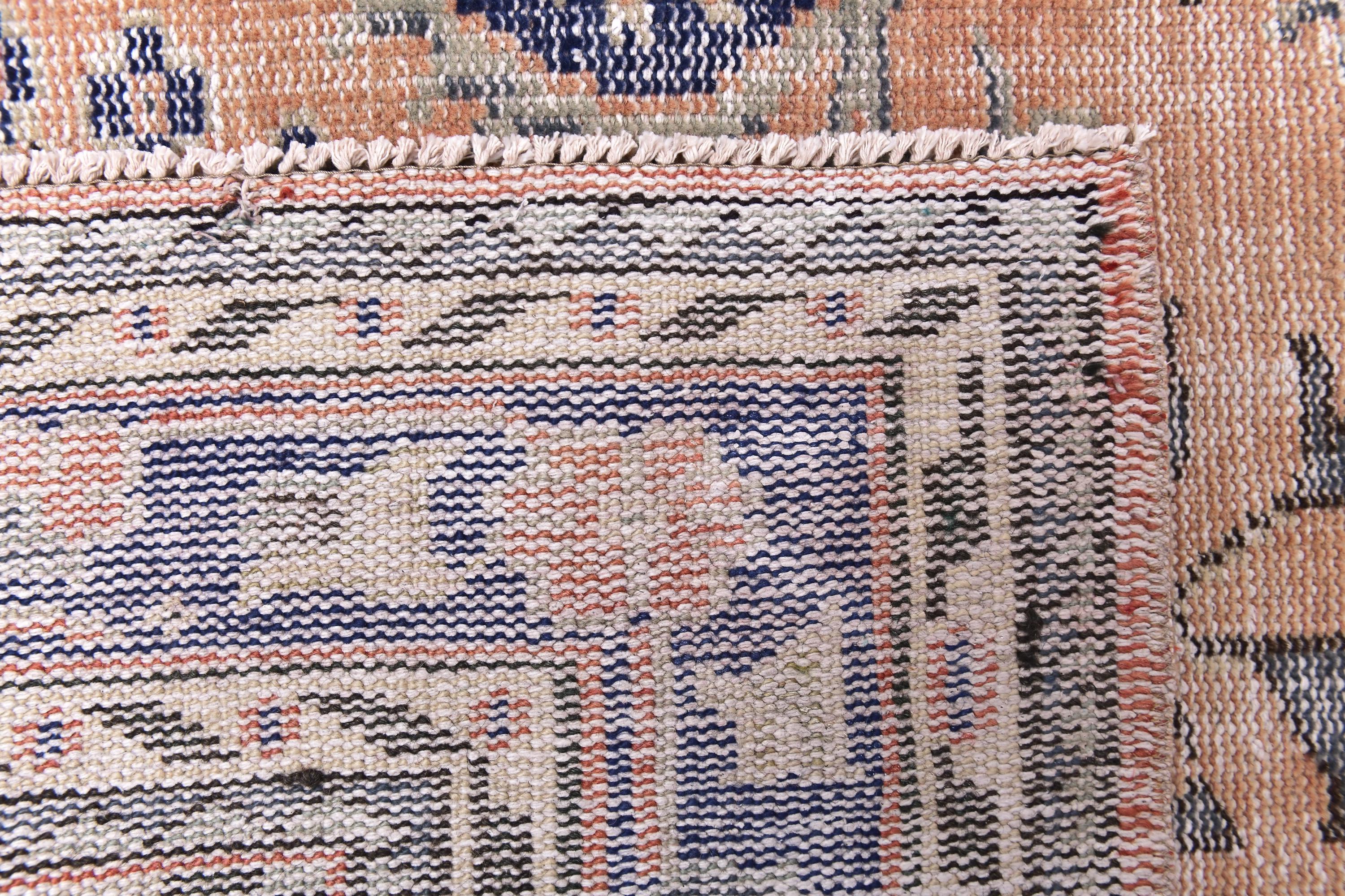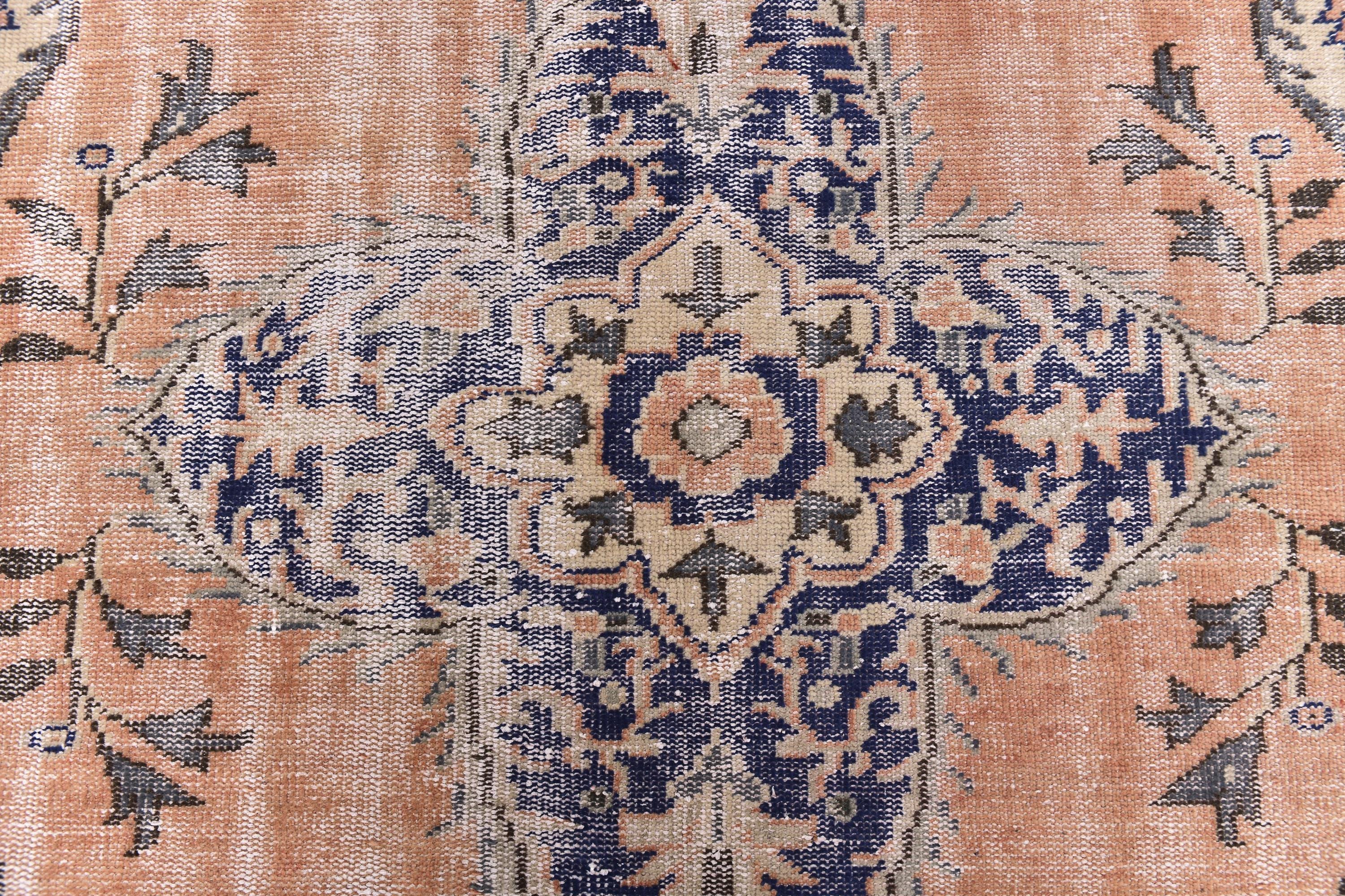 📜📌 Vintage Turkish Oushak area rug with central navy blue floral medallion on faded coral peach field, featuring ornate botanical spandrels and multiple decorative borders in cream, blue and beige tones, hand-knotted wool with distressed low-pile texture