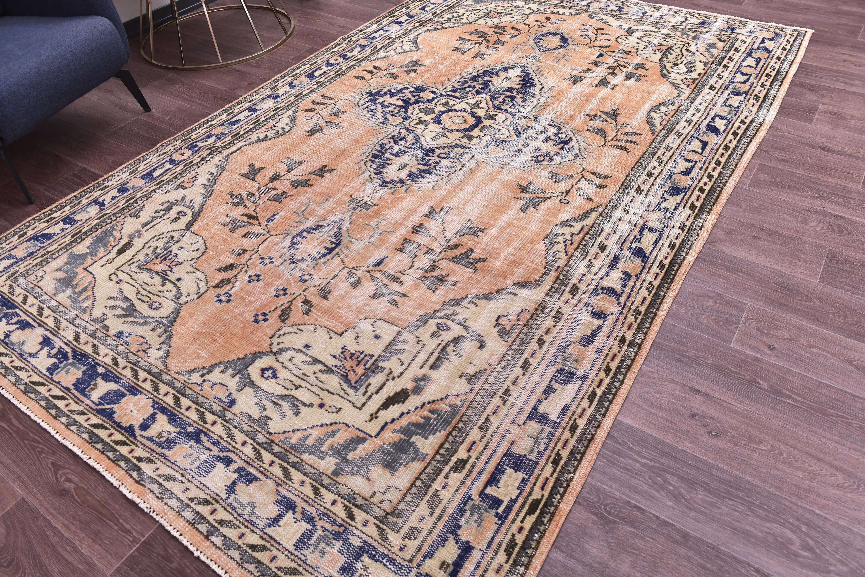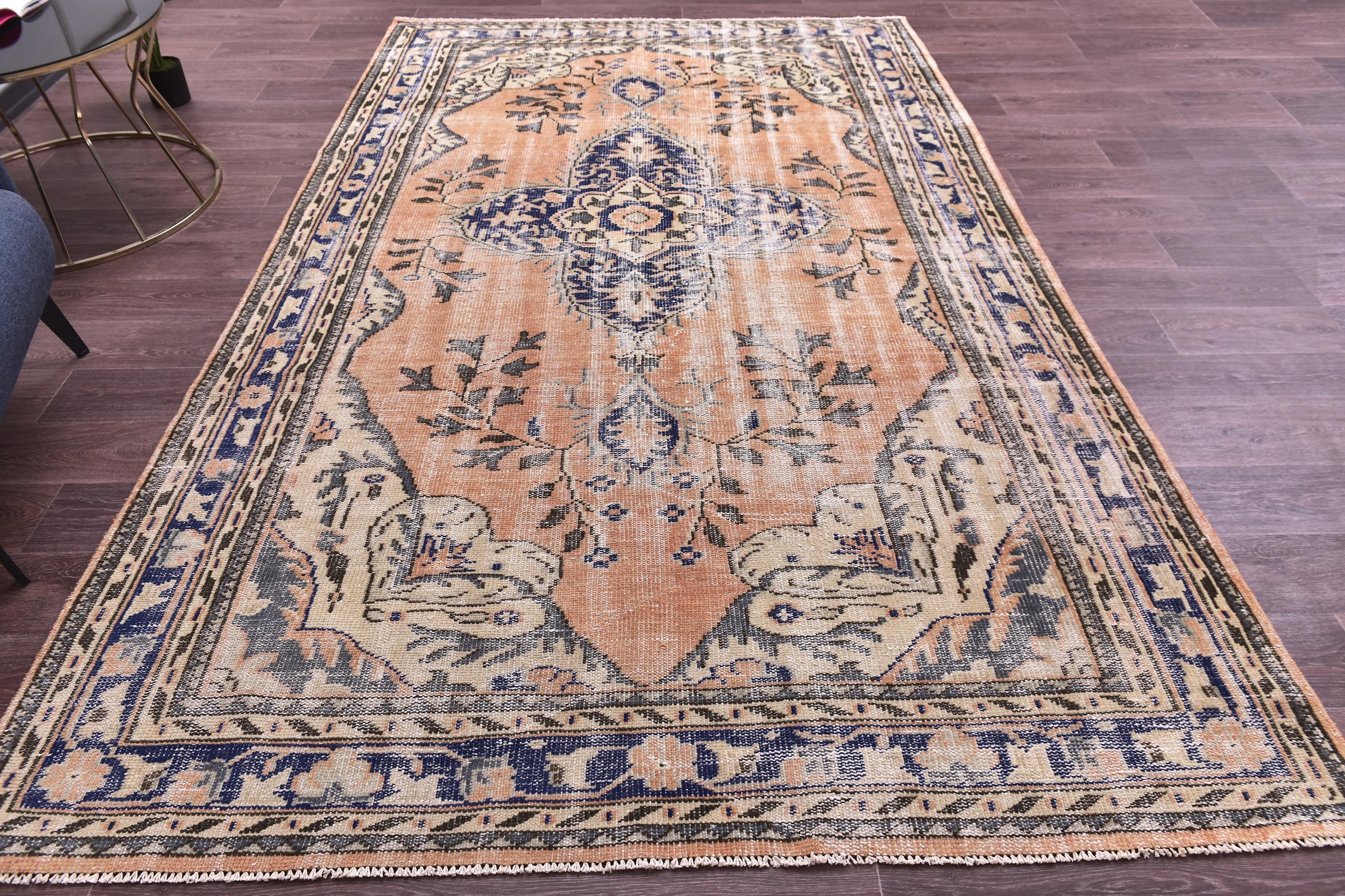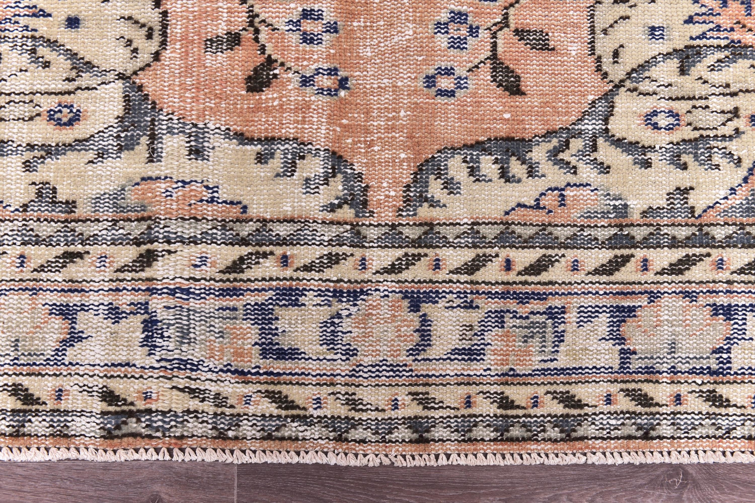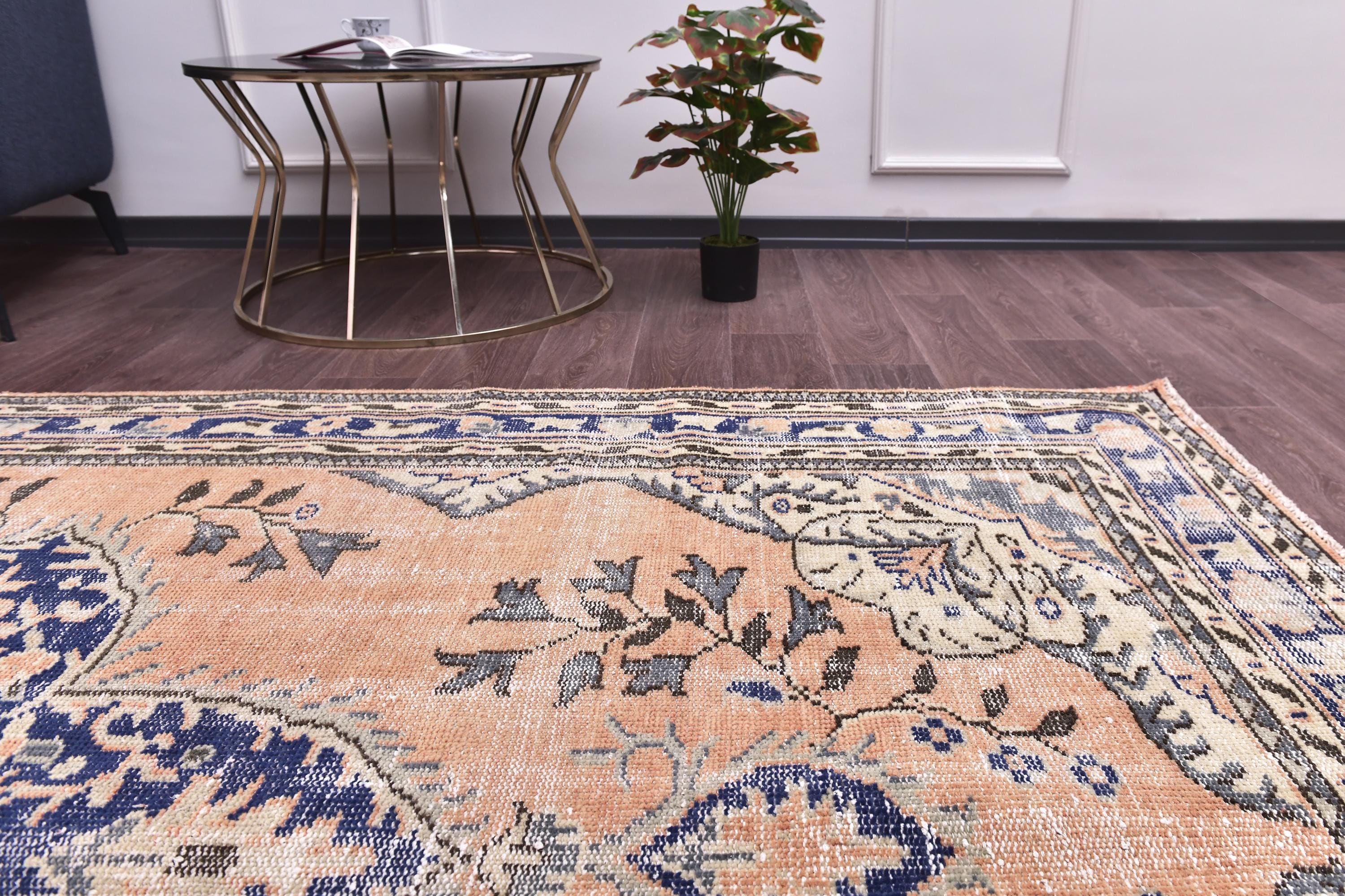 📜📌 Vintage Turkish Oushak area rug with central navy blue floral medallion on faded coral peach field, featuring ornate botanical spandrels and multiple decorative borders in cream, blue and beige tones, hand-knotted wool with distressed low-pile texture