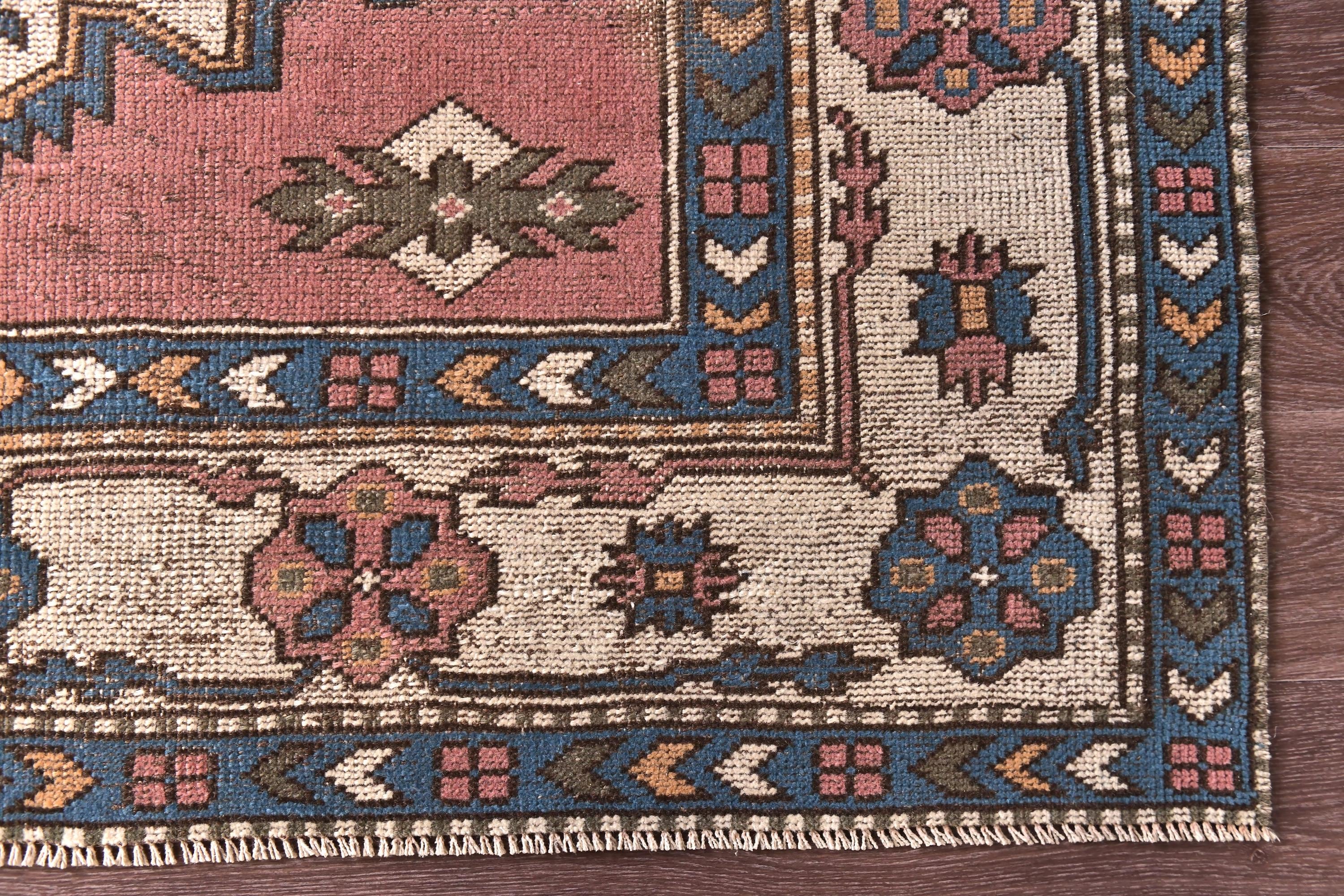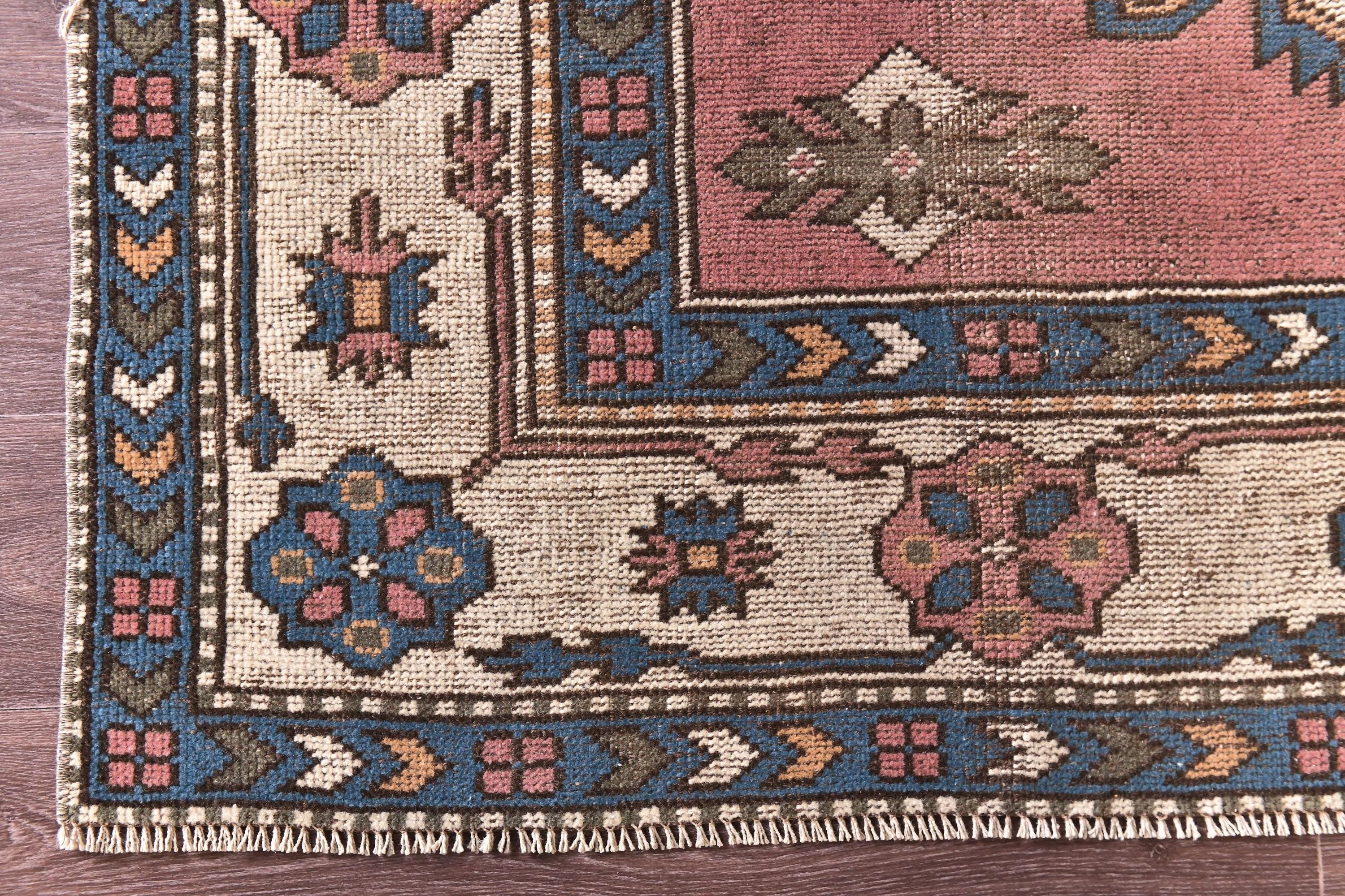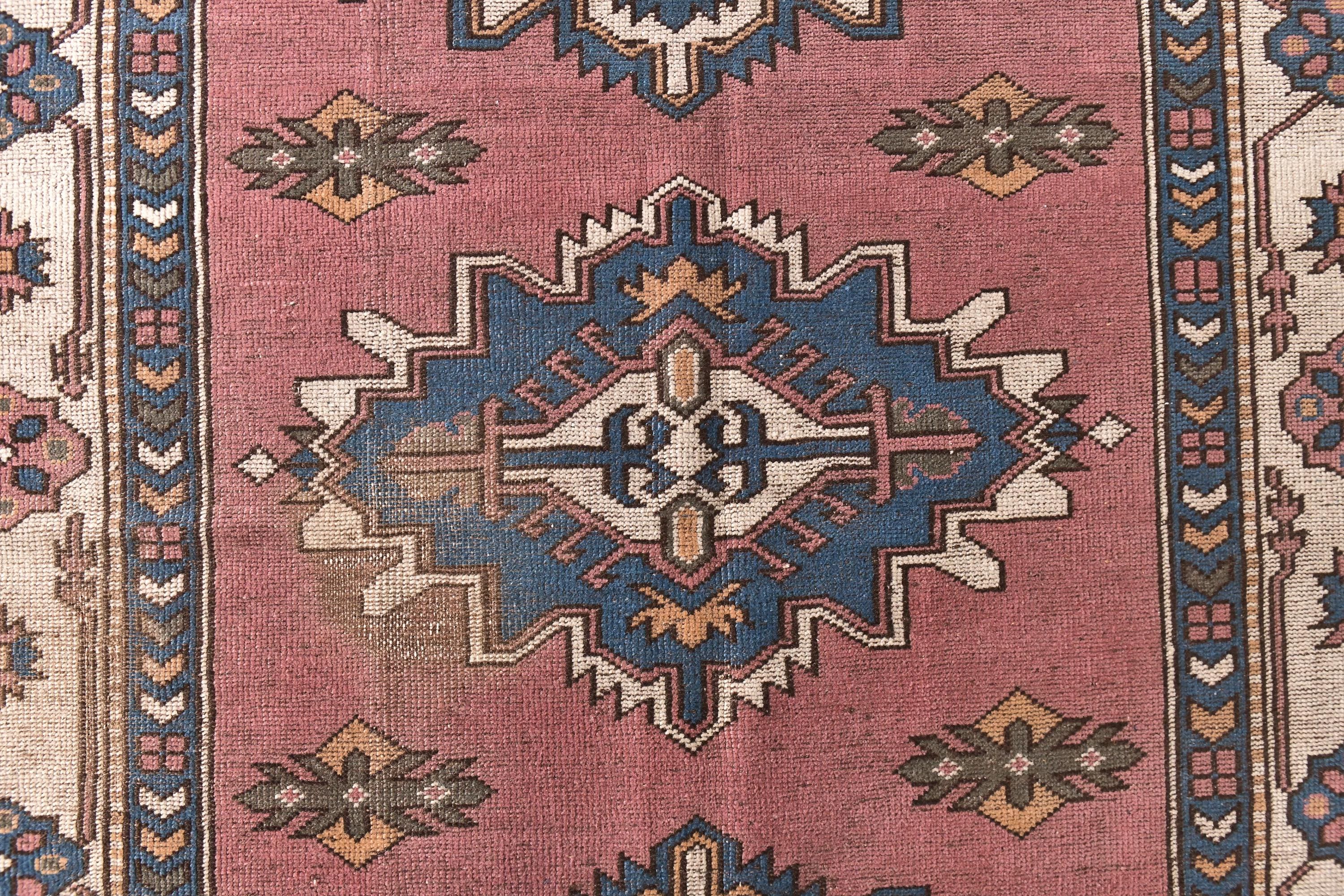 📜📌 Vintage Turkish Kazak runner rug featuring three large geometric star medallions in blue, cream and tan on dusty mauve pink field, with wide ivory borders displaying traditional tribal rosette motifs and geometric patterns, hand-knotted wool construction